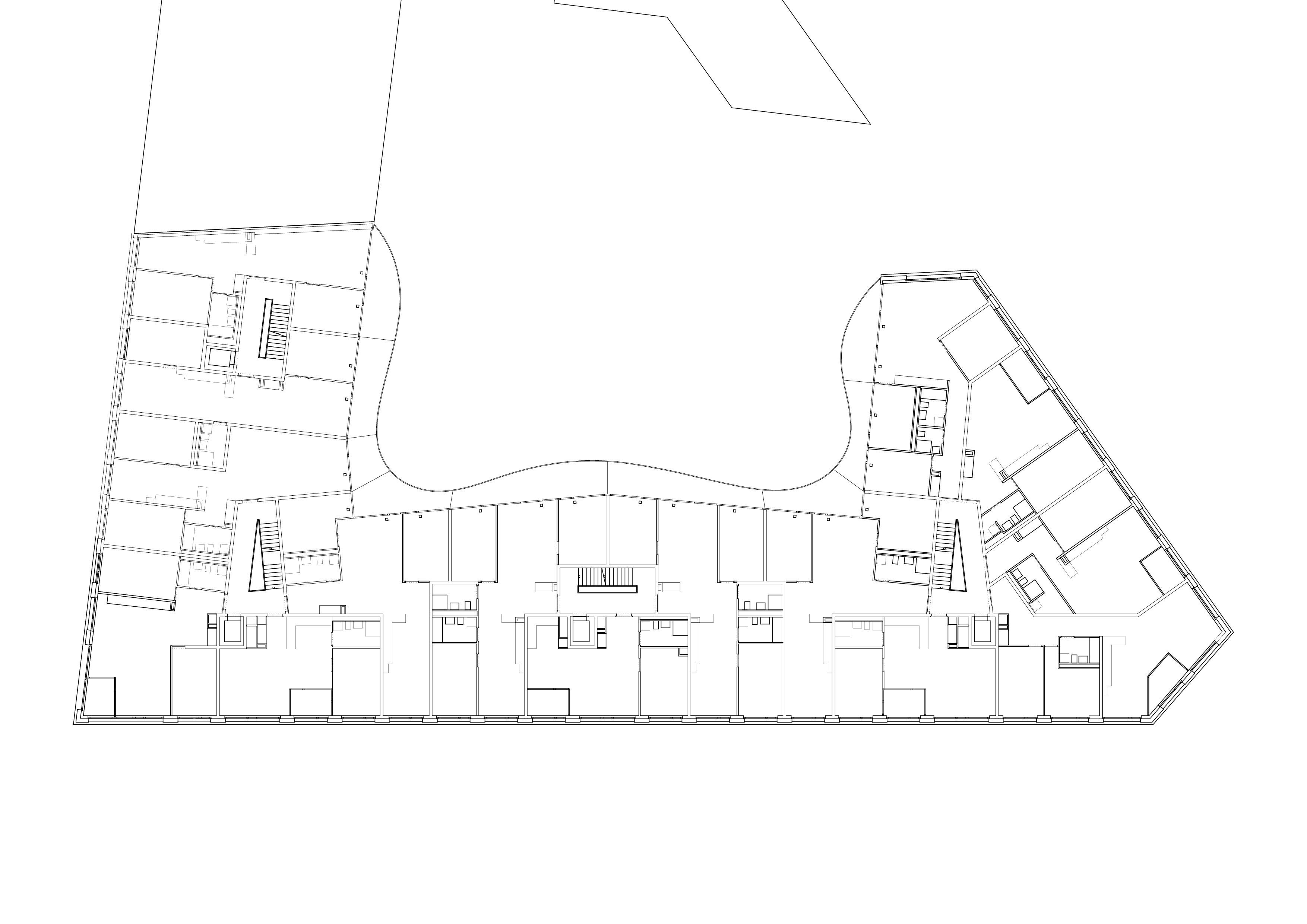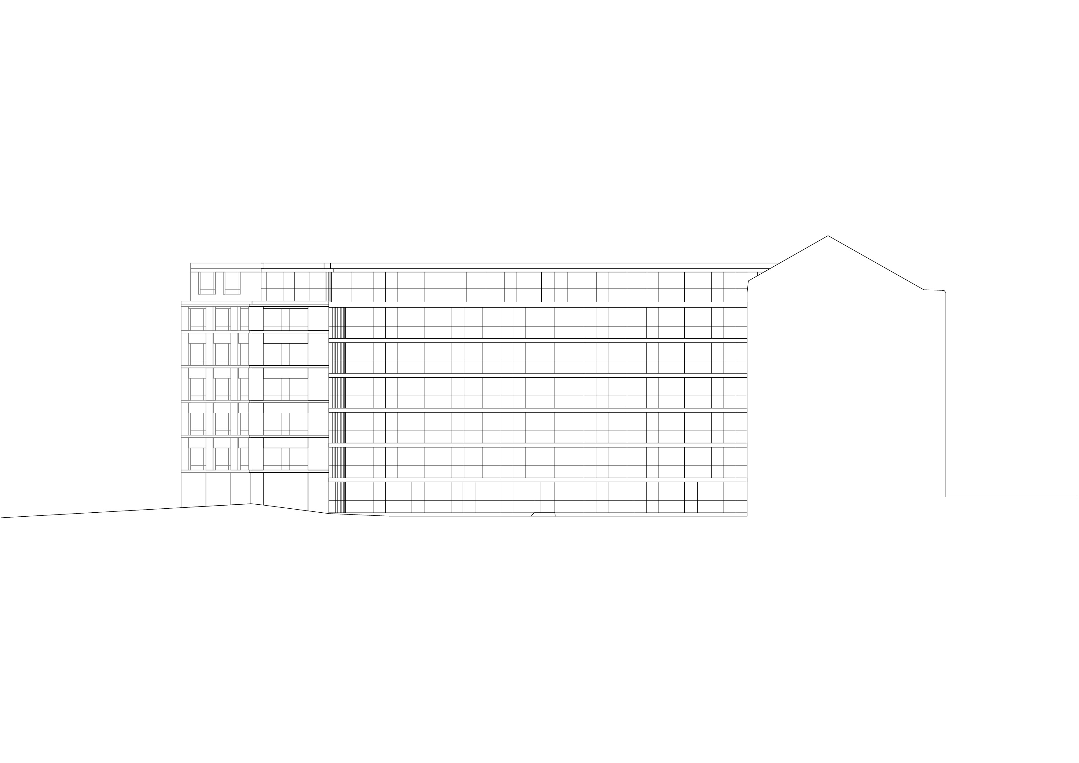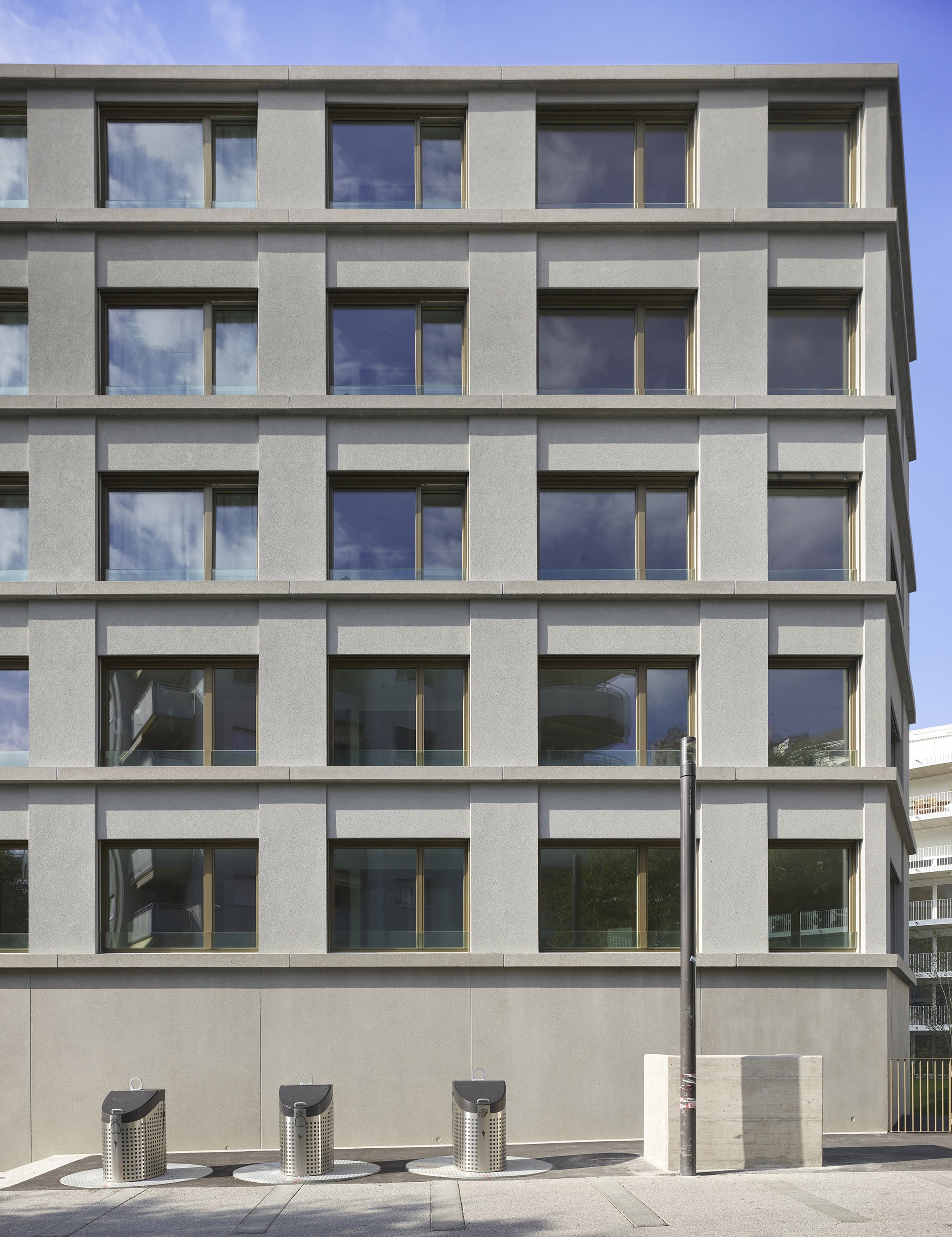 L’immeuble comporte six niveaux couronnés d’un étage en attique. Une grande diversité d’appartements est offerte. Quatre cages d’escalier distribuent quinze appartements par étage. Les grands appartements sont traversant de rue à cour, certains jouissent de la double orientation aux angles, et les plus petits sont mono-orientés. Le rez-de-chaussée organise des surfaces d’activités commerciales sur rues, adossées à des appartements ou bureaux orientés sur cour. La matérialité des façades est minérale. Les espaces communs, parking et cages d’escalier, sont en béton apparent. Le barreaudage extérieur est décliné en garde-corps intérieur. La matérialisation des logements est classique, parquet chêne, cloisons et plafonds enduits, menuiserie peinte.