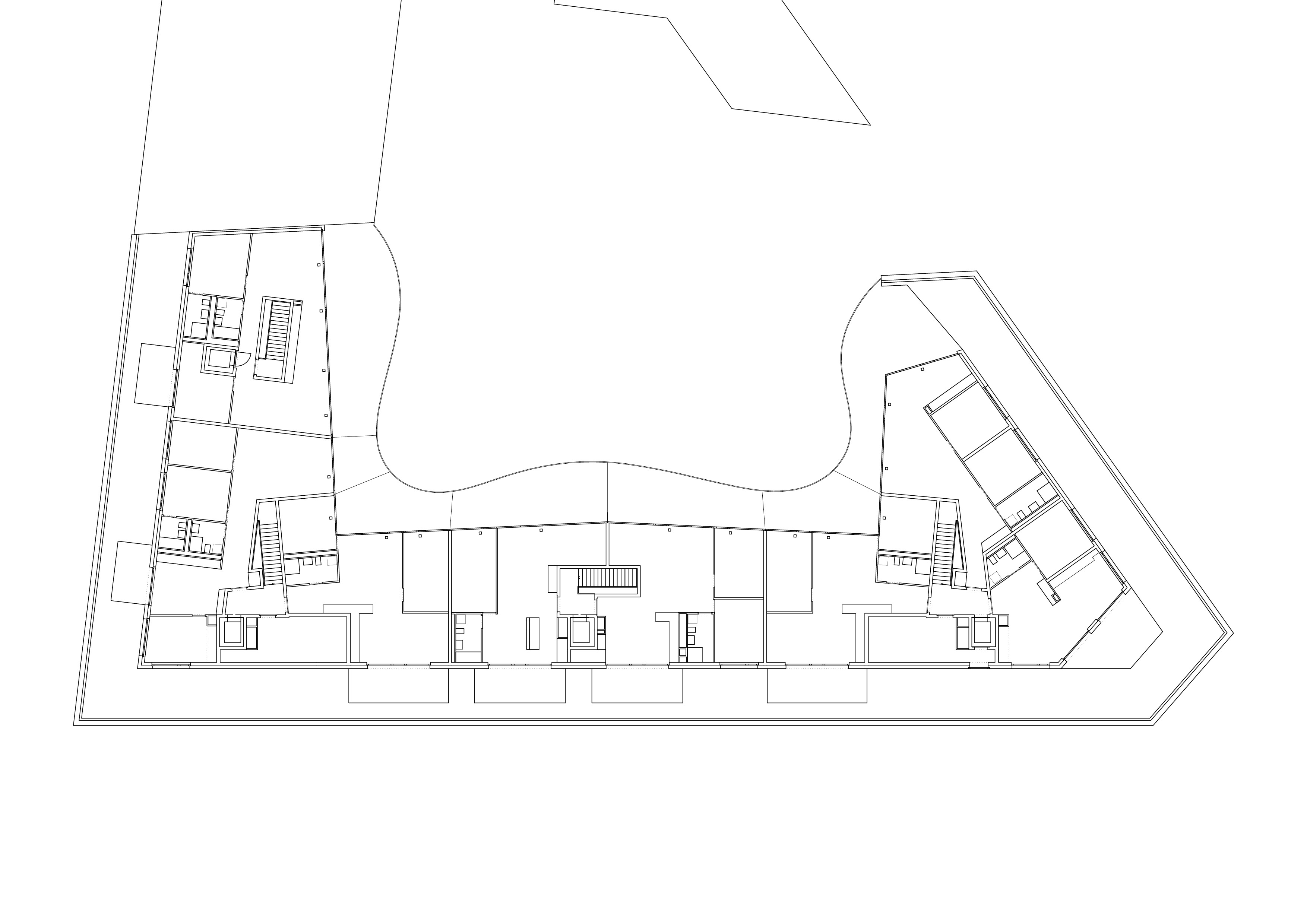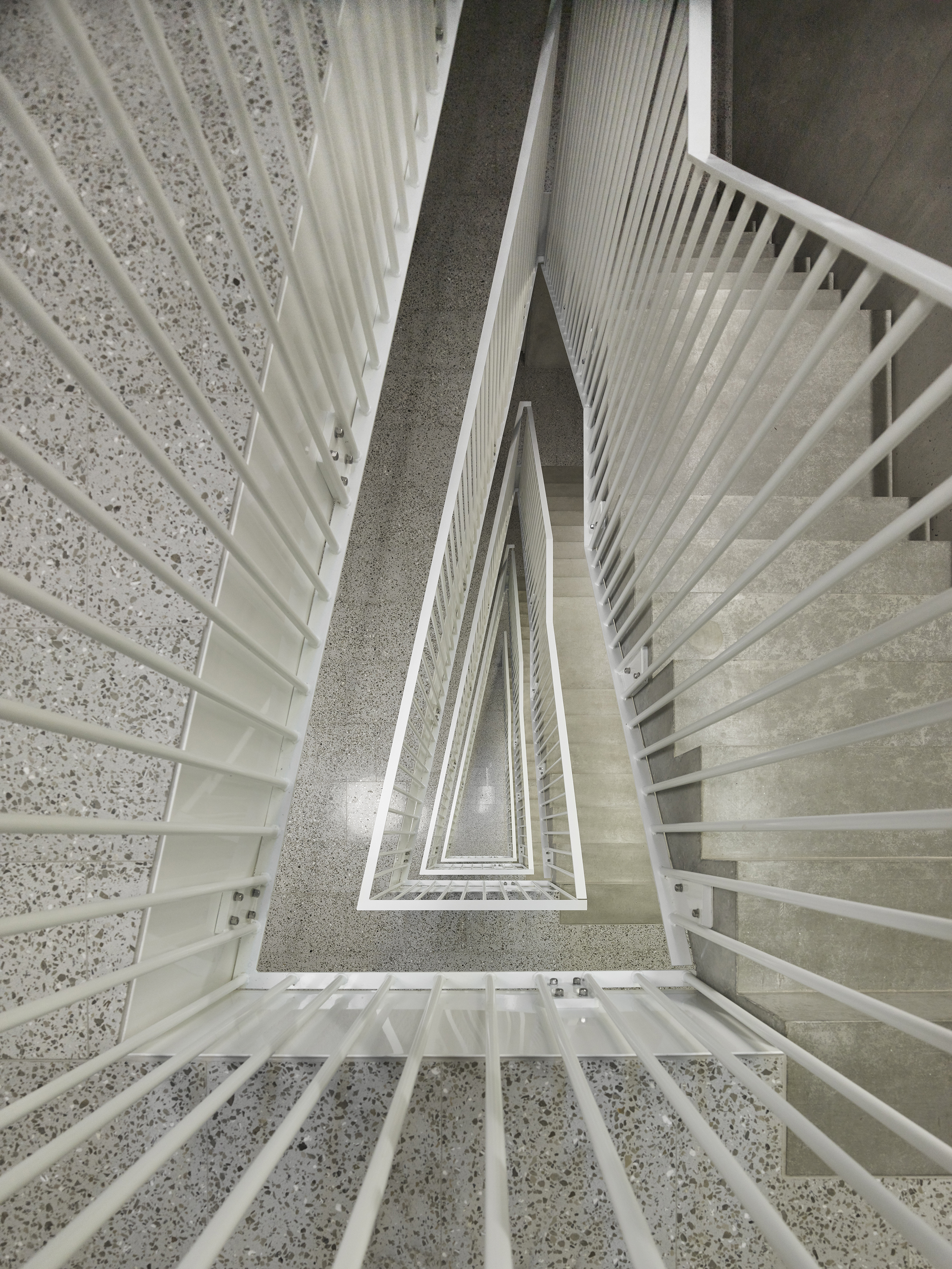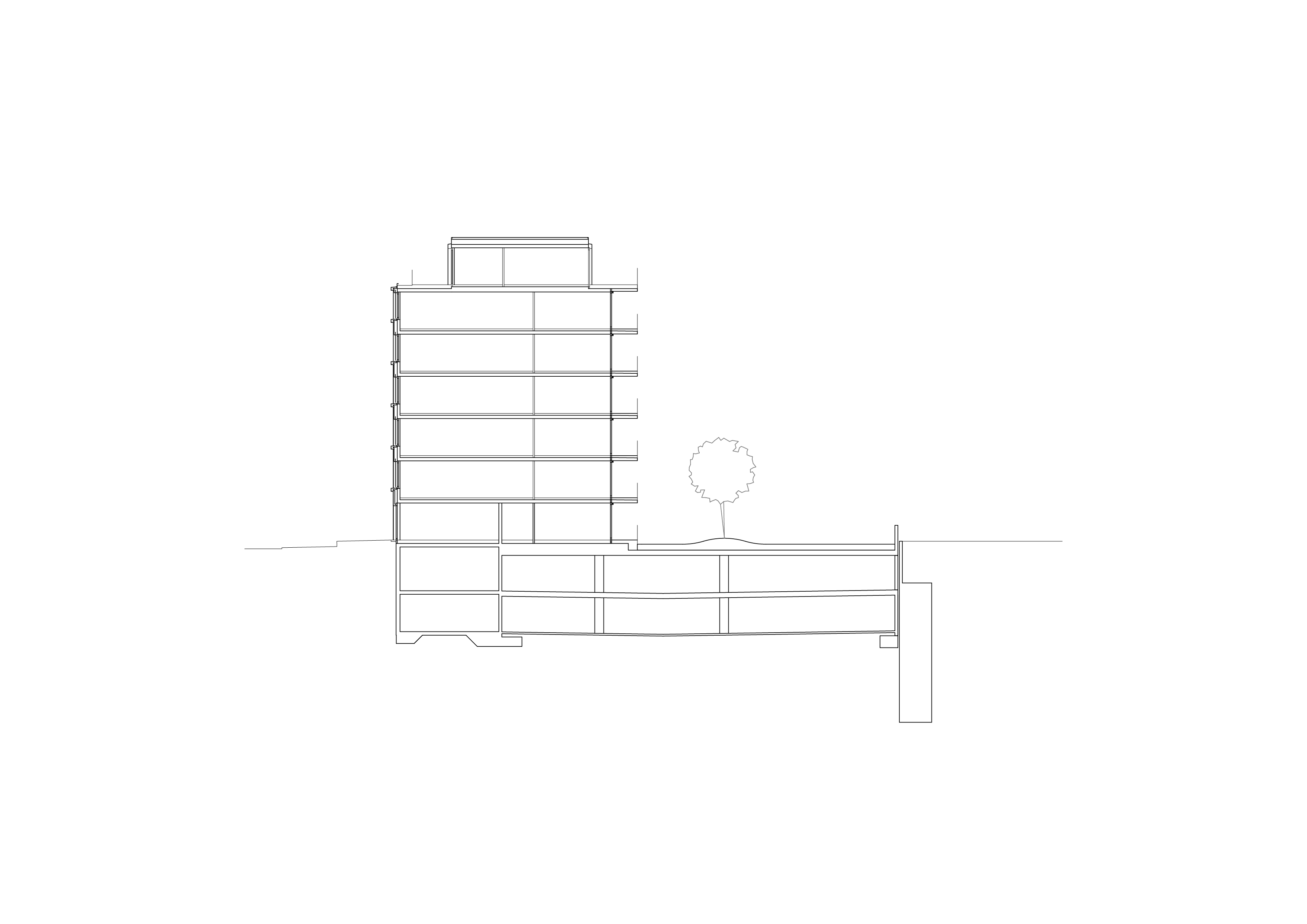 L’immeuble comporte six niveaux couronnés d’un étage en attique. Une grande diversité d’appartements est offerte. Quatre cages d’escalier distribuent quinze appartements par étage. Les grands appartements sont traversant de rue à cour, certains jouissent de la double orientation aux angles, et les plus petits sont mono-orientés. Le rez-de-chaussée organise des surfaces d’activités commerciales sur rues, adossées à des appartements ou bureaux orientés sur cour. La matérialité des façades est minérale. Les espaces communs, parking et cages d’escalier, sont en béton apparent. Le barreaudage extérieur est décliné en garde-corps intérieur. La matérialisation des logements est classique, parquet chêne, cloisons et plafonds enduits, menuiserie peinte.