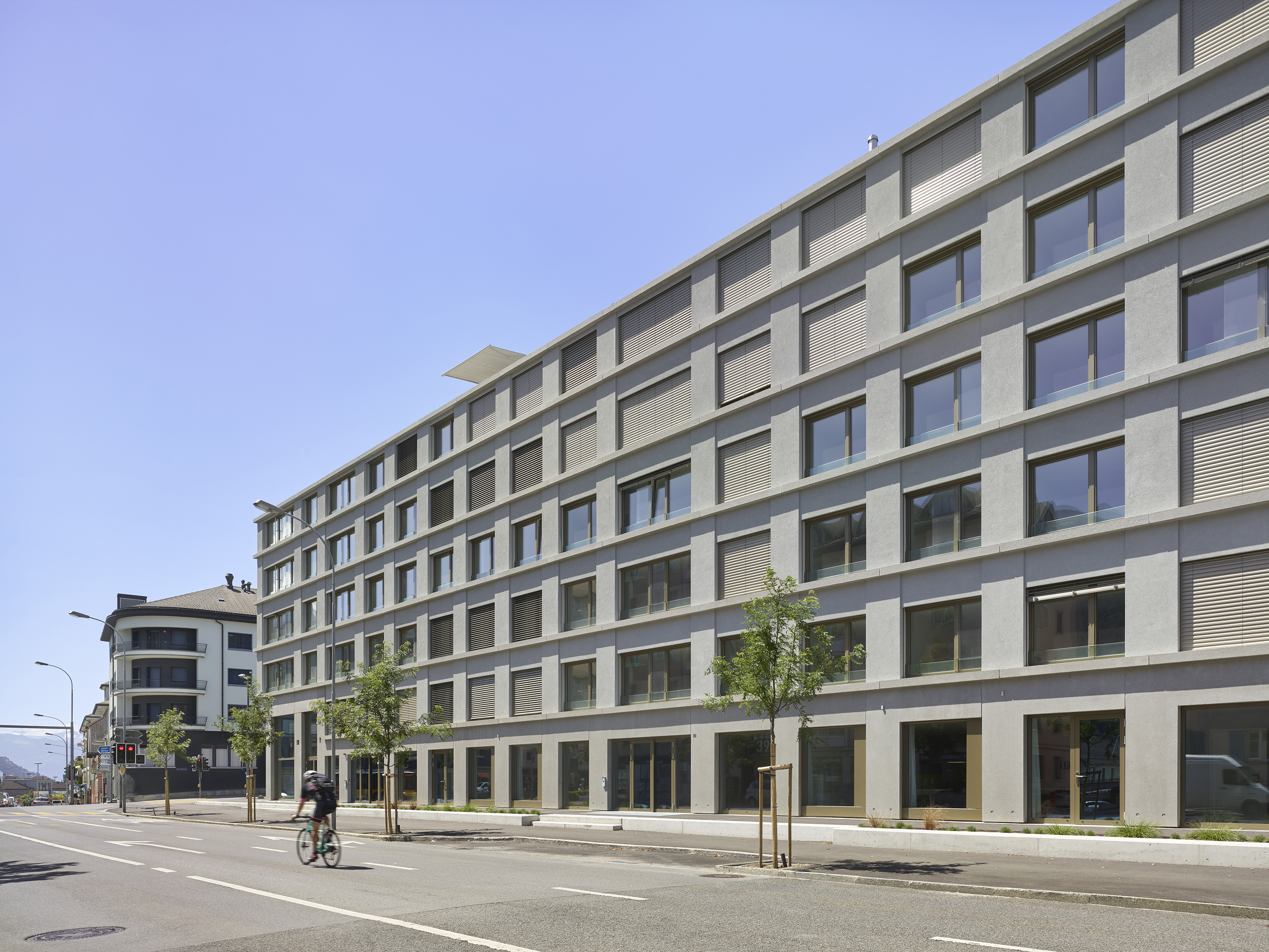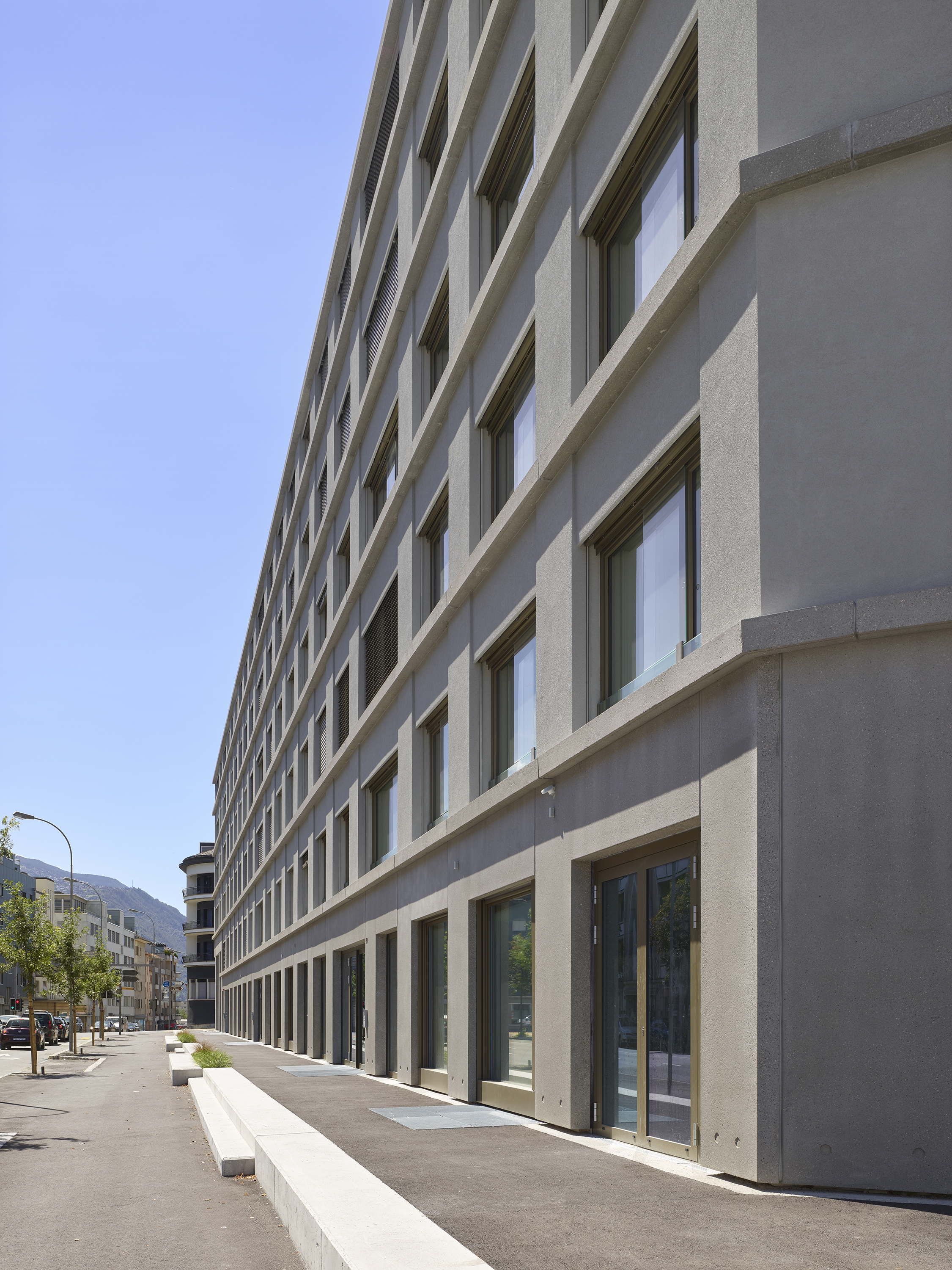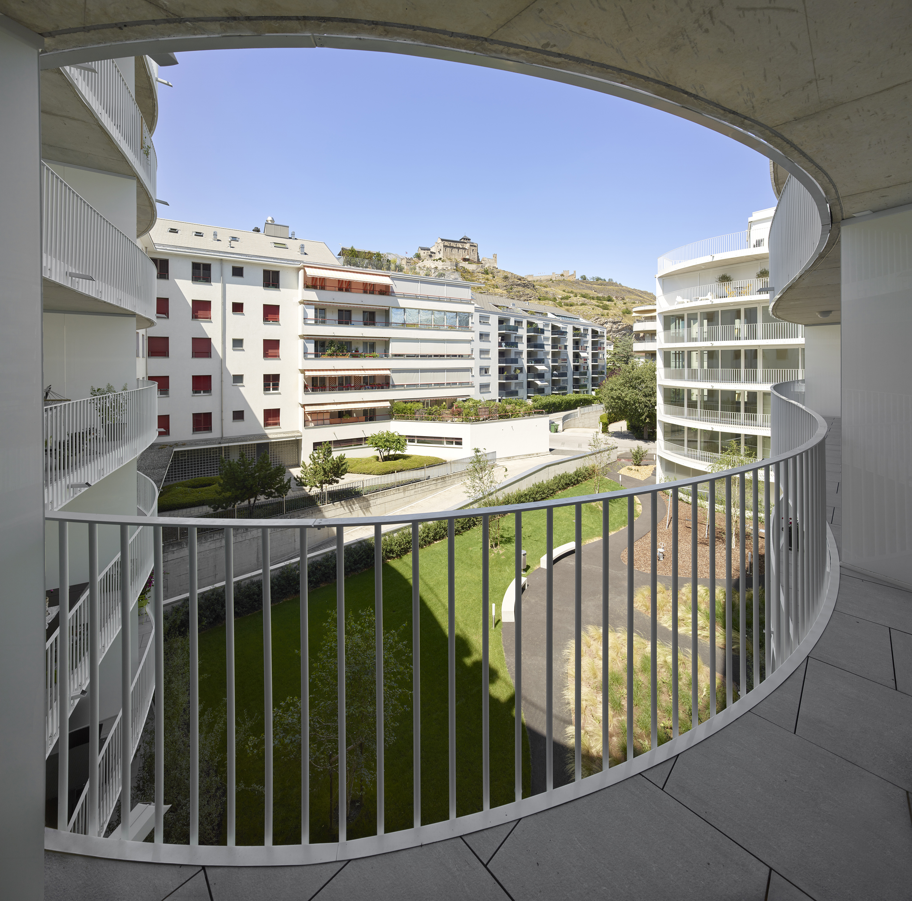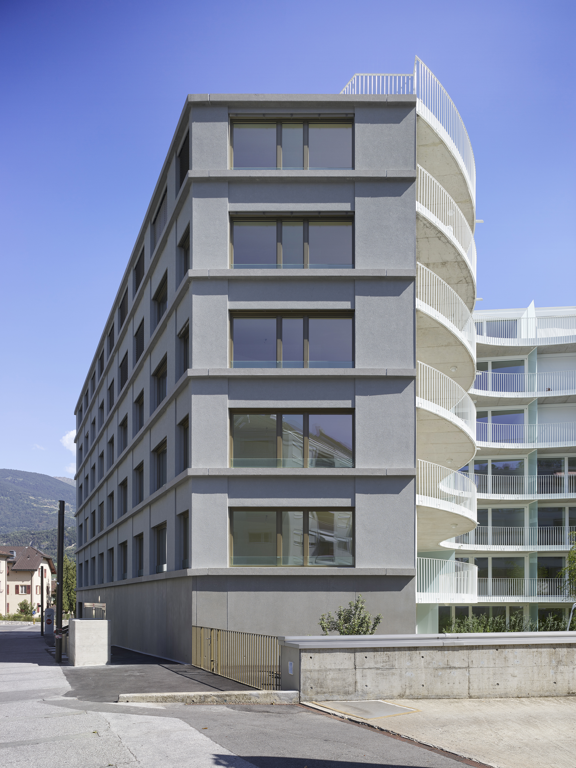 Les façades sur rues présentent une modénature rigoureuse, rythmée par les grandes fenêtres, appuyées sur des tablettes continues en saillie. Le socle en béton préfabriqué sablé assied le bâtiment sur rue. L’angle Tourbillon Dixence, net et franc, est traité en double hauteur. Les façades sur cour sont tout en facettes et courbes créant une ambiance différente, largement ouverte sur le jardin intérieur, avec vues sur les châteaux dominant la ville. Les garde-corps, en barreaudages verticaux, soulignent le dessin en courbes des balcons continus.