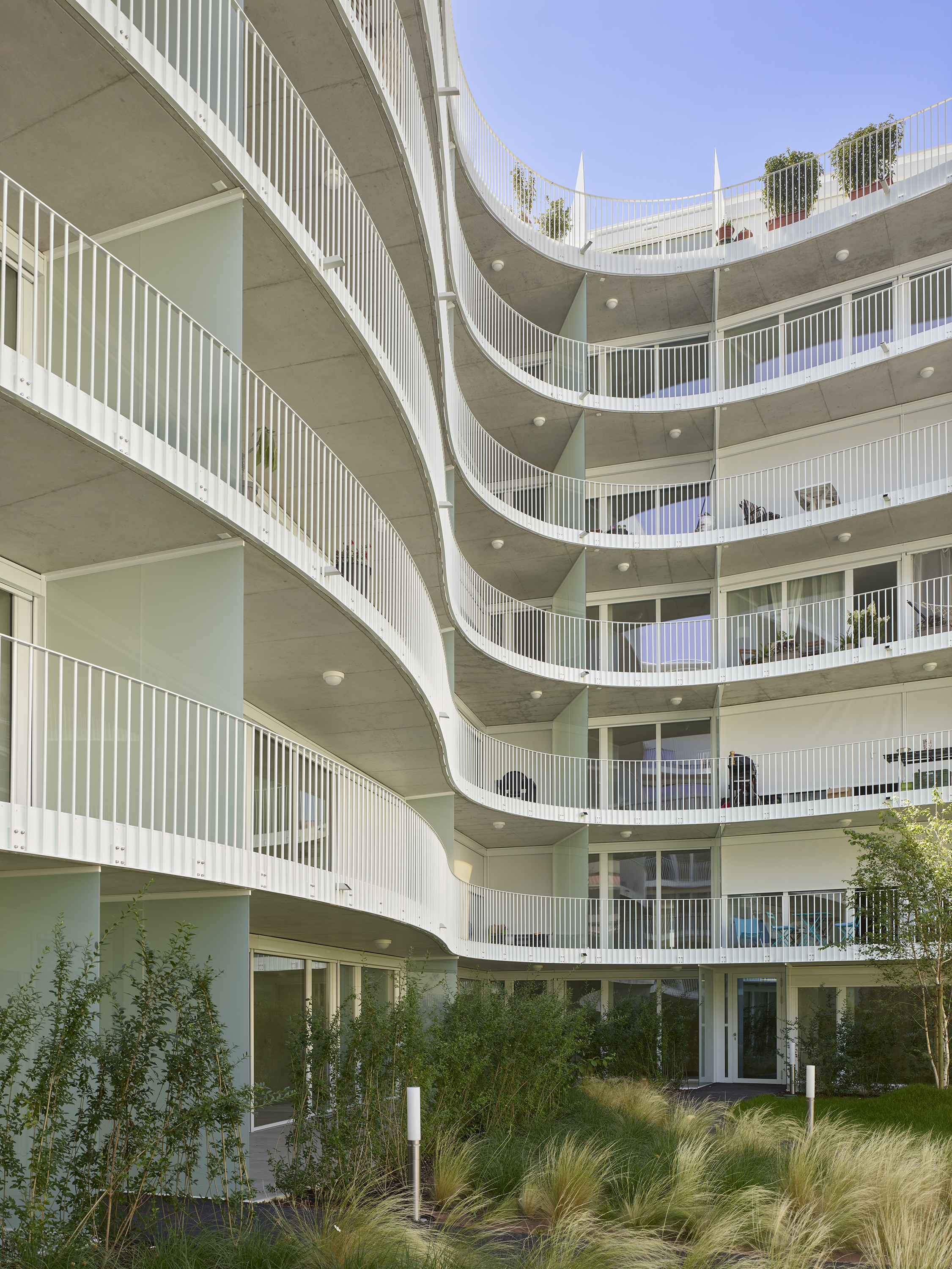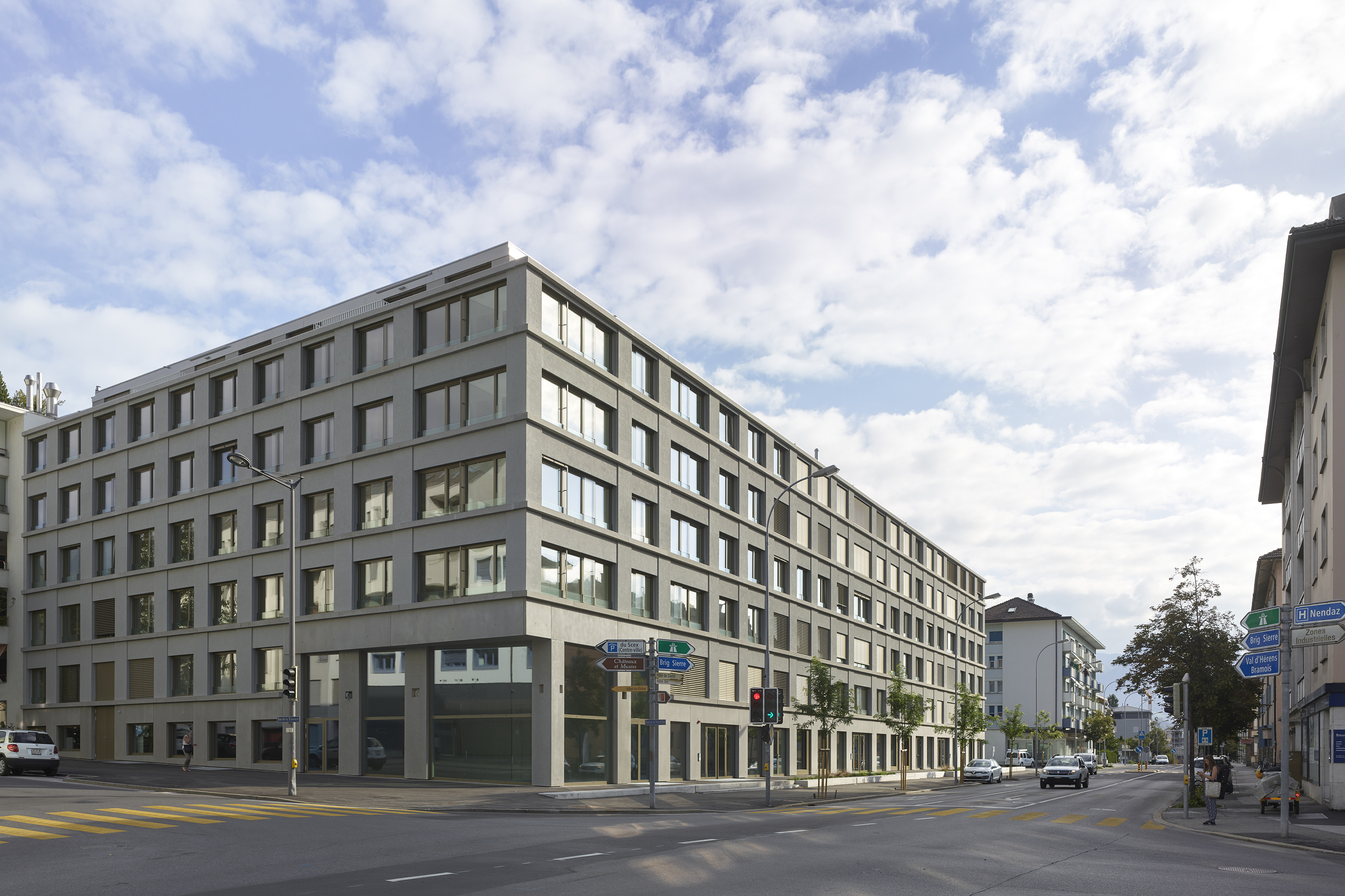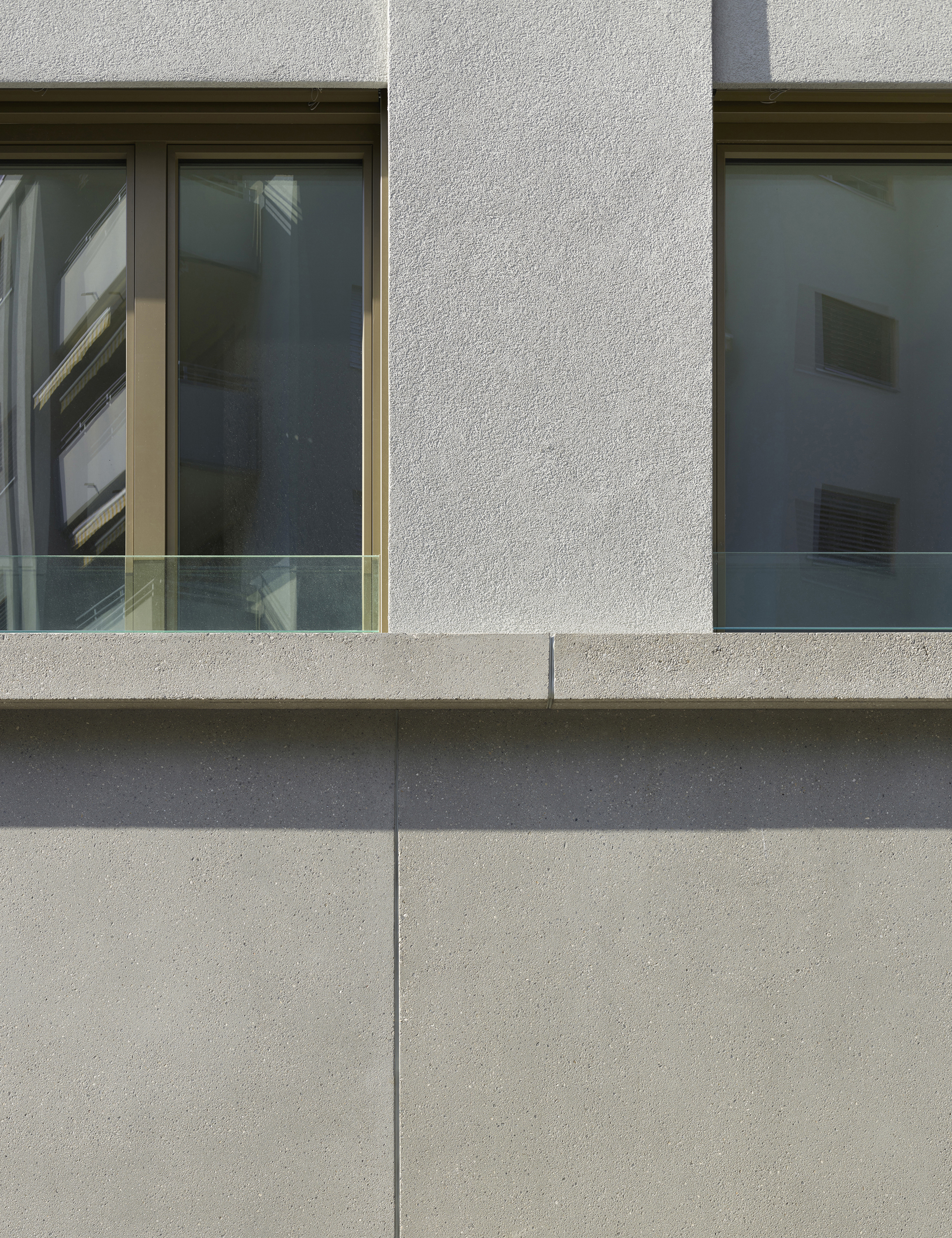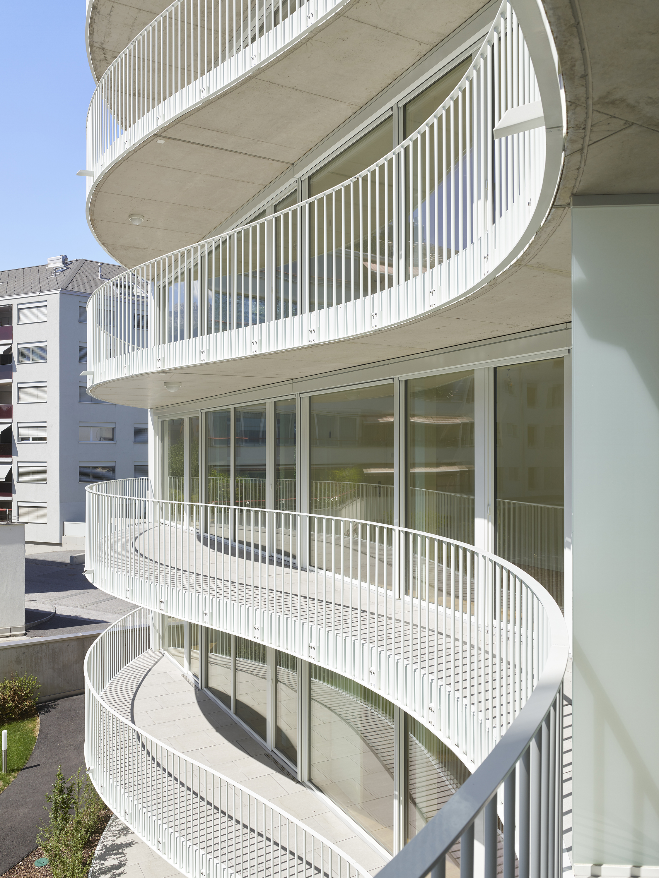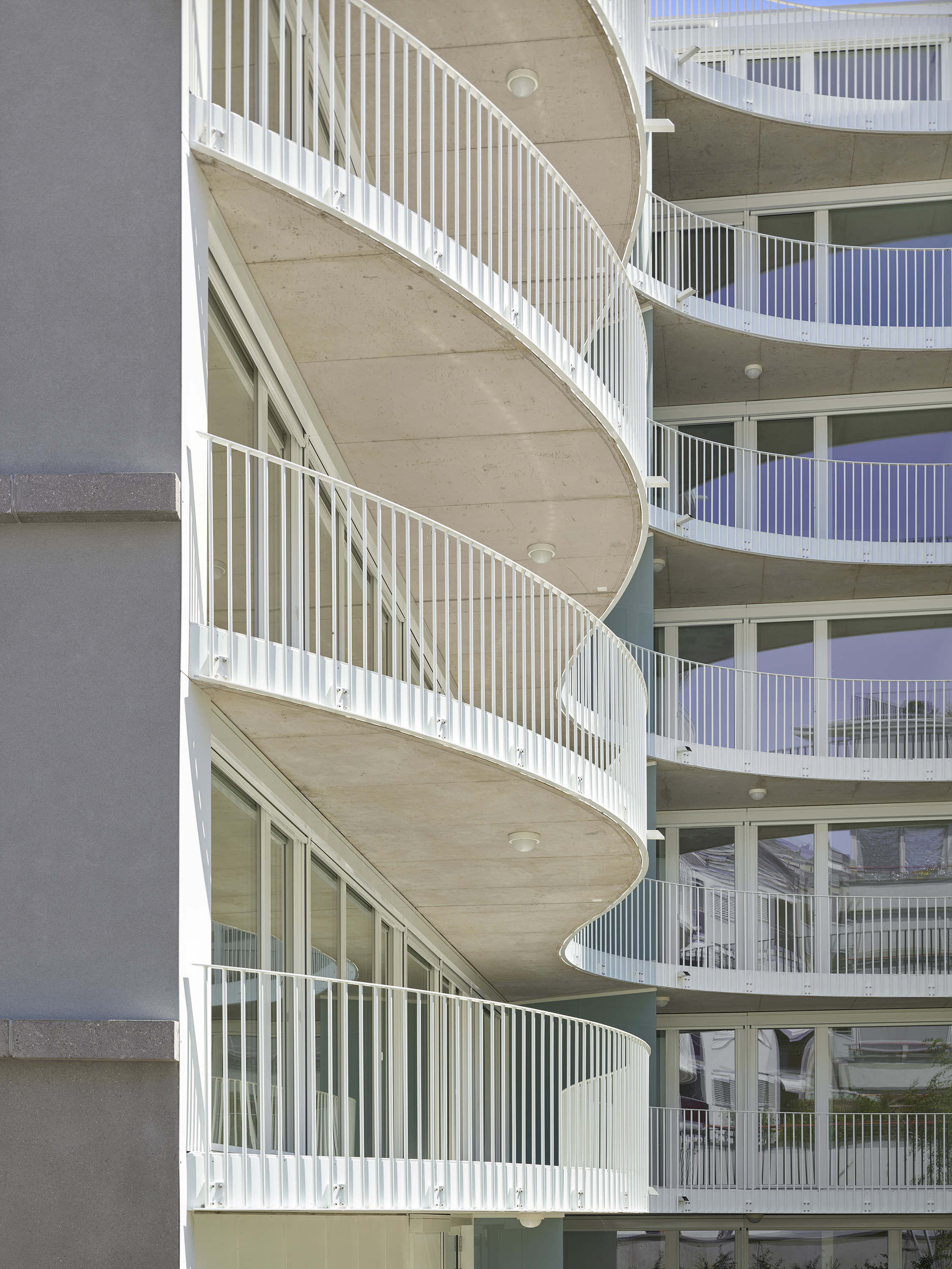 Les façades sur rues présentent une modénature rigoureuse, rythmée par les grandes fenêtres, appuyées sur des tablettes continues en saillie. Le socle en béton préfabriqué sablé assied le bâtiment sur rue. L’angle Tourbillon Dixence, net et franc, est traité en double hauteur. Les façades sur cour sont tout en facettes et courbes créant une ambiance différente, largement ouverte sur le jardin intérieur, avec vues sur les châteaux dominant la ville. Les garde-corps, en barreaudages verticaux, soulignent le dessin en courbes des balcons continus.