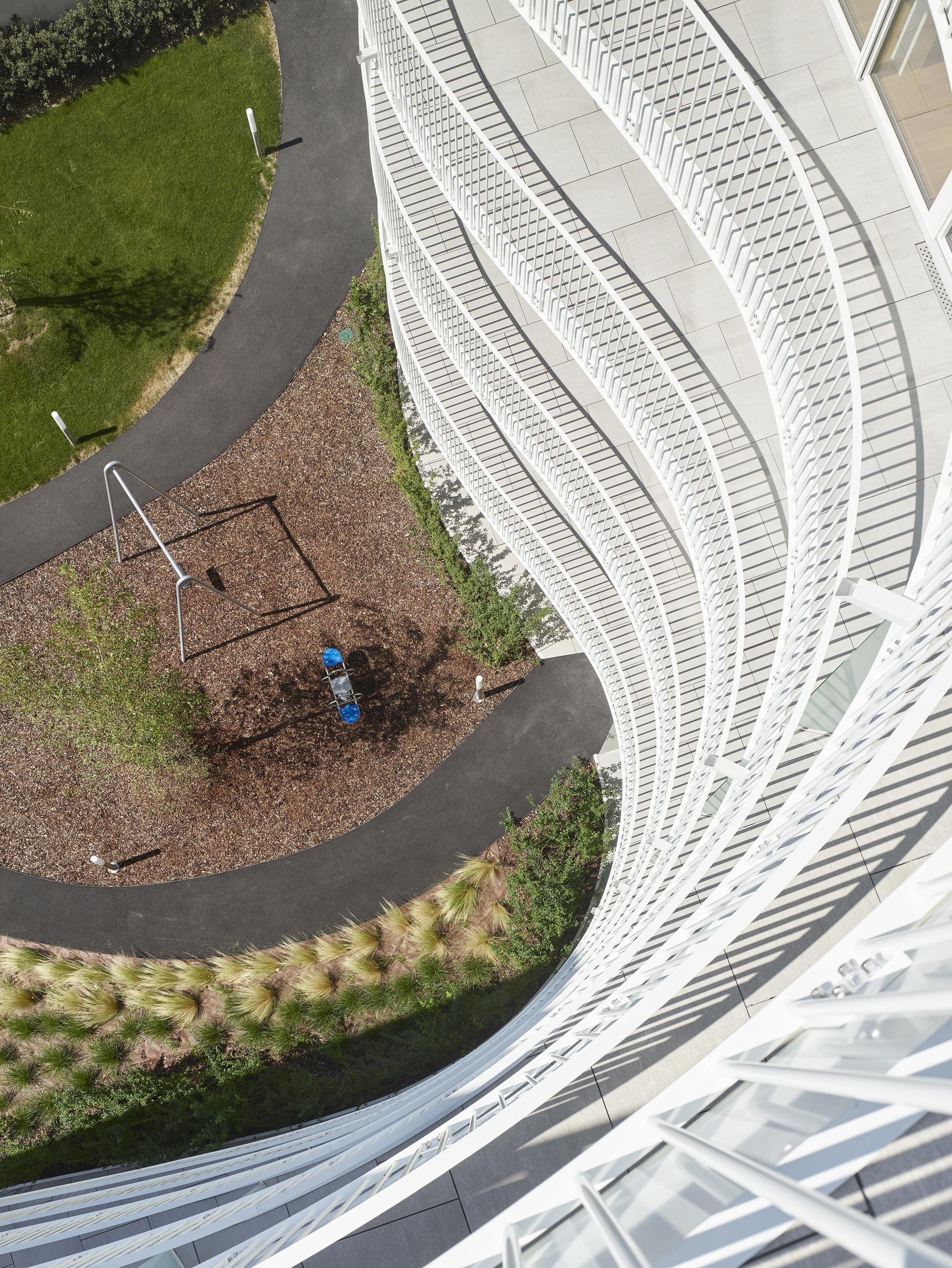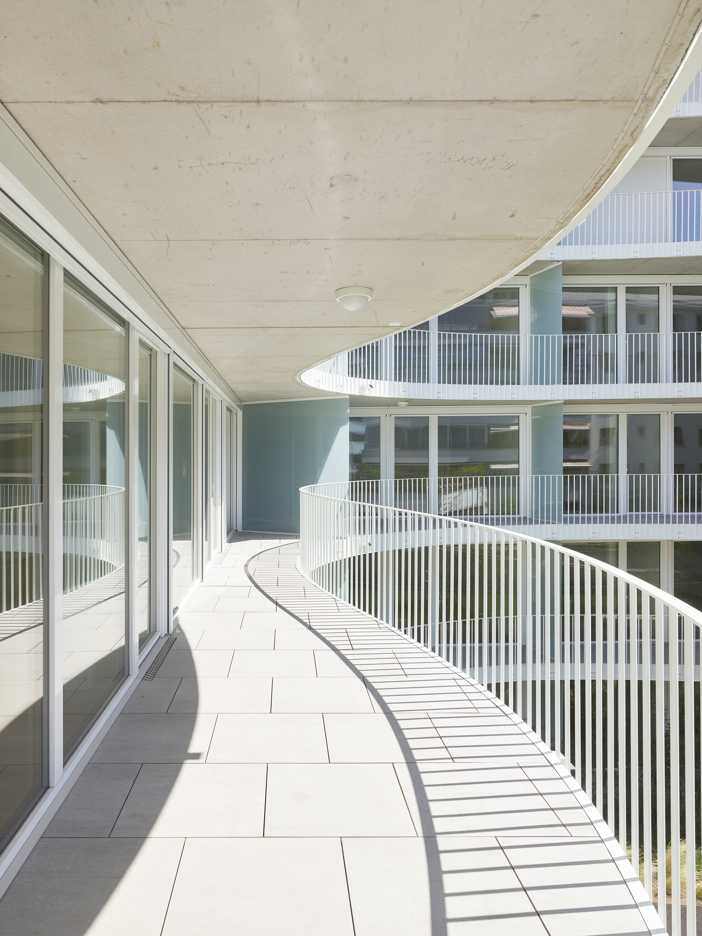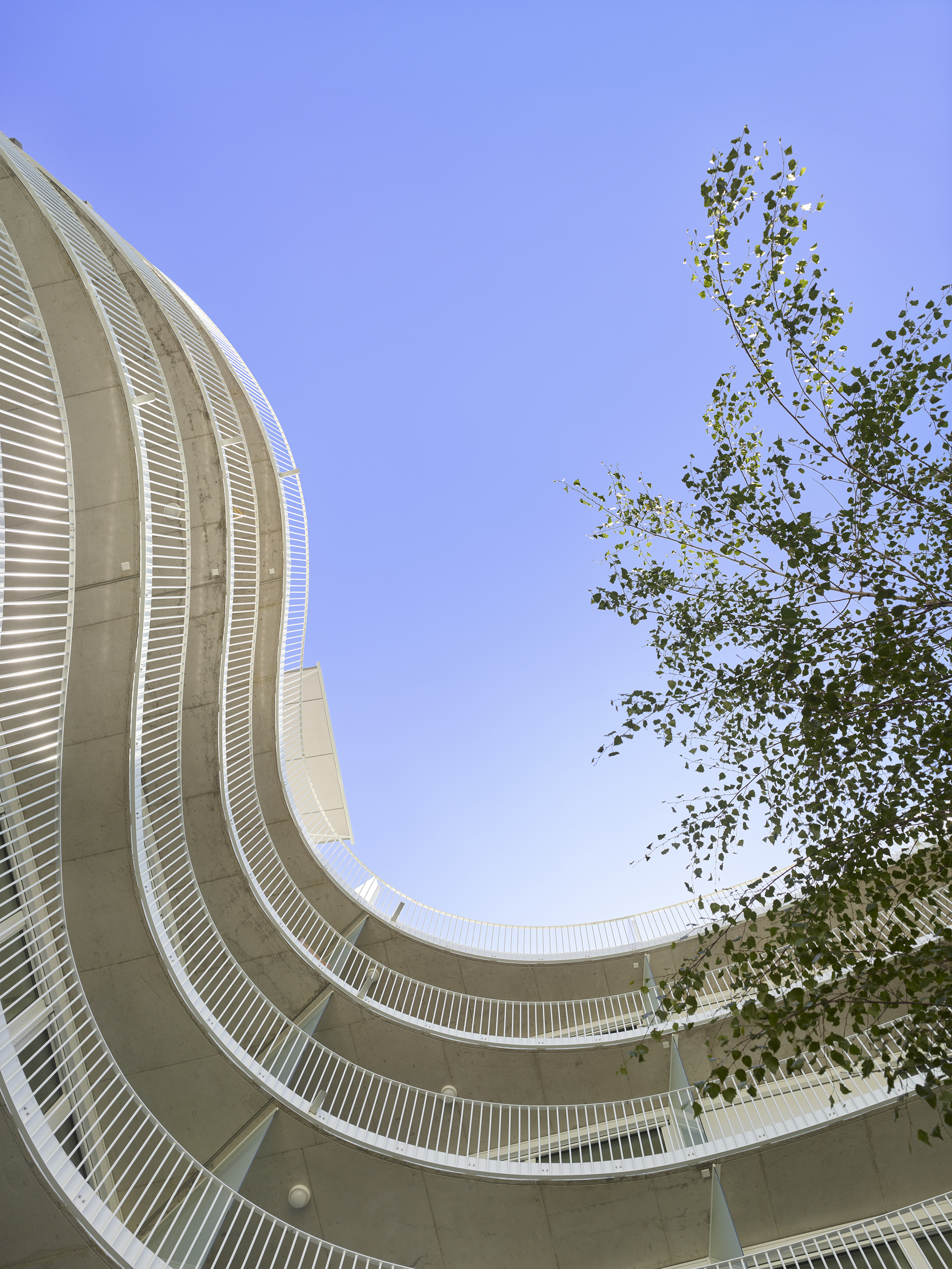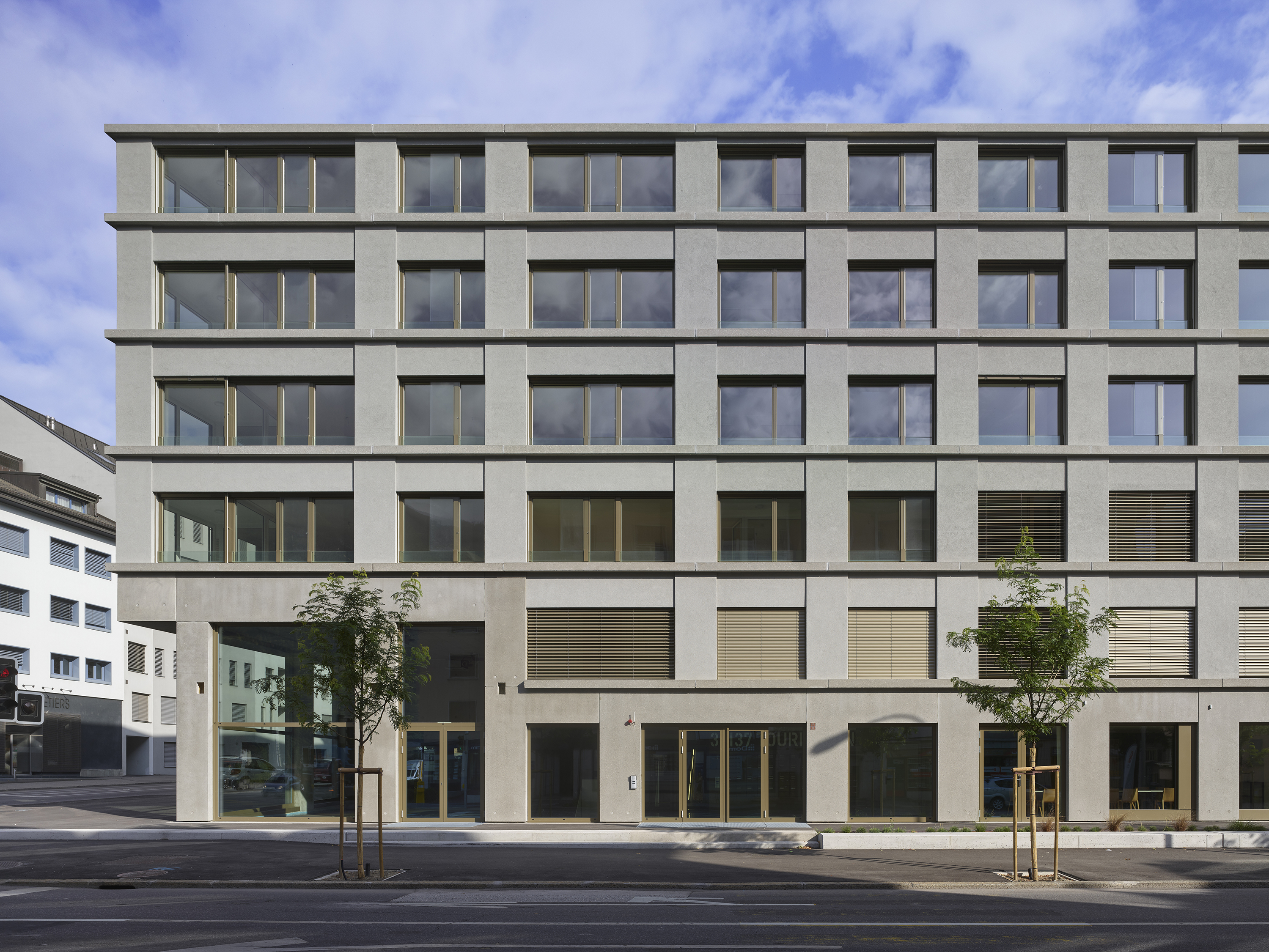 Les façades sur rues présentent une modénature rigoureuse, rythmée par les grandes fenêtres, appuyées sur des tablettes continues en saillie. Le socle en béton préfabriqué sablé assied le bâtiment sur rue. L’angle Tourbillon Dixence, net et franc, est traité en double hauteur. Les façades sur cour sont tout en facettes et courbes créant une ambiance différente, largement ouverte sur le jardin intérieur, avec vues sur les châteaux dominant la ville. Les garde-corps, en barreaudages verticaux, soulignent le dessin en courbes des balcons continus.