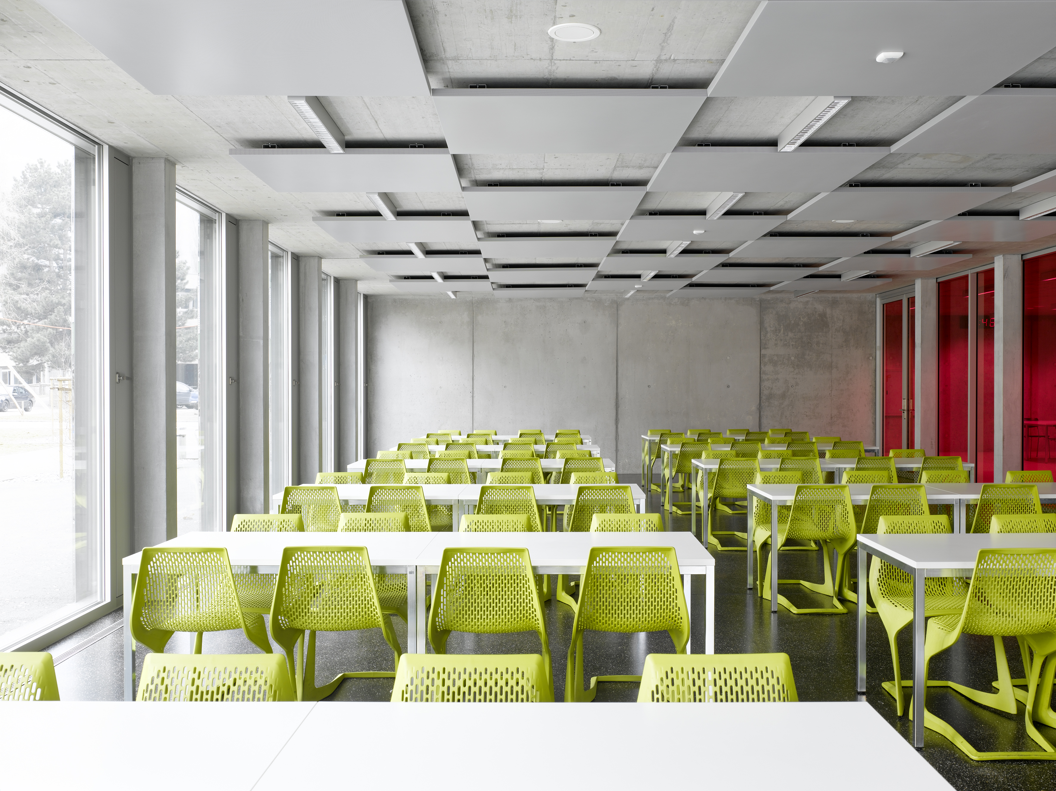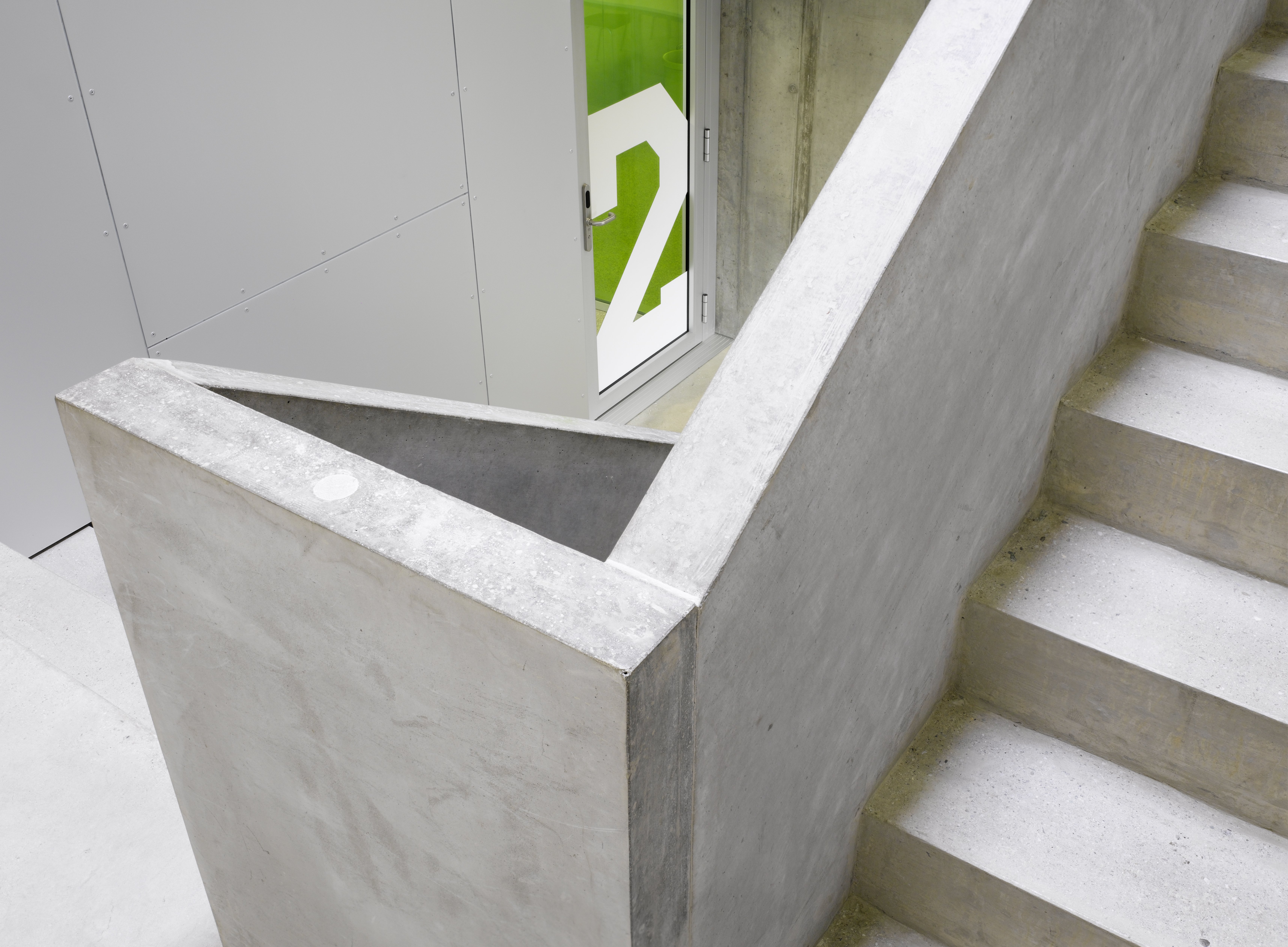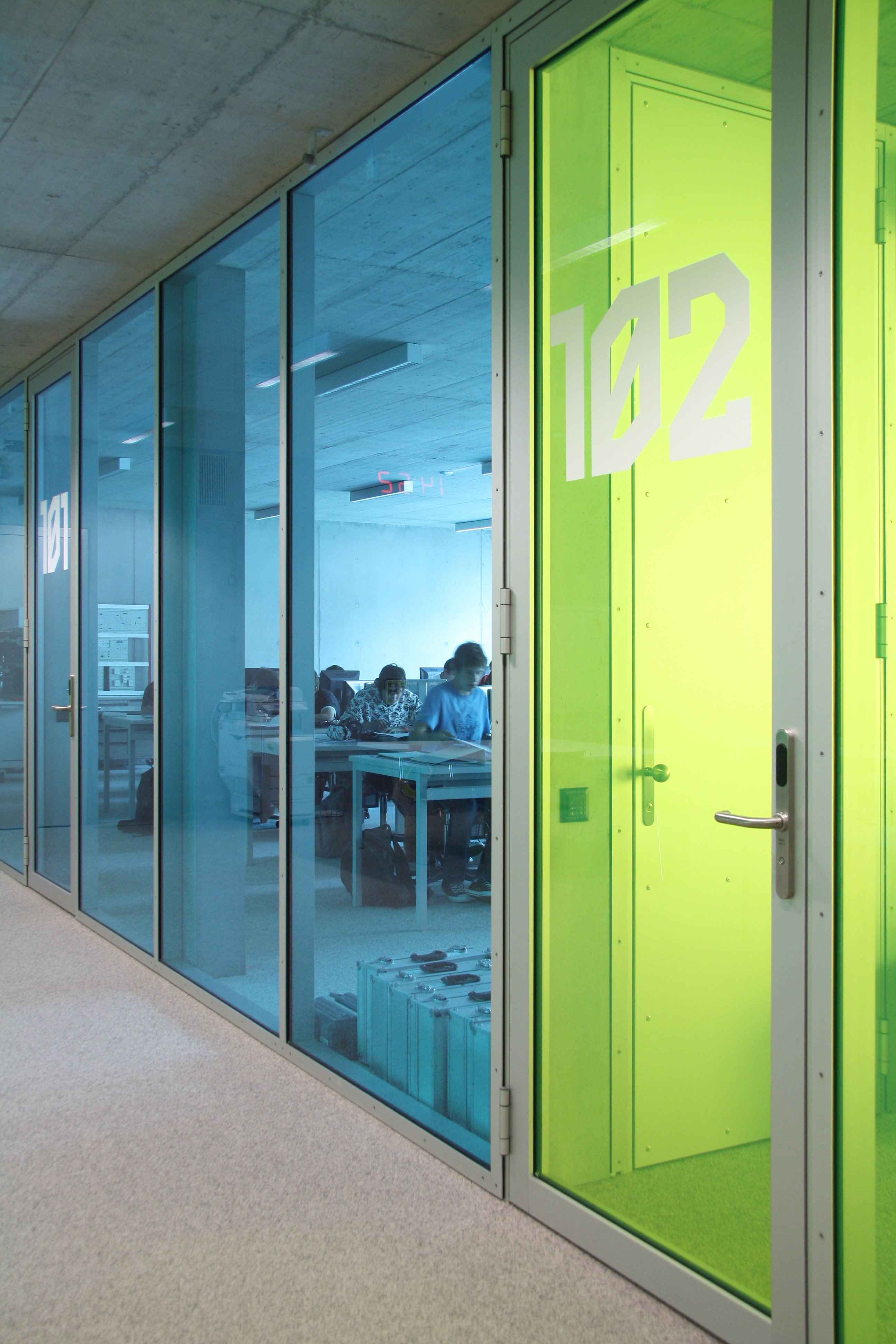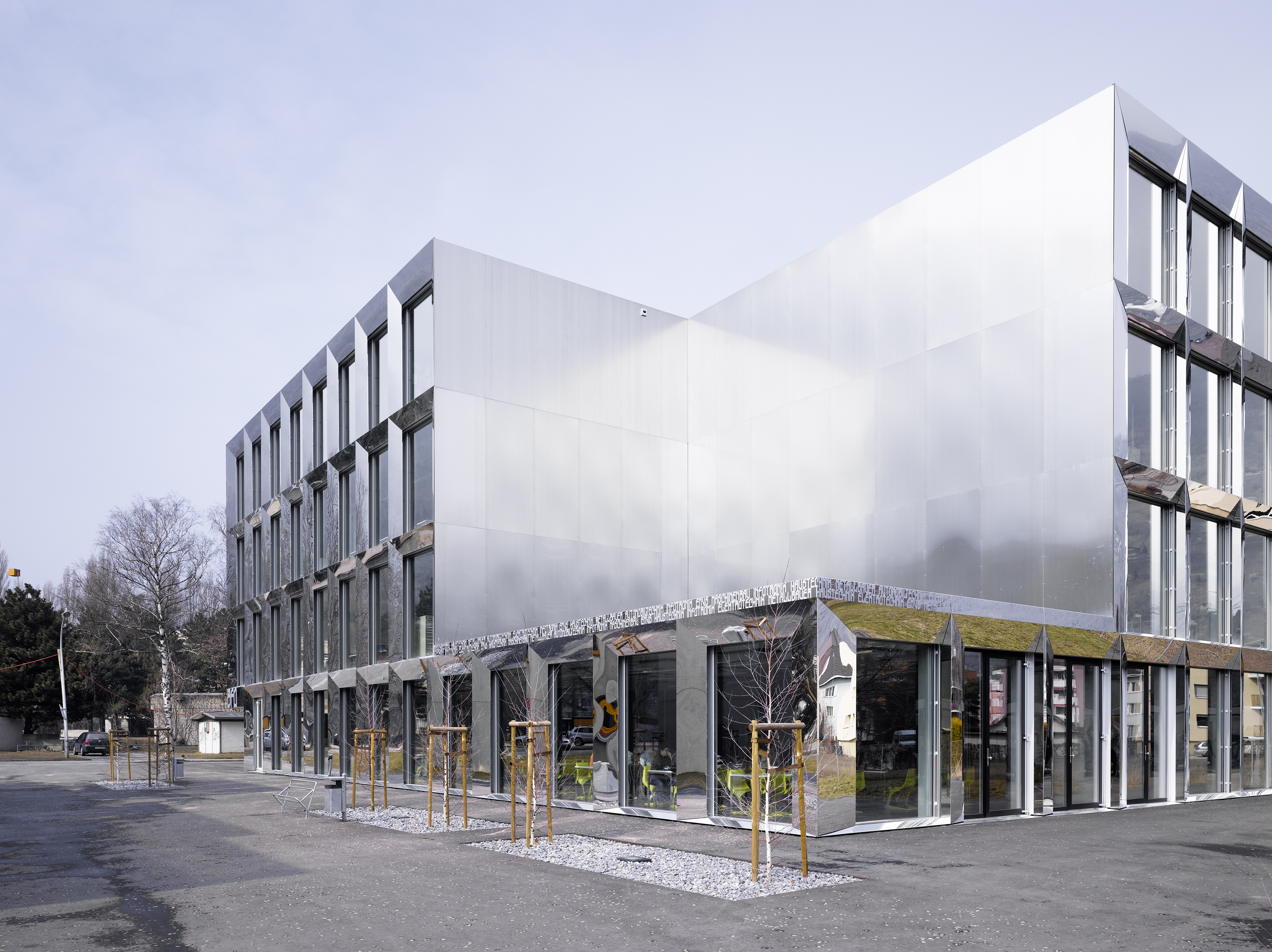 La typologie développée reprend celle du bâtiment des années soixante avec son hall central de distribution mais la radicalise en un plan à trois strates, la couche centrale servant d’espace de distribution et d’espace de travail en groupe. La transparence des cloisons légères laisse permet l’éclairage naturel de cet espace. Cette typologie interfère immanquablement le concept pédagogique. La matérialité intérieure se limite au béton brut du porteur, à l’aluminium associé au verre coloré des cloisons légères, décliné en différents tons de vert. La matérialité extérieure confirme le jeu volumétrique, carrossage en inox poli miroir des vitrages et bardage d’aluminium brut pour les parties retranchées au quadrilatère de base. La défragmentation de l’image reflétée du fait de la forme en biseau du capot compose un nouveau contexte.
