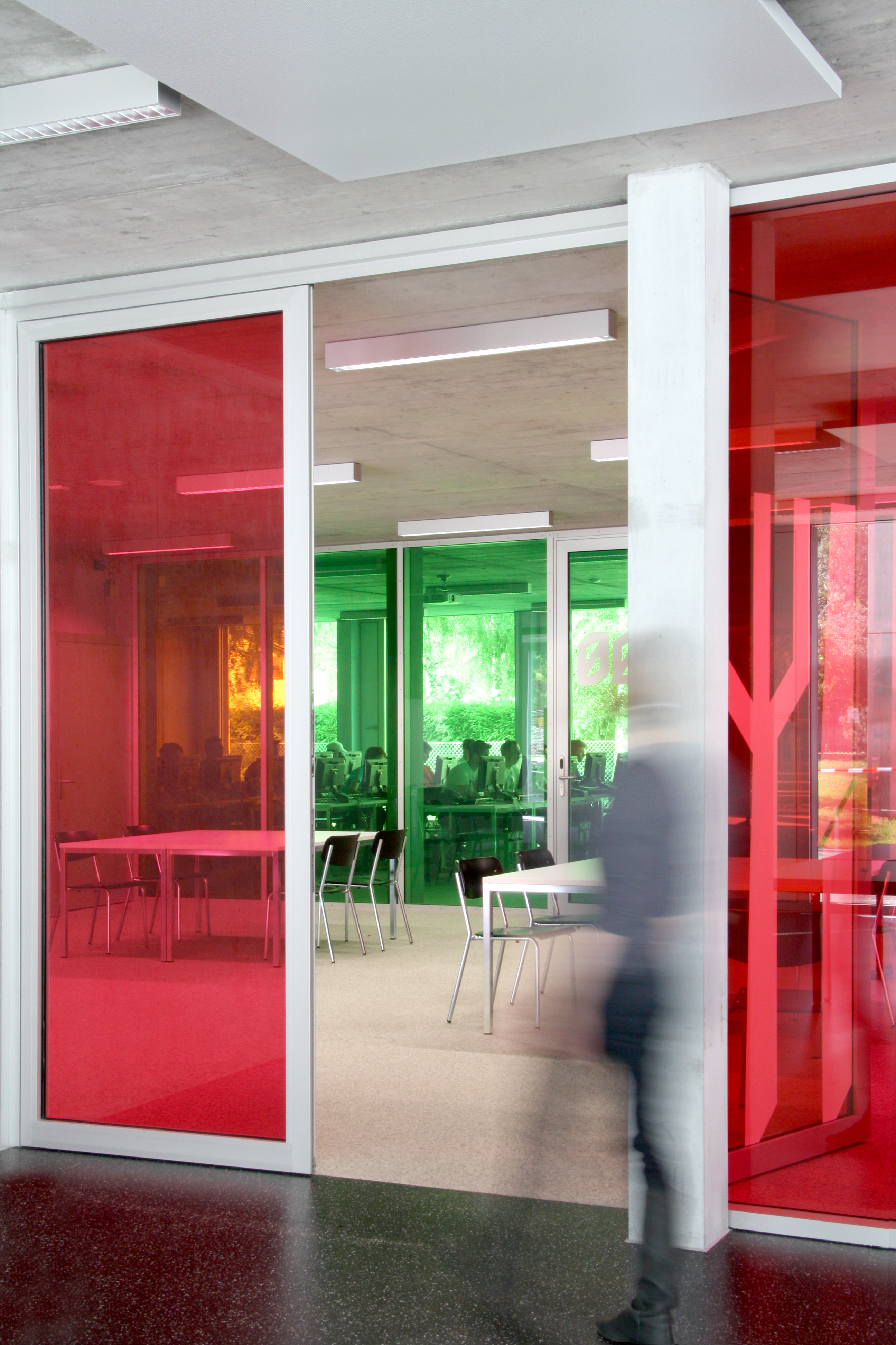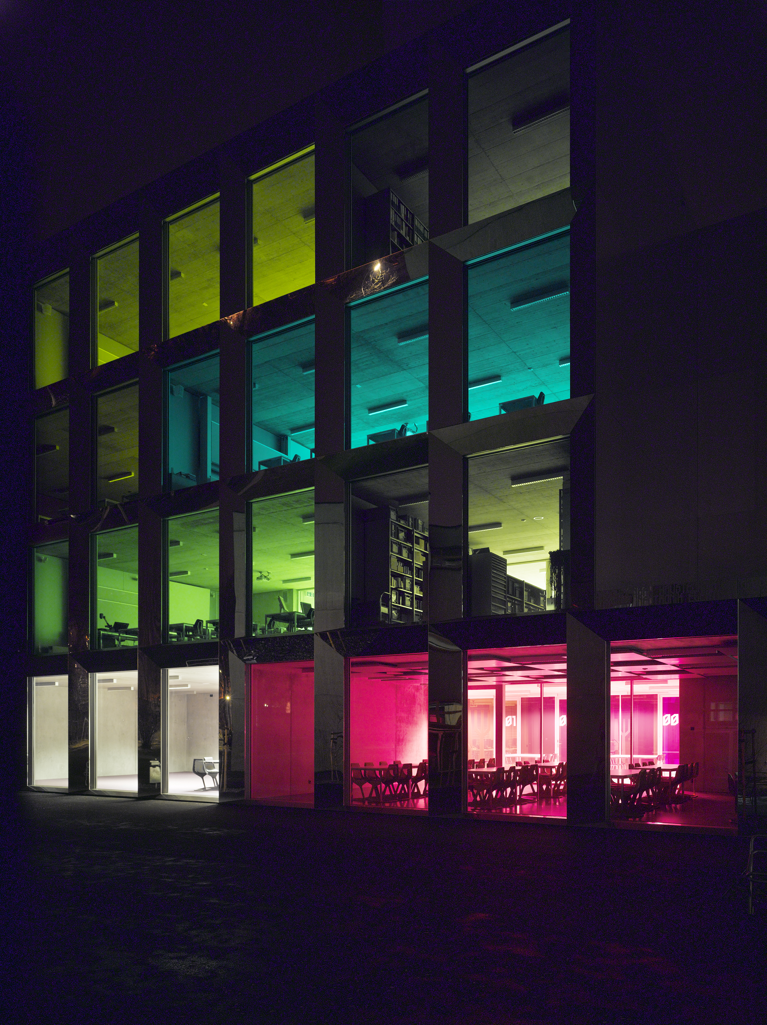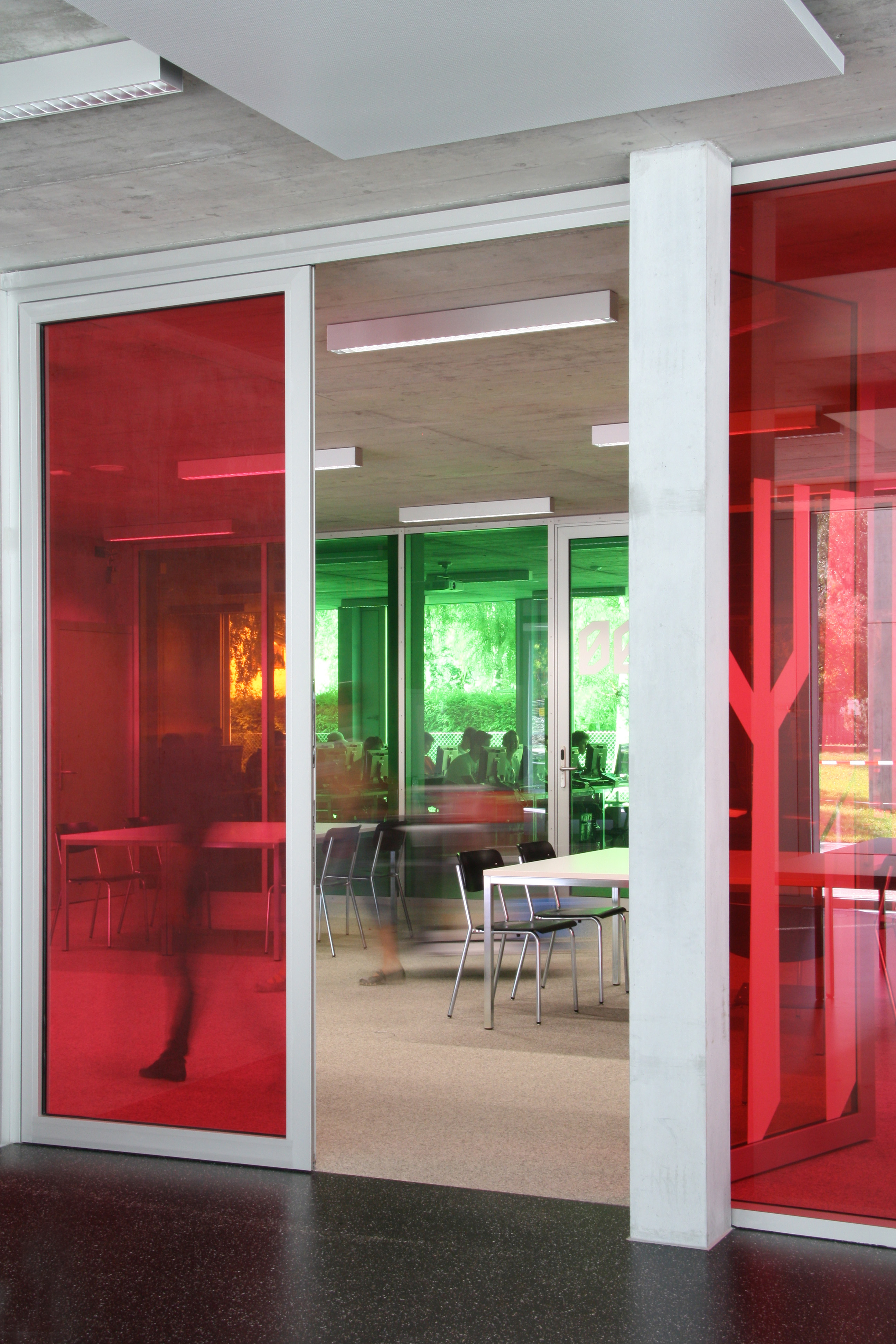 La typologie développée reprend celle du bâtiment des années soixante avec son hall central de distribution mais la radicalise en un plan à trois strates, la couche centrale servant d’espace de distribution et d’espace de travail en groupe. La transparence des cloisons légères laisse permet l’éclairage naturel de cet espace. Cette typologie interfère immanquablement le concept pédagogique. La matérialité intérieure se limite au béton brut du porteur, à l’aluminium associé au verre coloré des cloisons légères, décliné en différents tons de vert. La matérialité extérieure confirme le jeu volumétrique, carrossage en inox poli miroir des vitrages et bardage d’aluminium brut pour les parties retranchées au quadrilatère de base. La défragmentation de l’image reflétée du fait de la forme en biseau du capot compose un nouveau contexte.