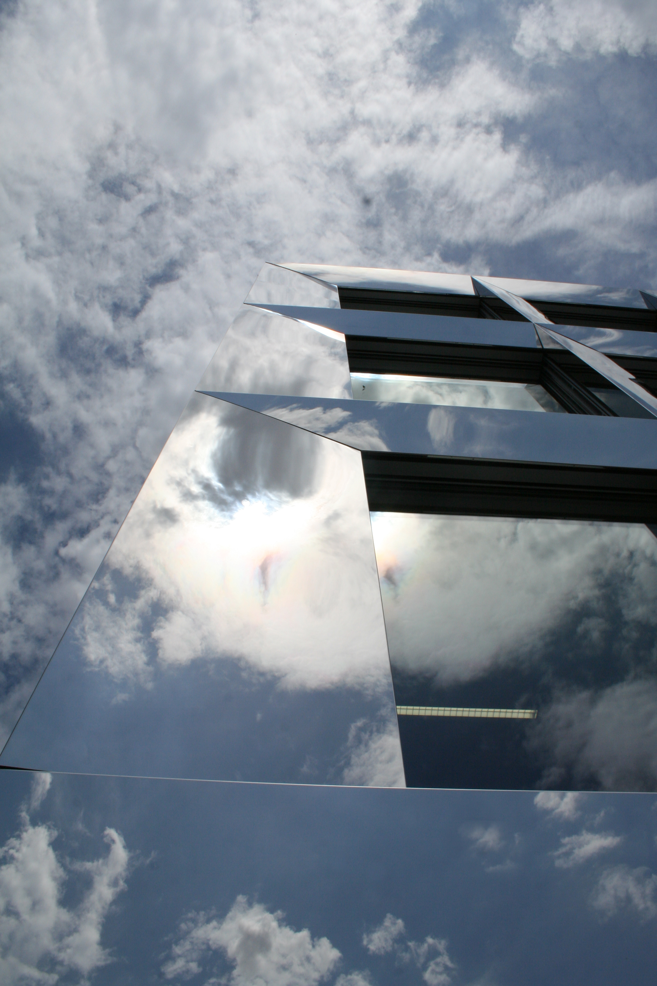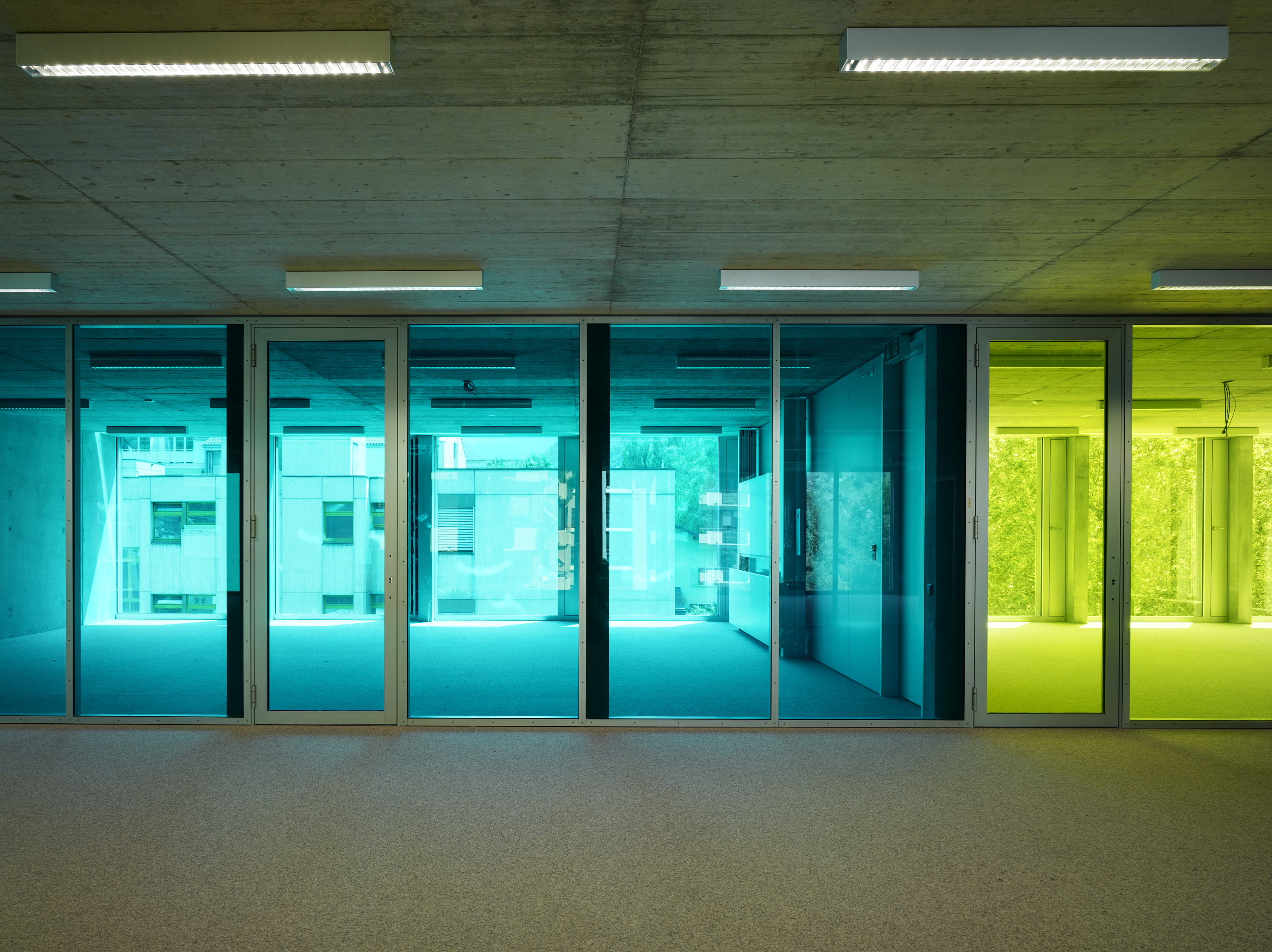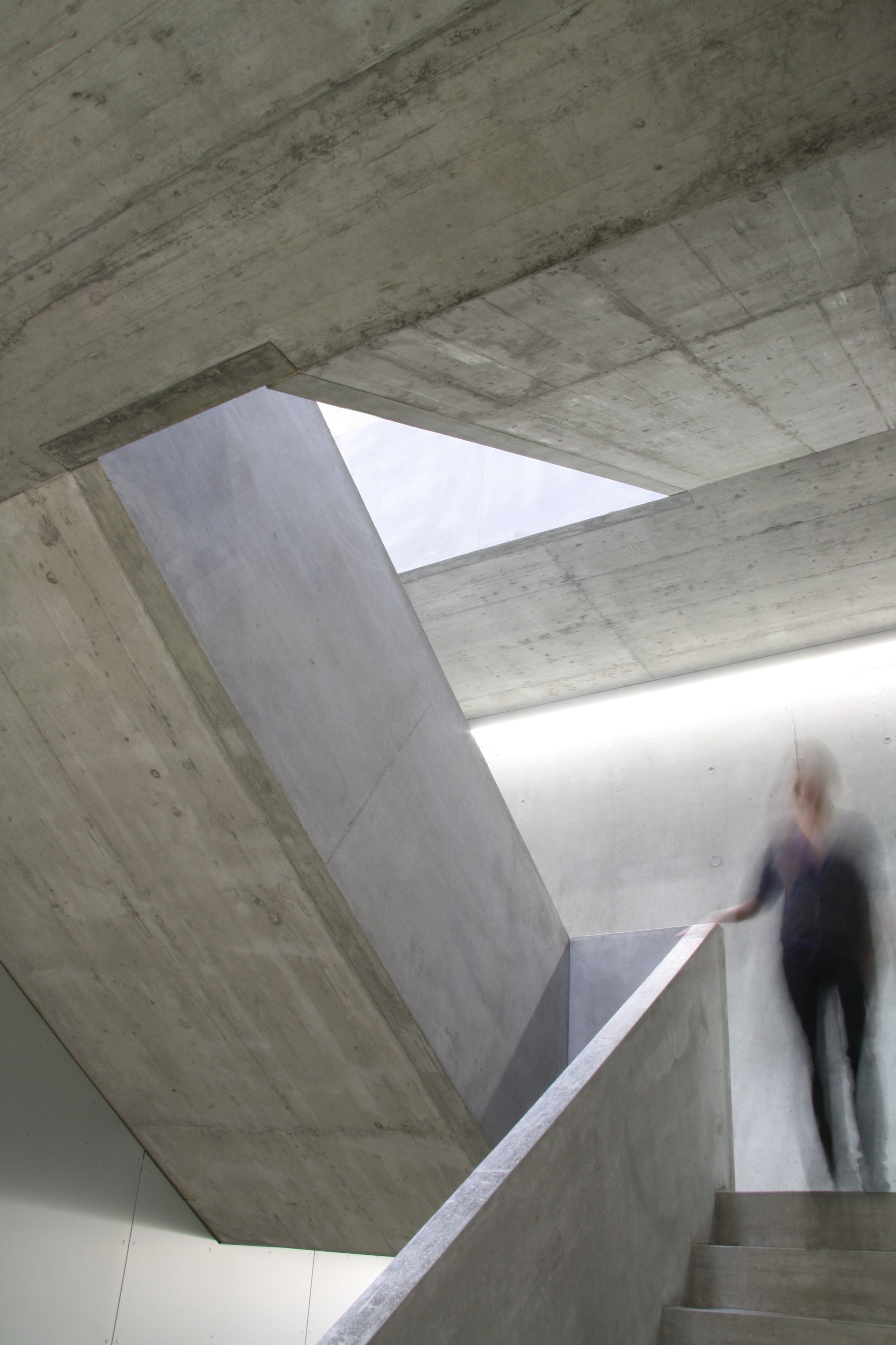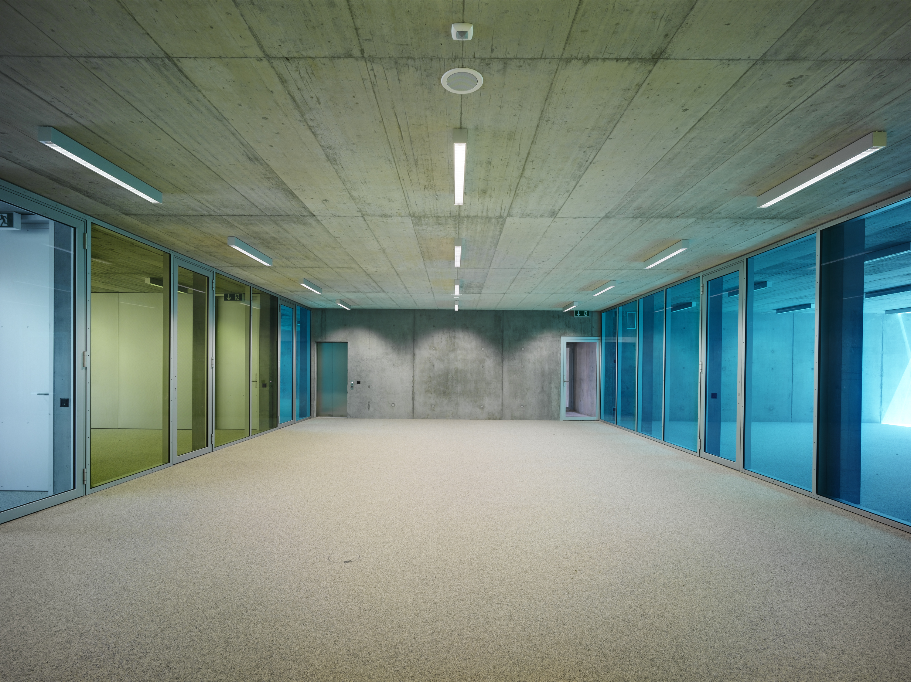 La typologie développée reprend celle du bâtiment des années soixante avec son hall central de distribution mais la radicalise en un plan à trois strates, la couche centrale servant d’espace de distribution et d’espace de travail en groupe. La transparence des cloisons légères laisse permet l’éclairage naturel de cet espace. Cette typologie interfère immanquablement le concept pédagogique. La matérialité intérieure se limite au béton brut du porteur, à l’aluminium associé au verre coloré des cloisons légères, décliné en différents tons de vert. La matérialité extérieure confirme le jeu volumétrique, carrossage en inox poli miroir des vitrages et bardage d’aluminium brut pour les parties retranchées au quadrilatère de base. La défragmentation de l’image reflétée du fait de la forme en biseau du capot compose un nouveau contexte.