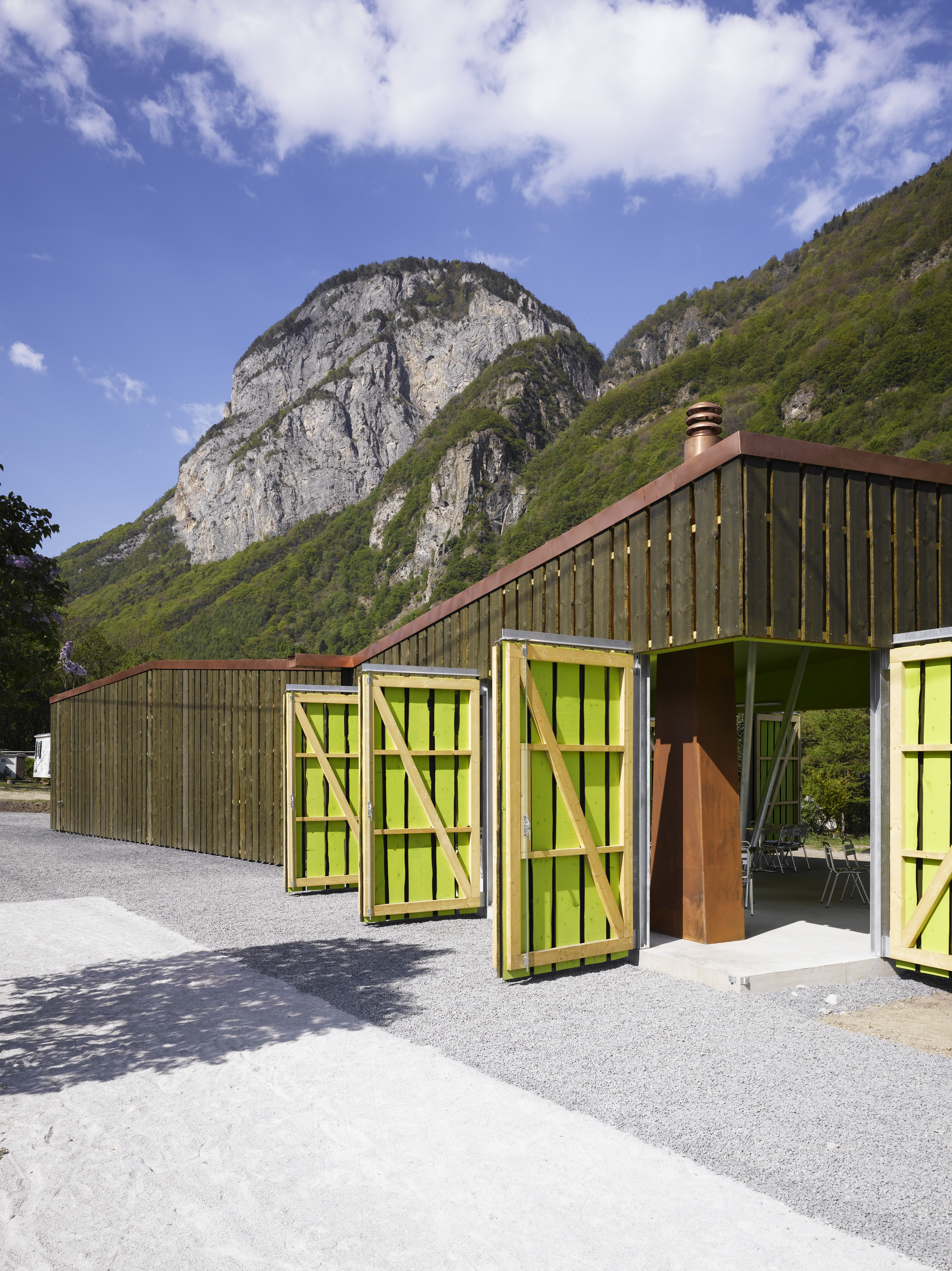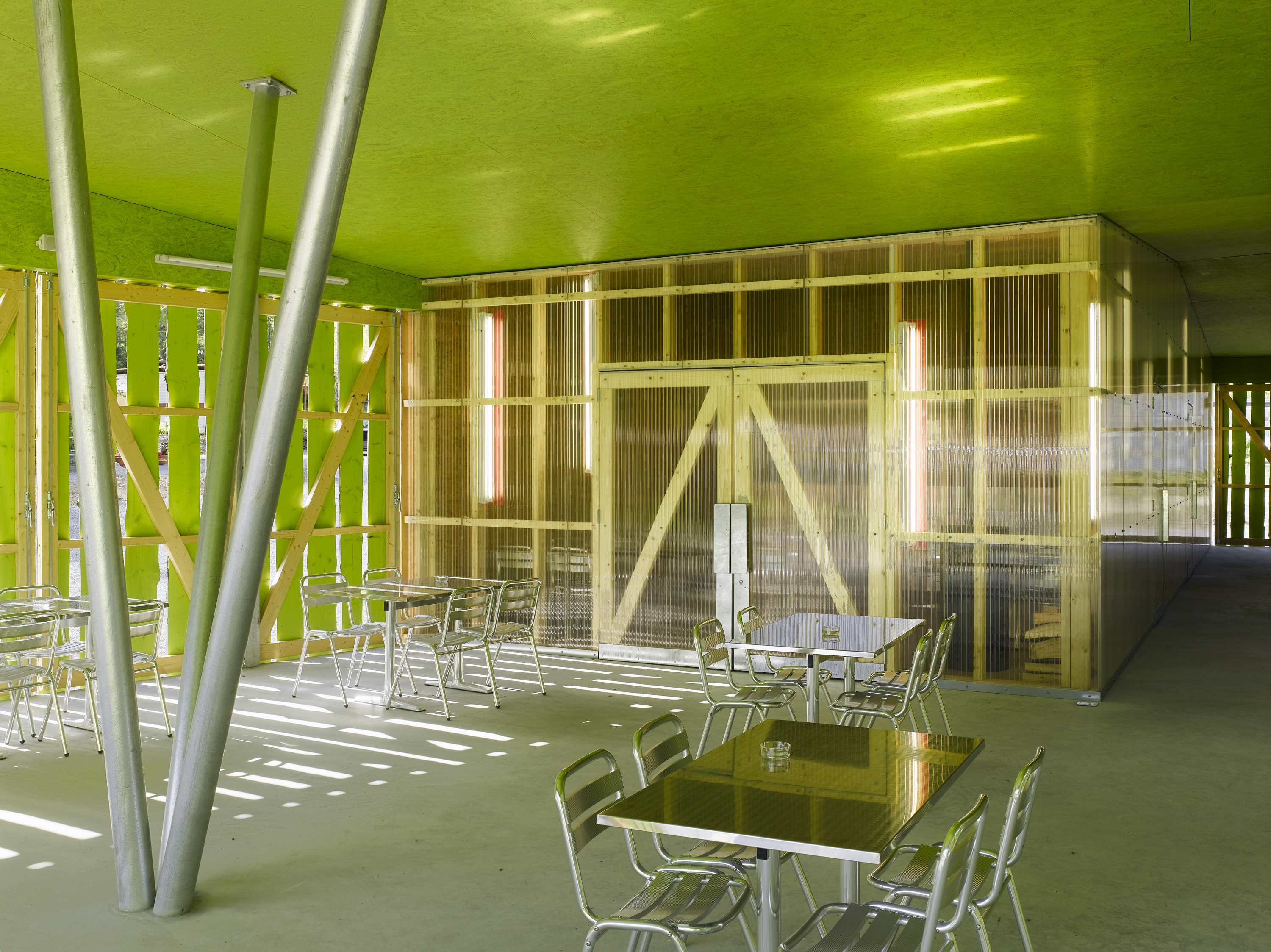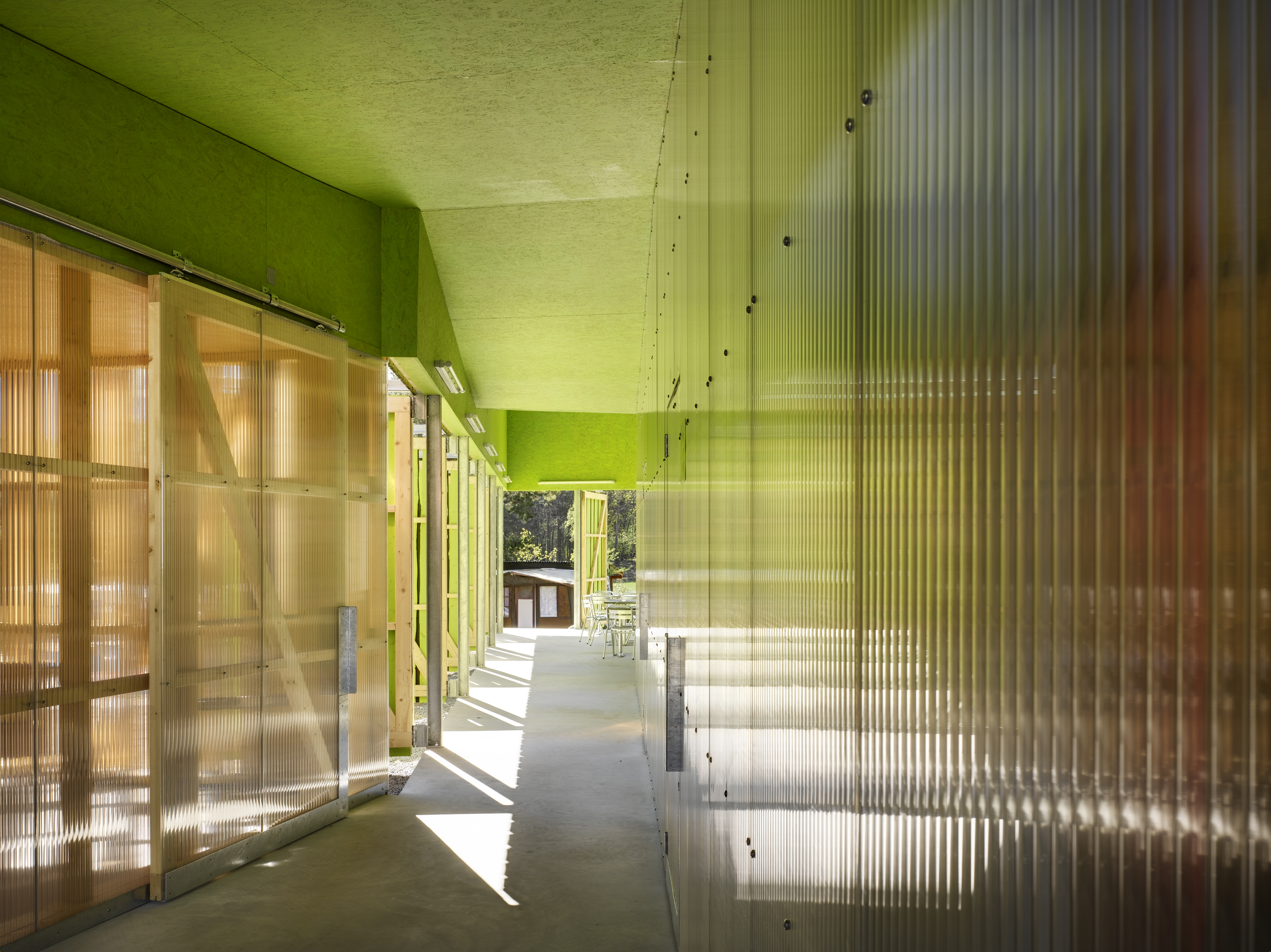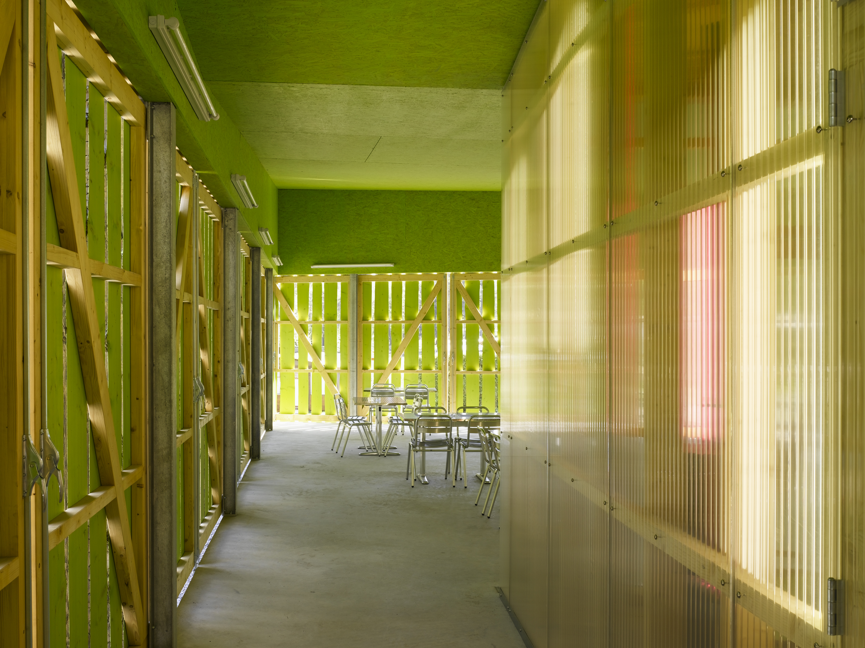 De la structure au revêtement de façade, le projet se compose essentiellement de bois. Tantôt naturel, tantôt recomposé ou coloré, le bois prend un caractère différent selon la fonction qui lui est attribuée. L’enveloppe formée de planches sur dosses ajourées est un filtre lumineux entre intérieur et extérieur. De grands panneaux pivotants permettent de moduler la frontière entre espaces couverts et ouverts. De par leur transparence, les façades intérieures en polycarbonate lient l'espace construit au monde extérieur tout en lui apposant une sorte de filtre.