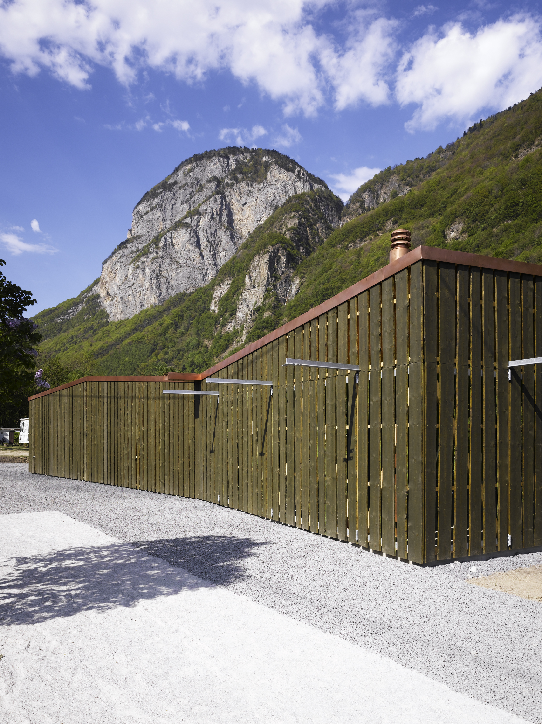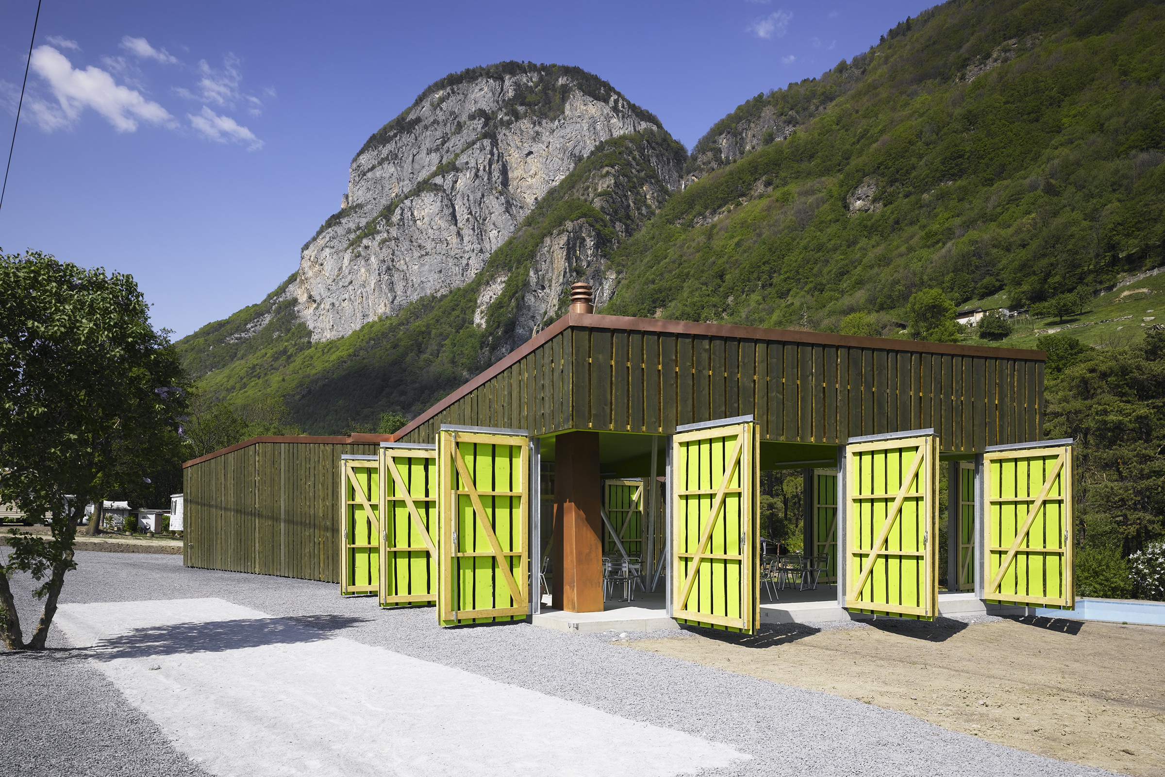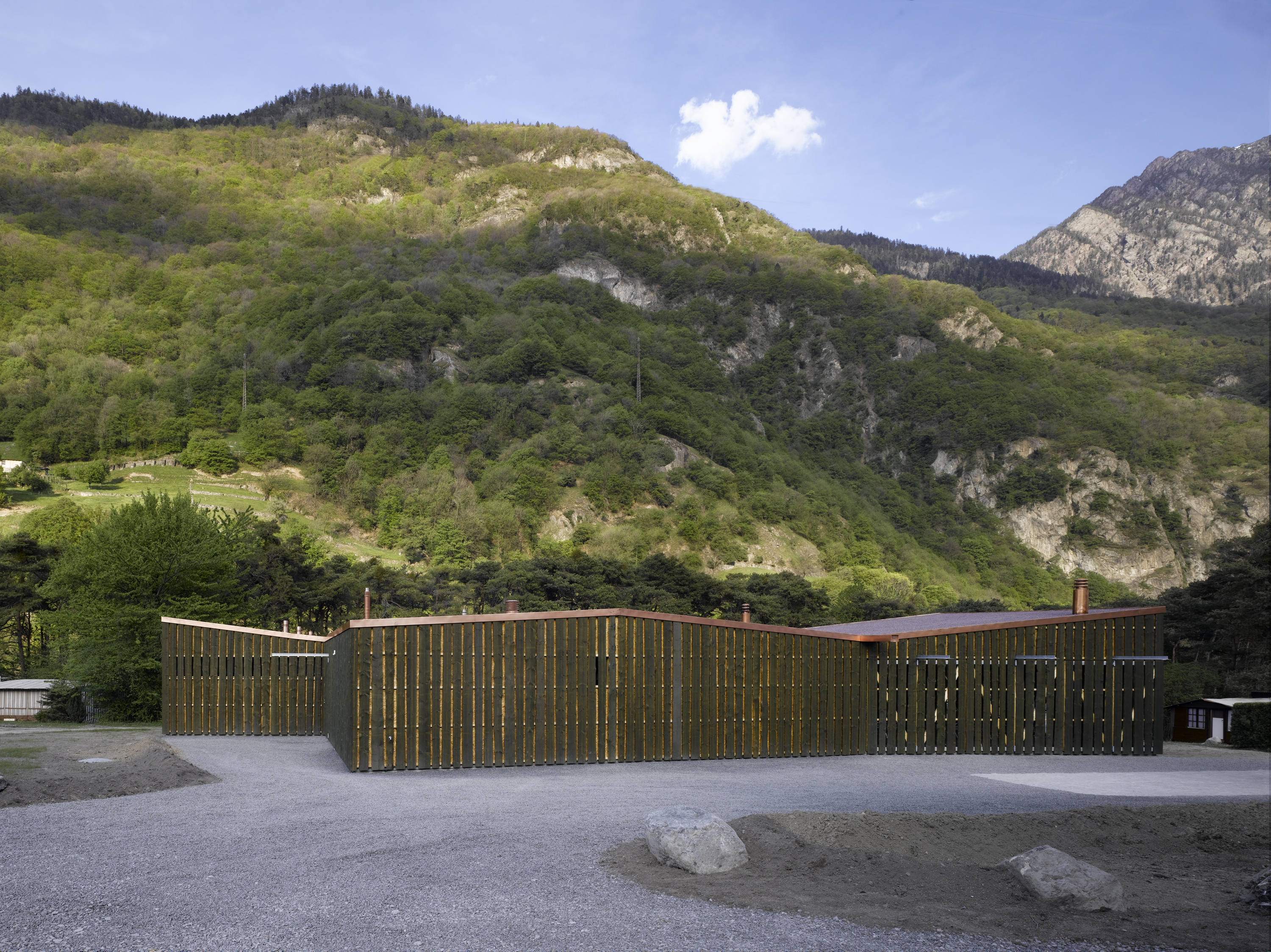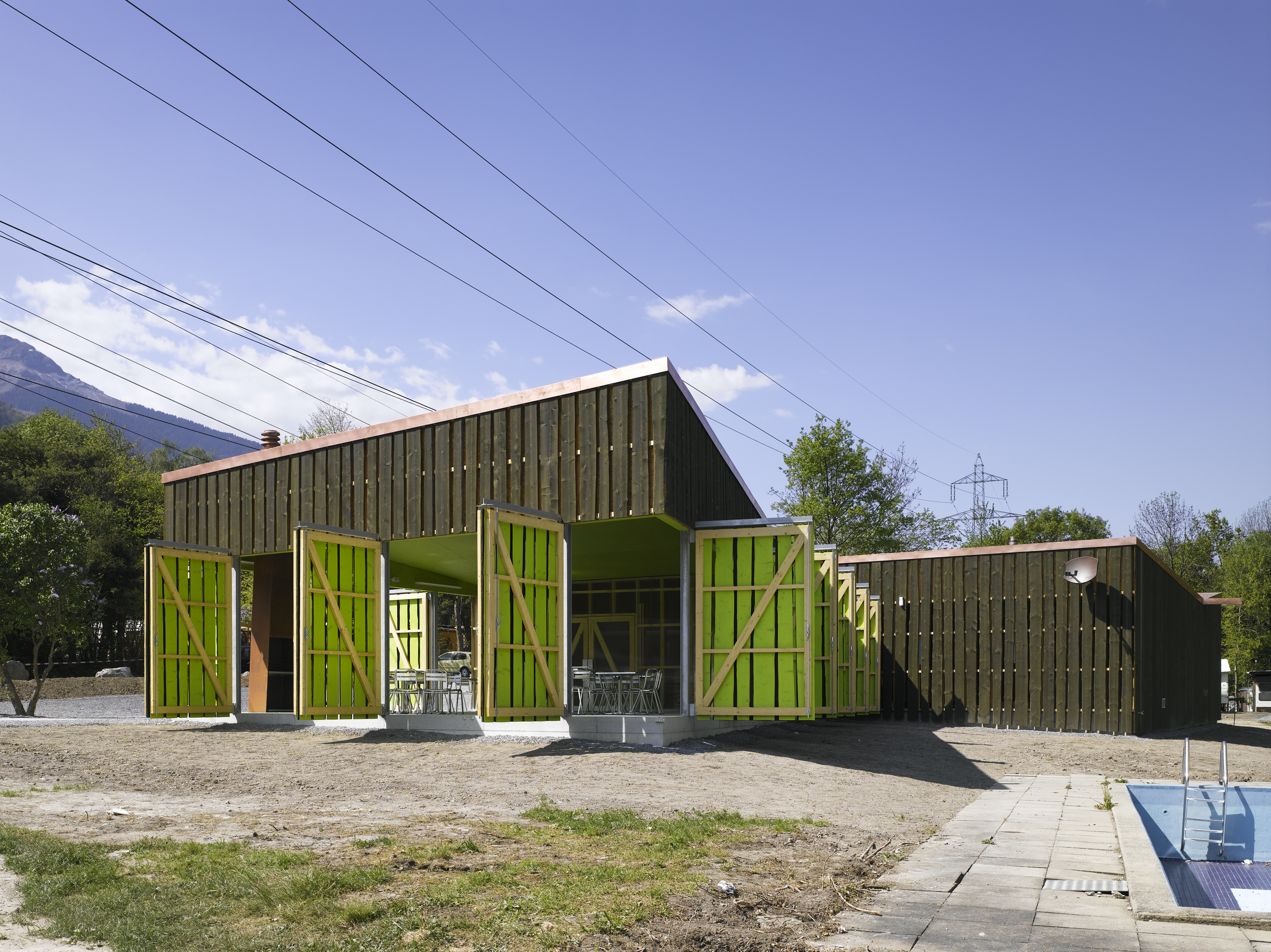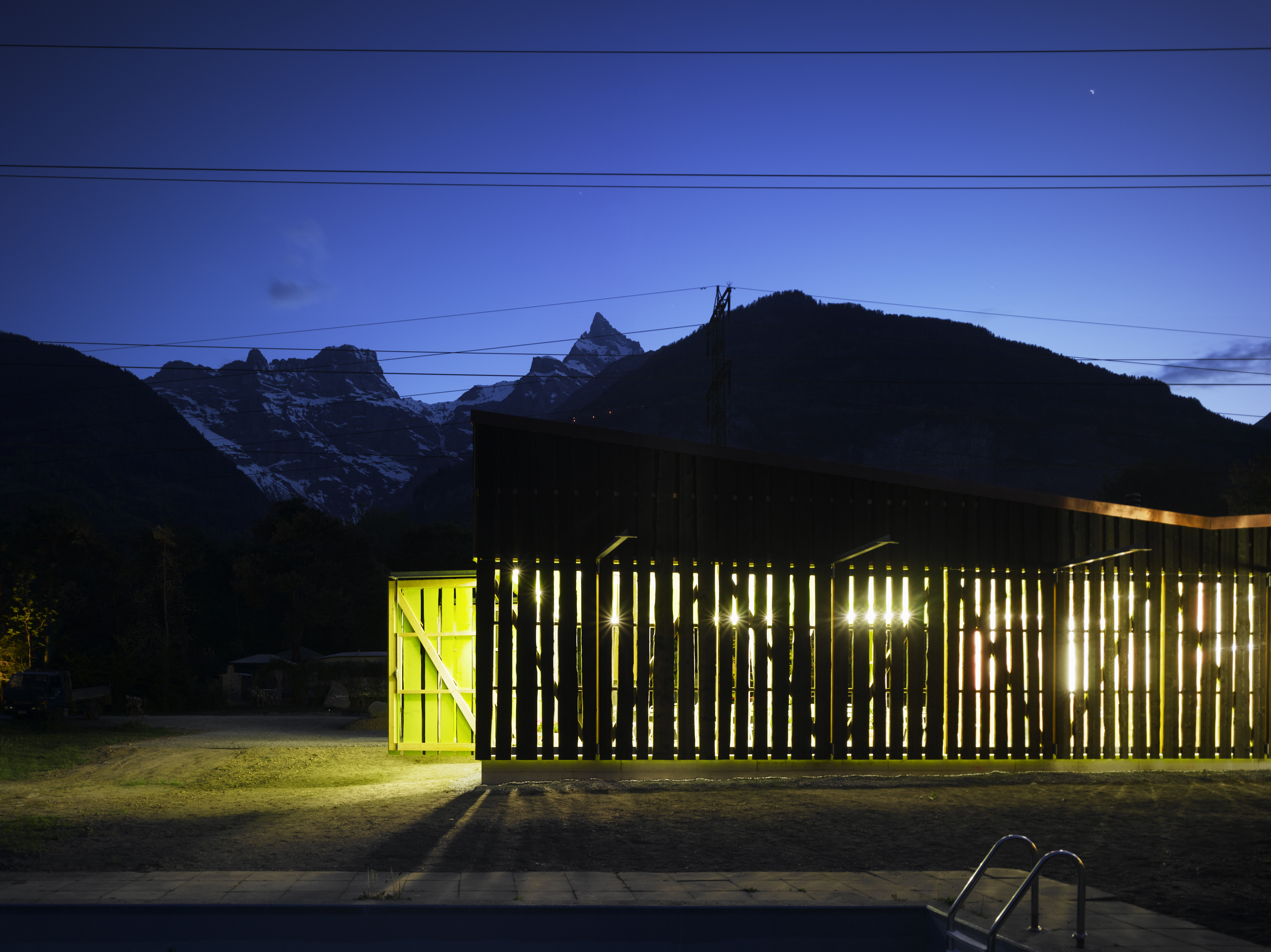 De la structure au revêtement de façade, le projet se compose essentiellement de bois. Tantôt naturel, tantôt recomposé ou coloré, le bois prend un caractère différent selon la fonction qui lui est attribuée. L’enveloppe formée de planches sur dosses ajourées est un filtre lumineux entre intérieur et extérieur. De grands panneaux pivotants permettent de moduler la frontière entre espaces couverts et ouverts. De par leur transparence, les façades intérieures en polycarbonate lient l'espace construit au monde extérieur tout en lui apposant une sorte de filtre.