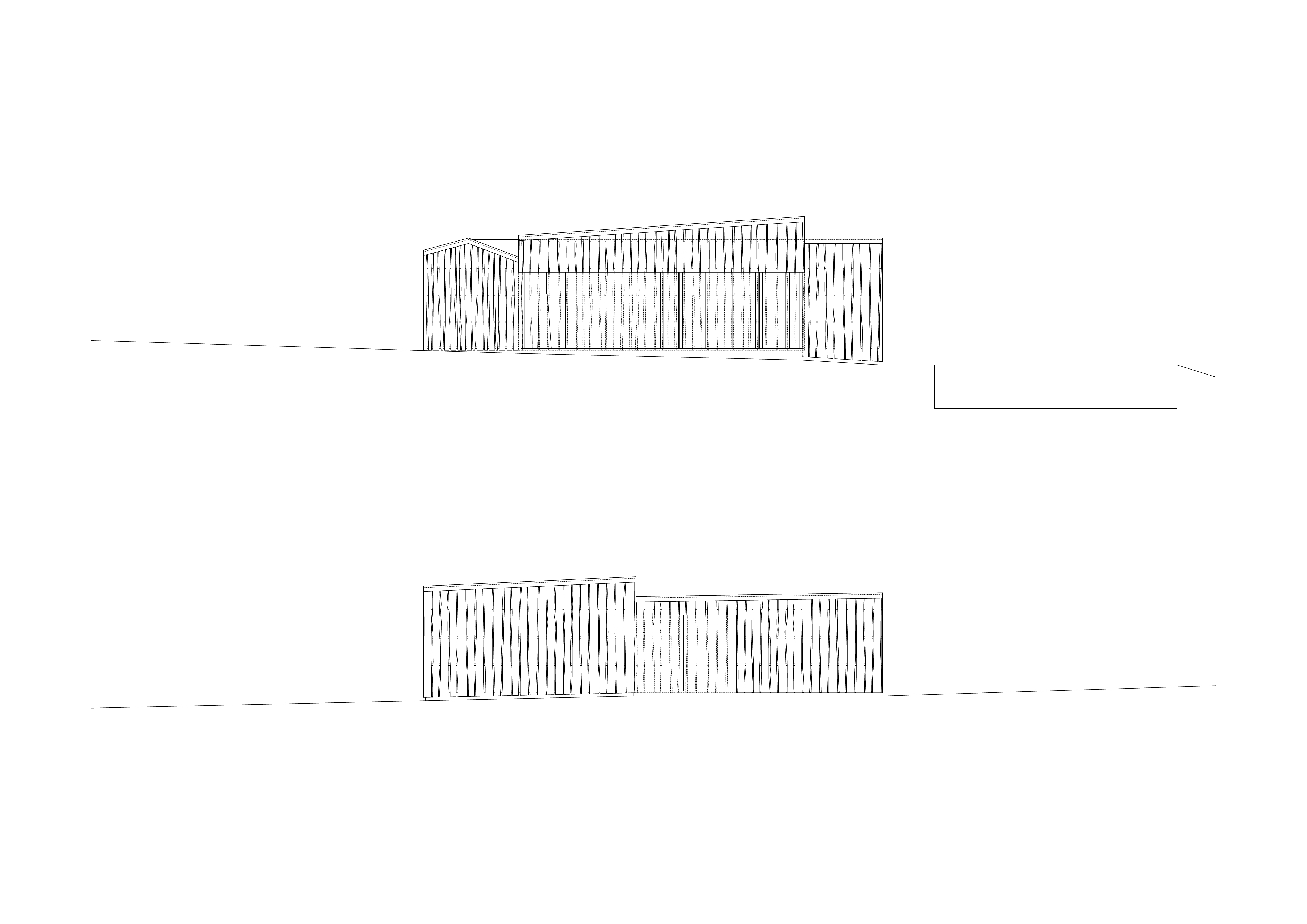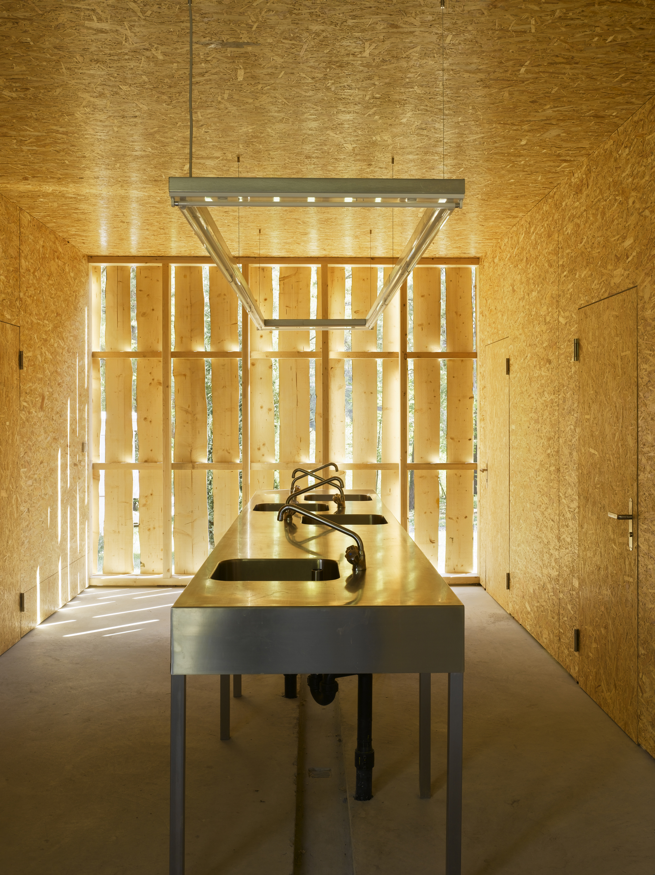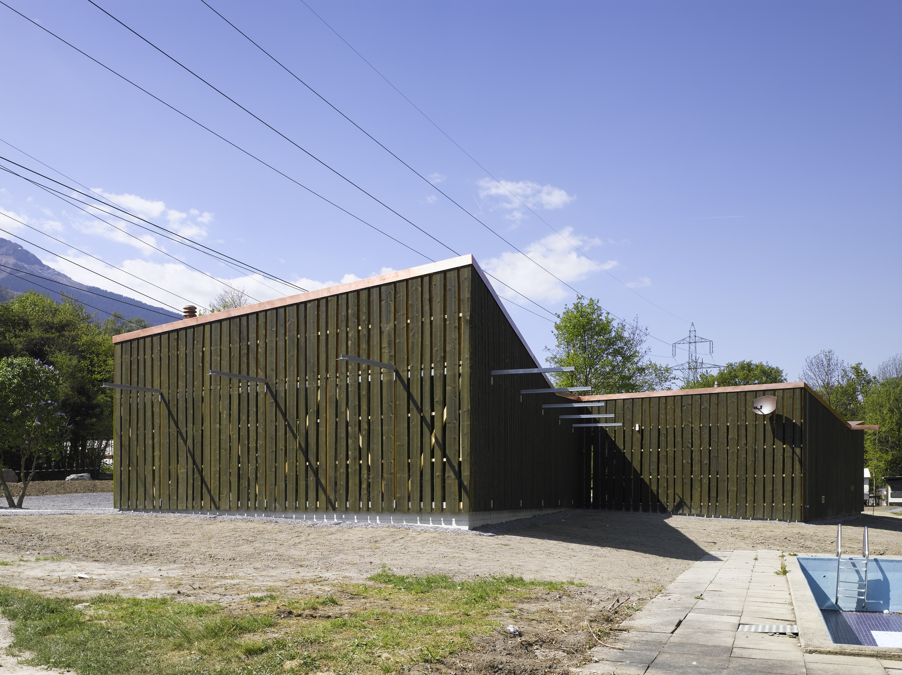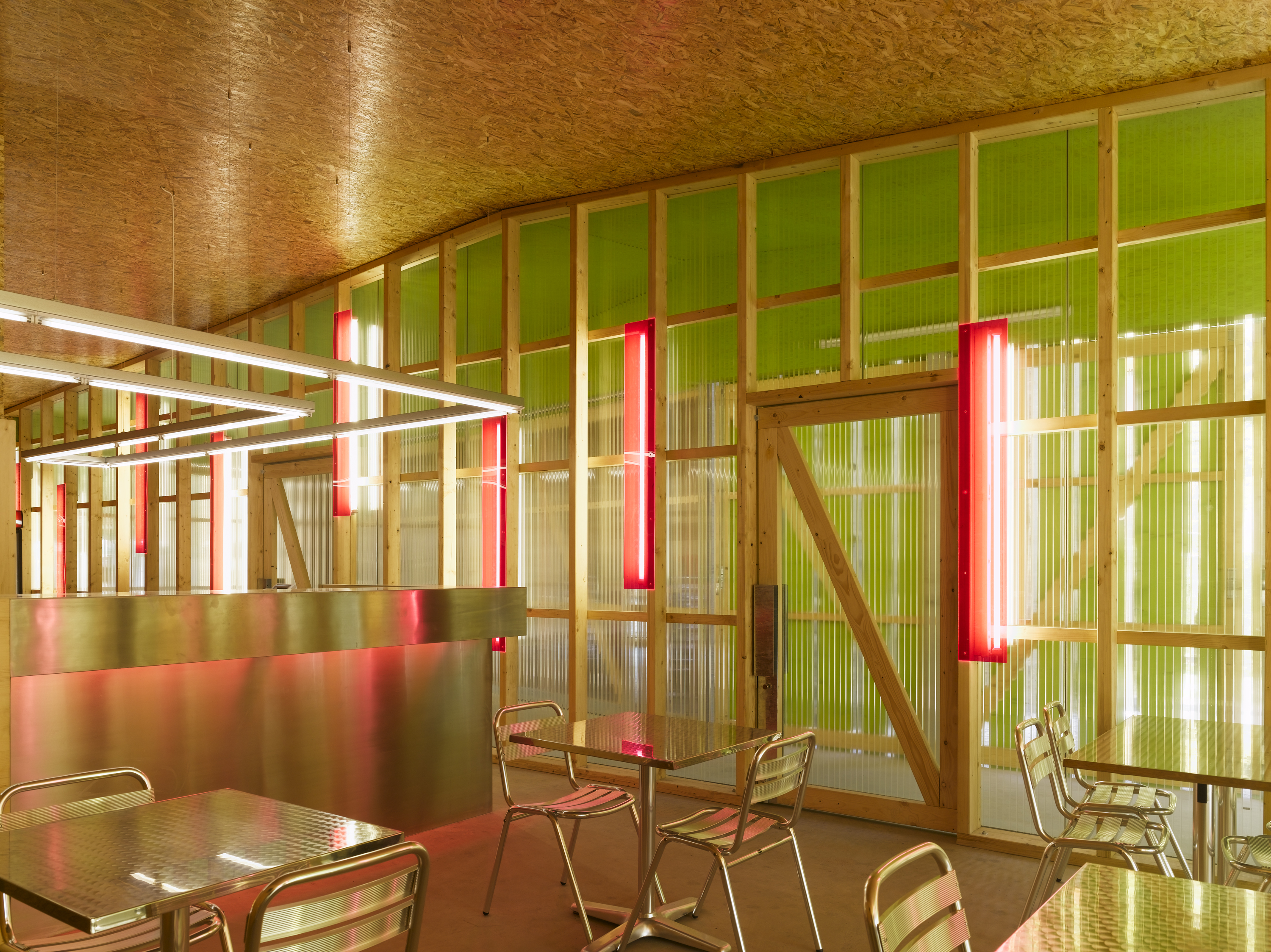 De la structure au revêtement de façade, le projet se compose essentiellement de bois. Tantôt naturel, tantôt recomposé ou coloré, le bois prend un caractère différent selon la fonction qui lui est attribuée. L’enveloppe formée de planches sur dosses ajourées est un filtre lumineux entre intérieur et extérieur. De grands panneaux pivotants permettent de moduler la frontière entre espaces couverts et ouverts. De par leur transparence, les façades intérieures en polycarbonate lient l'espace construit au monde extérieur tout en lui apposant une sorte de filtre.