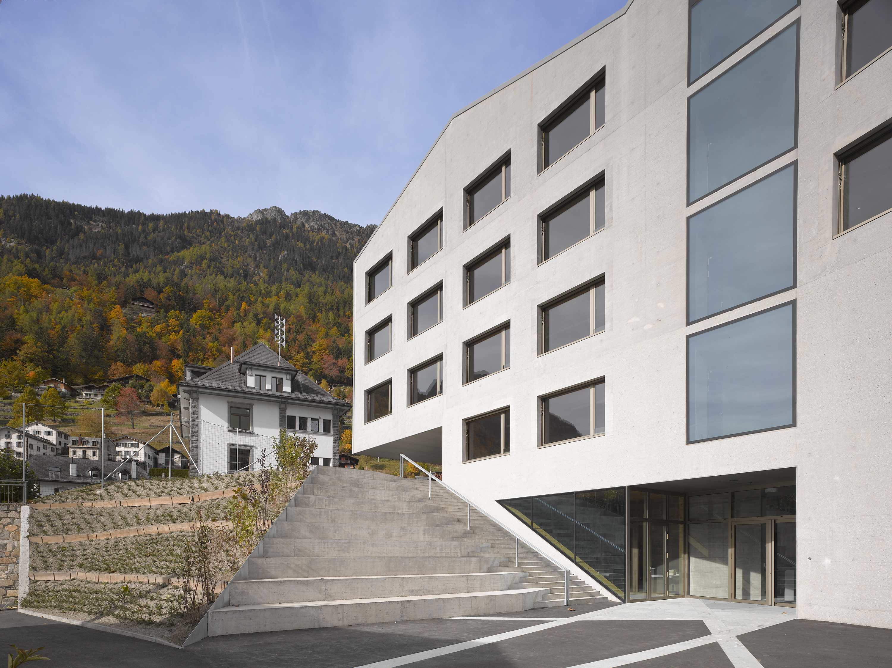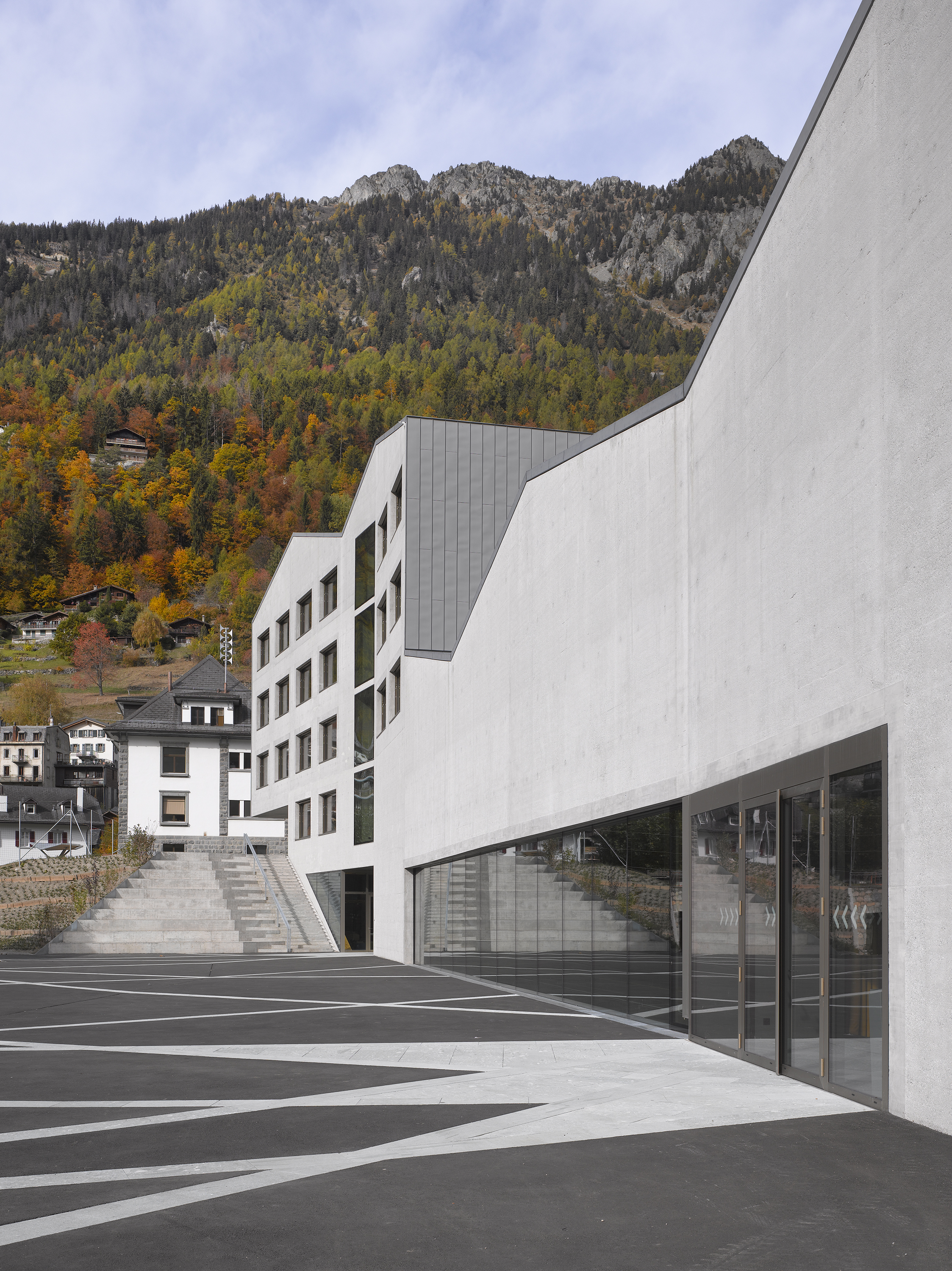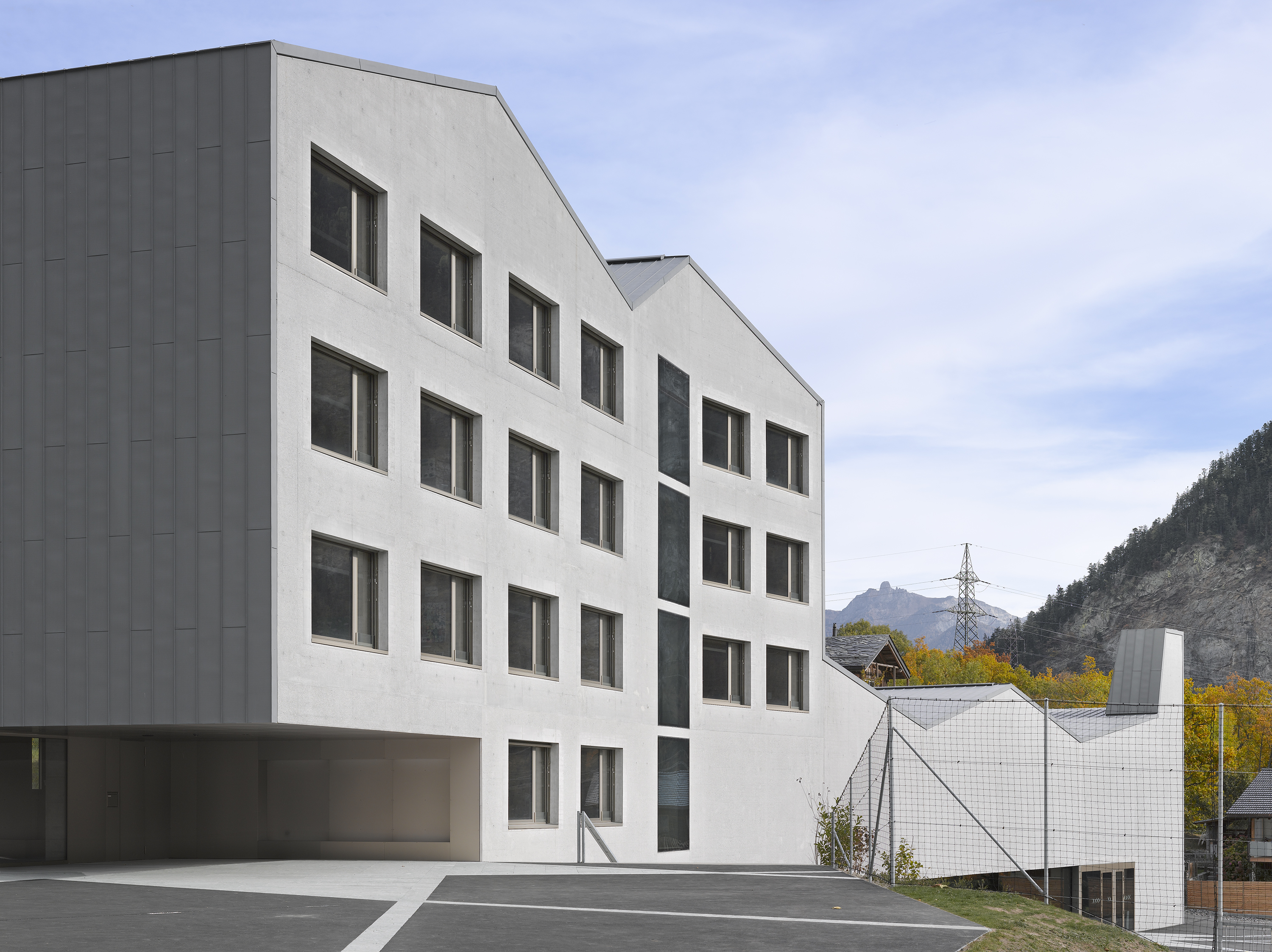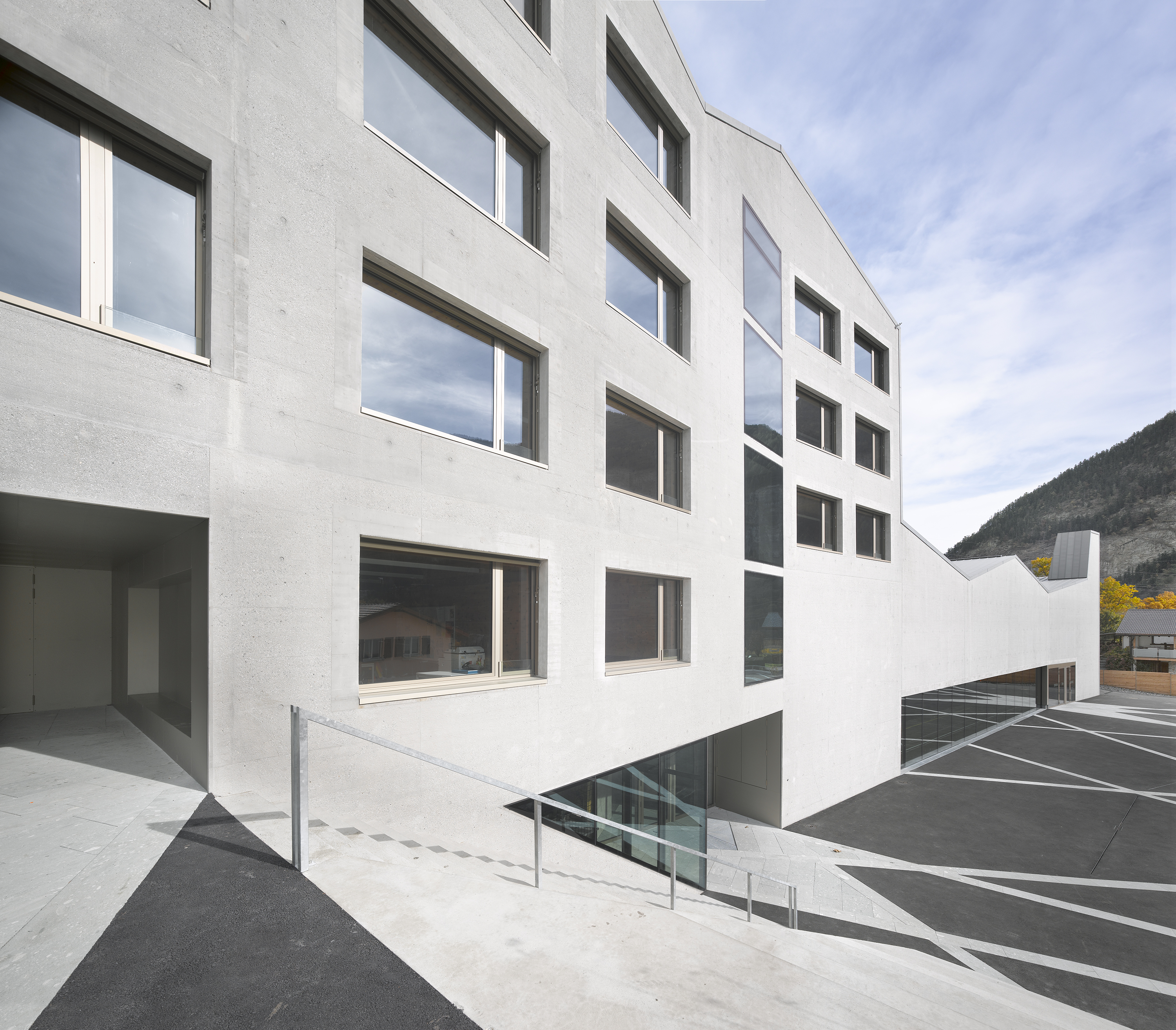 Afin de renforcer l’accrochage à l’identité du lieu, la pierre issue de la carrière de Salvan, de teinte vert émeraude, est intégrée à la composition du béton sablé des façades, le sablage révélant la couleur de l’agrégat. La pierre de Salvan revêt le sol des distributions. Associée aux revêtements des parois et plafonds en panneaux d’arolle, elle confère au bâtiment un caractère d’école de montagne.