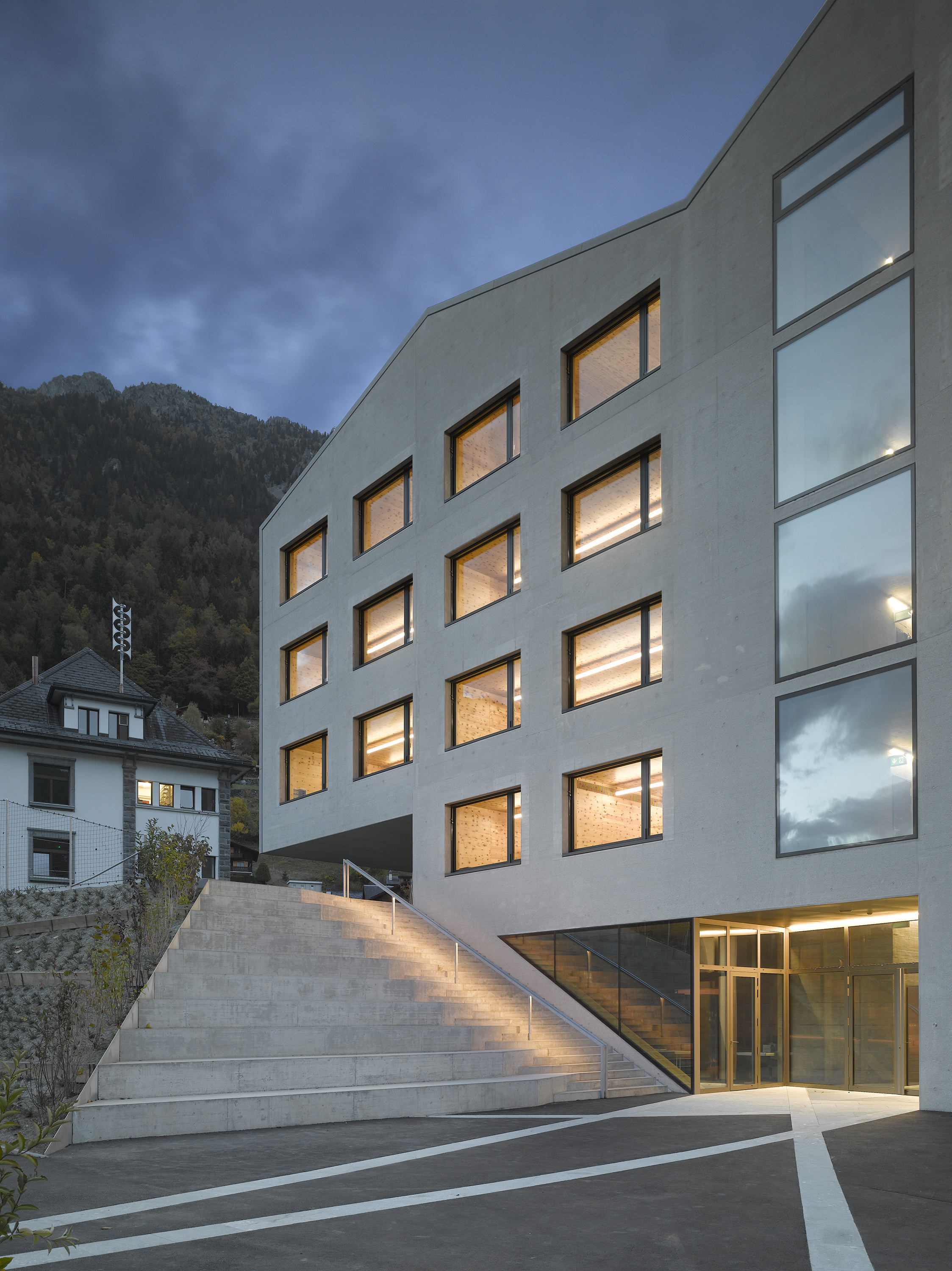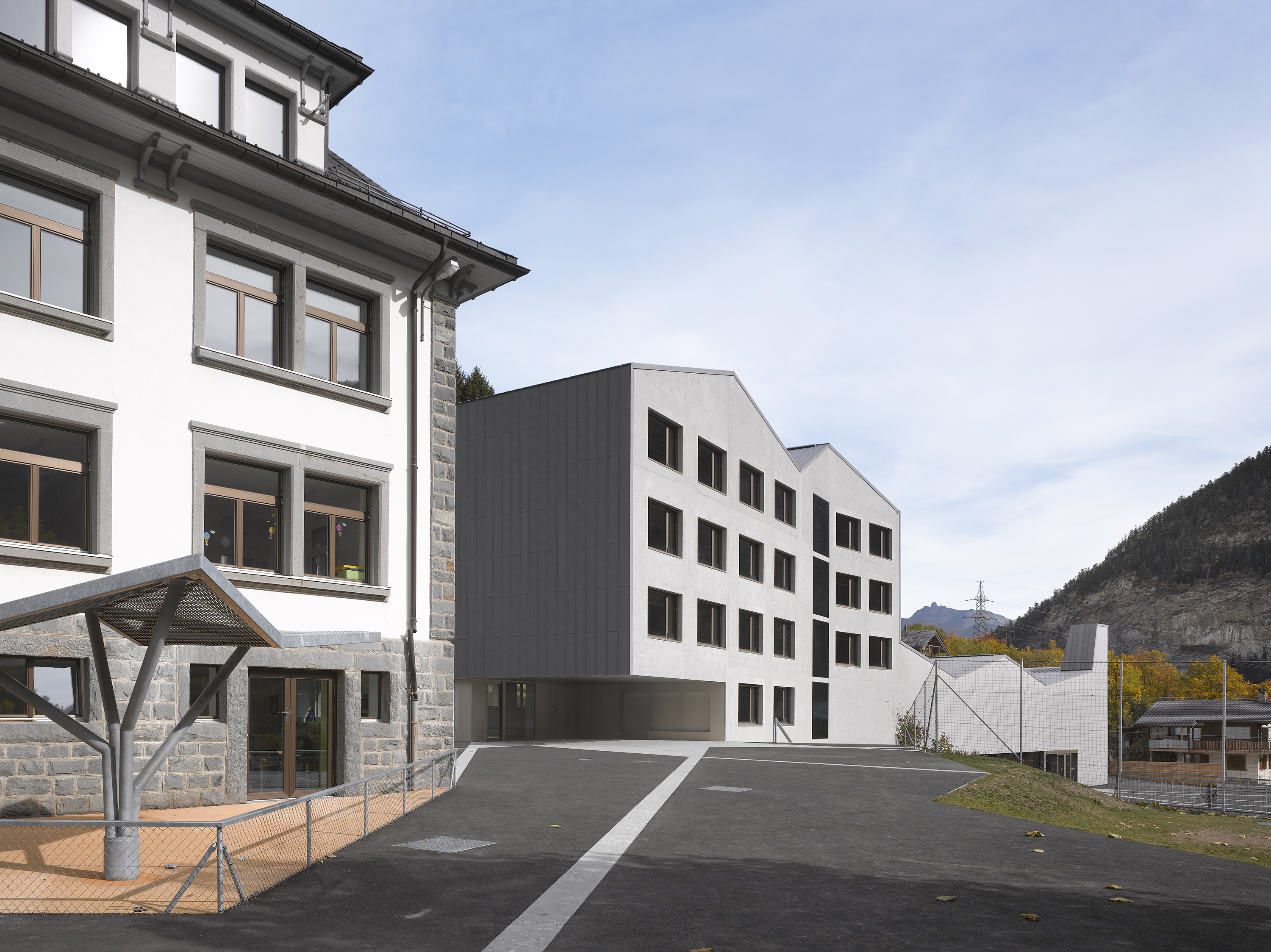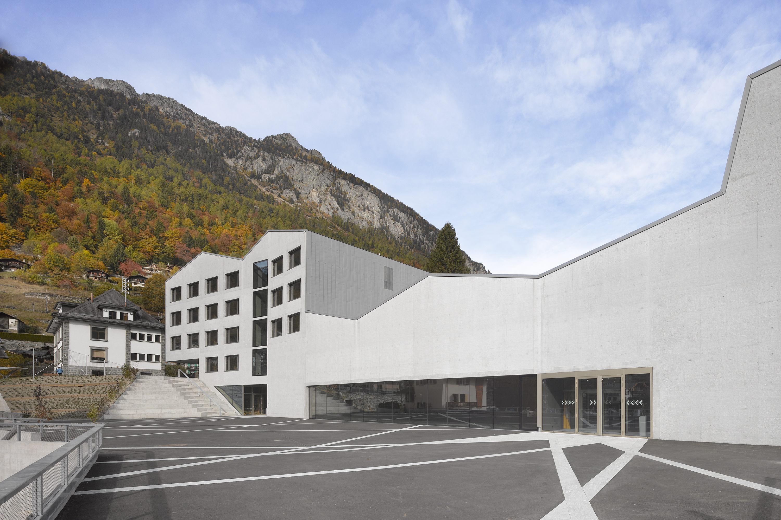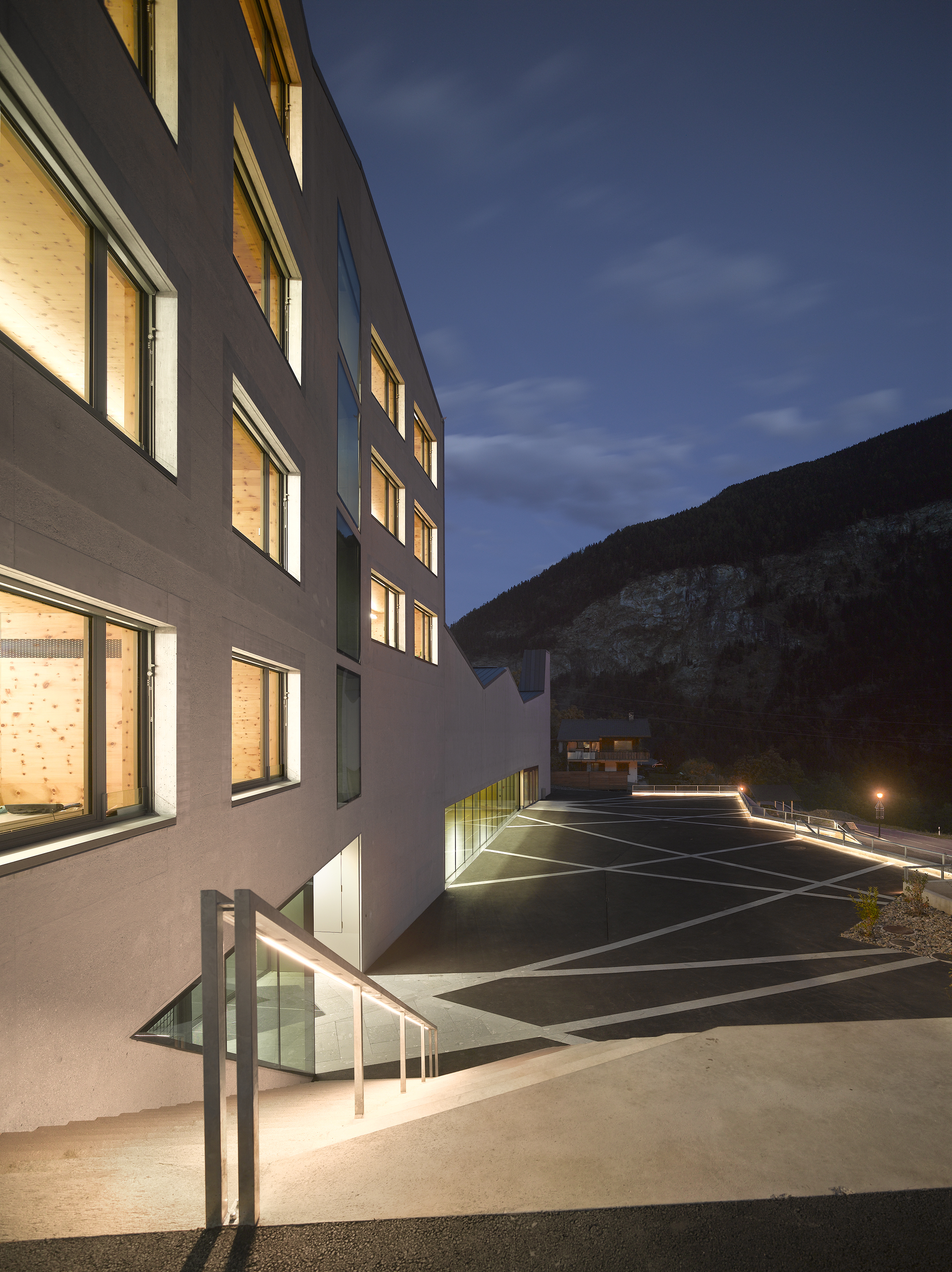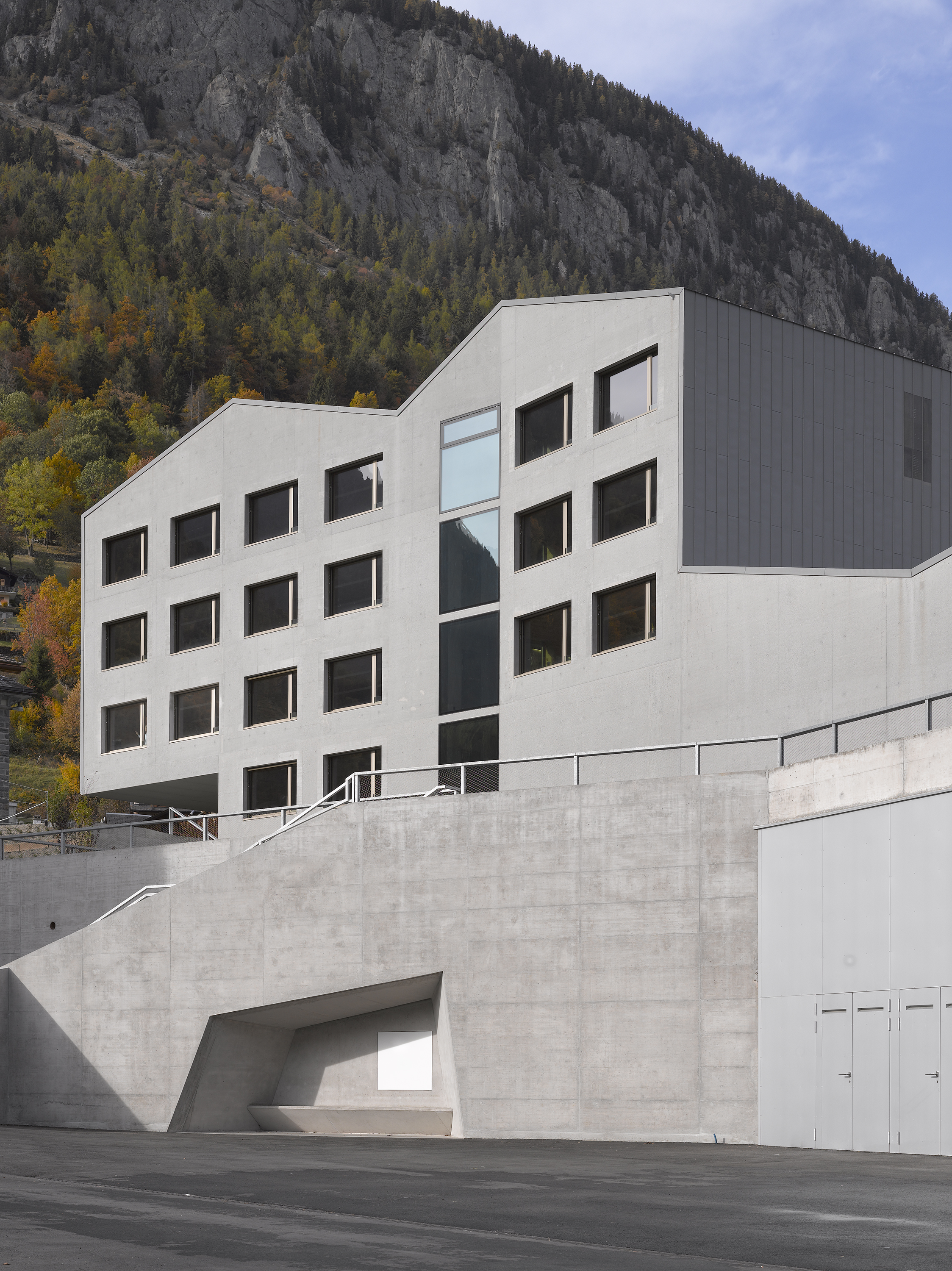 Afin de renforcer l’accrochage à l’identité du lieu, la pierre issue de la carrière de Salvan, de teinte vert émeraude, est intégrée à la composition du béton sablé des façades, le sablage révélant la couleur de l’agrégat. La pierre de Salvan revêt le sol des distributions. Associée aux revêtements des parois et plafonds en panneaux d’arolle, elle confère au bâtiment un caractère d’école de montagne.