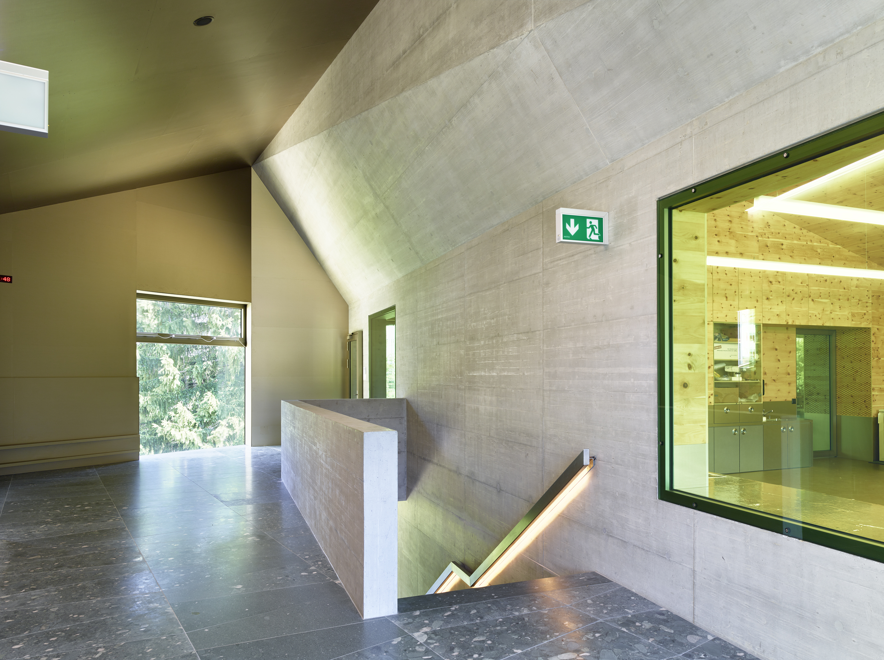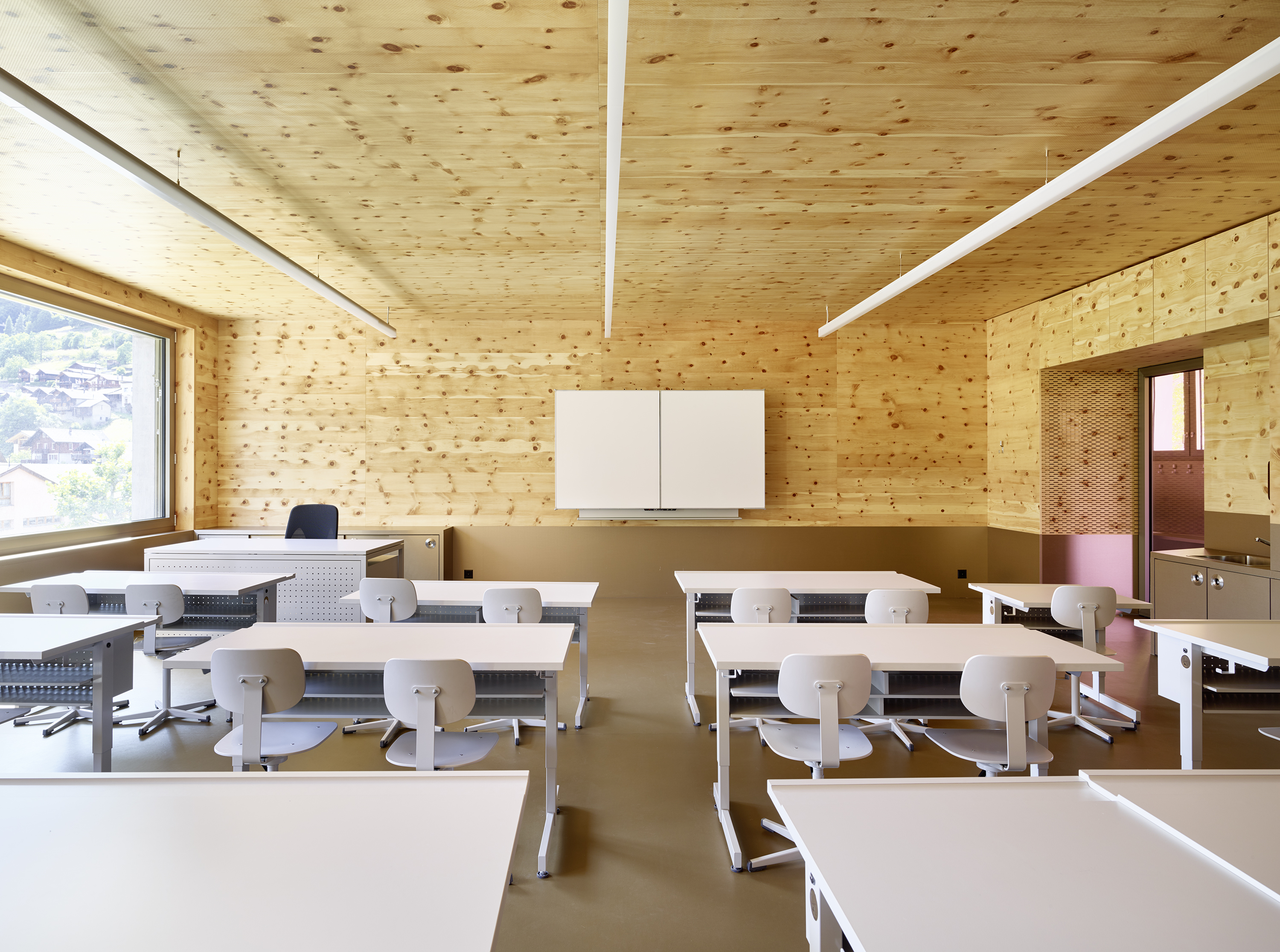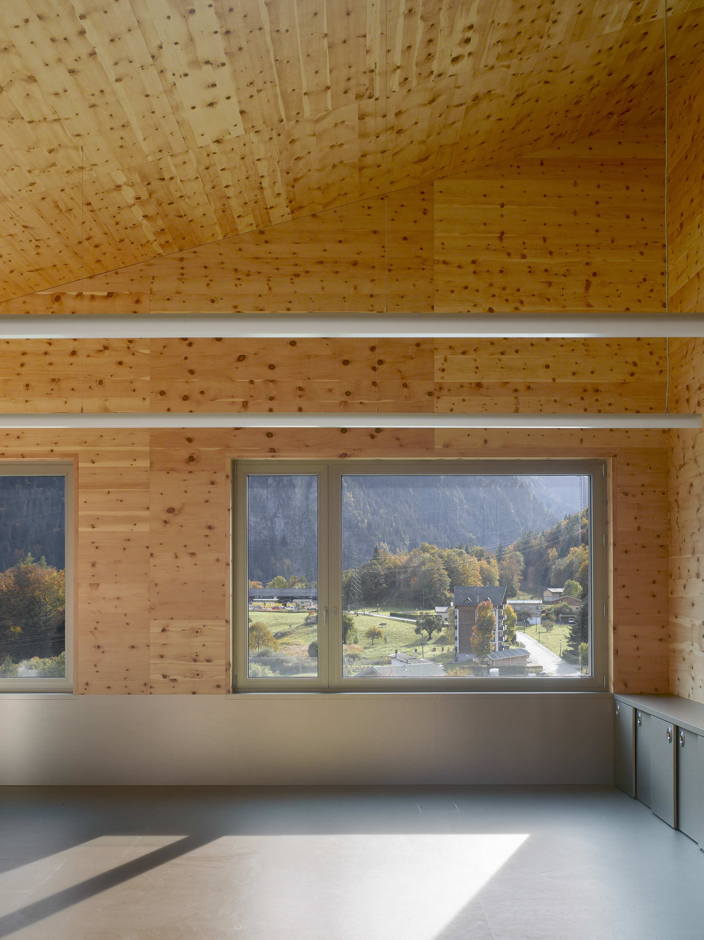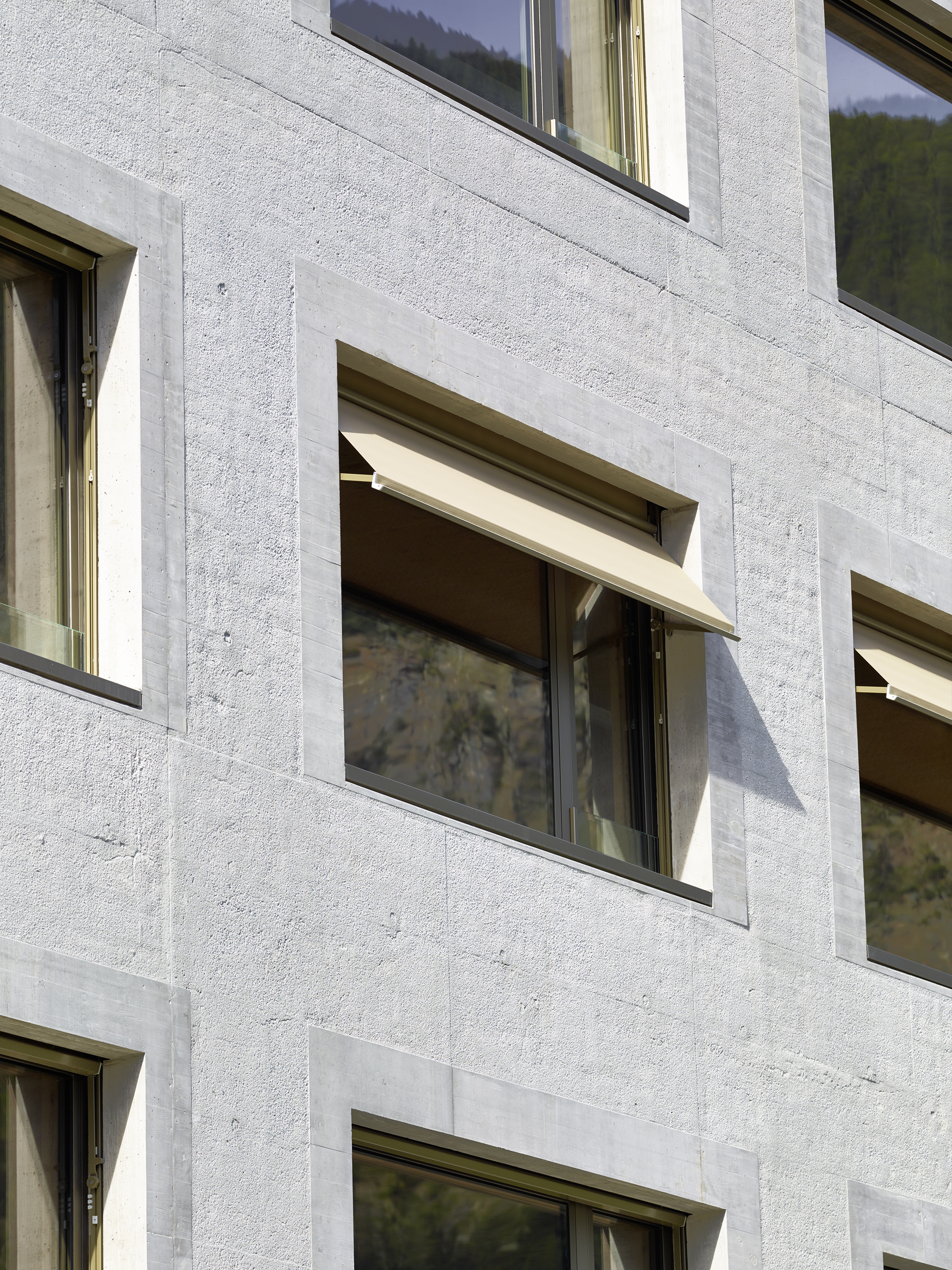 Afin de renforcer l’accrochage à l’identité du lieu, la pierre issue de la carrière de Salvan, de teinte vert émeraude, est intégrée à la composition du béton sablé des façades, le sablage révélant la couleur de l’agrégat. La pierre de Salvan revêt le sol des distributions. Associée aux revêtements des parois et plafonds en panneaux d’arolle, elle confère au bâtiment un caractère d’école de montagne.
