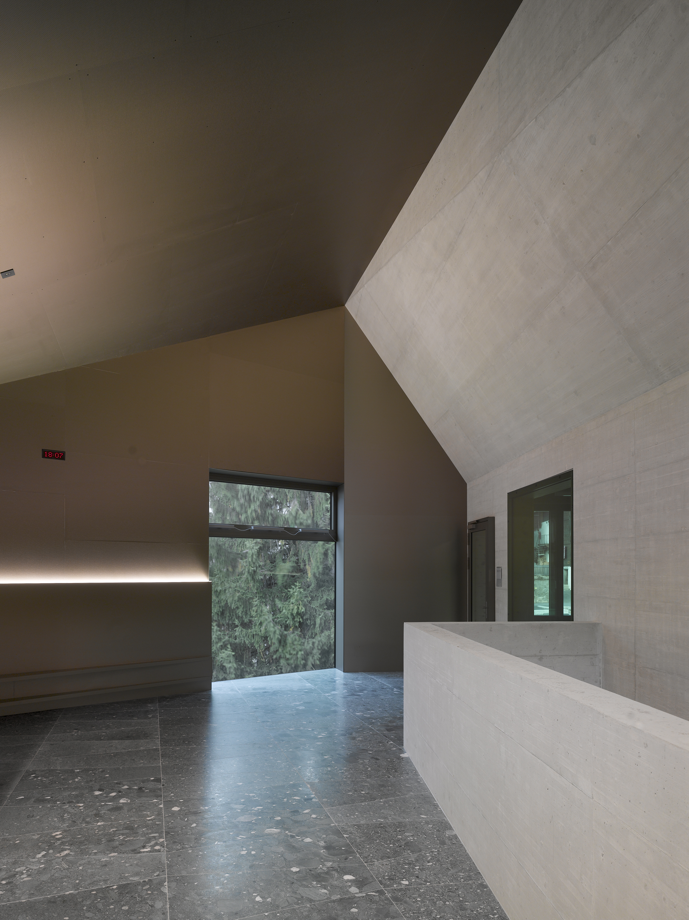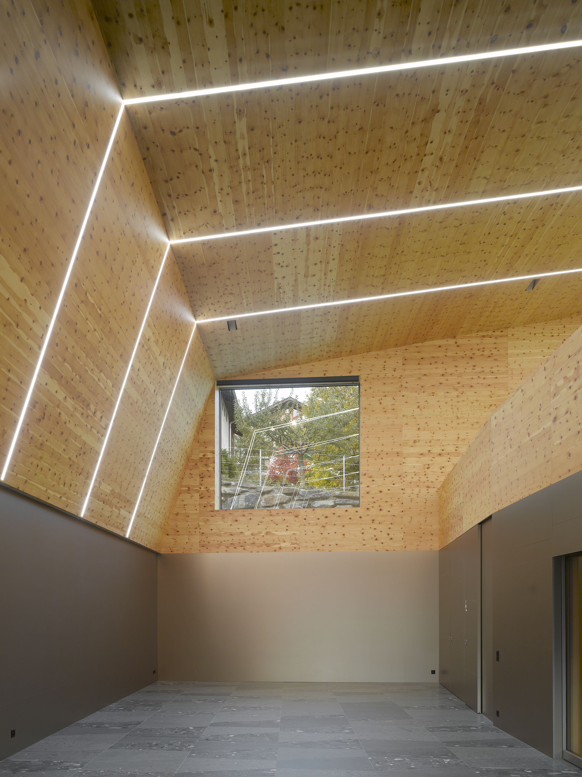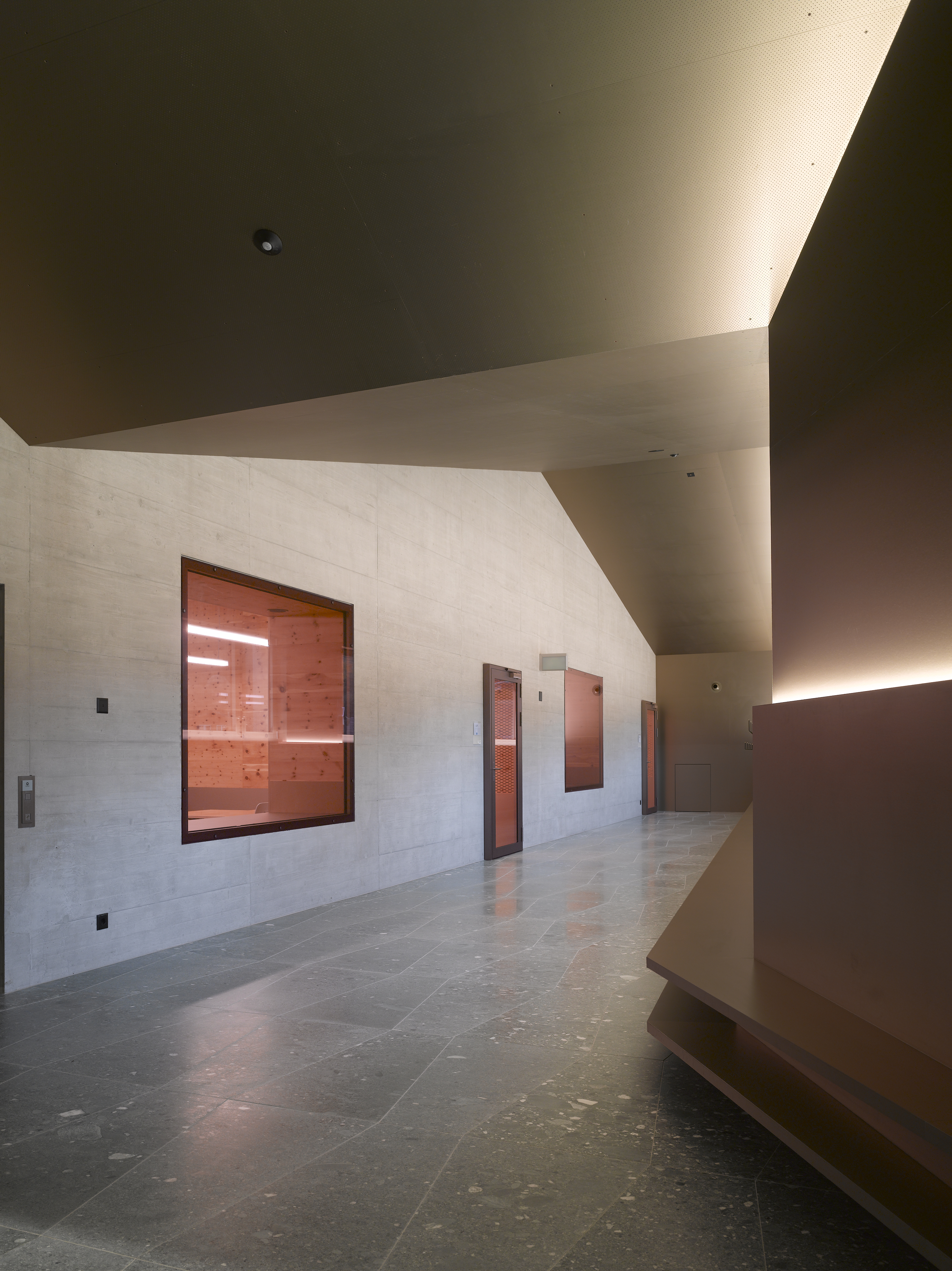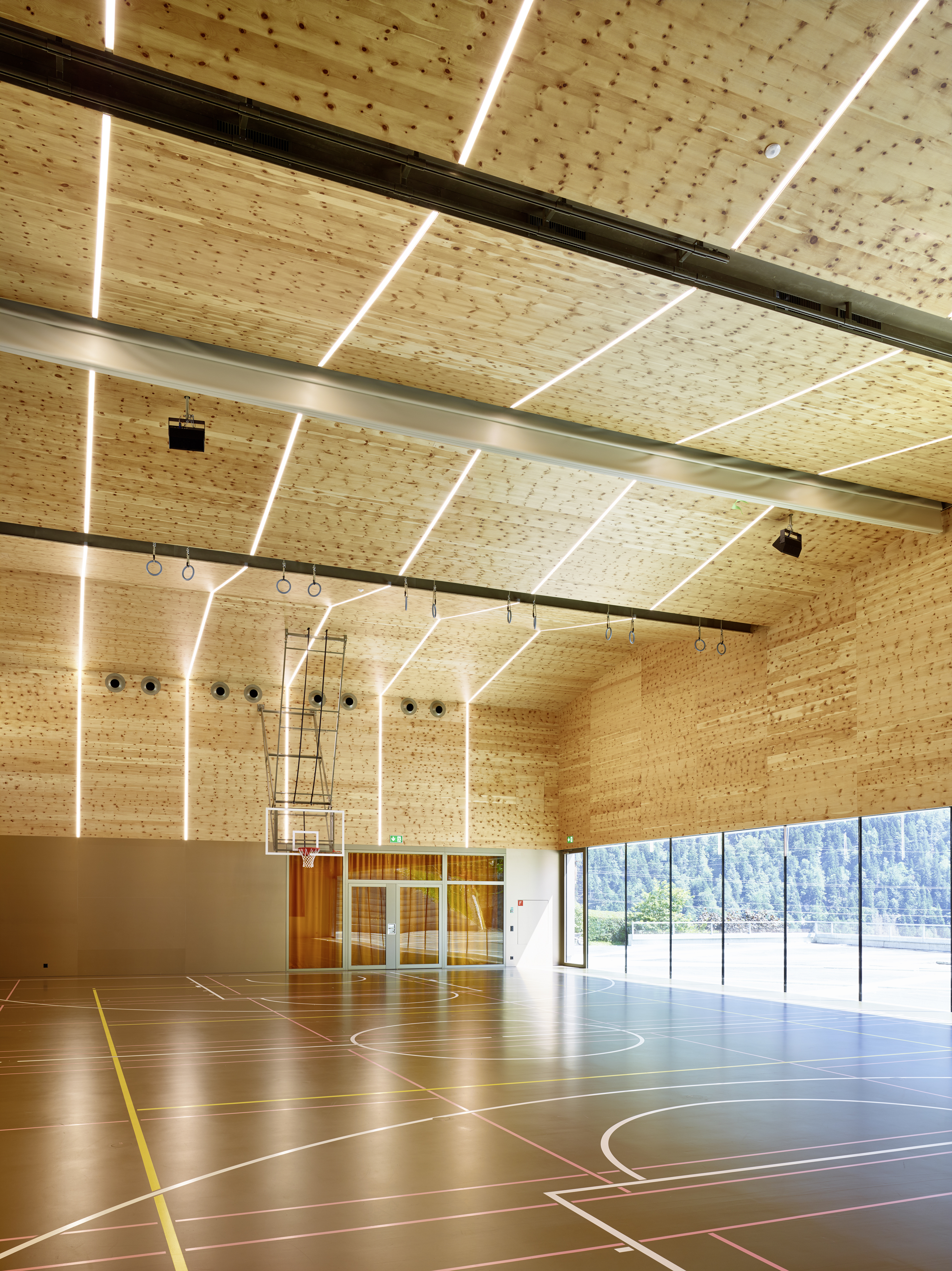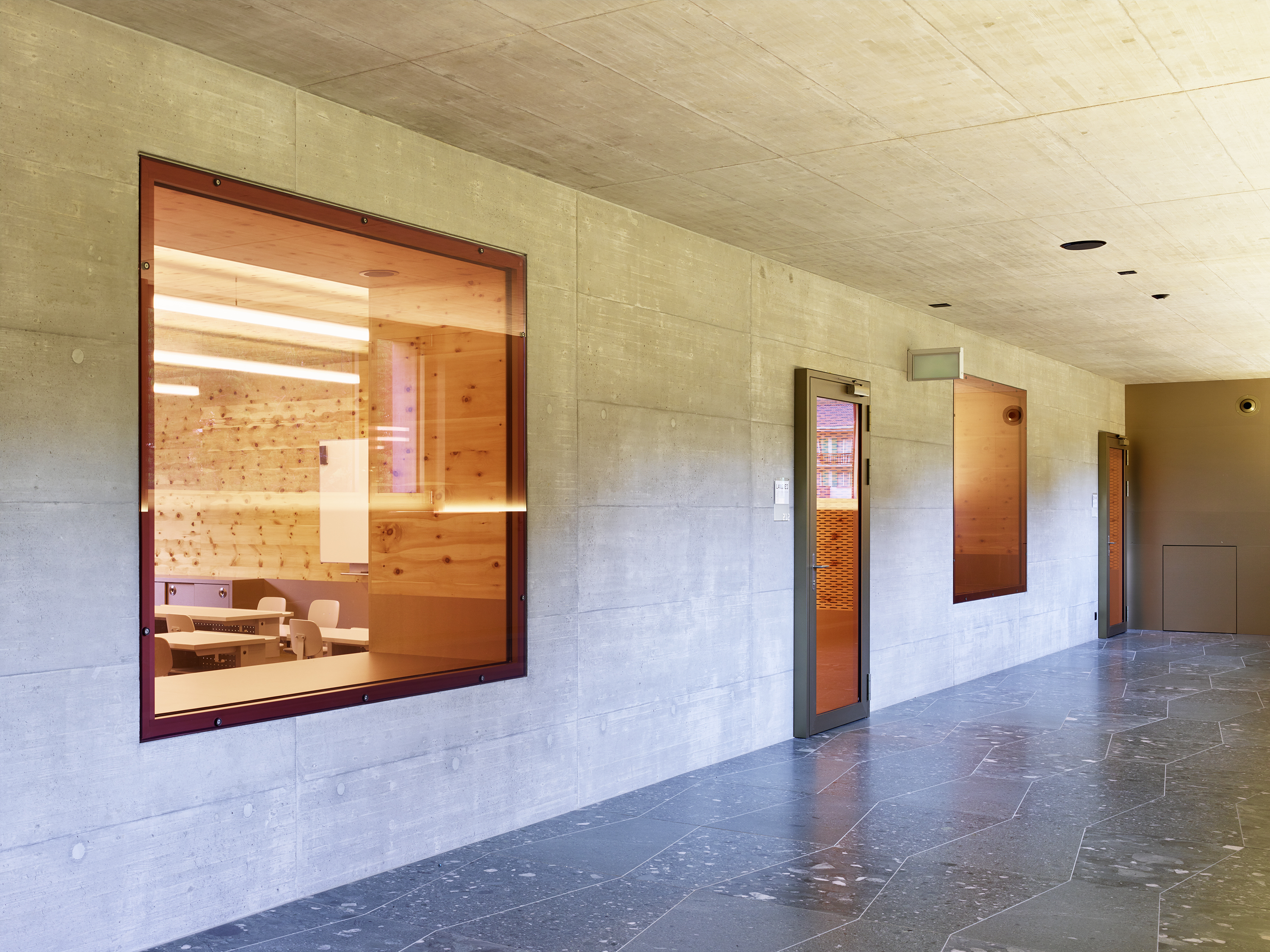 Afin de renforcer l’accrochage à l’identité du lieu, la pierre issue de la carrière de Salvan, de teinte vert émeraude, est intégrée à la composition du béton sablé des façades, le sablage révélant la couleur de l’agrégat. La pierre de Salvan revêt le sol des distributions. Associée aux revêtements des parois et plafonds en panneaux d’arolle, elle confère au bâtiment un caractère d’école de montagne.