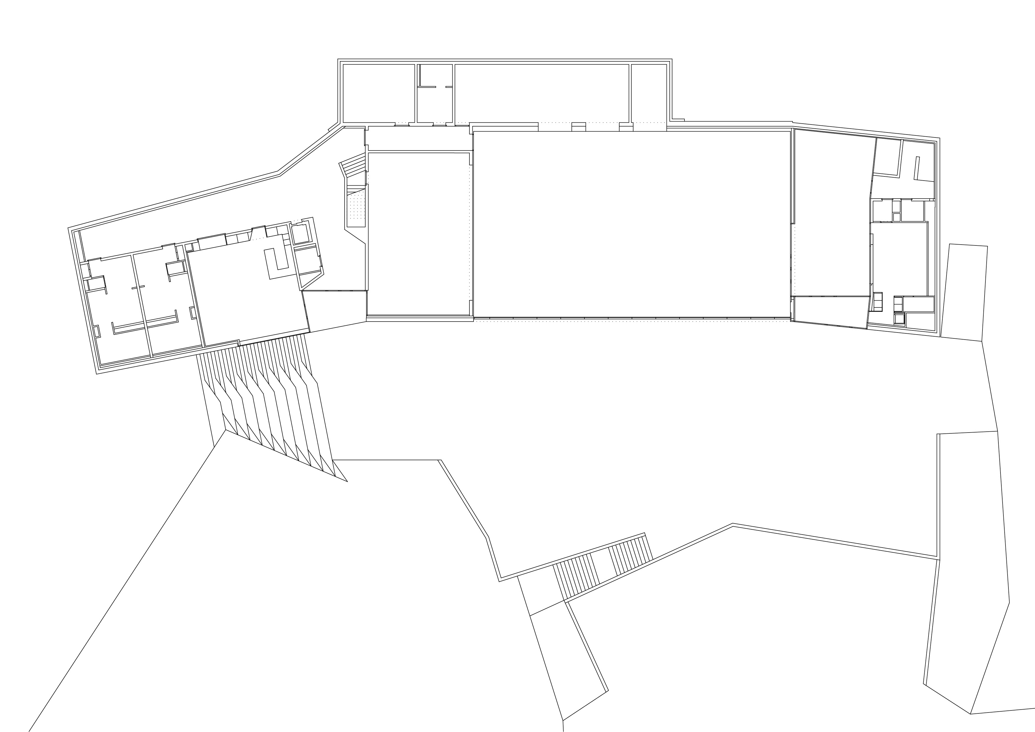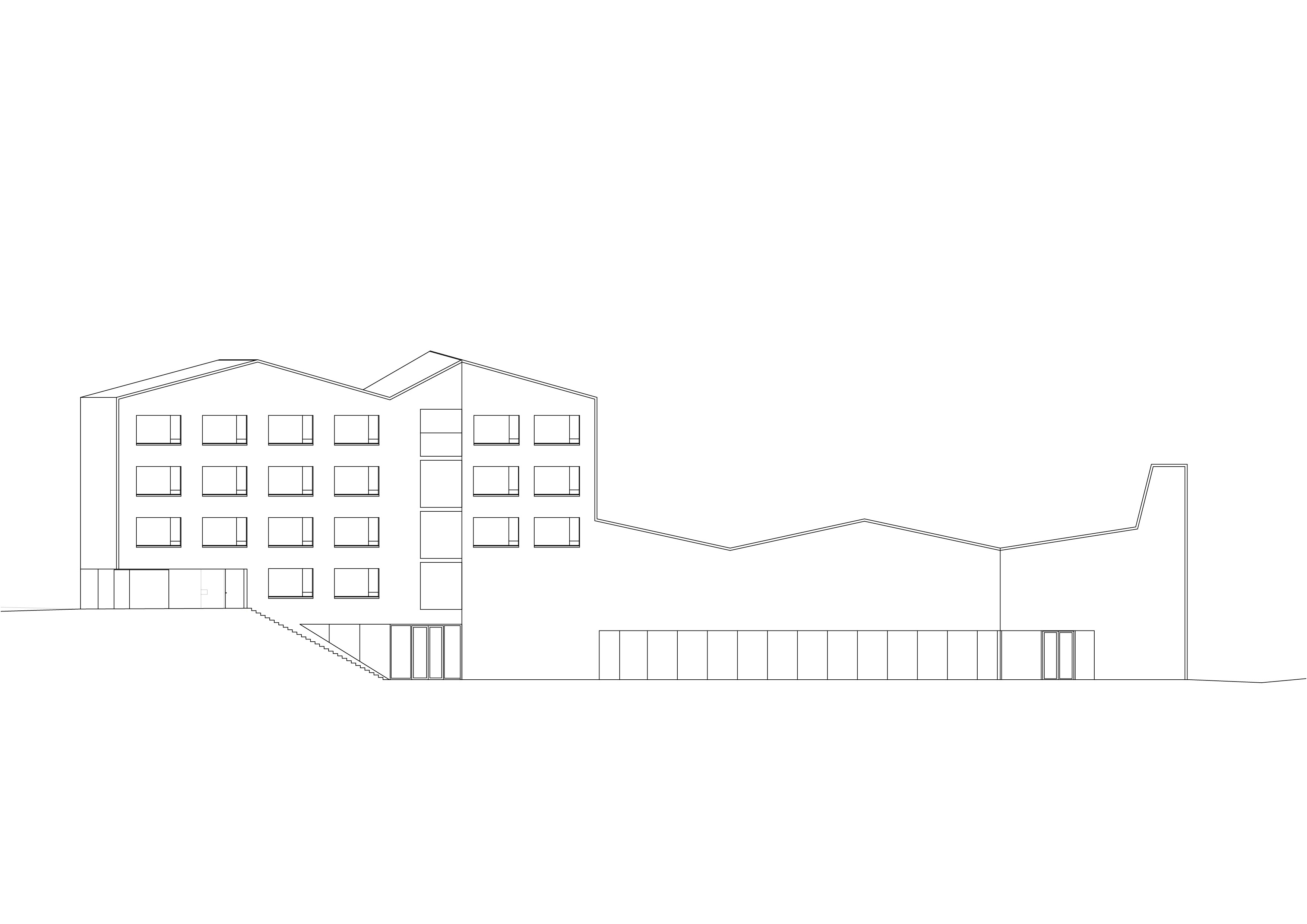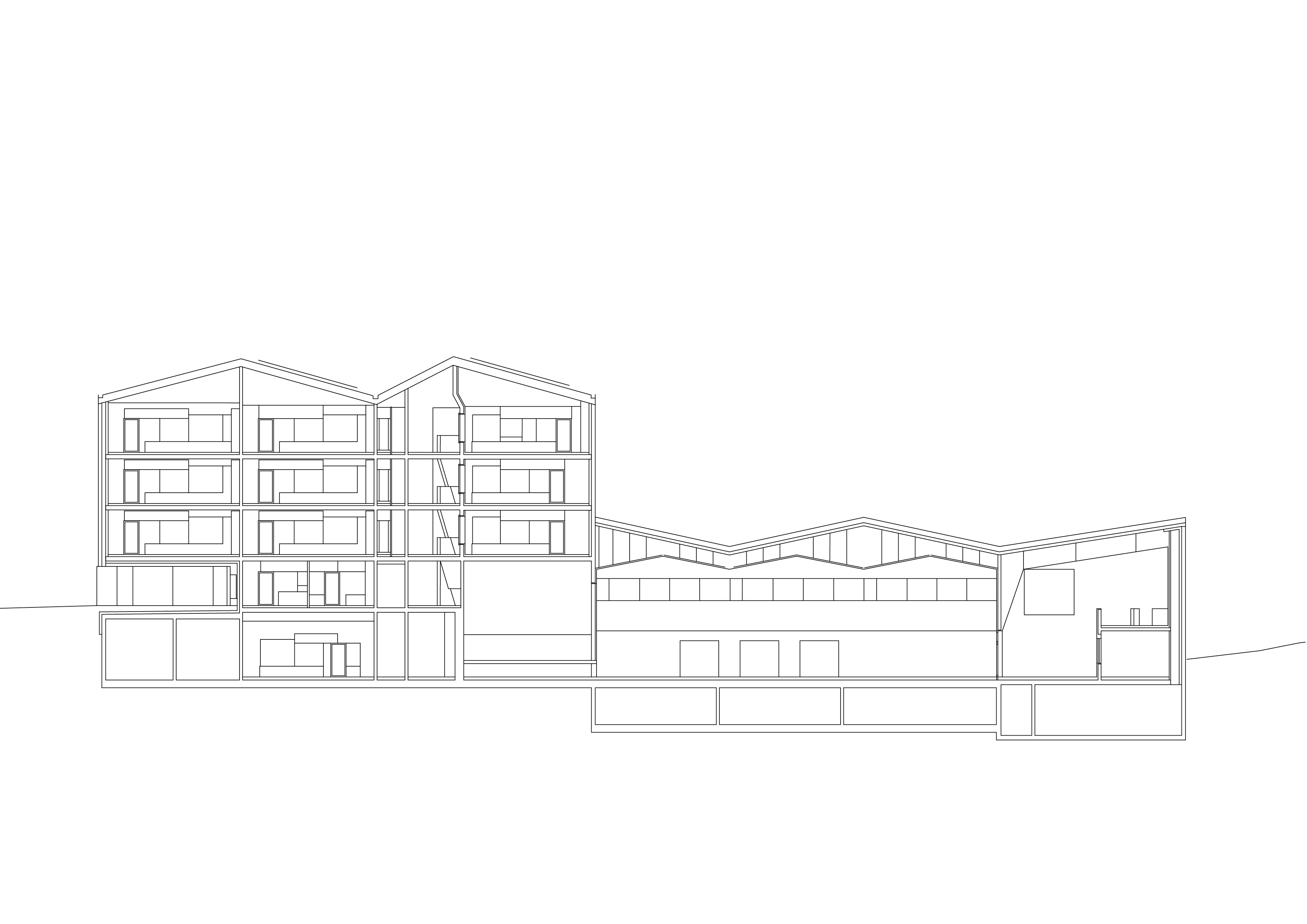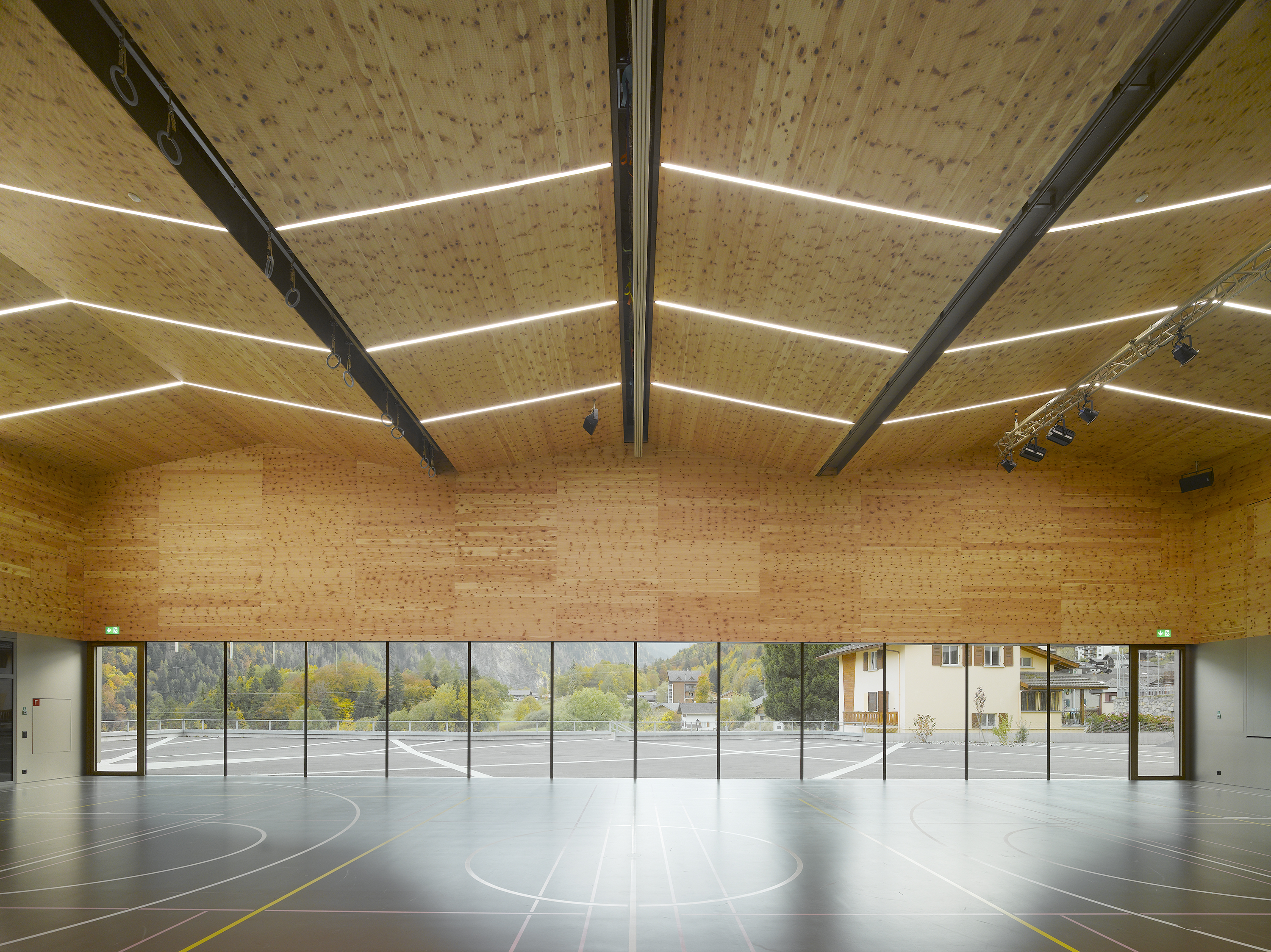 Le nouveau complexe scolaire, remplaçant l’école construite dans les années 70 et démolie du fait de son état d’obsolescence, exploite le terrain dans sa longueur et profite de la pente pour qualifier différents espaces extérieurs, les séparant naturellement tout en les reliant et en les connectant aux différents accès. Les deux programmes, enseignement et sport, sont joints dans une volumétrie unique, adossée à la pente. En plan, la forme en lignes brisées répond au mouvement de la topographie. En élévation, la dissemblance des hauteurs affirme la contiguïté des deux programmes. A l’image des grosses maisons du village, l’école se décline en hauteur, alors que la salle polyvalente reste basse. La distinction volumétrique permet l’intégration d’une structure publique de grande échelle dans un tissu villageois dense, composé de petites unités. Les vues sur le village et à contrario les vues sur le paysage depuis le village sont sauvegardées. La salle de sport, équipée d’une scène, s’ouvre sur la place inférieure.