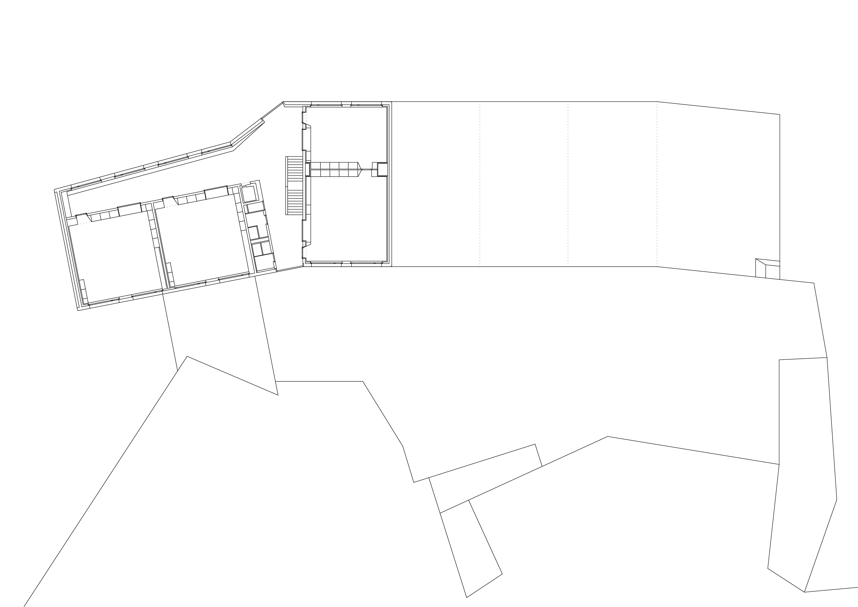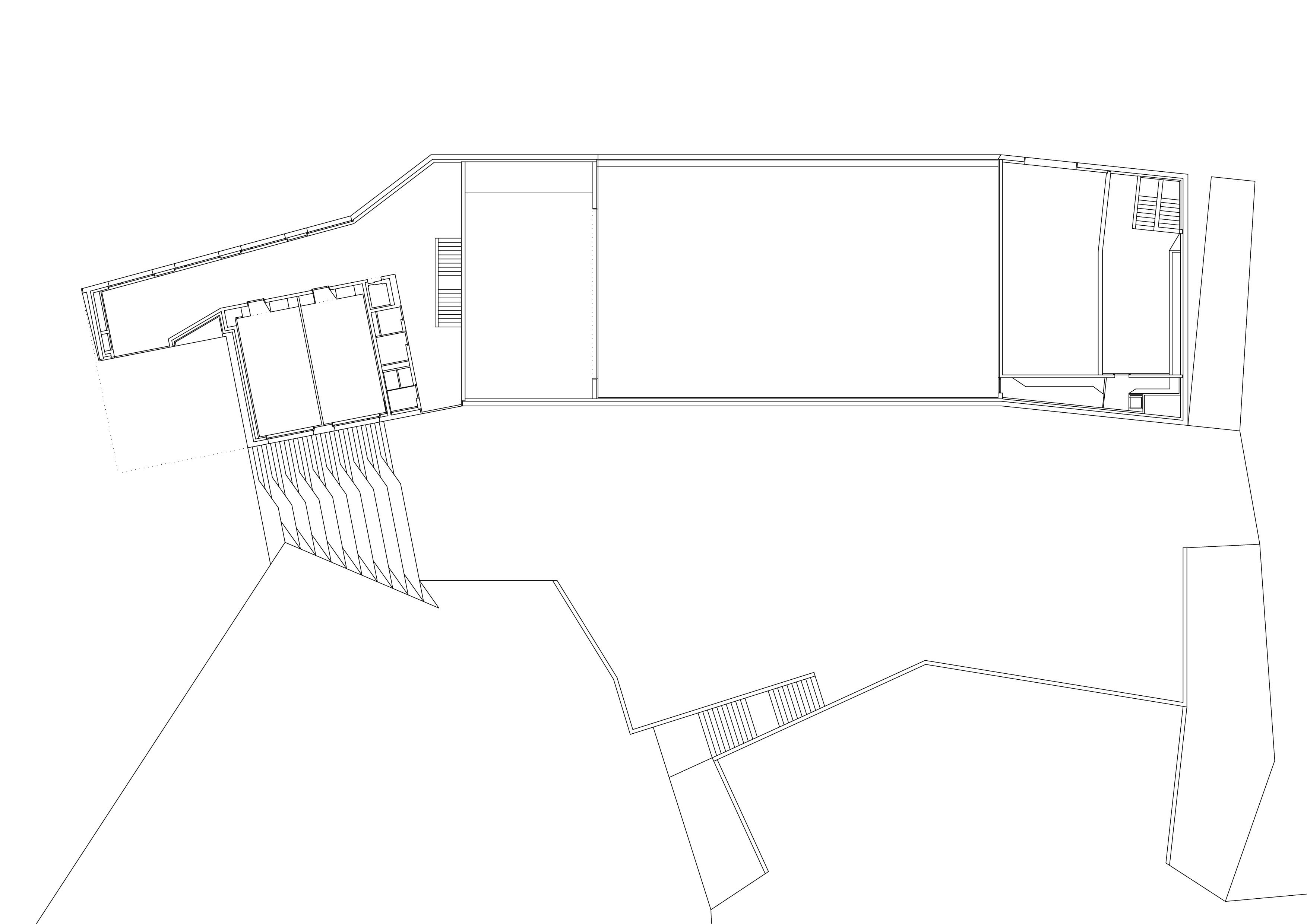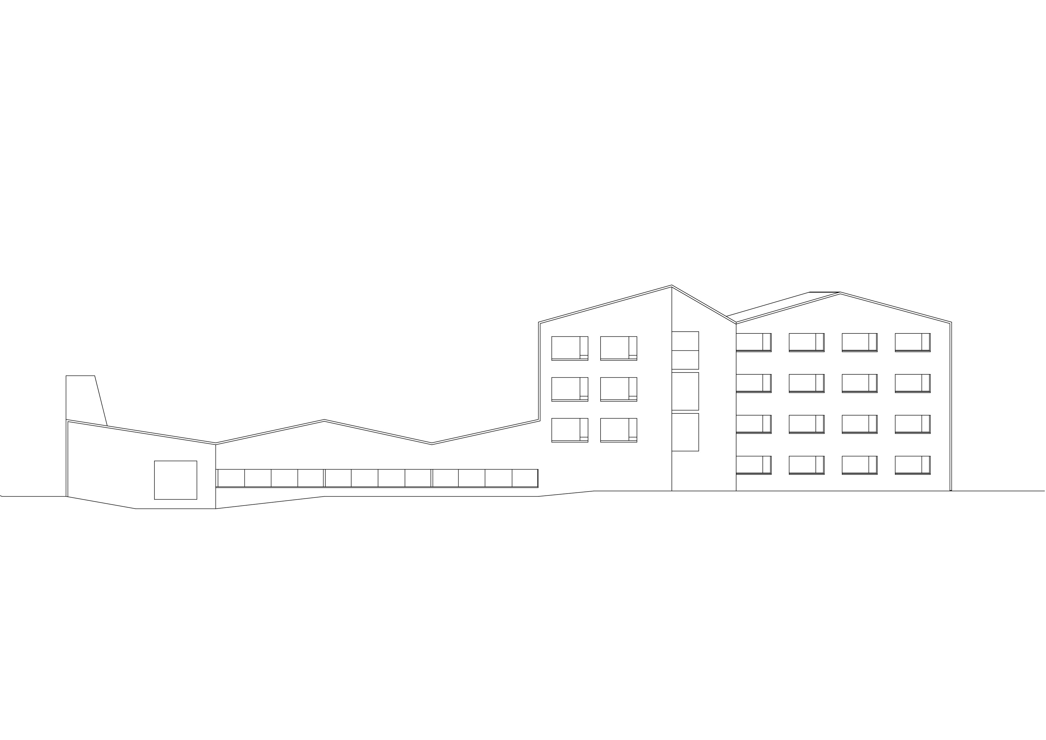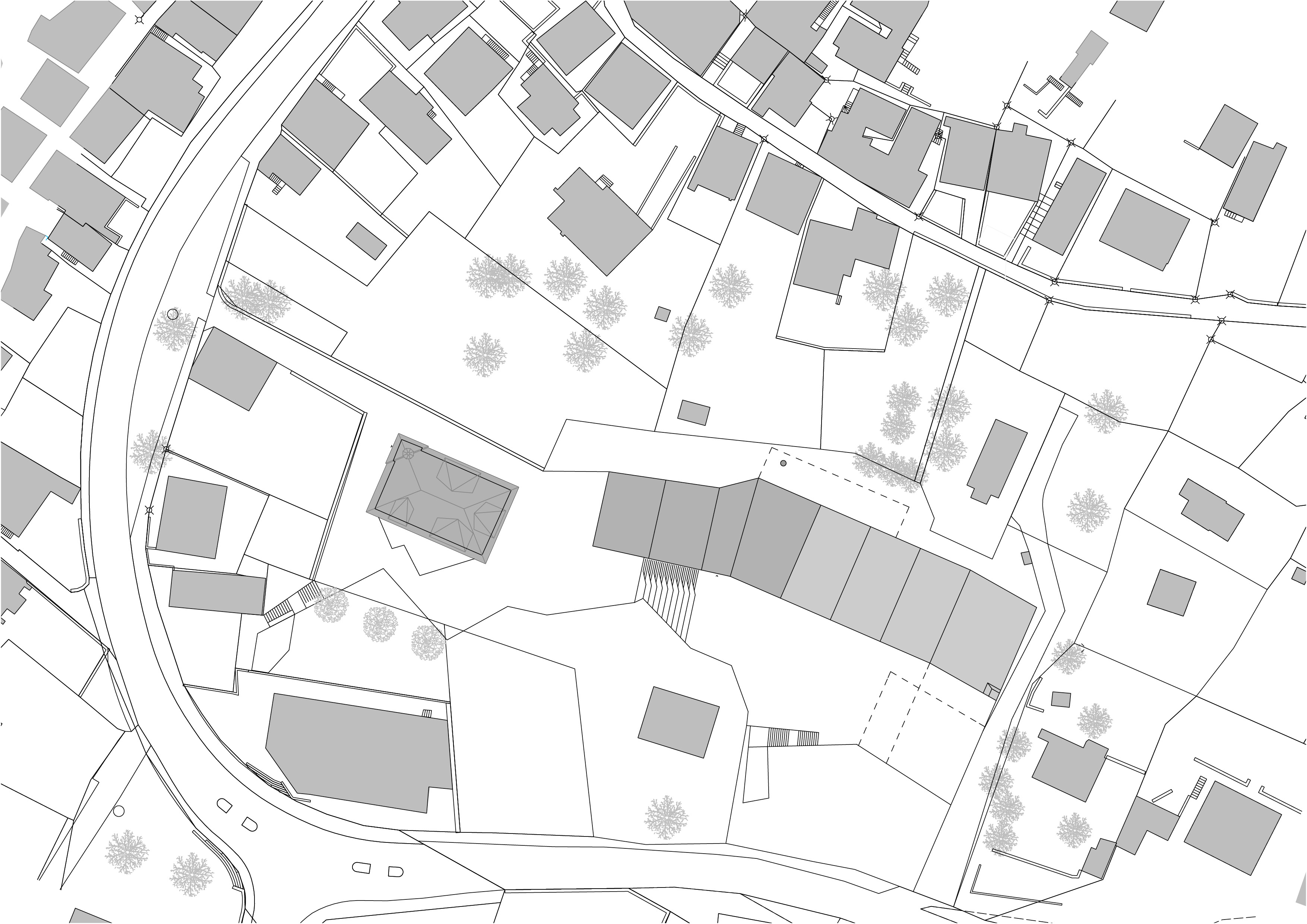 Le nouveau complexe scolaire, remplaçant l’école construite dans les années 70 et démolie du fait de son état d’obsolescence, exploite le terrain dans sa longueur et profite de la pente pour qualifier différents espaces extérieurs, les séparant naturellement tout en les reliant et en les connectant aux différents accès. Les deux programmes, enseignement et sport, sont joints dans une volumétrie unique, adossée à la pente. En plan, la forme en lignes brisées répond au mouvement de la topographie. En élévation, la dissemblance des hauteurs affirme la contiguïté des deux programmes. A l’image des grosses maisons du village, l’école se décline en hauteur, alors que la salle polyvalente reste basse. La distinction volumétrique permet l’intégration d’une structure publique de grande échelle dans un tissu villageois dense, composé de petites unités. Les vues sur le village et à contrario les vues sur le paysage depuis le village sont sauvegardées. La salle de sport, équipée d’une scène, s’ouvre sur la place inférieure.