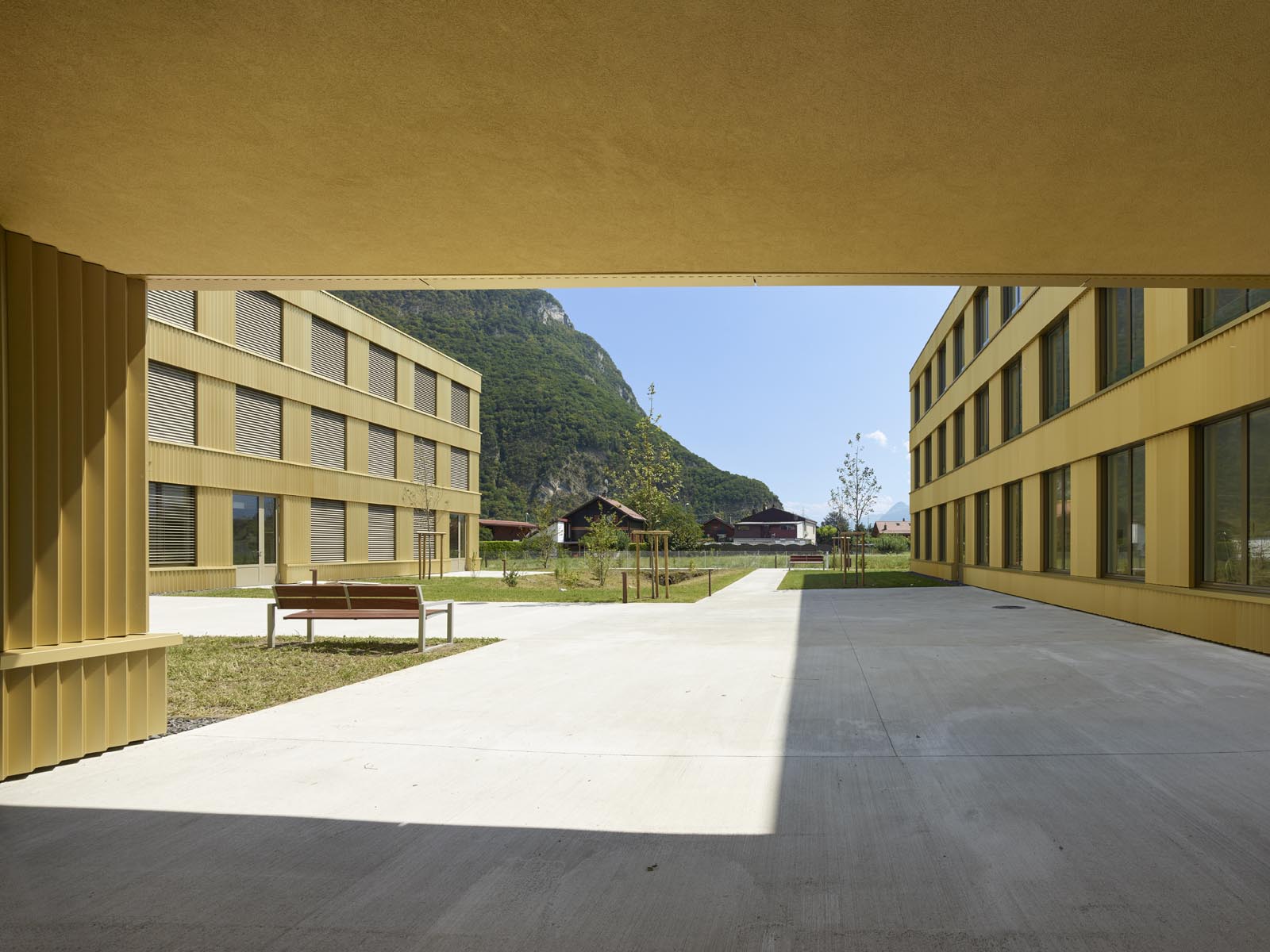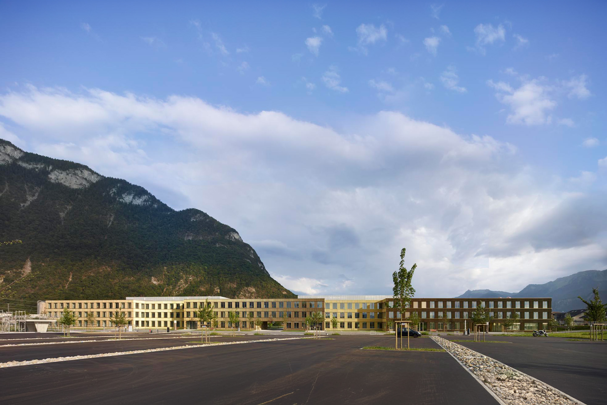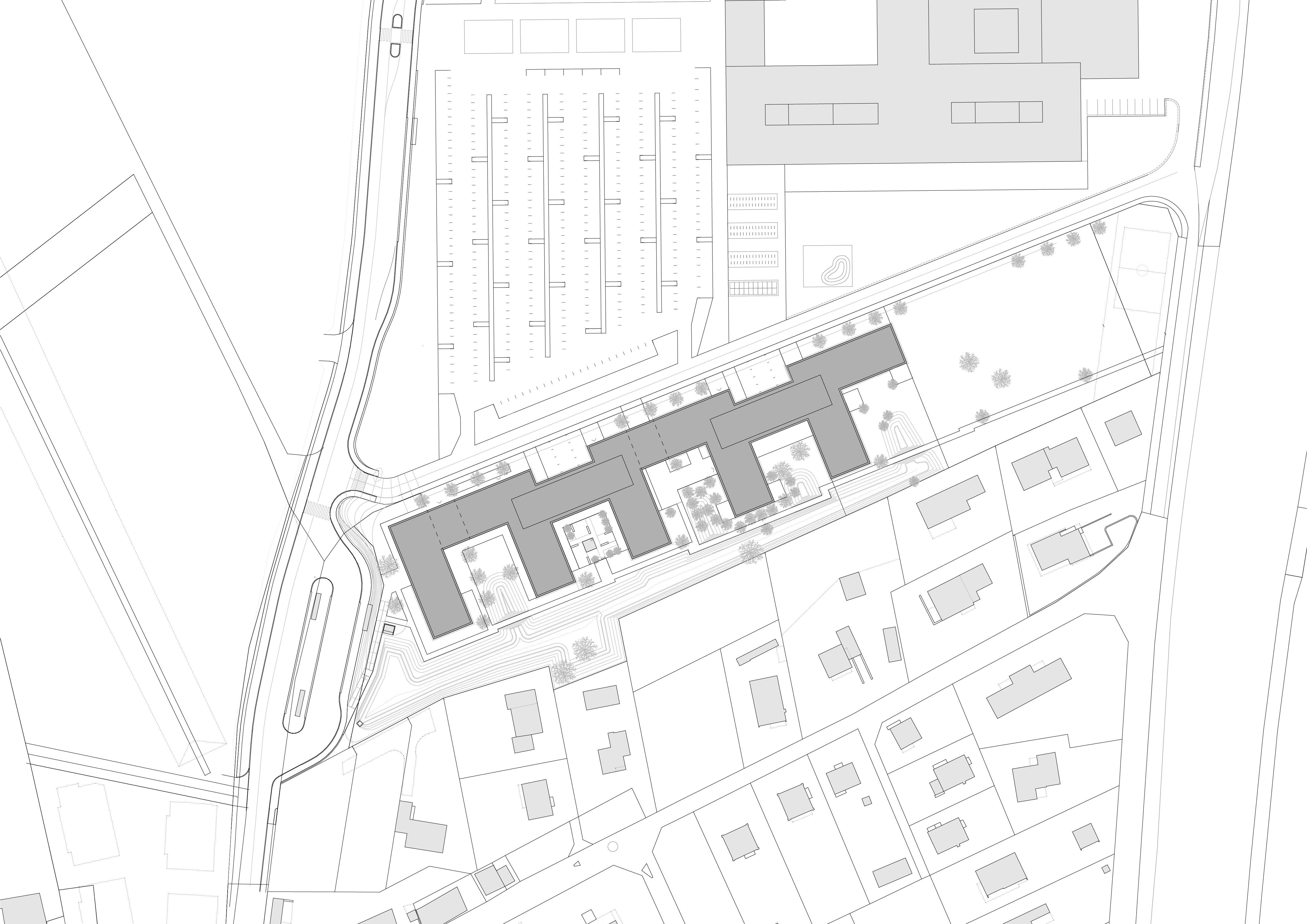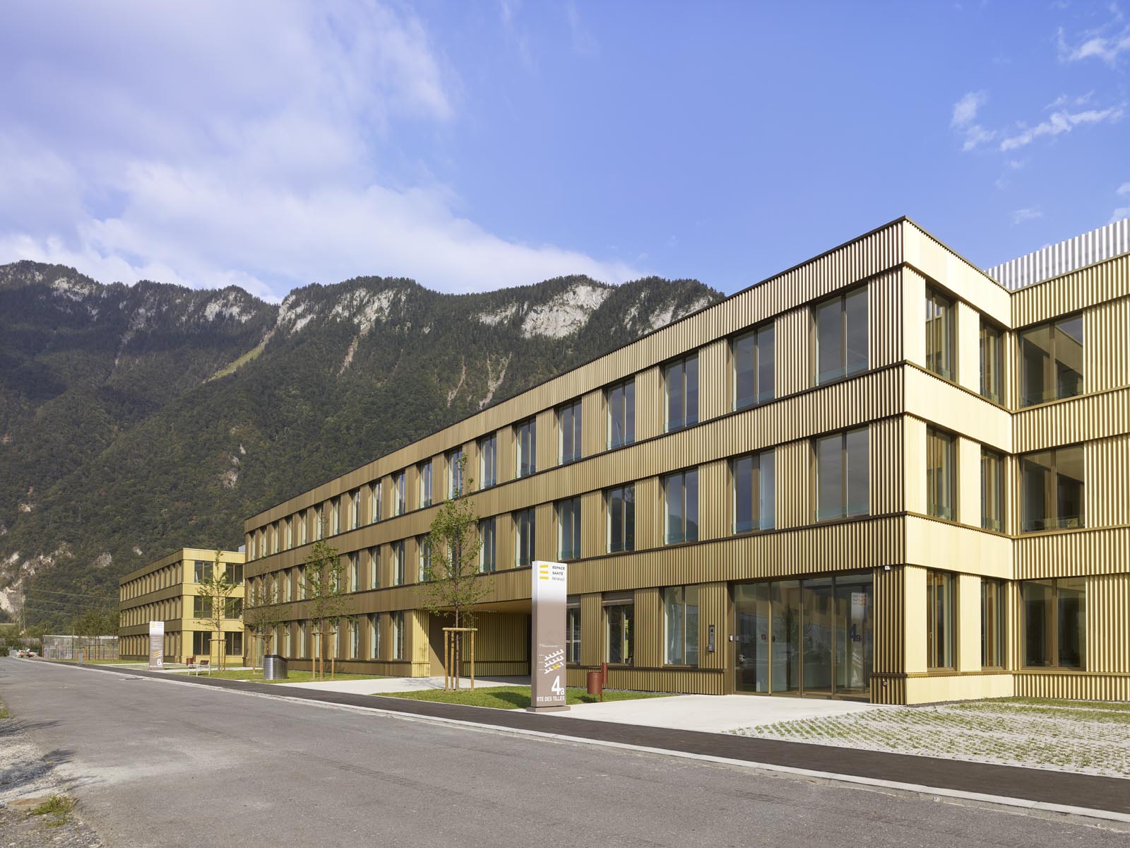 L’espace Santé est implanté à proximité immédiate du nouvel Hôpital Riviera Chablais, hôpital de soins aigus, réalisé à Rennaz. Il regroupe différents services et organismes para-hospitaliers. Le projet propose une structure unique, un bâtiment à cours multiples concentré dans la partie ouest du terrain, rattaché à l’axe d’entrée du village et ouvert sur le paysage chablaisien. La volumétrie compose avec les deux échelles présentes sur le site, la taille XL de l’Hôpital et la dimension XS de l’habitat individuel. La morphologie développée induit un front rythmé du côté de la desserte d’accès, apte à faire face à l’Hôpital Riviera Chablais. Elle offre au sud une alternance de corps de bâtiments et de cours, du côté du quartier de villas voisins. Les façades pignon, de taille modeste, évitent le vis-à-vis. Les profondeurs des cours créent la distance nécessaire au respect de la privacité des maisons individuelles. De larges passages percent le rez-de-chaussée du bâtiment pour offrir des vues depuis la desserte d’accès sur le parc.