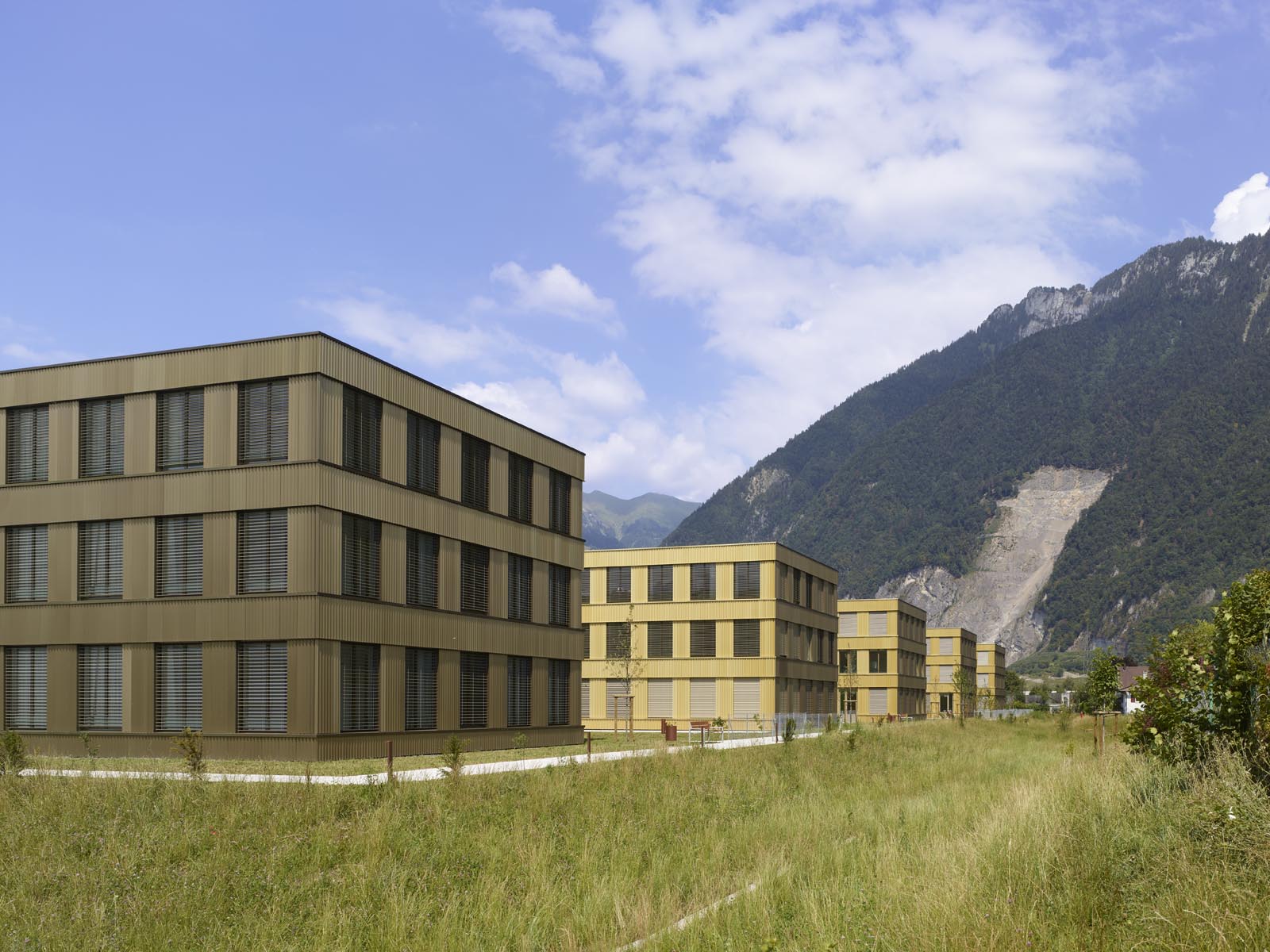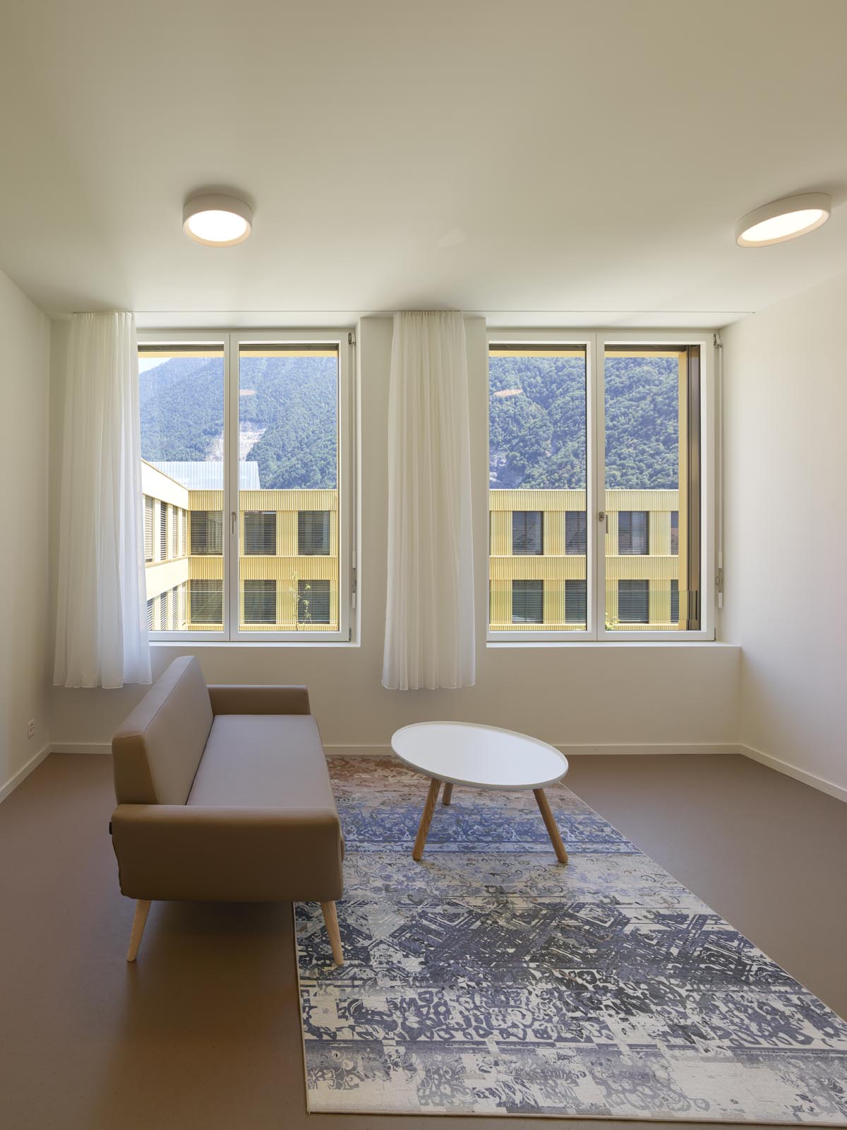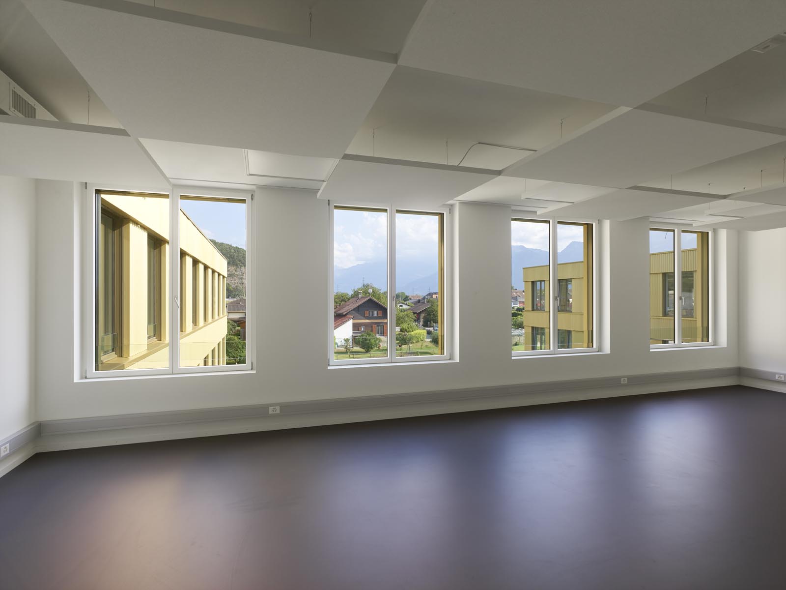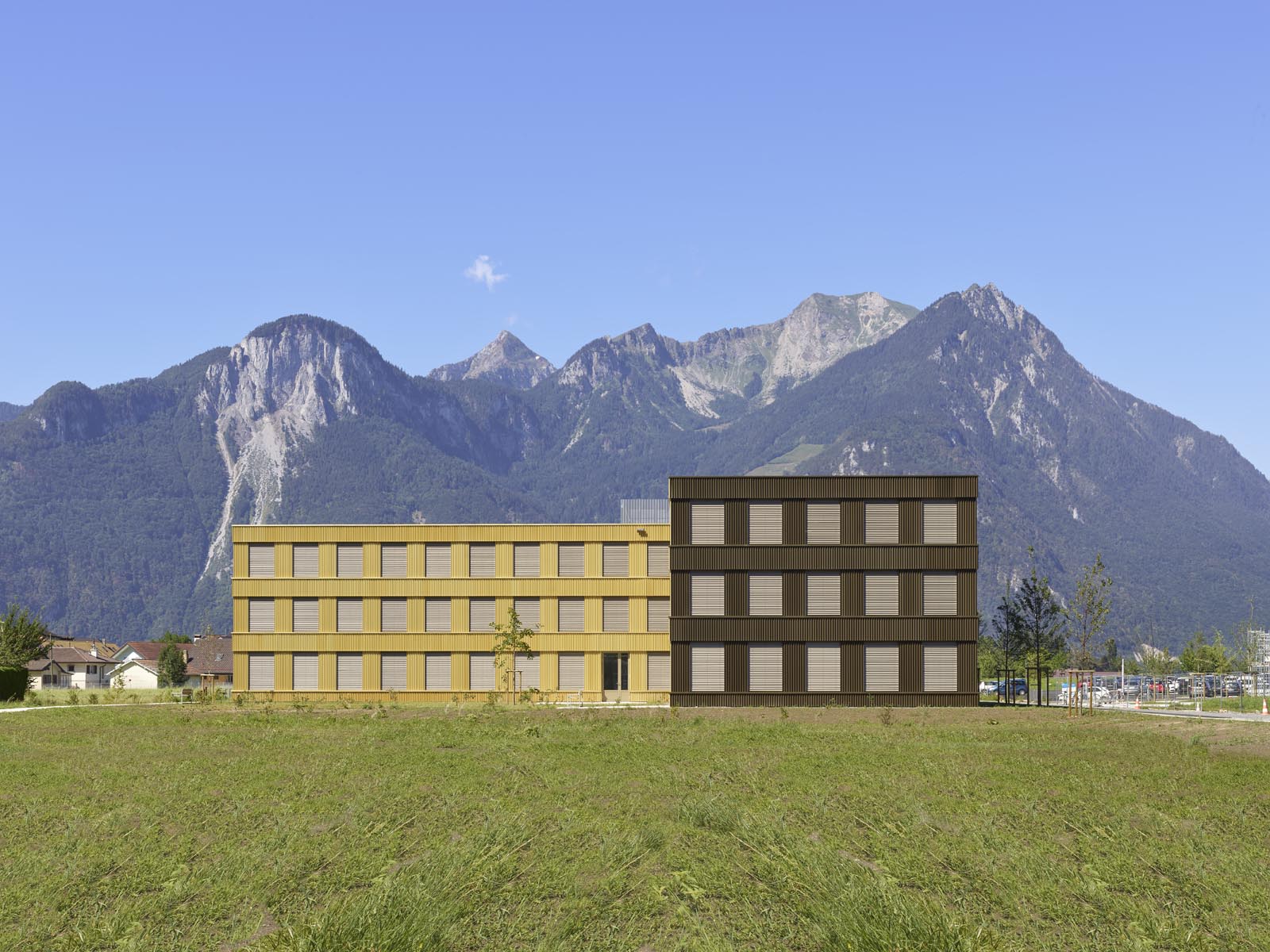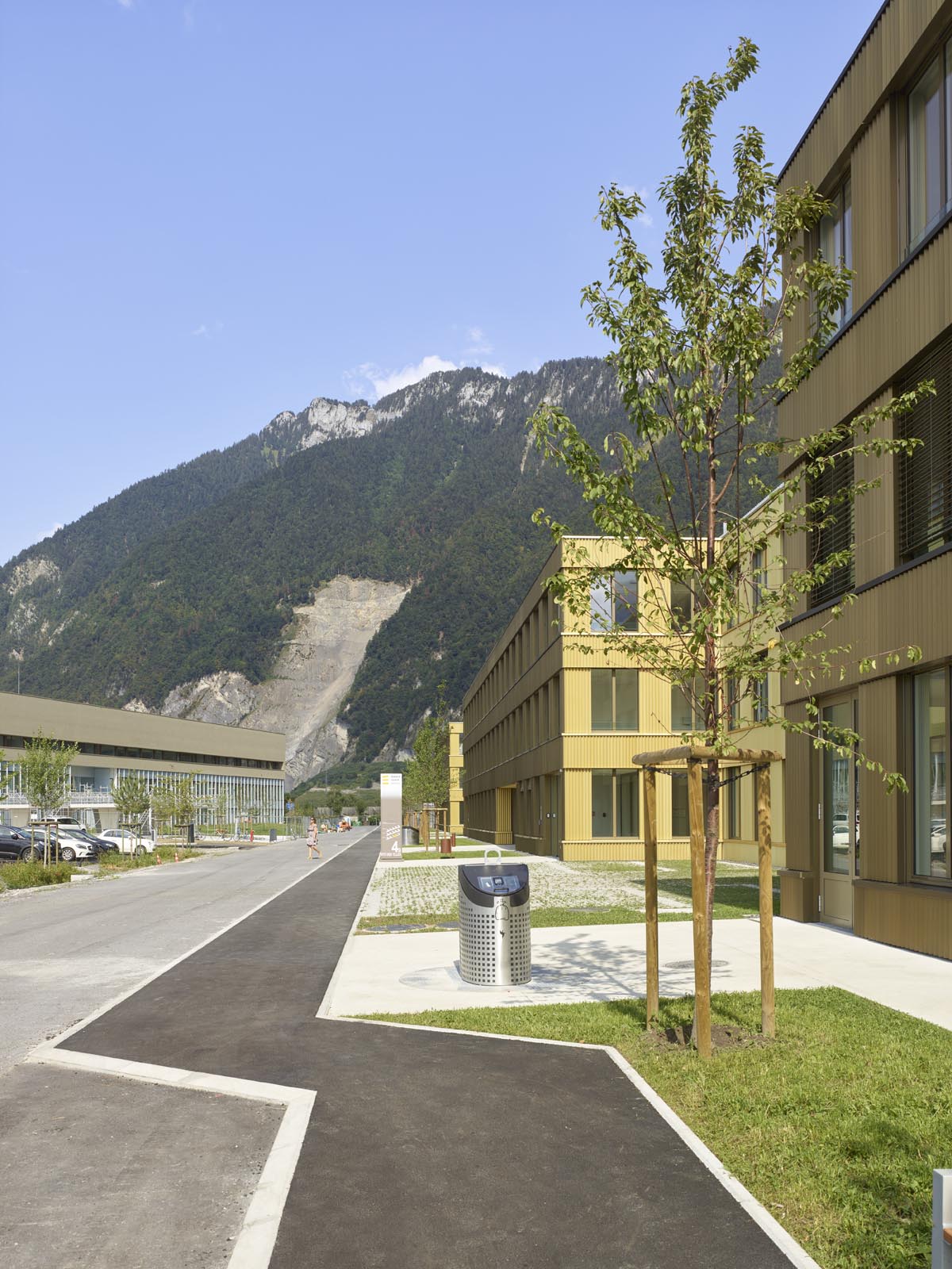L’espace Santé est implanté à proximité immédiate du nouvel Hôpital Riviera Chablais, hôpital de soins aigus, réalisé à Rennaz. Il regroupe différents services et organismes para-hospitaliers. Le projet propose une structure unique, un bâtiment à cours multiples concentré dans la partie ouest du terrain, rattaché à l’axe d’entrée du village et ouvert sur le paysage chablaisien. La volumétrie compose avec les deux échelles présentes sur le site, la taille XL de l’Hôpital et la dimension XS de l’habitat individuel. La morphologie développée induit un front rythmé du côté de la desserte d’accès, apte à faire face à l’Hôpital Riviera Chablais. Elle offre au sud une alternance de corps de bâtiments et de cours, du côté du quartier de villas voisins. Les façades pignon, de taille modeste, évitent le vis-à-vis. Les profondeurs des cours créent la distance nécessaire au respect de la privacité des maisons individuelles. De larges passages percent le rez-de-chaussée du bâtiment pour offrir des vues depuis la desserte d’accès sur le parc.