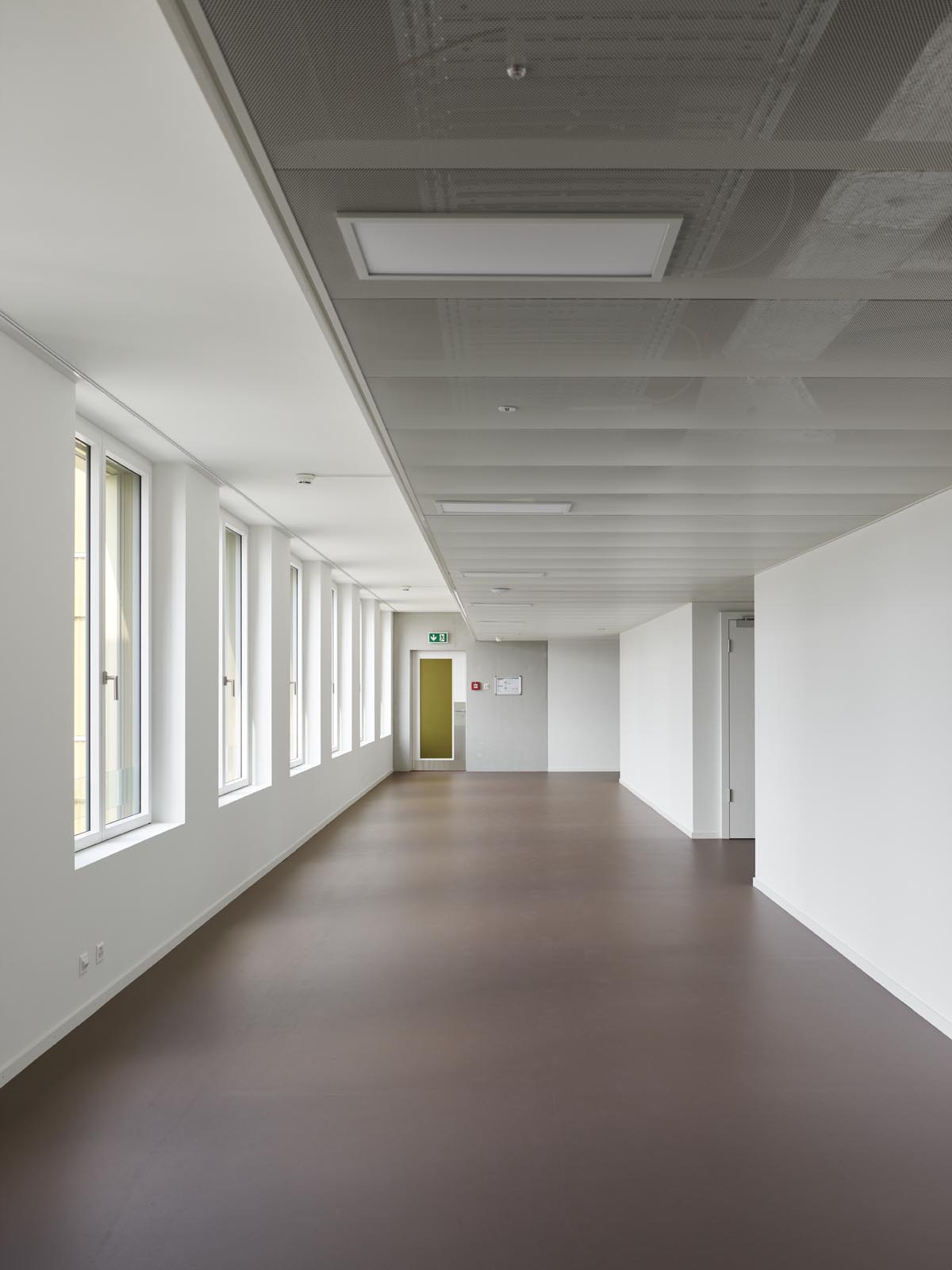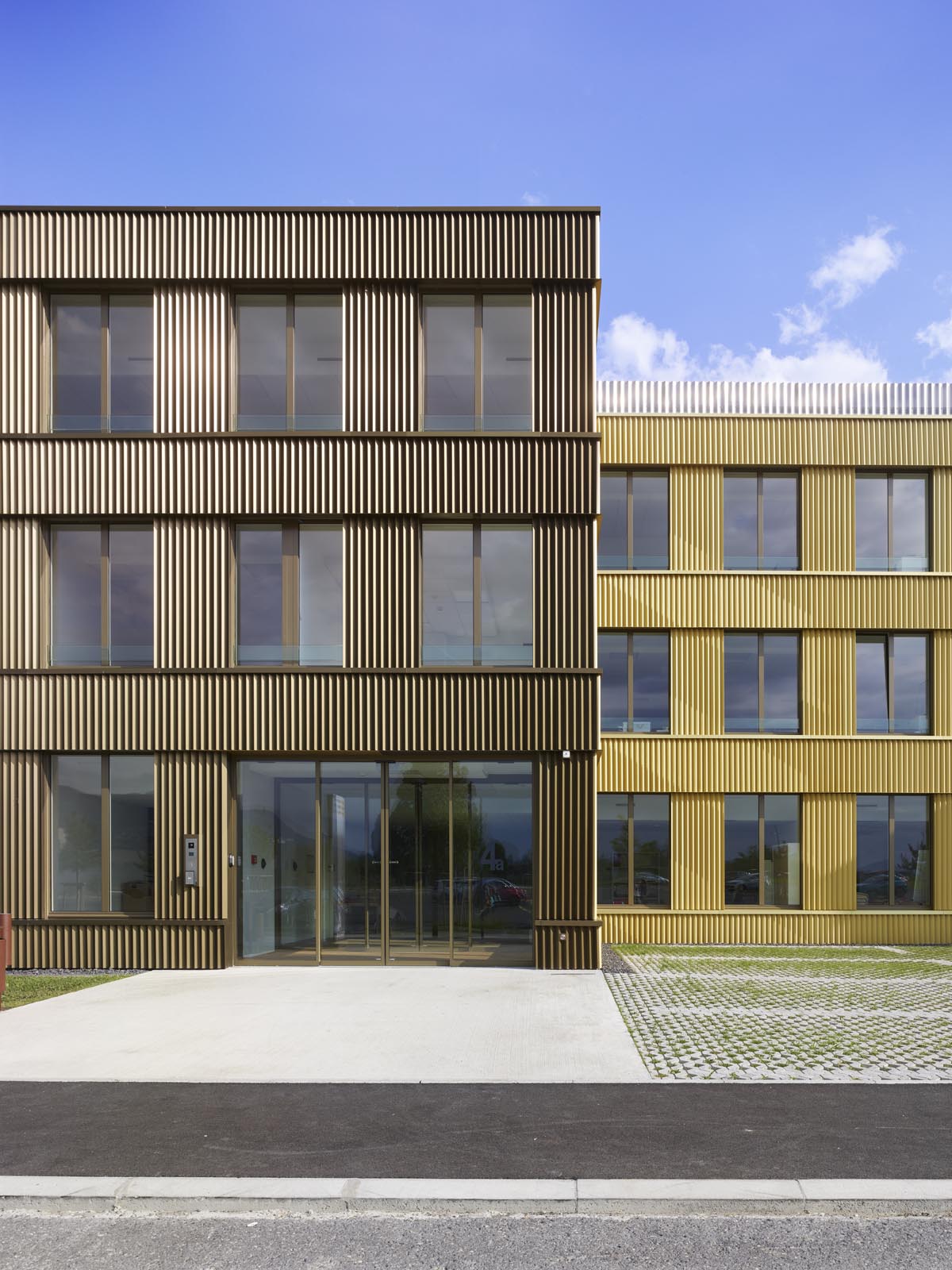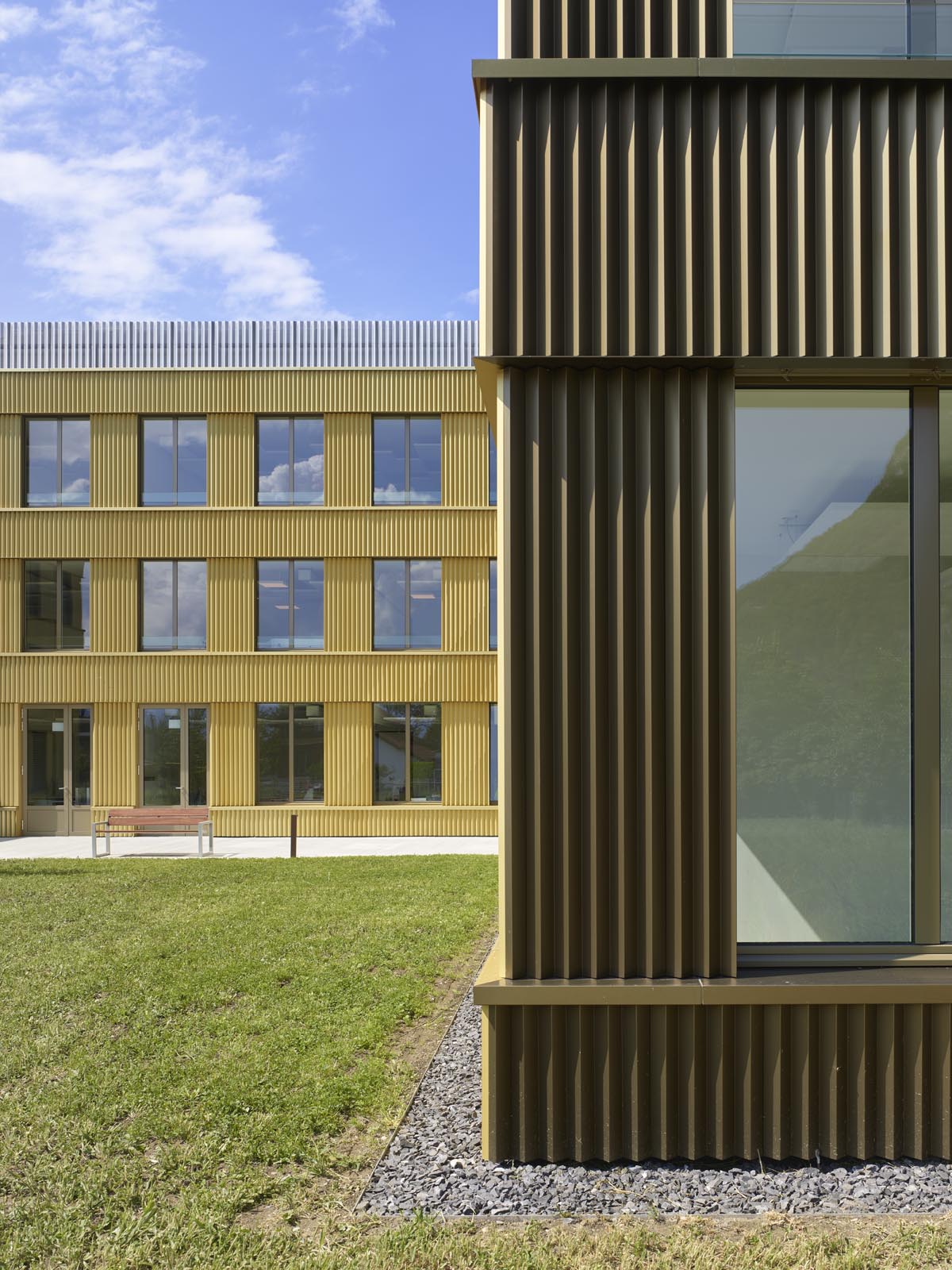 Afin d’offrir une grande flexibilité et adaptabilité, un tracé régulateur régit de manière cartésienne l’ensemble du projet : définition des porteurs statiques, modénature des façades, système distributif. Il permet une systématisation constructive efficiente et une mise en place des fonctions efficace. La hauteur uniforme, de deux étages sur rez-de-chaussée, et le rythme régulier des façades confèrent à l’ensemble une homogénéité qui dégage une impression de simplicité et de rationalité. La modénature des façades exprime la strate des trois niveaux. L’horizontalité domine. La tête de dalle associée au contrecoeur des fenêtres forme un bandeau, en léger débord, qui court de manière continue sur toutes les façades. Le bardage en tôle profilée aluminium habille les façades, décliné en ton bronze sur le pourtour du bâtiment et or pour les façades sur cour.