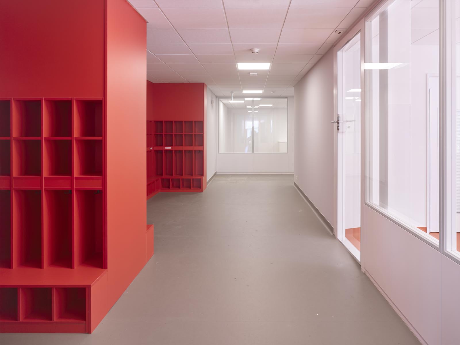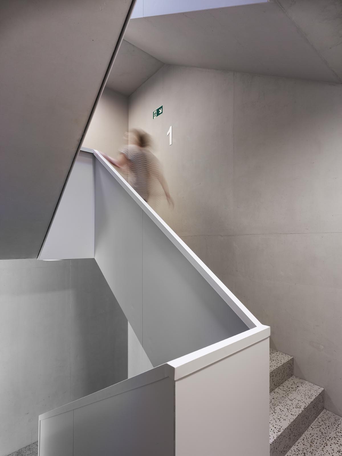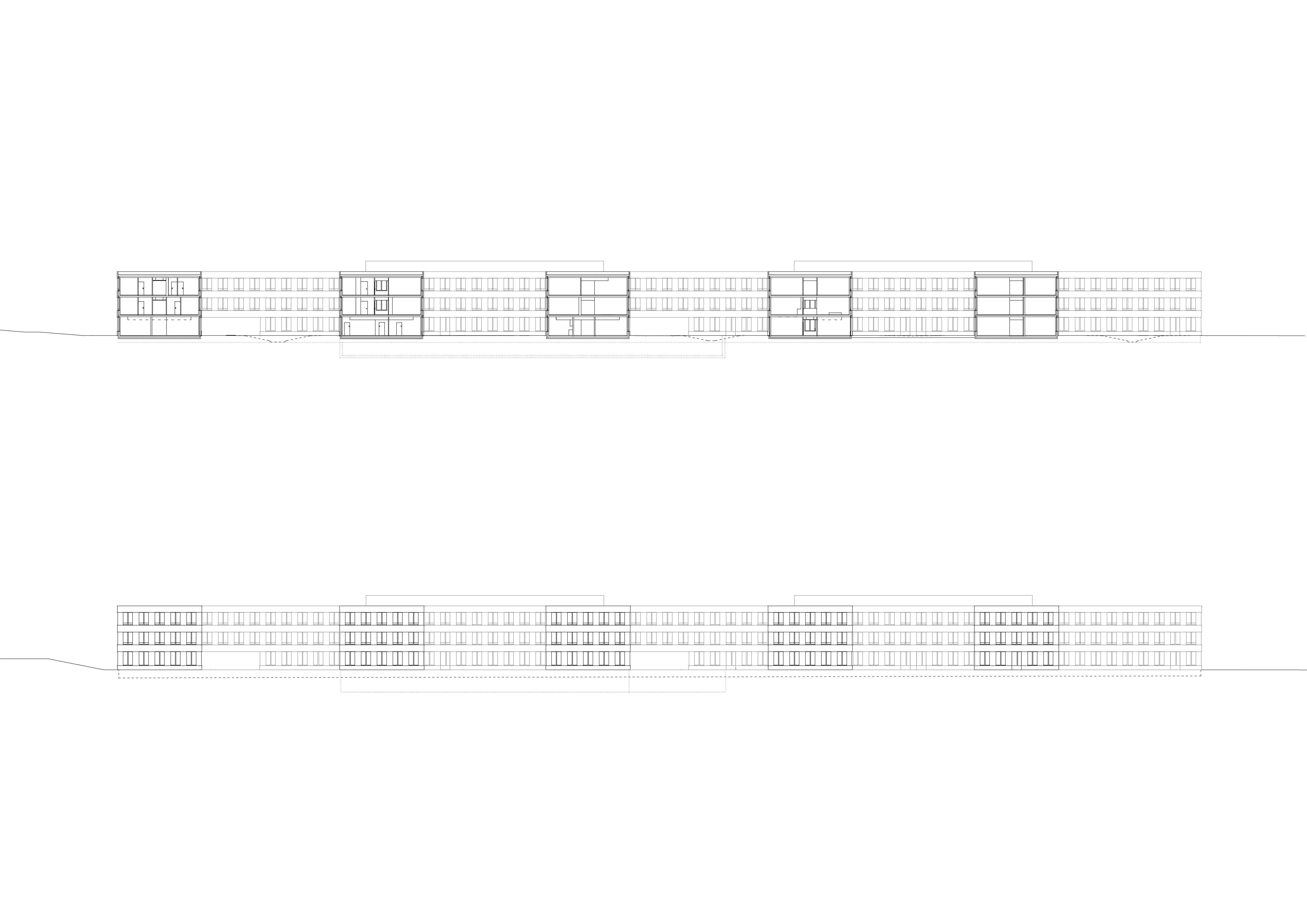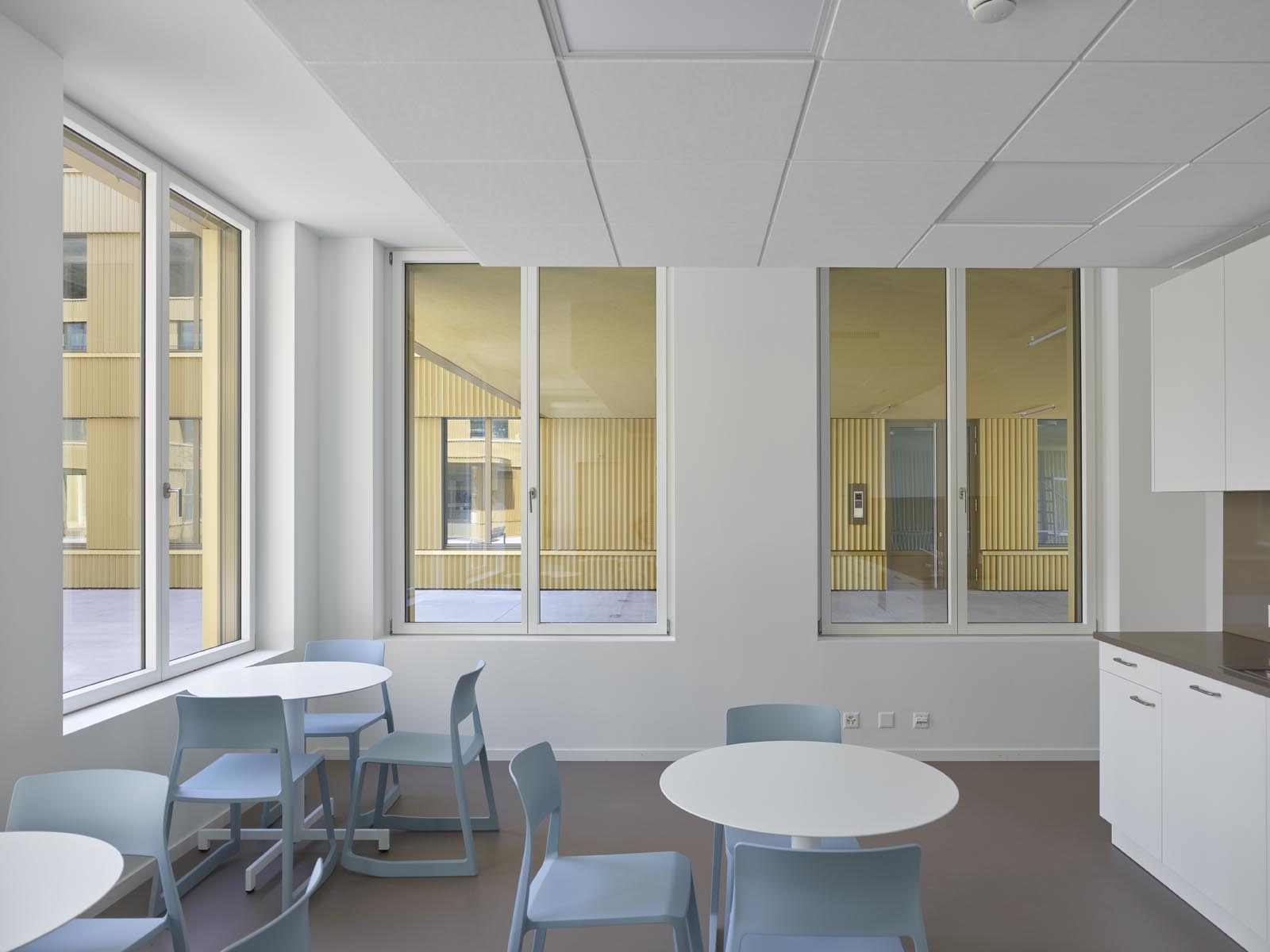 Afin d’offrir une grande flexibilité et adaptabilité, un tracé régulateur régit de manière cartésienne l’ensemble du projet : définition des porteurs statiques, modénature des façades, système distributif. Il permet une systématisation constructive efficiente et une mise en place des fonctions efficace. La hauteur uniforme, de deux étages sur rez-de-chaussée, et le rythme régulier des façades confèrent à l’ensemble une homogénéité qui dégage une impression de simplicité et de rationalité. La modénature des façades exprime la strate des trois niveaux. L’horizontalité domine. La tête de dalle associée au contrecoeur des fenêtres forme un bandeau, en léger débord, qui court de manière continue sur toutes les façades. Le bardage en tôle profilée aluminium habille les façades, décliné en ton bronze sur le pourtour du bâtiment et or pour les façades sur cour.