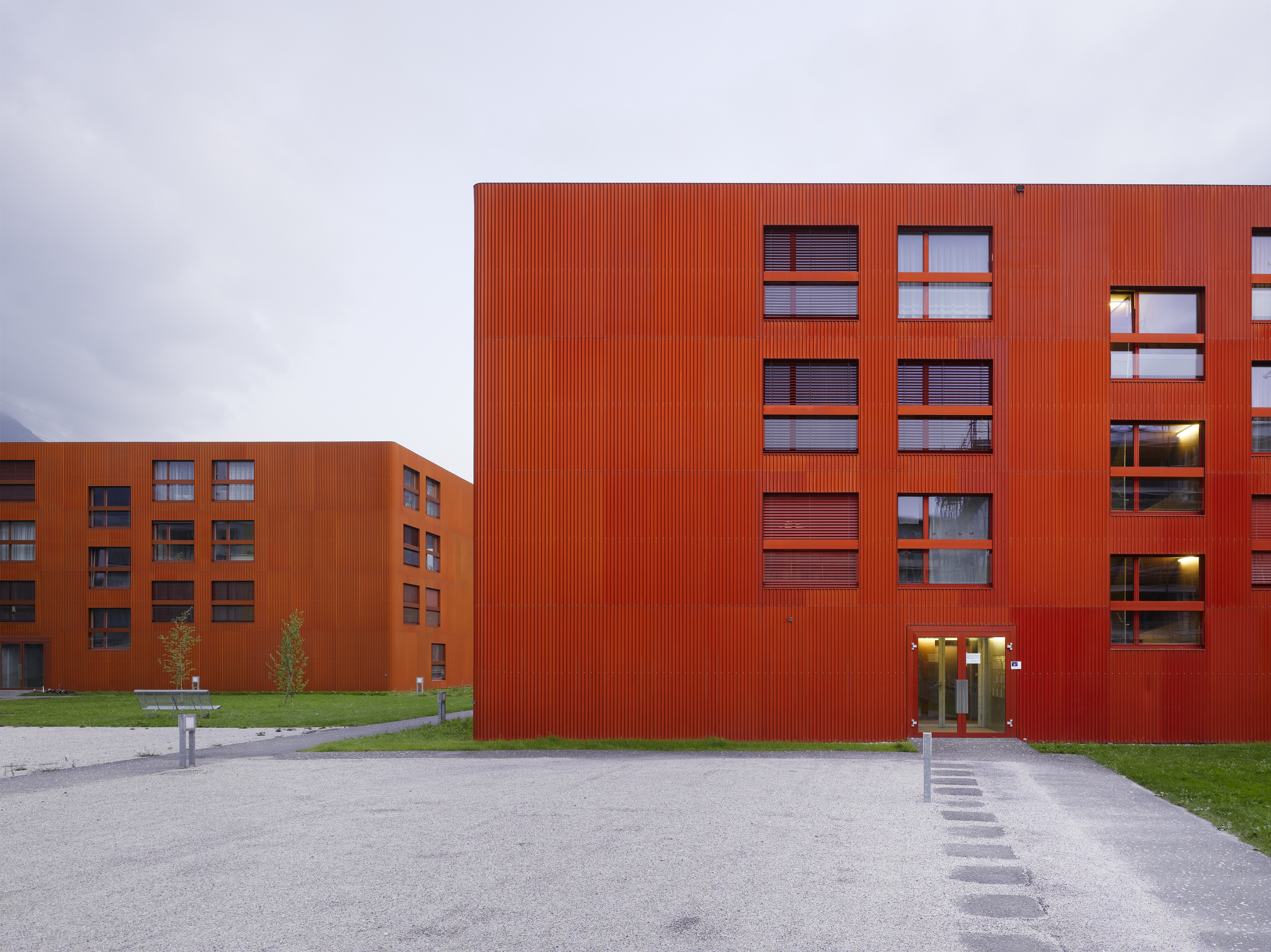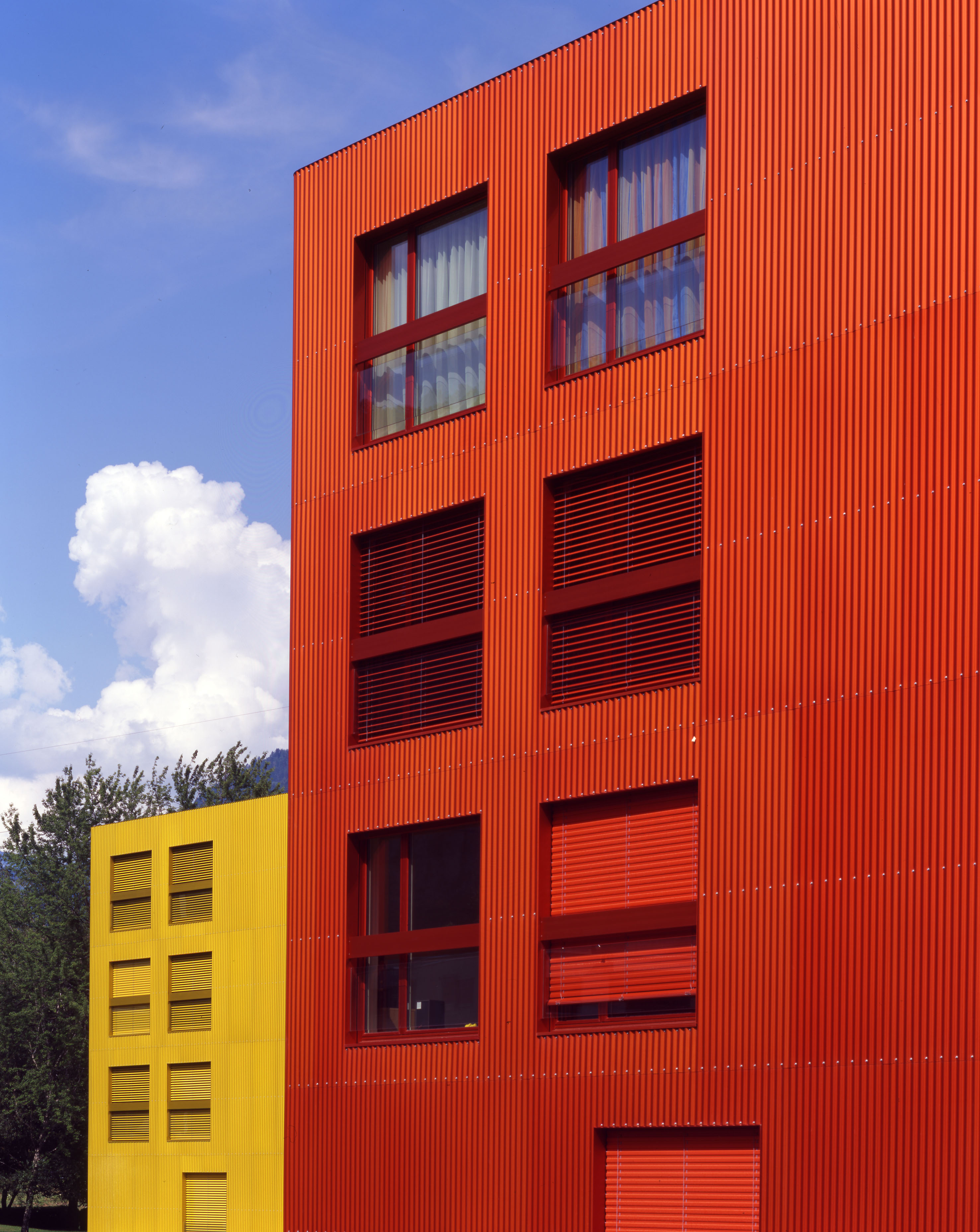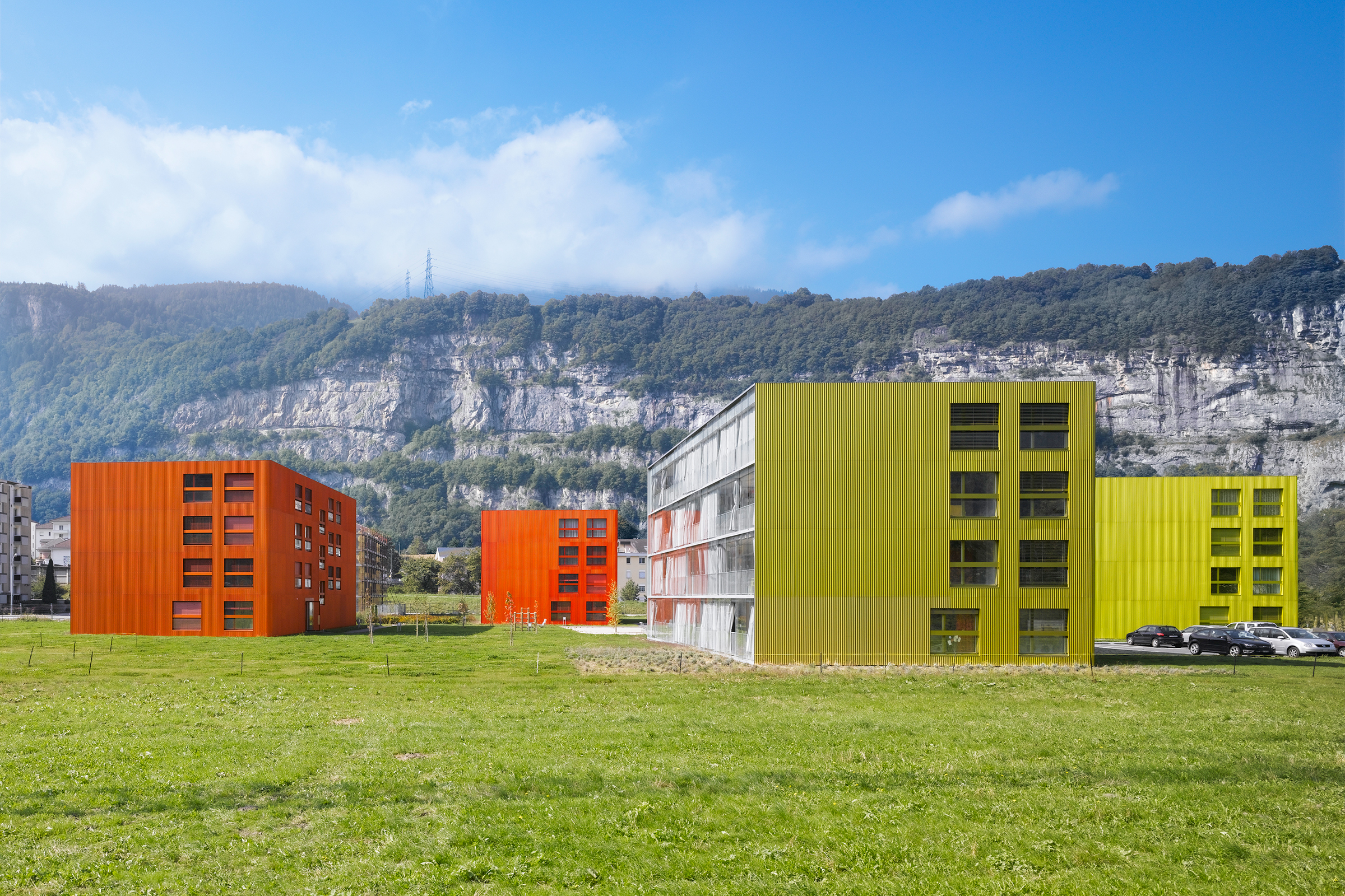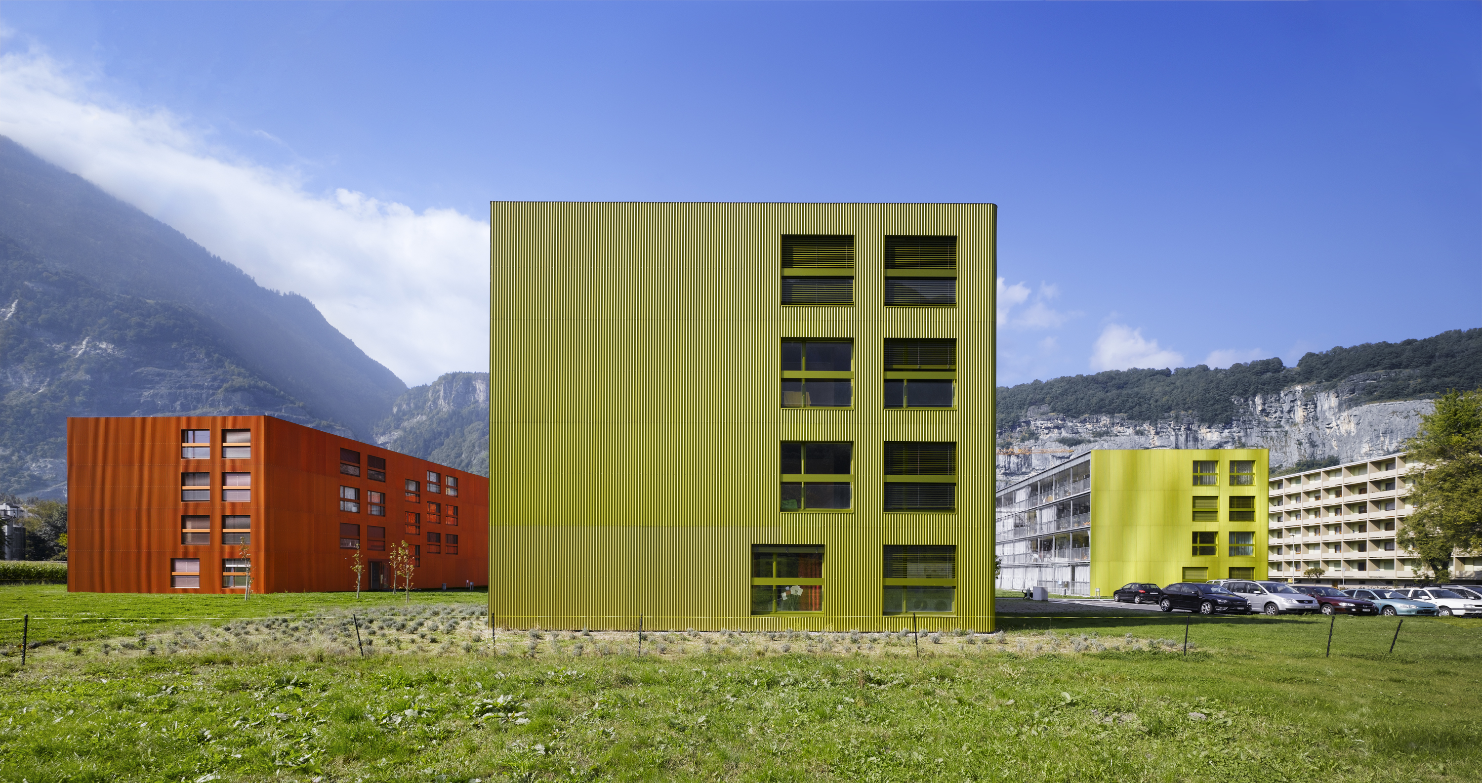 Les bâtiments plots présentent trois façades, Est, Nord et Ouest, aux grandes fenêtres ponctuelles, bardées de tôle d’aluminium ondulée, et d’une façade Sud largement ouverte sur des balcons vérandas, protégés d’une peau en verre. Cette modénature contrastée répond à la contrainte climatique du lieu, avec une dominance de précipitations côté nord et un fort vent côté sud. Le court ensoleillement, en hiver, a influencé le choix de teintes affirmées. La lumière est captée sur les verres de la double peau.