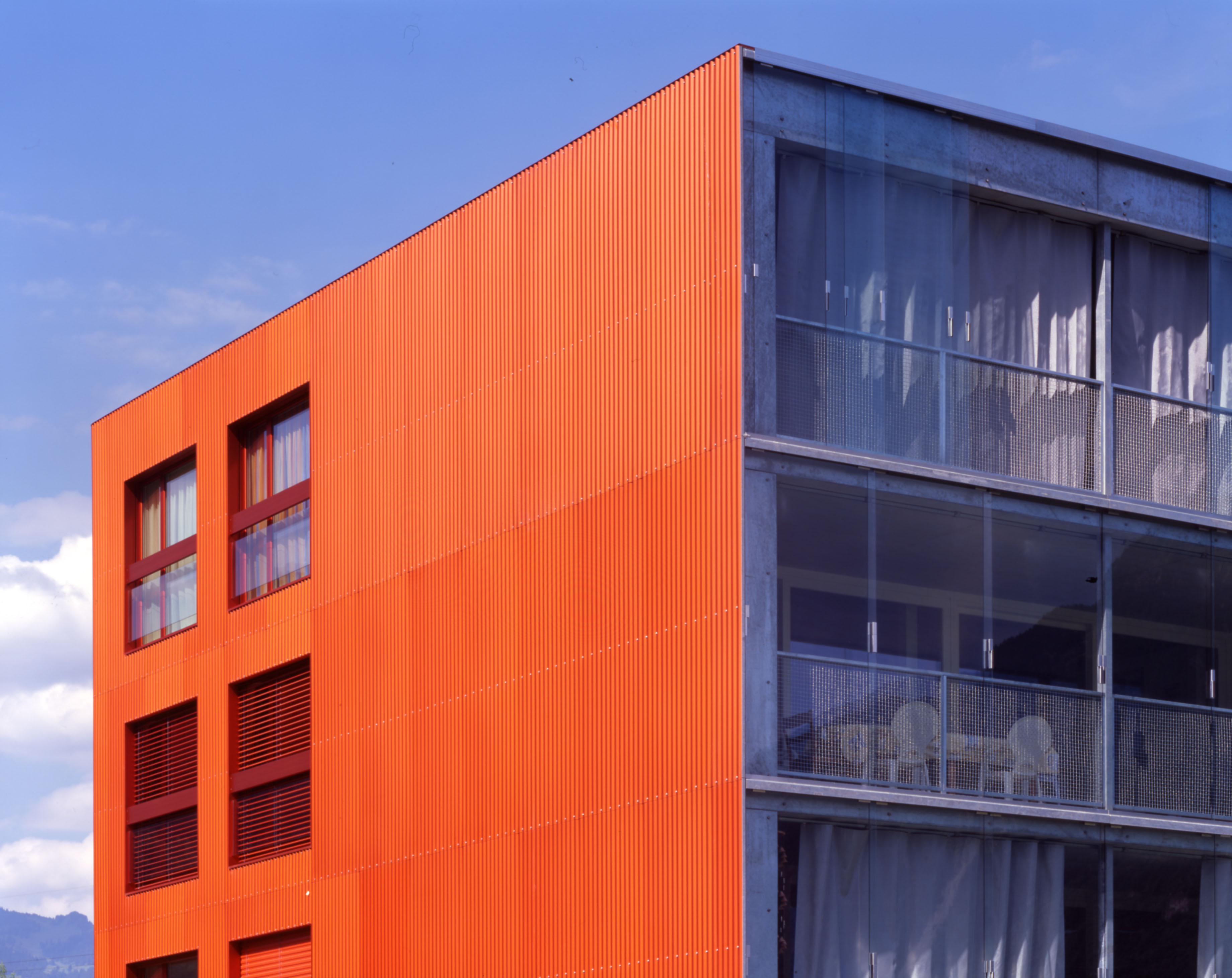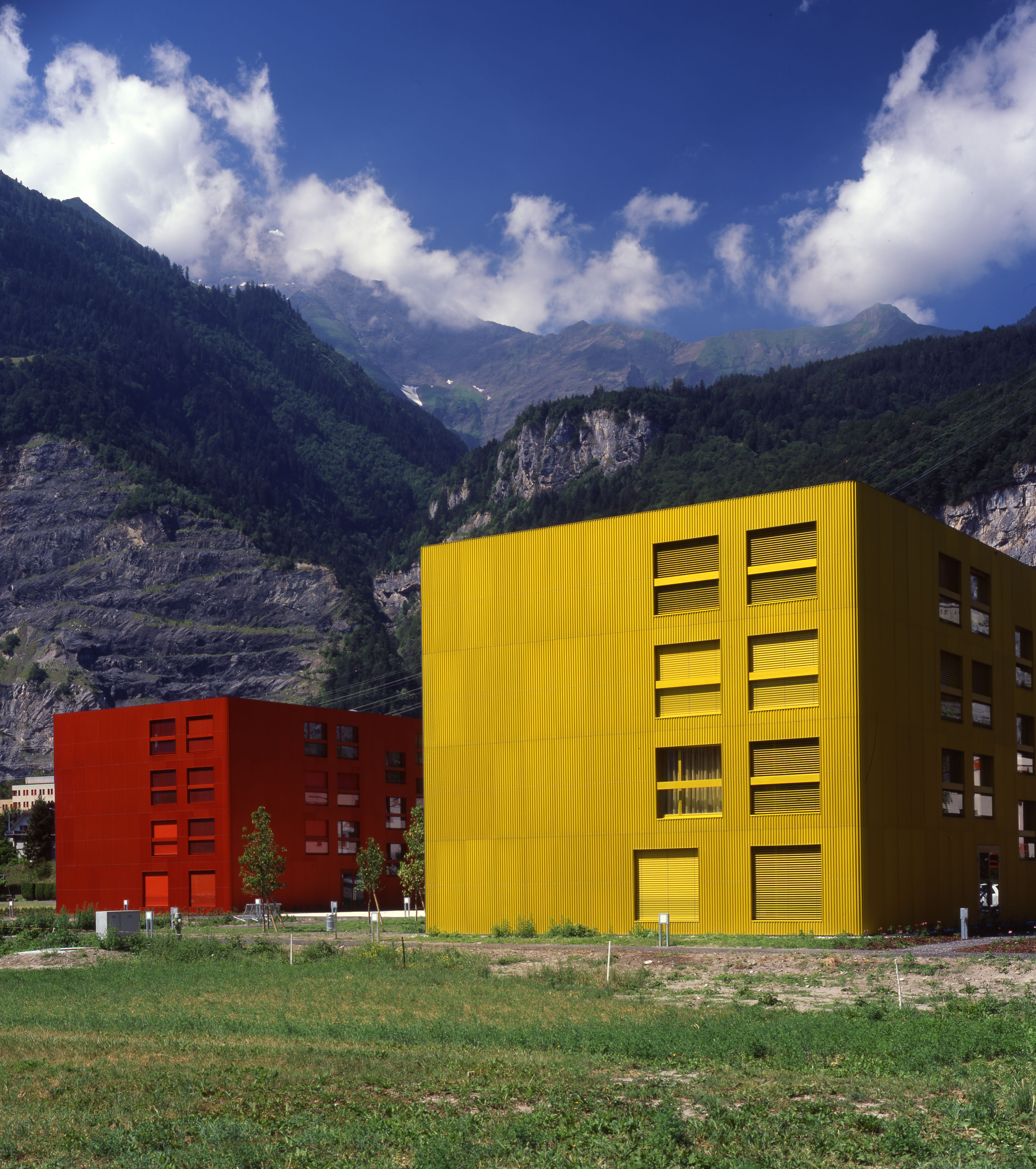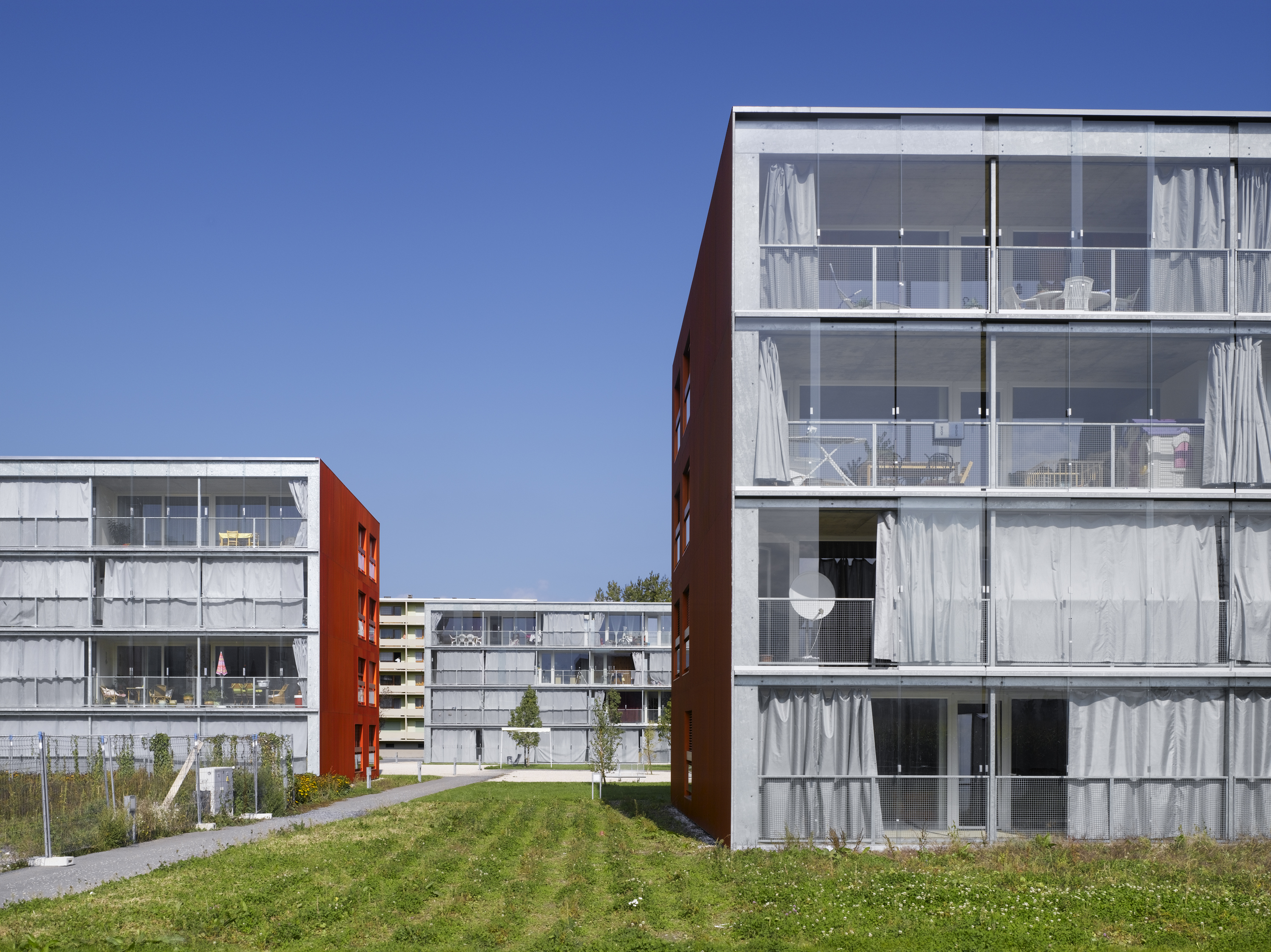 Les bâtiments plots présentent trois façades, Est, Nord et Ouest, aux grandes fenêtres ponctuelles, bardées de tôle d’aluminium ondulée, et d’une façade Sud largement ouverte sur des balcons vérandas, protégés d’une peau en verre. Cette modénature contrastée répond à la contrainte climatique du lieu, avec une dominance de précipitations côté nord et un fort vent côté sud. Le court ensoleillement, en hiver, a influencé le choix de teintes affirmées. La lumière est captée sur les verres de la double peau.