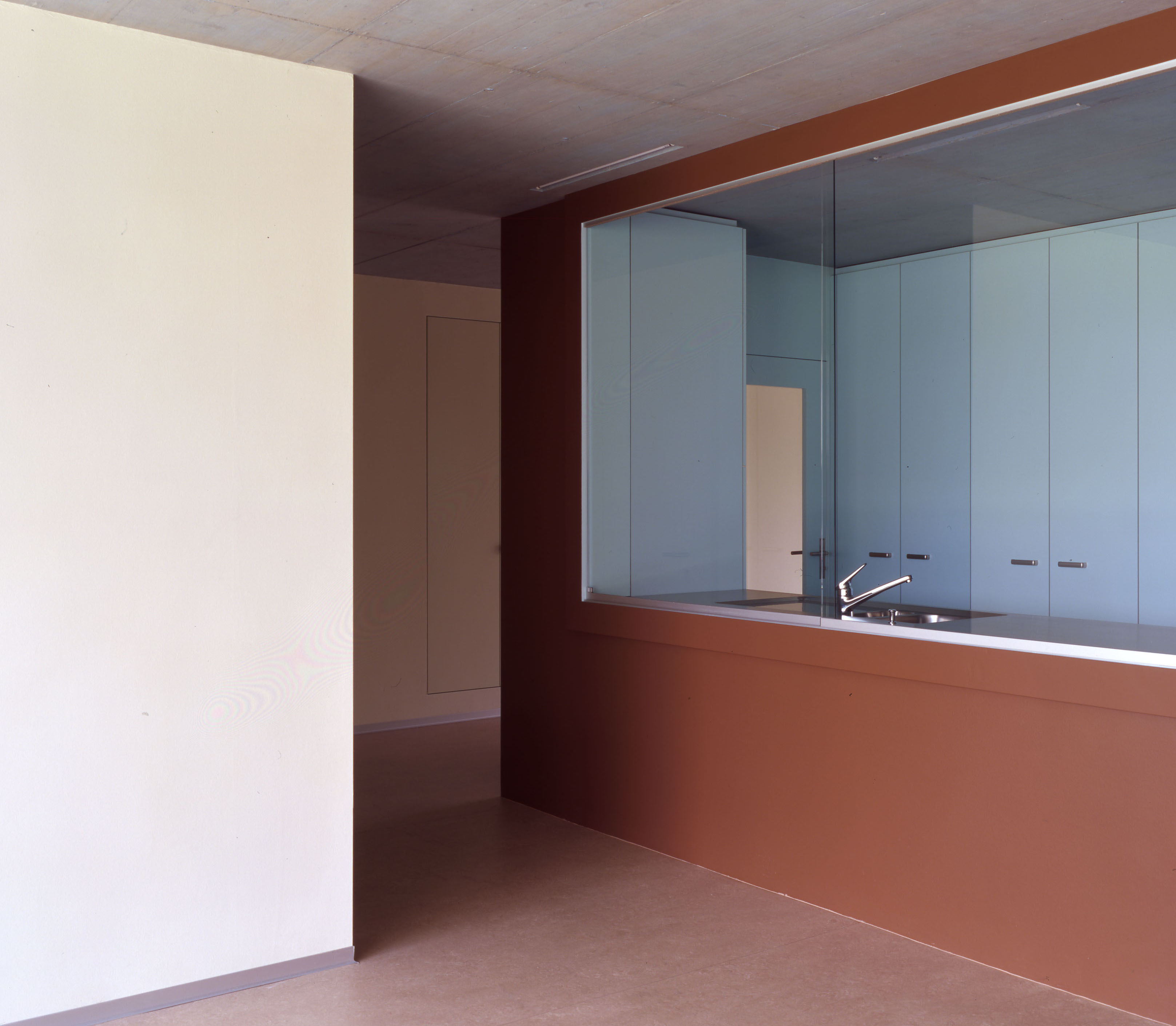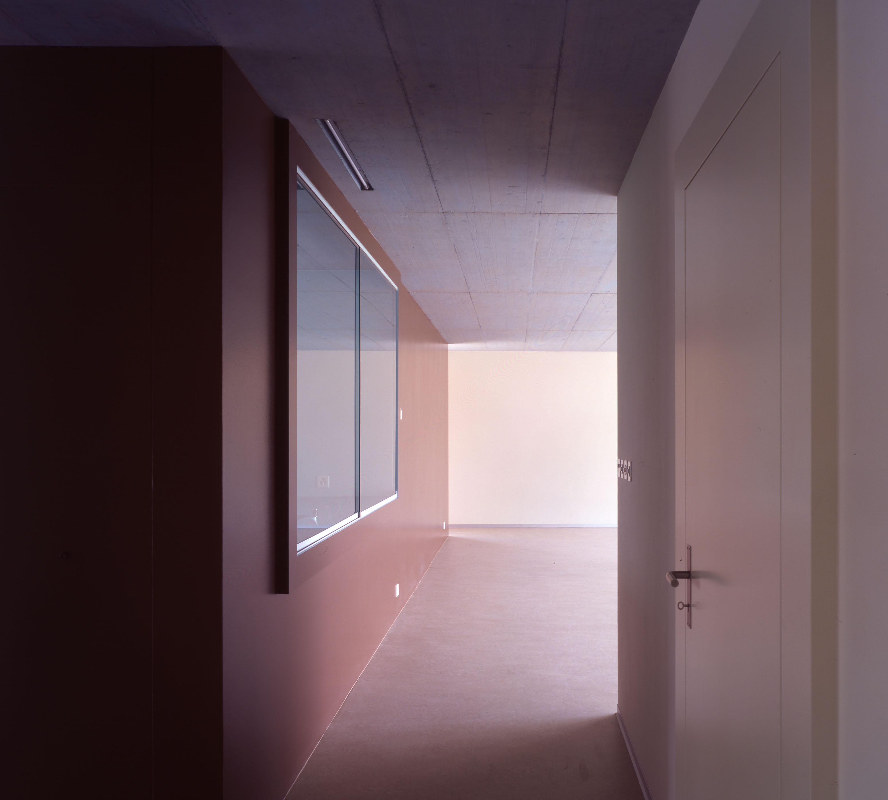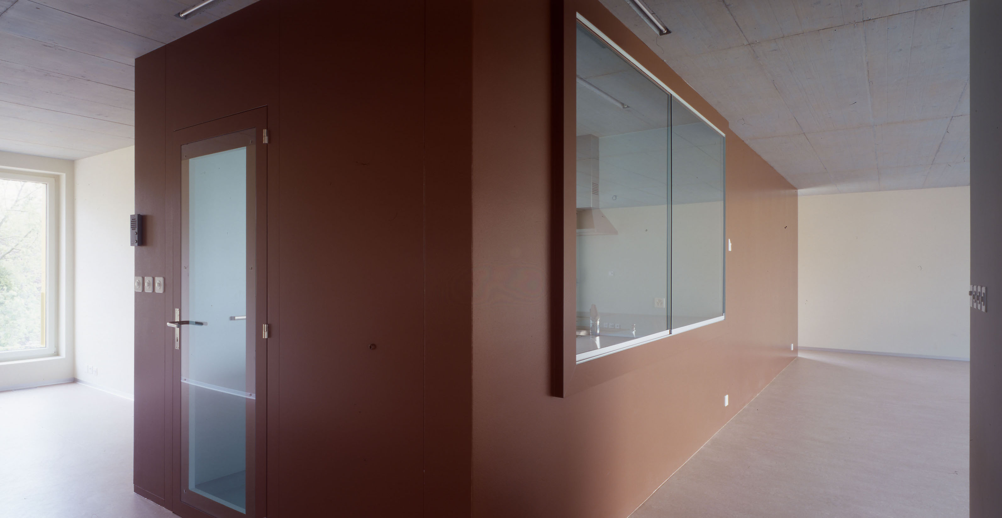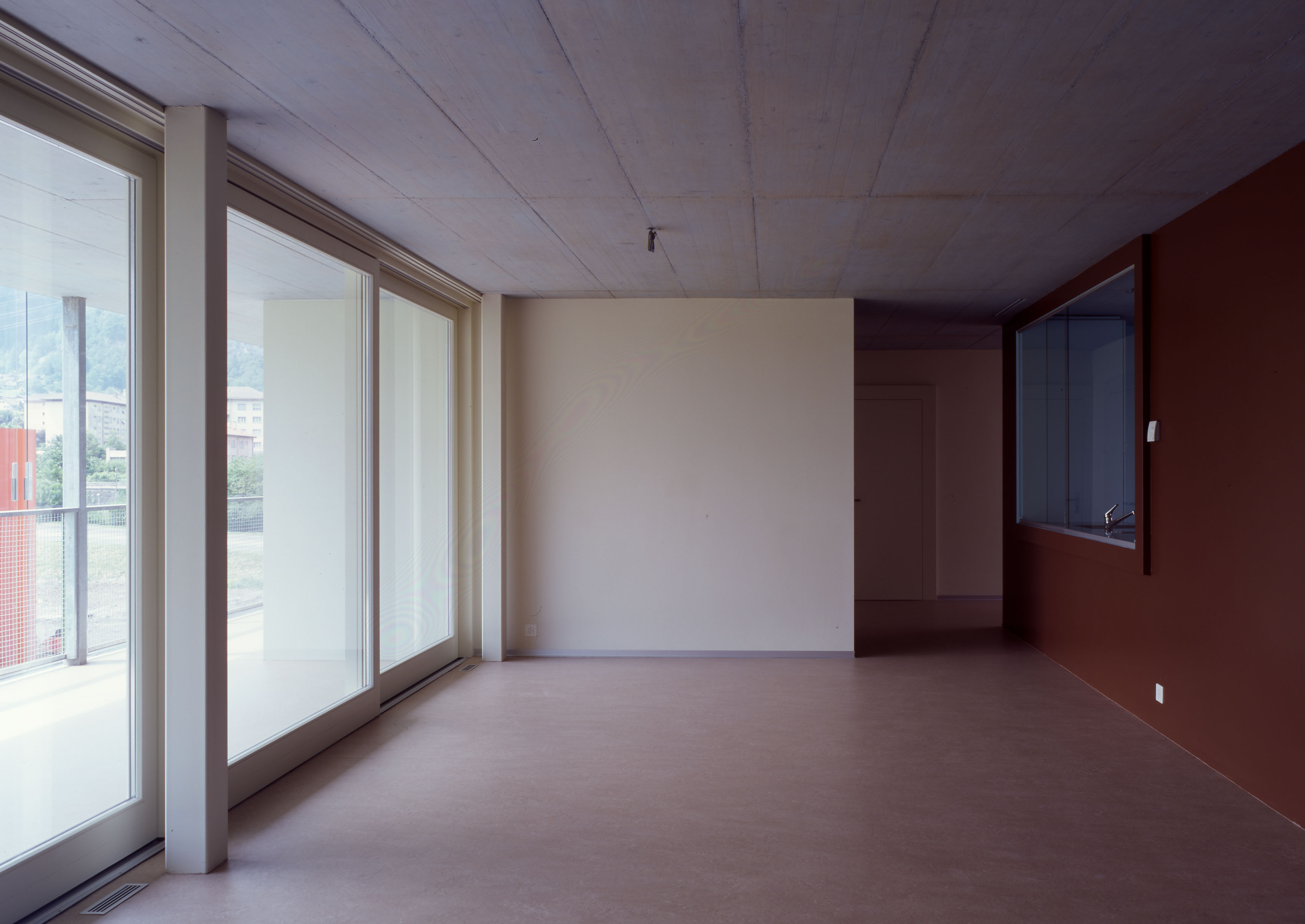 Les bâtiments plots présentent trois façades, Est, Nord et Ouest, aux grandes fenêtres ponctuelles, bardées de tôle d’aluminium ondulée, et d’une façade Sud largement ouverte sur des balcons vérandas, protégés d’une peau en verre. Cette modénature contrastée répond à la contrainte climatique du lieu, avec une dominance de précipitations côté nord et un fort vent côté sud. Le court ensoleillement, en hiver, a influencé le choix de teintes affirmées. La lumière est captée sur les verres de la double peau.
