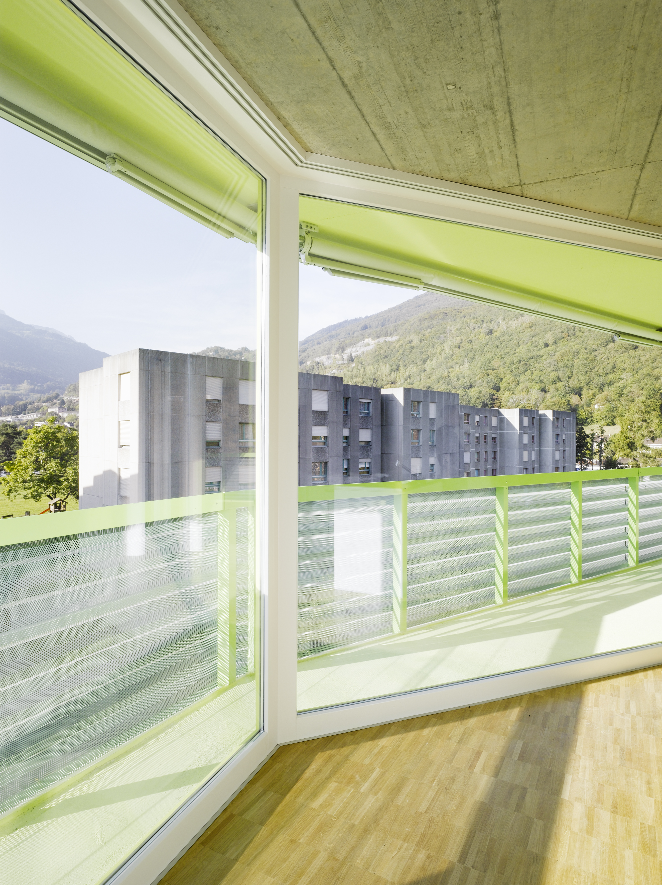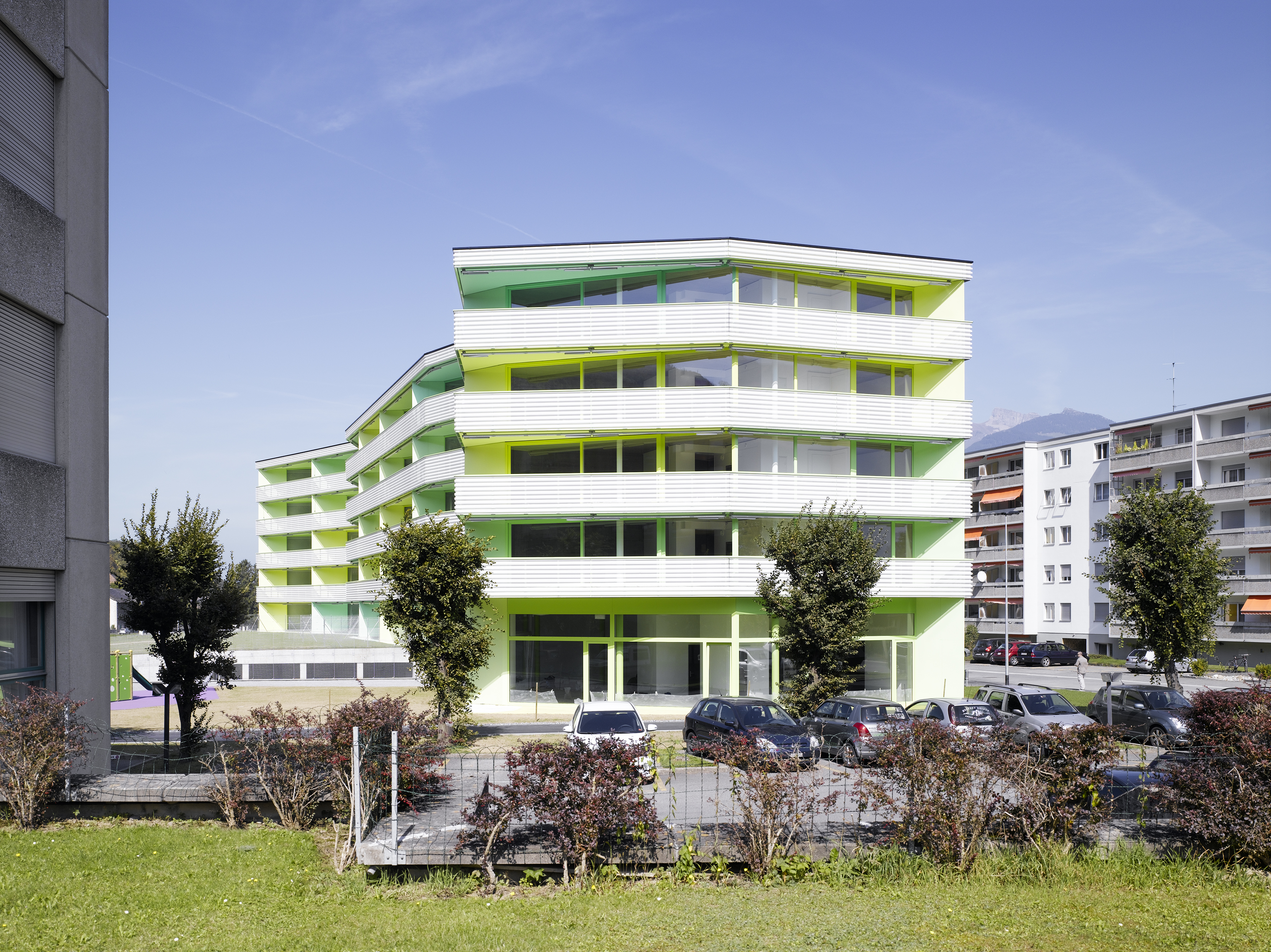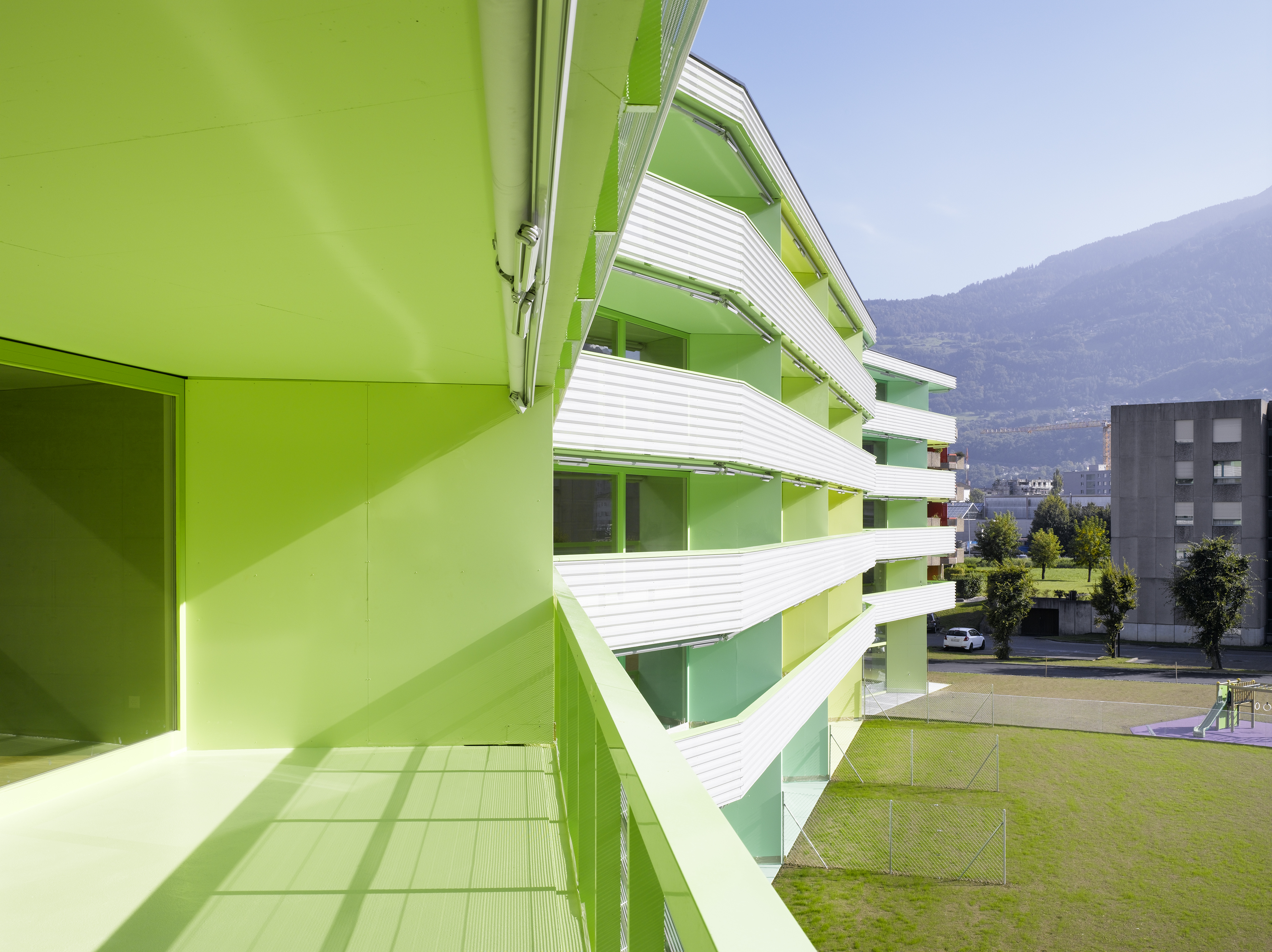 L’immeuble de logements collectifs est situé en périphérique de la ville, dans un contexte sans qualité urbanistique. Par ce fait, l’immeuble cherche à développer une relation au grand paysage. Sa morphologie particulière lui confère une identité propre. Côté chemin des Dailles, l’alignement est animé par une séquence des lignes brisées au rythme régulier. Côté jardin, le plissé est amplifié pour donner un mouvement concave et orienté la façade ouest en direction des Dents du Midi, chaînon montagneux caractéristique du Chablais valaisan.