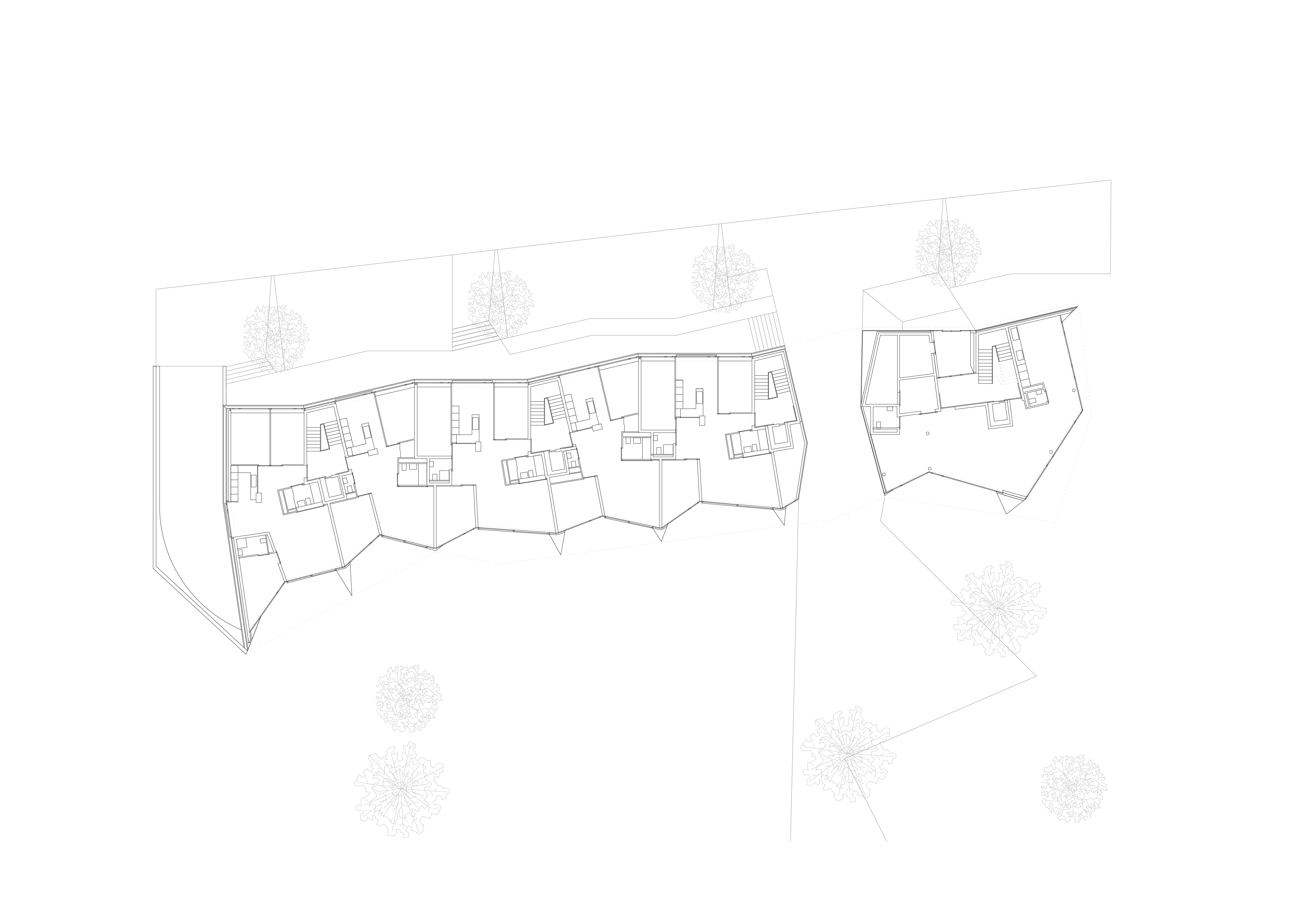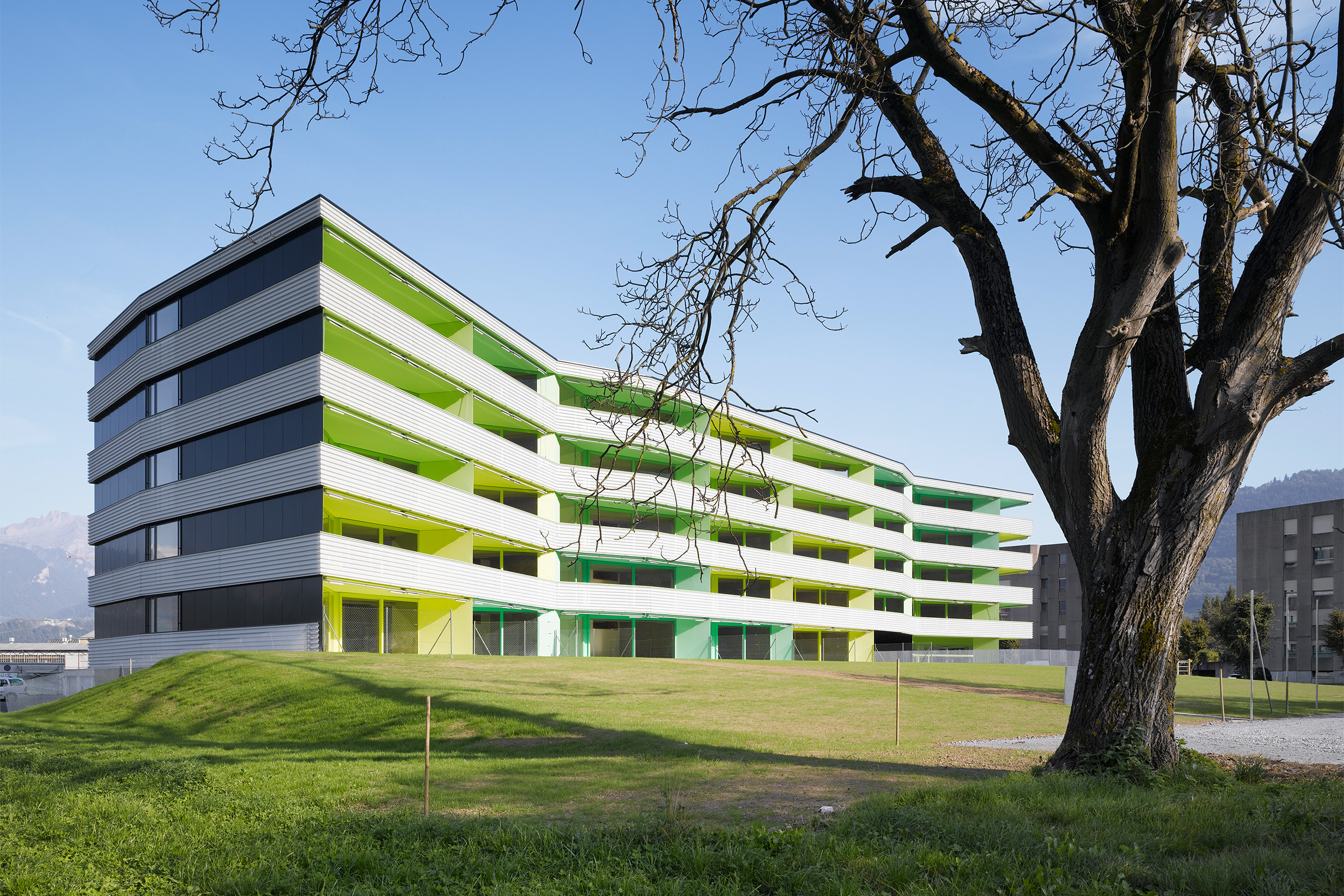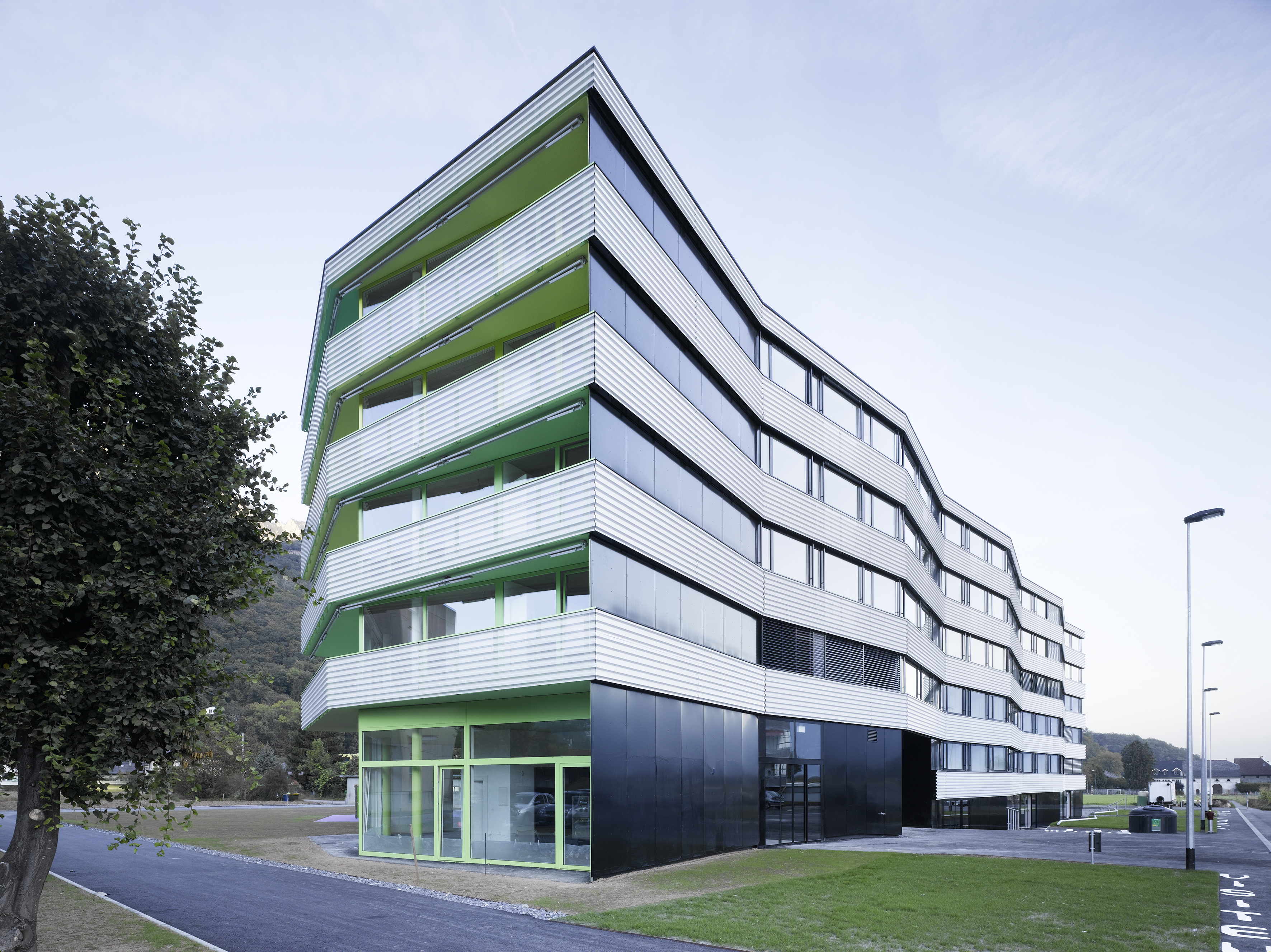 L’immeuble de logements collectifs est situé en périphérique de la ville, dans un contexte sans qualité urbanistique. Par ce fait, l’immeuble cherche à développer une relation au grand paysage. Sa morphologie particulière lui confère une identité propre. Côté chemin des Dailles, l’alignement est animé par une séquence des lignes brisées au rythme régulier. Côté jardin, le plissé est amplifié pour donner un mouvement concave et orienté la façade ouest en direction des Dents du Midi, chaînon montagneux caractéristique du Chablais valaisan.