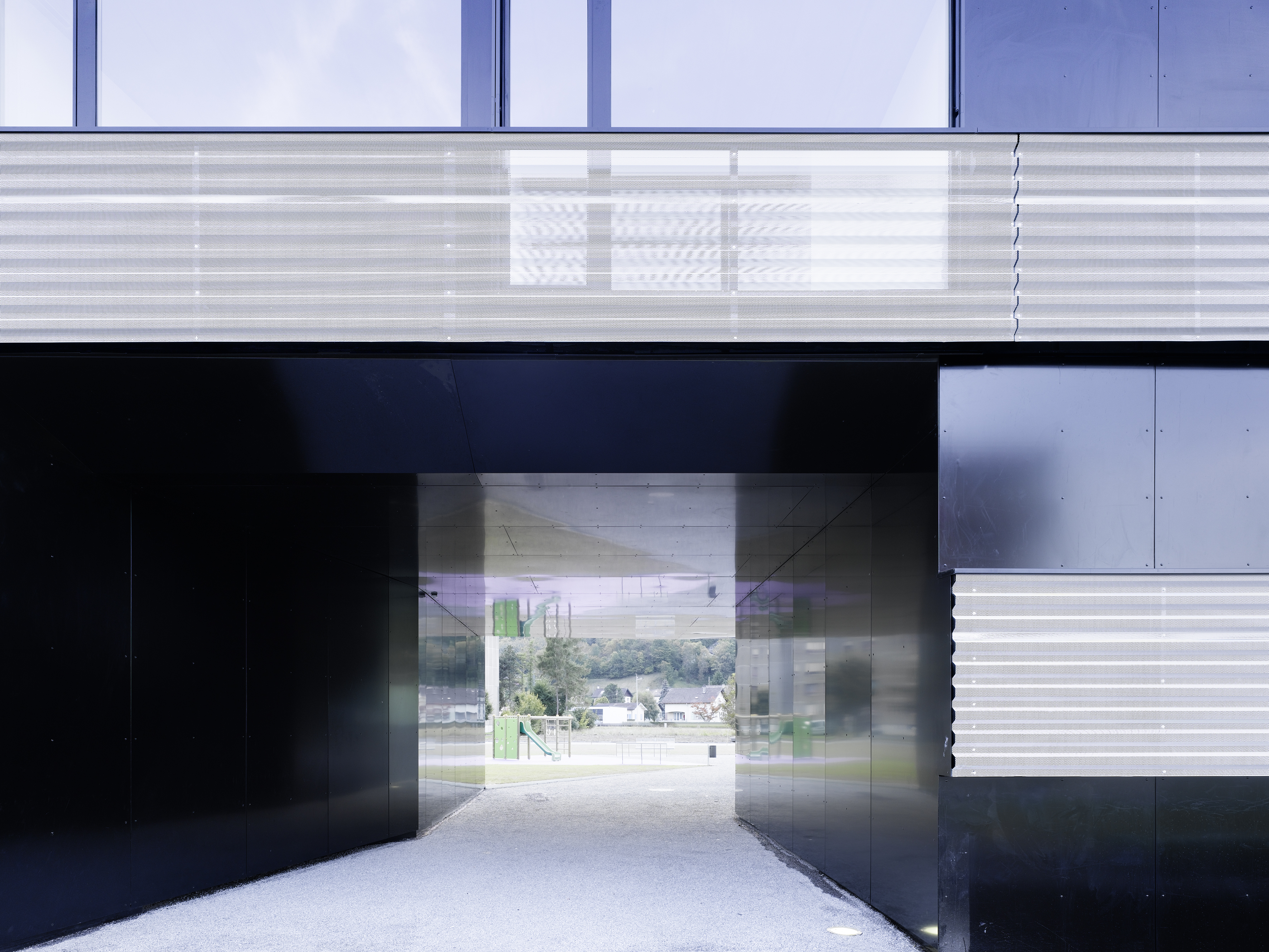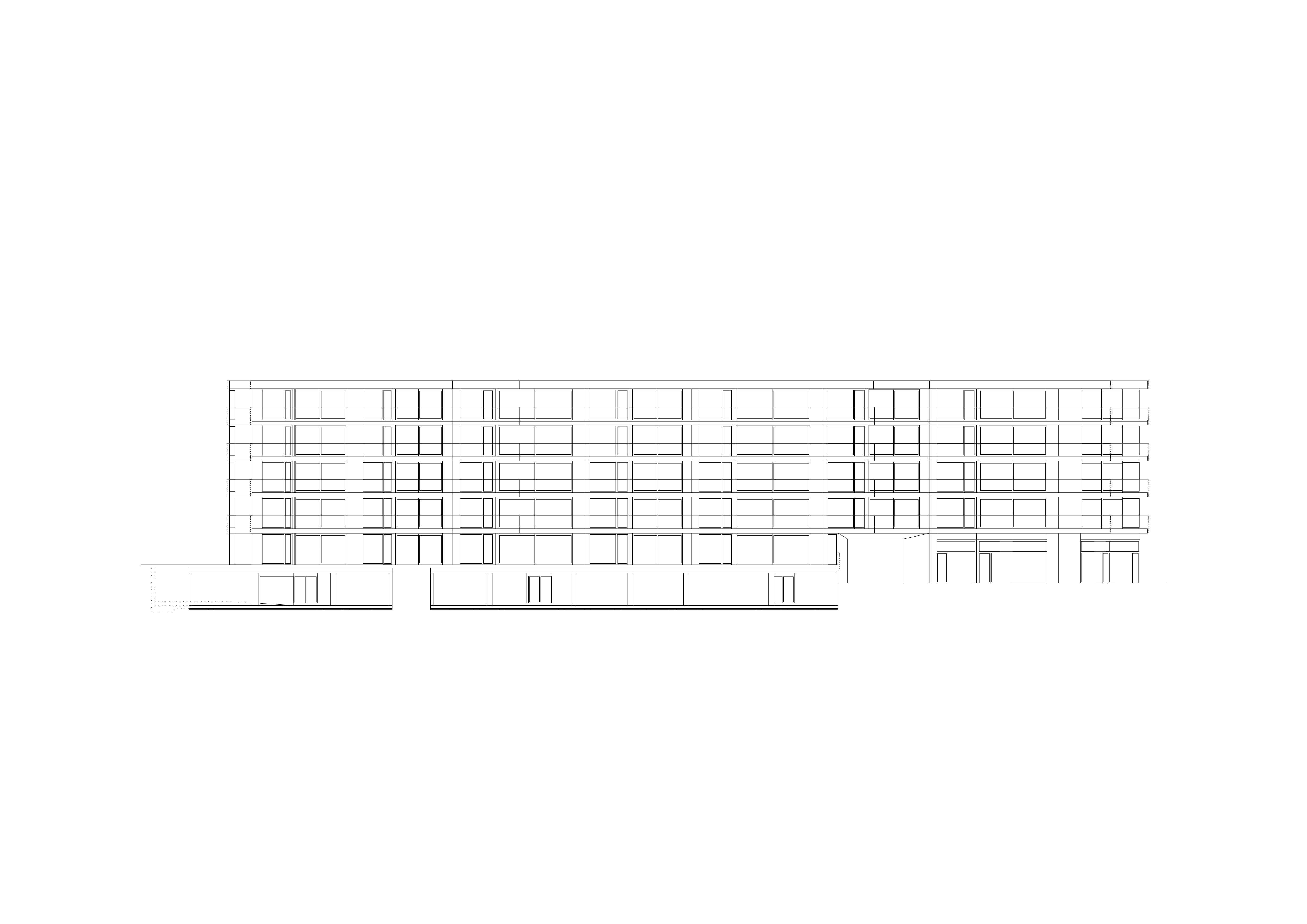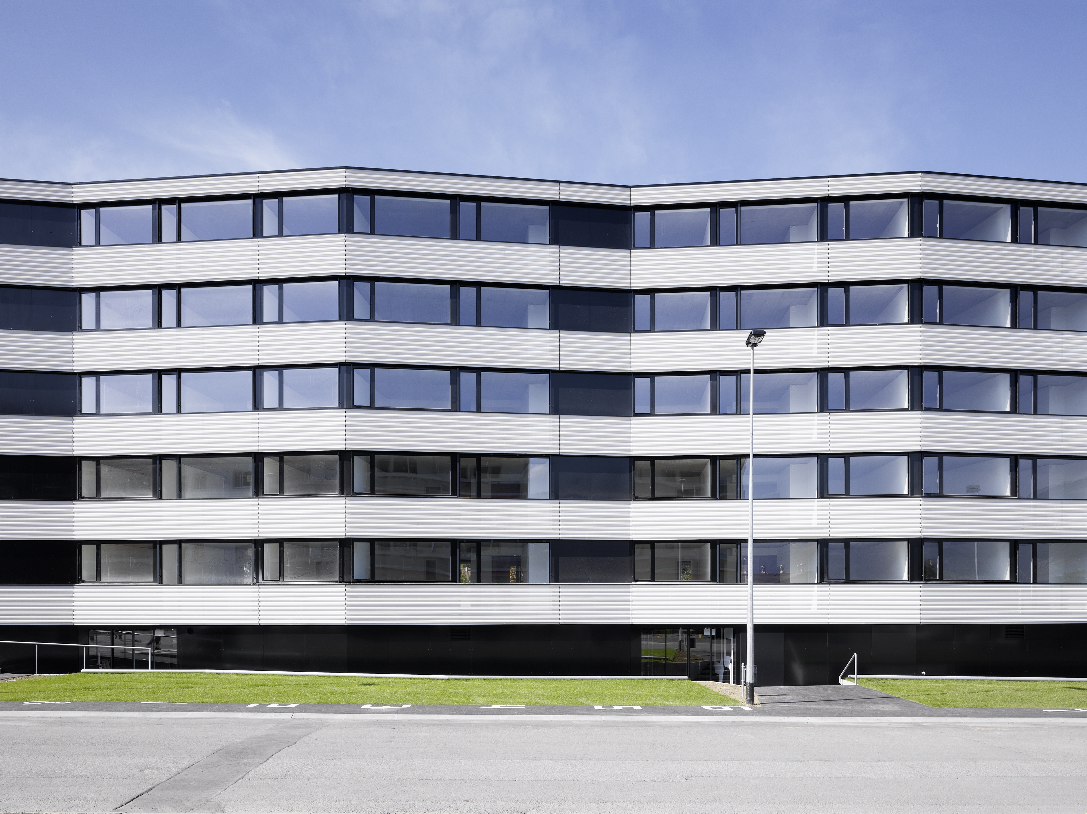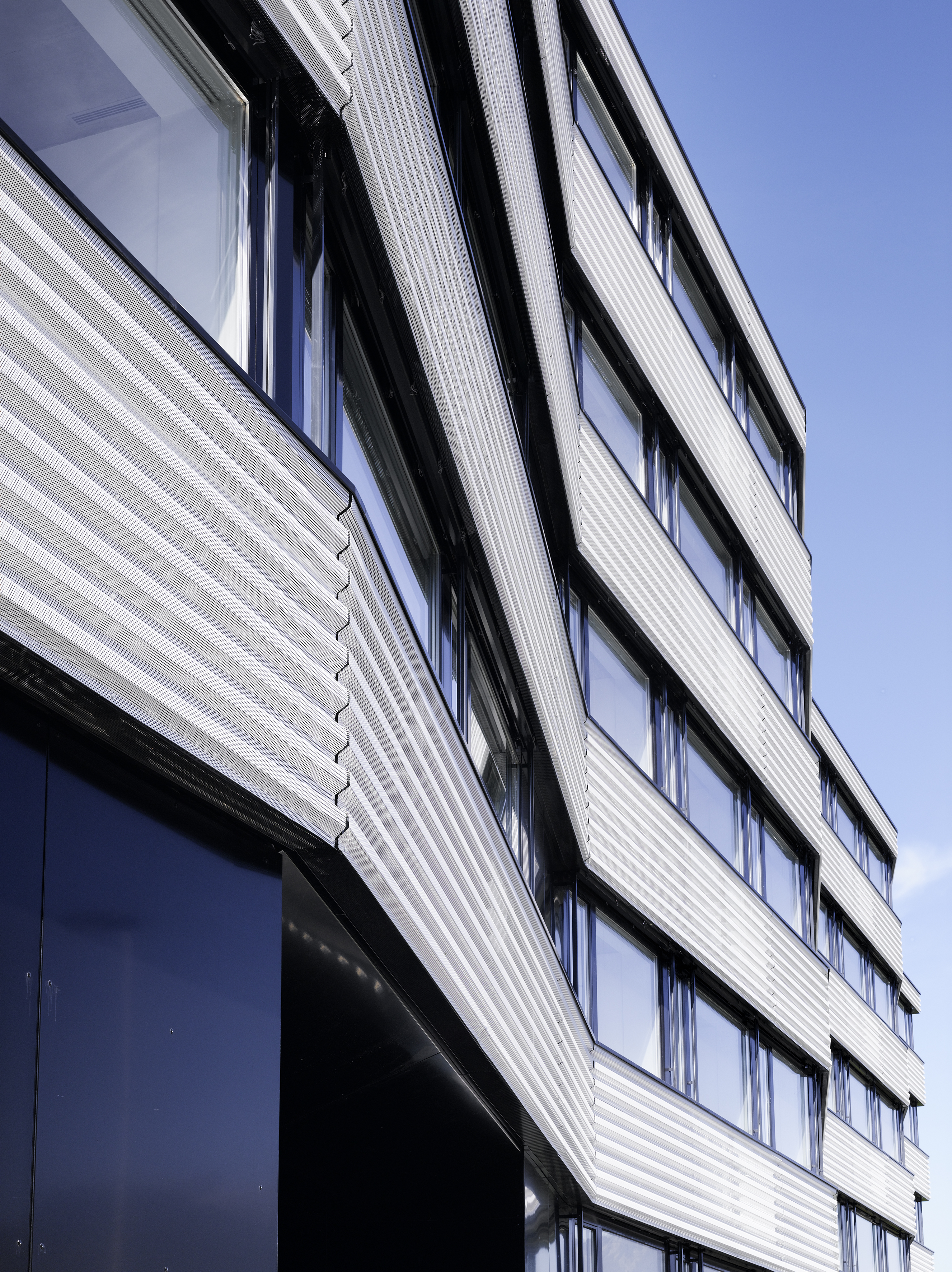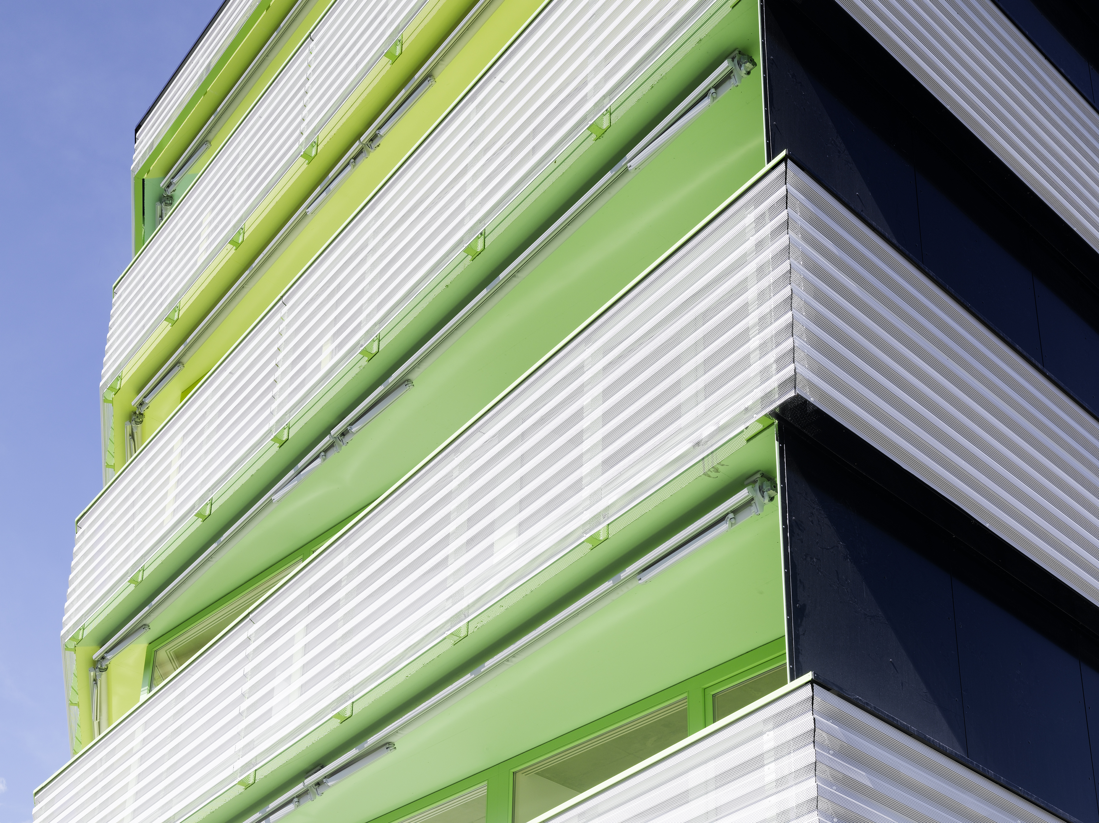 L’expression des façades se réfère à l’imagerie du paquebot, avec une prédominance donnée à l’horizontalité et à l’alternance des bandeaux des parapets et des vitrages en bandes. Les contrecoeurs courant sur le pourtour de l’immeuble sont en bardage métallique blanc, perforé au profil trapézoïdal posé horizontalement, formant un filtre jouant des transparences face aux balcons et aux fenêtres à la française. L’alternance blanc noir réserve une surprise côté jardin, les vitrages en bandes laissant place à des balcons profonds traités en niches déclinées en trois tons de vert. L’immeuble de cinq niveaux offre 37 appartements traversant distribué par quatre cages d’escalier. Une salle commune est disposée au rez-de-chaussée, orientée sur la place de jeux.