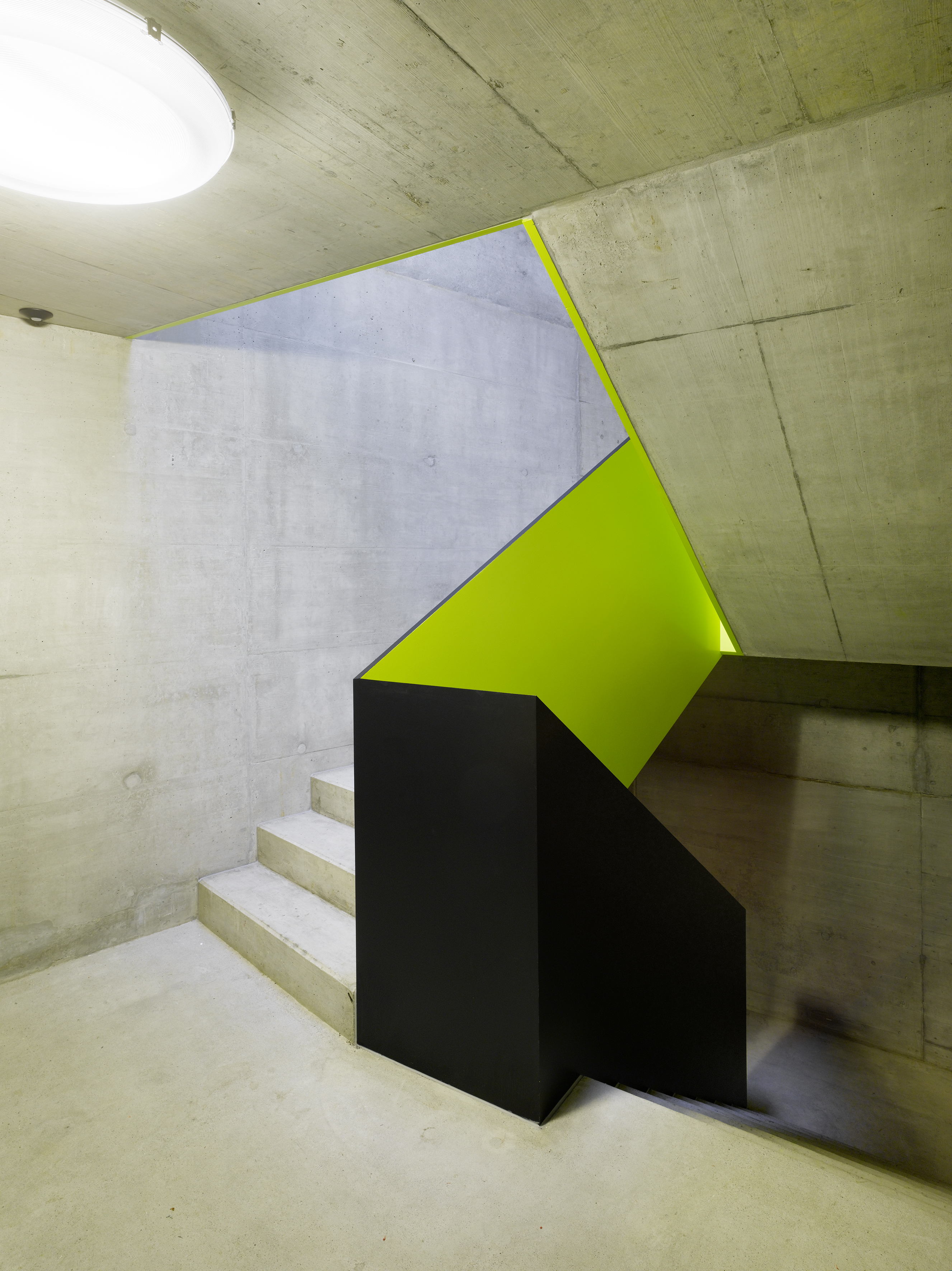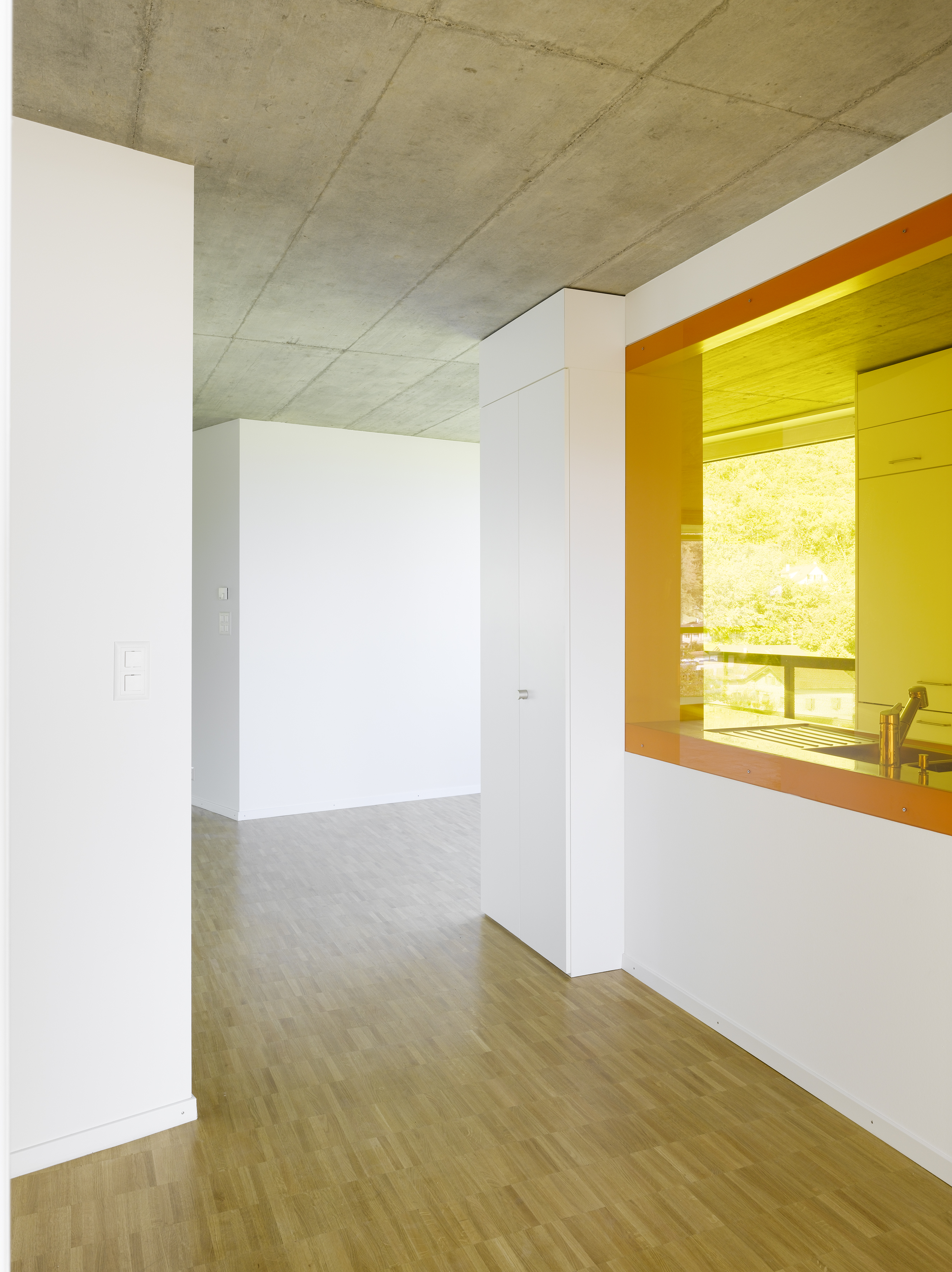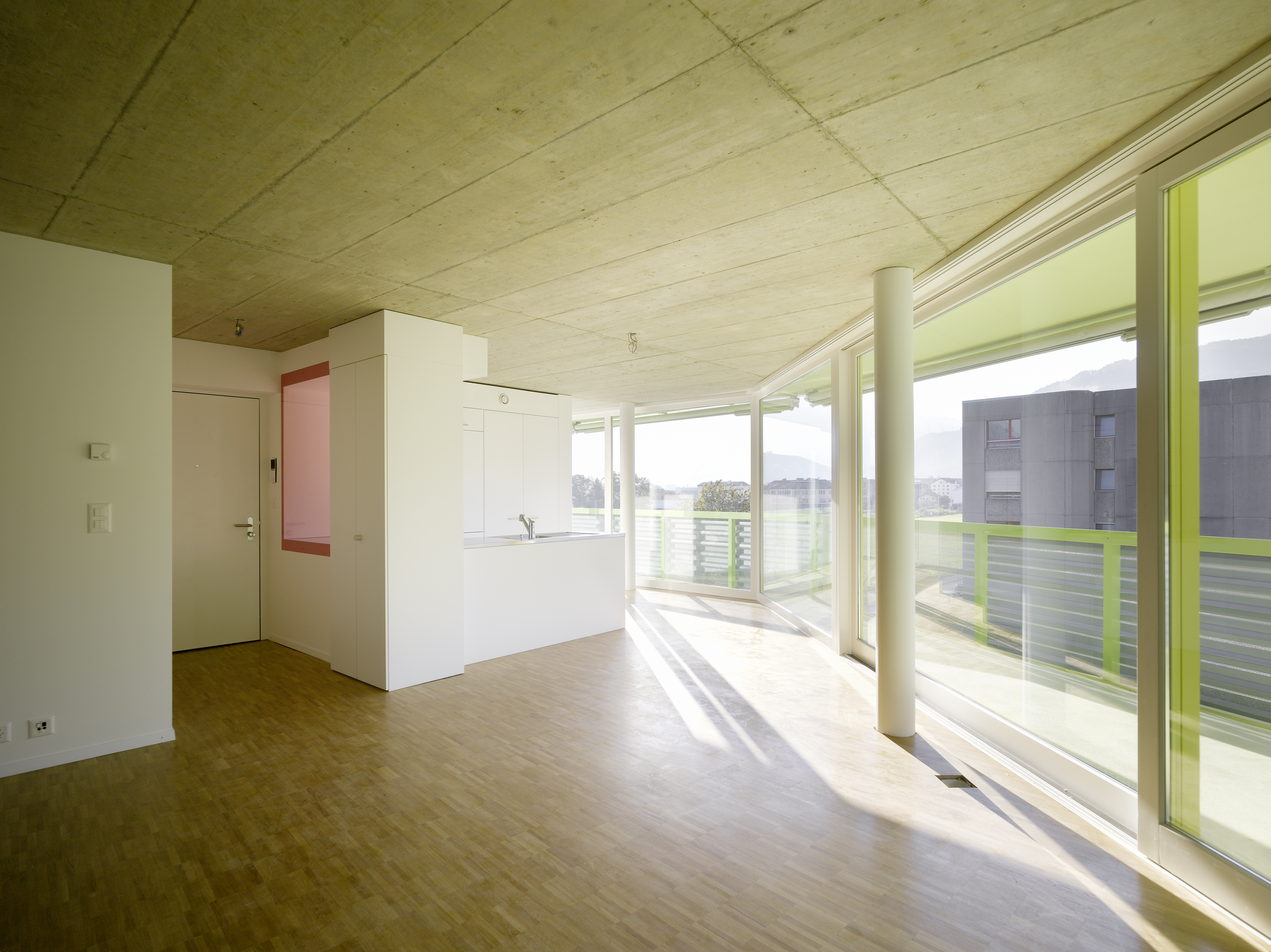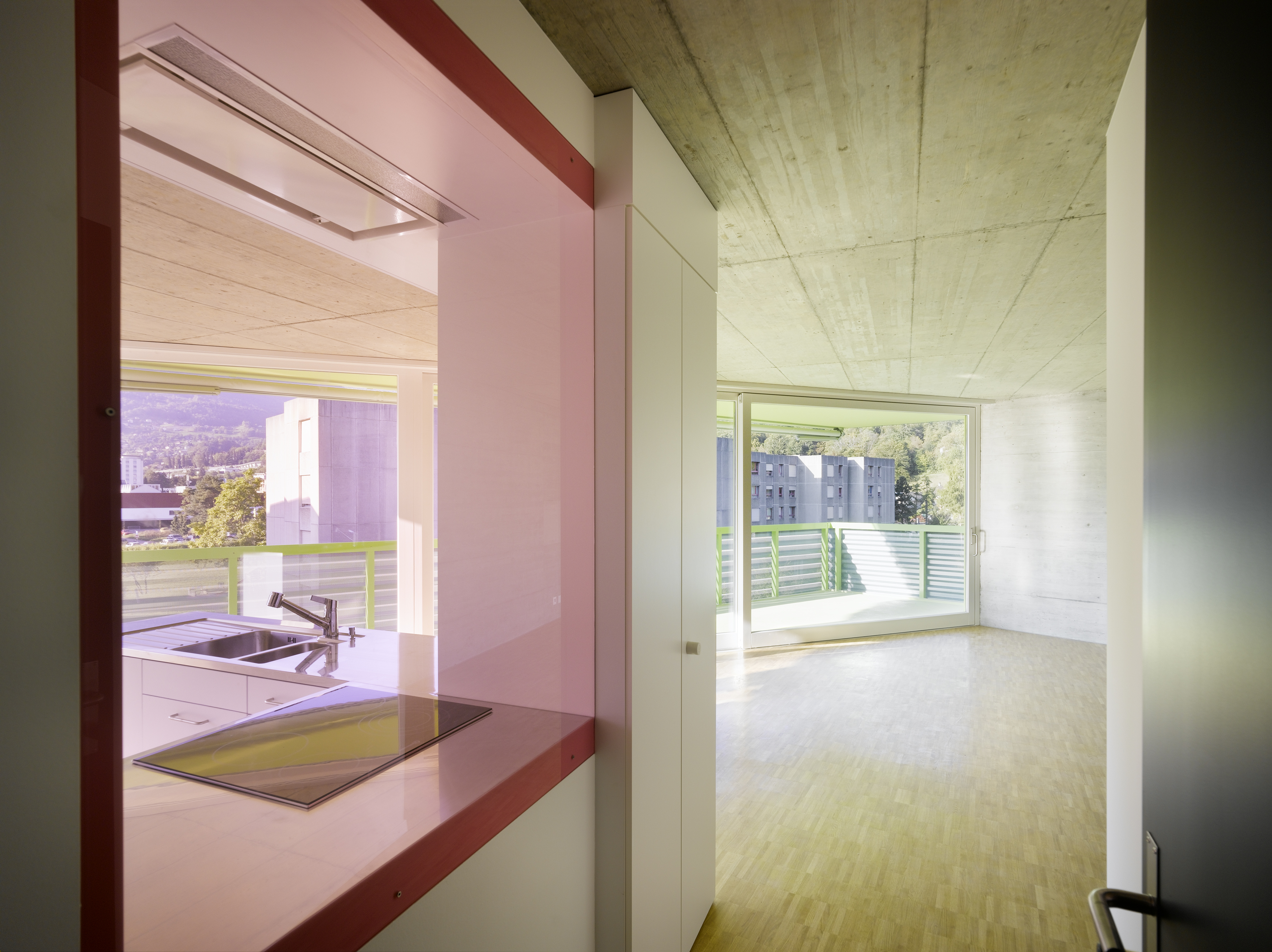 Le plan type suit un tracé régulateur précis tout en intégrant la géométrie dictée par les choix morphologiques. Les cages d’escalier en trapèze répondent au plissé sur rue. Les chambres sur rue ou sur jardin restent principalement orthogonales, alors que les séjours s’adaptent aux lignes des balcons, offrant un espace jour traversant en baïonnette d’est en ouest. La matérialité intérieure révèle la structure en béton qui reste apparent dans les cages d’escalier, en plafond et en murs mitoyens des appartements. Des verres teintés dans la cuisine et la salle de bain colorent l’ambiance lumineuse des logements.