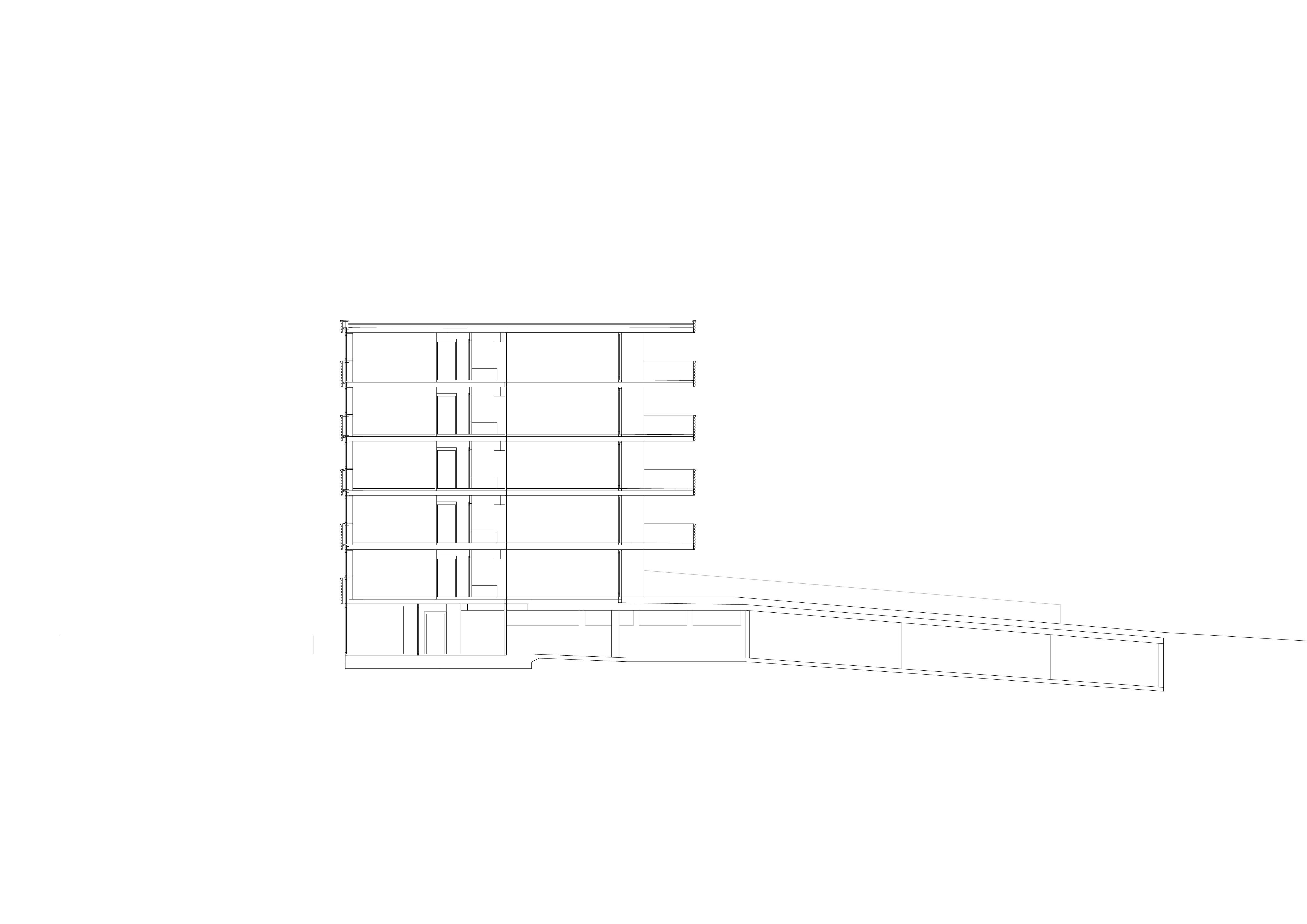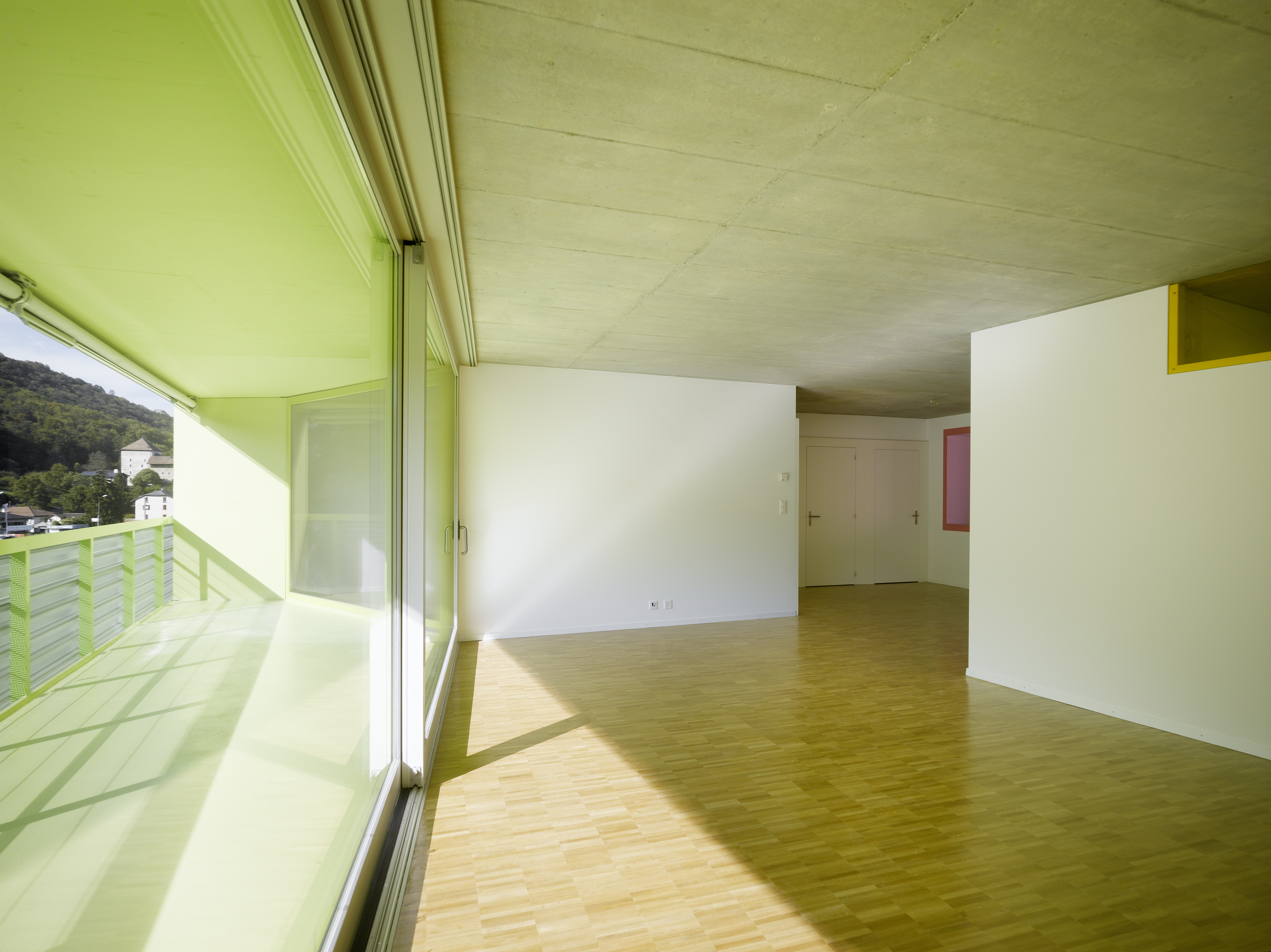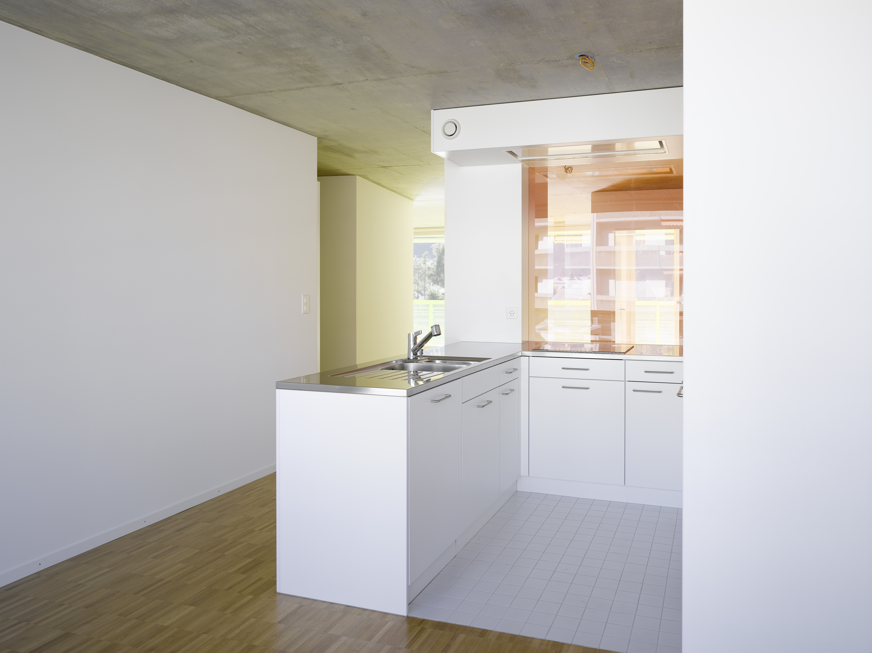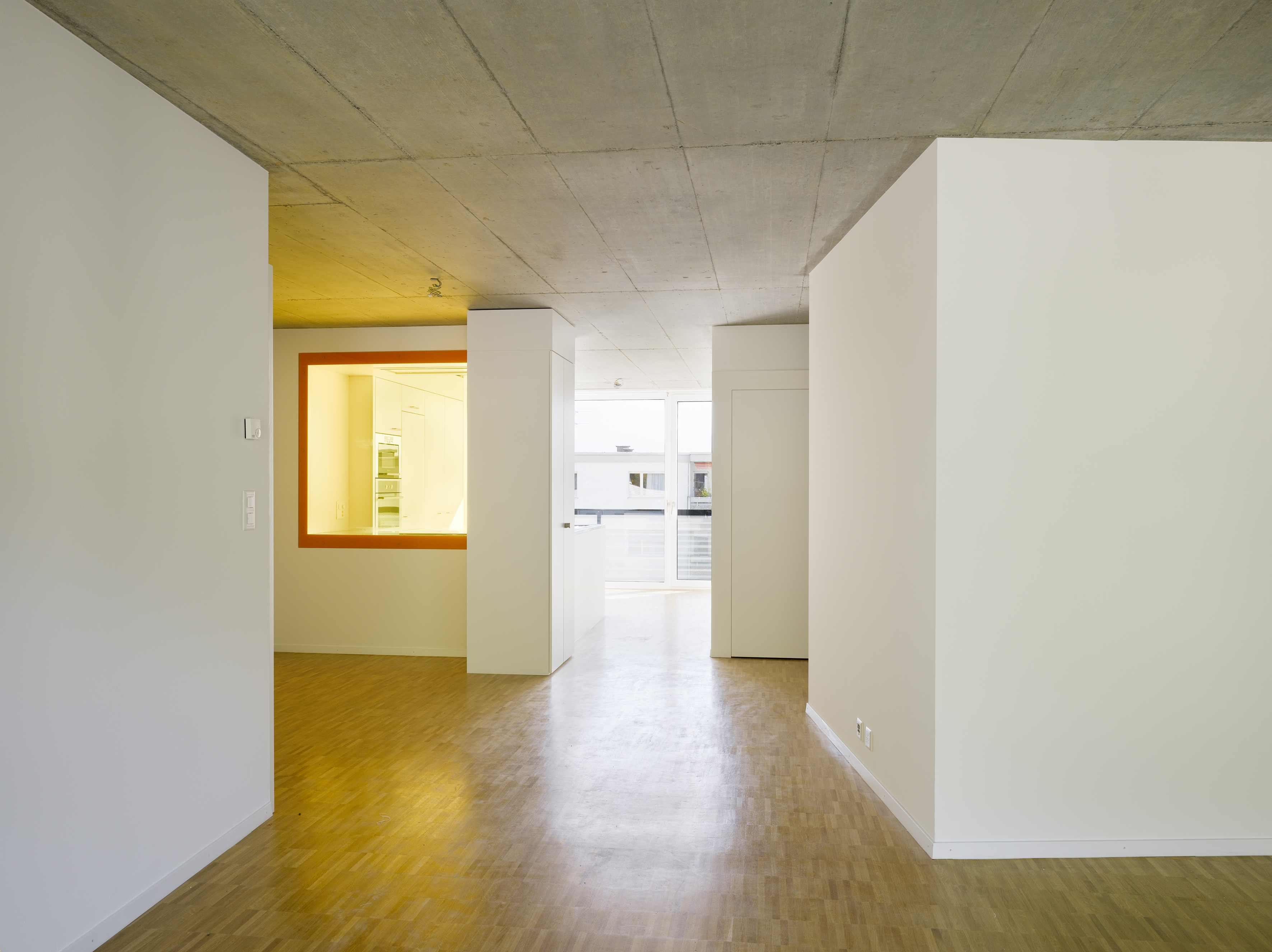 Le plan type suit un tracé régulateur précis tout en intégrant la géométrie dictée par les choix morphologiques. Les cages d’escalier en trapèze répondent au plissé sur rue. Les chambres sur rue ou sur jardin restent principalement orthogonales, alors que les séjours s’adaptent aux lignes des balcons, offrant un espace jour traversant en baïonnette d’est en ouest. La matérialité intérieure révèle la structure en béton qui reste apparent dans les cages d’escalier, en plafond et en murs mitoyens des appartements. Des verres teintés dans la cuisine et la salle de bain colorent l’ambiance lumineuse des logements.