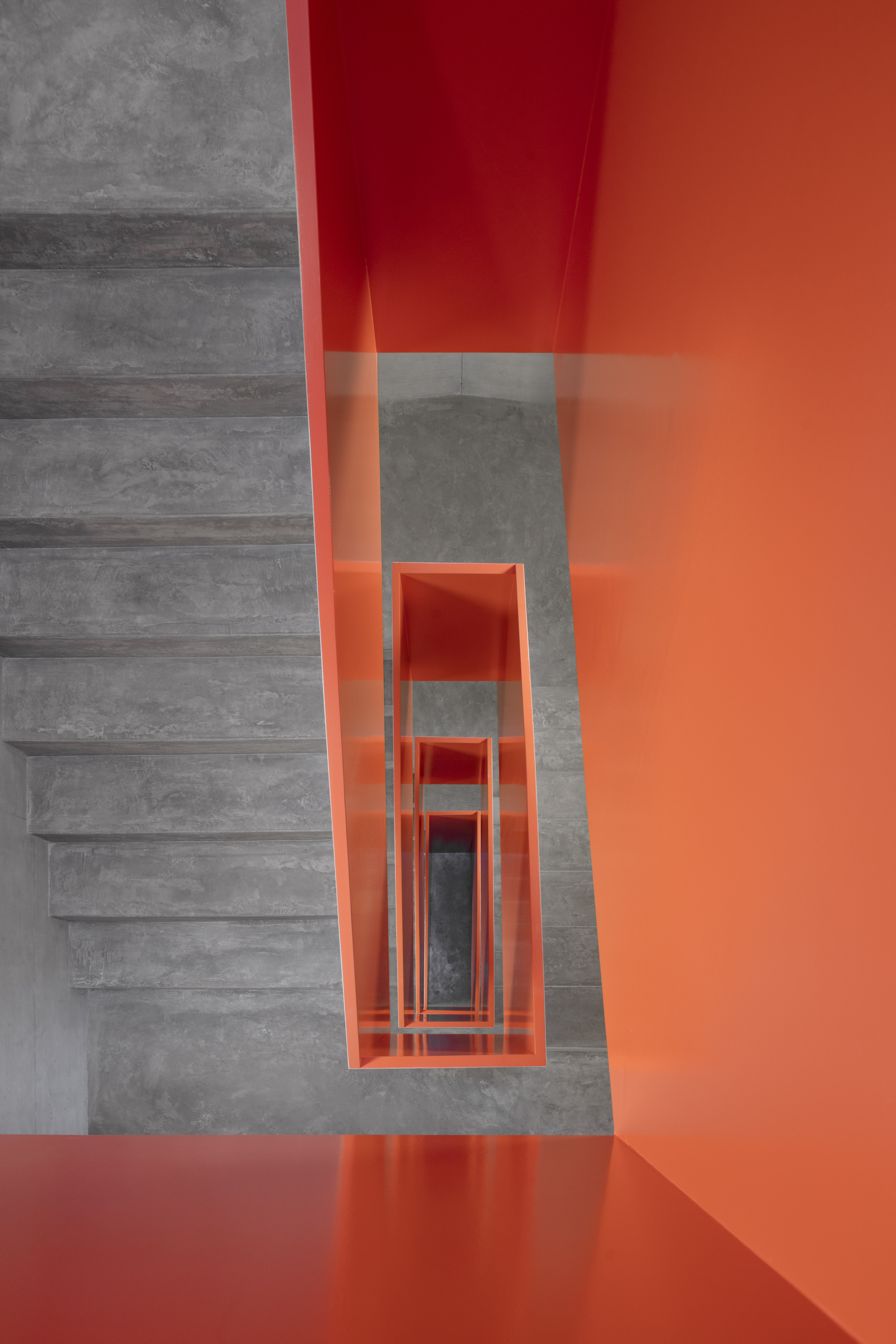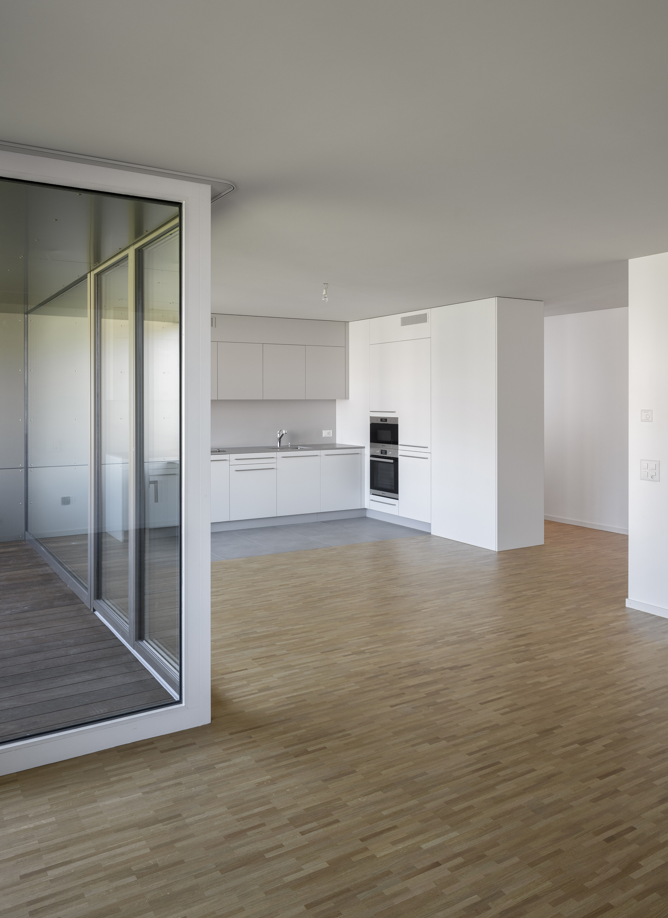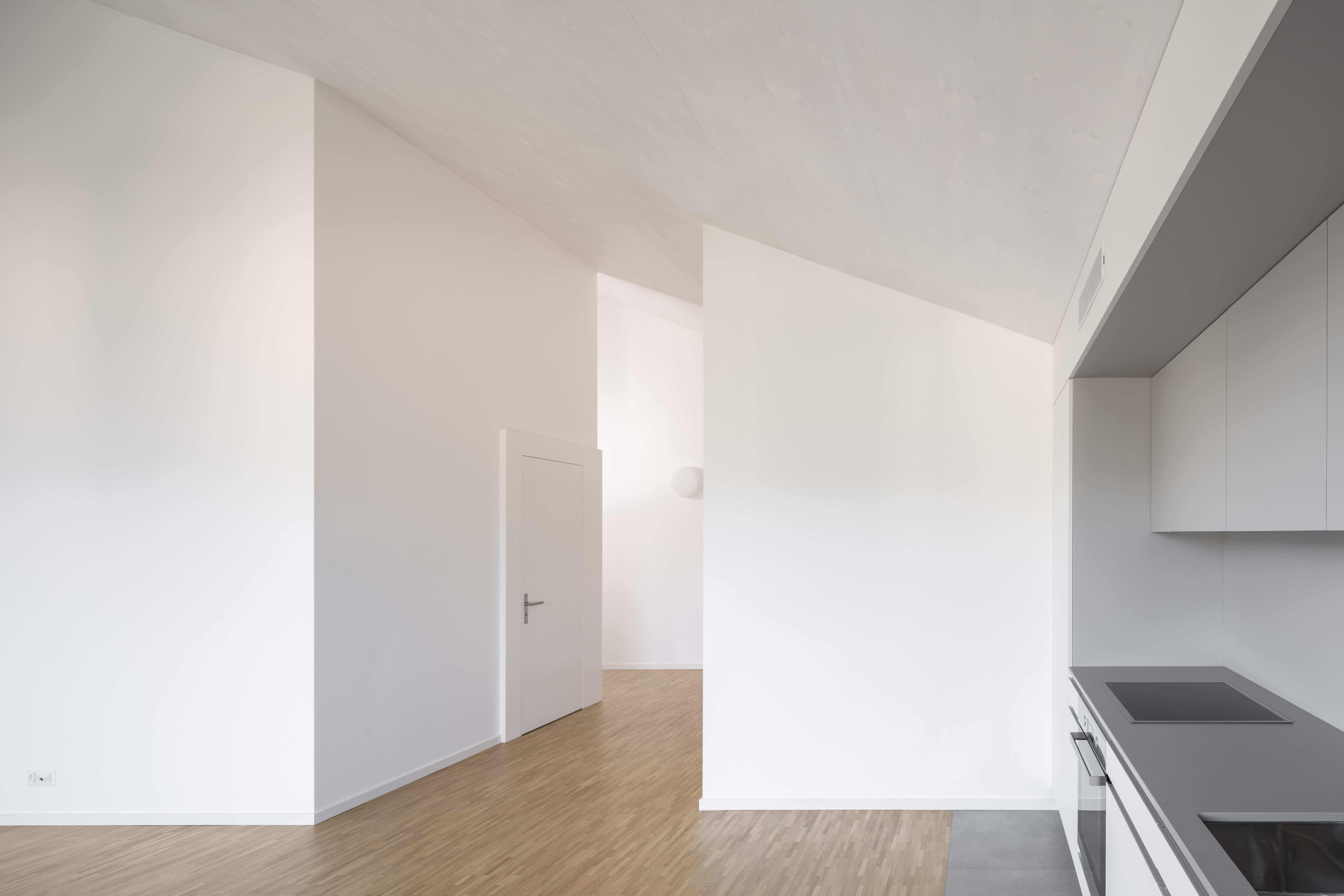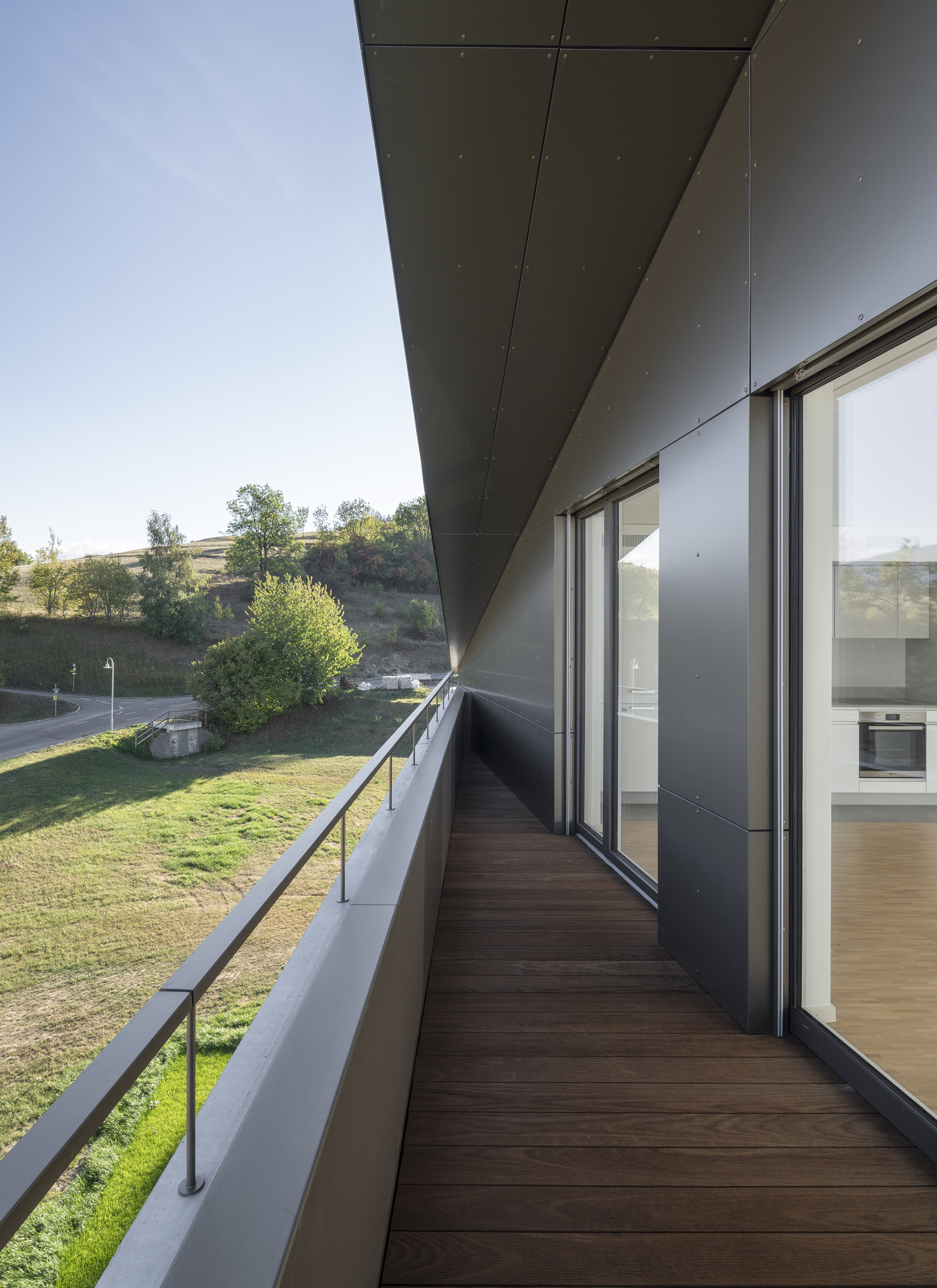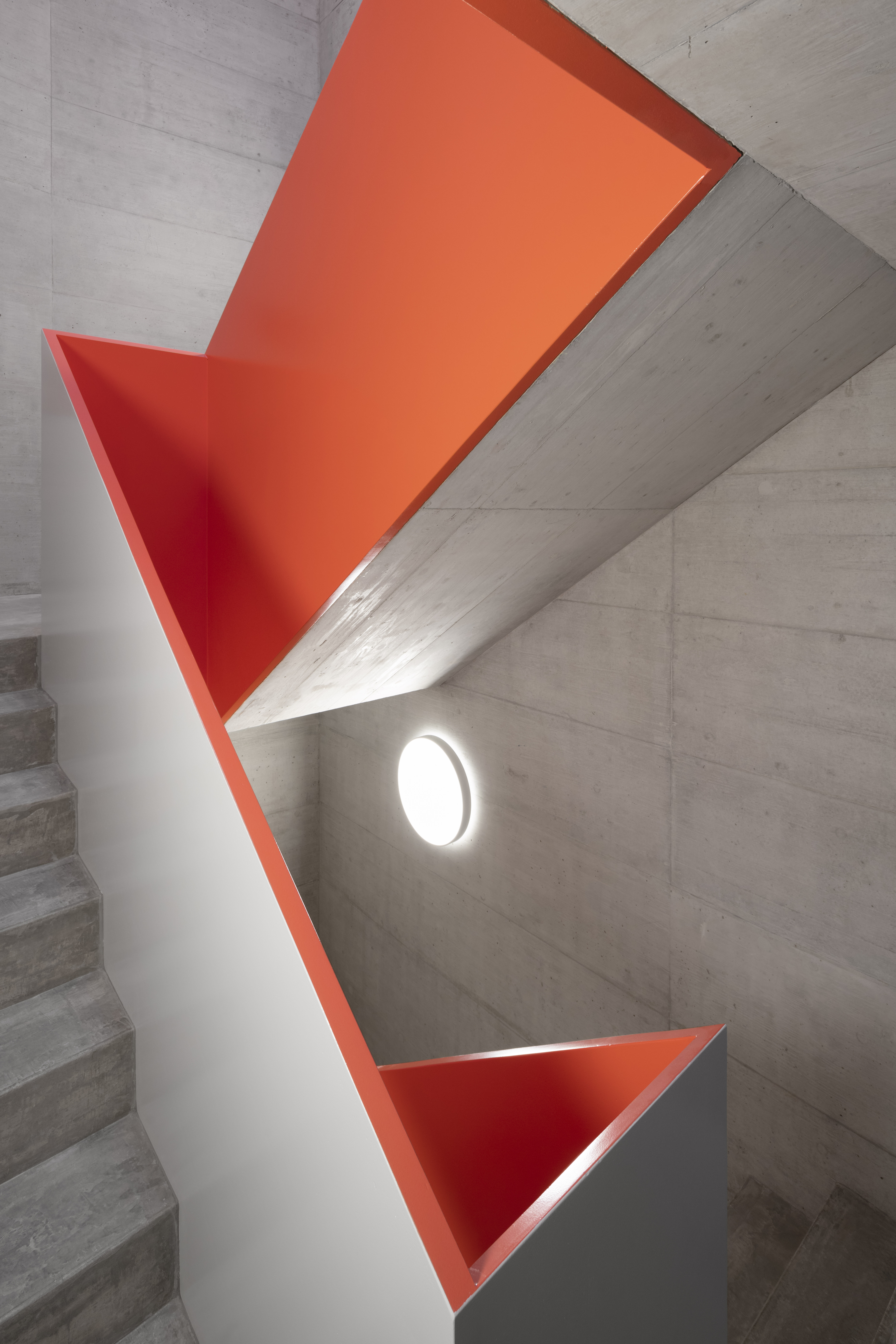 L’étage type offre trois appartements, alors que le comble reçoit deux appartements profitant de la spatialité de la toiture en pente. Les appartements 3 pièces profitent des trois orientations. Ils jouissent de prolongements extérieurs sous forme de loggia d’angle, qui articule l’espace jour de l’appartement. Le béton apparent qualifie les espaces communs, parking et cage d’escalier. La matière brute, sol, mur et plafond, contraste avec les menuiseries peintes des portes palières et du garde-corps de l’escalier, dont la face intérieure est teintée d’un rouge corail. Une palette de teintes chaudes est déclinée dans les salles de bain, alors que les appartements ont des finitions sobres, en tons de blanc et gris sur parquet chêne.