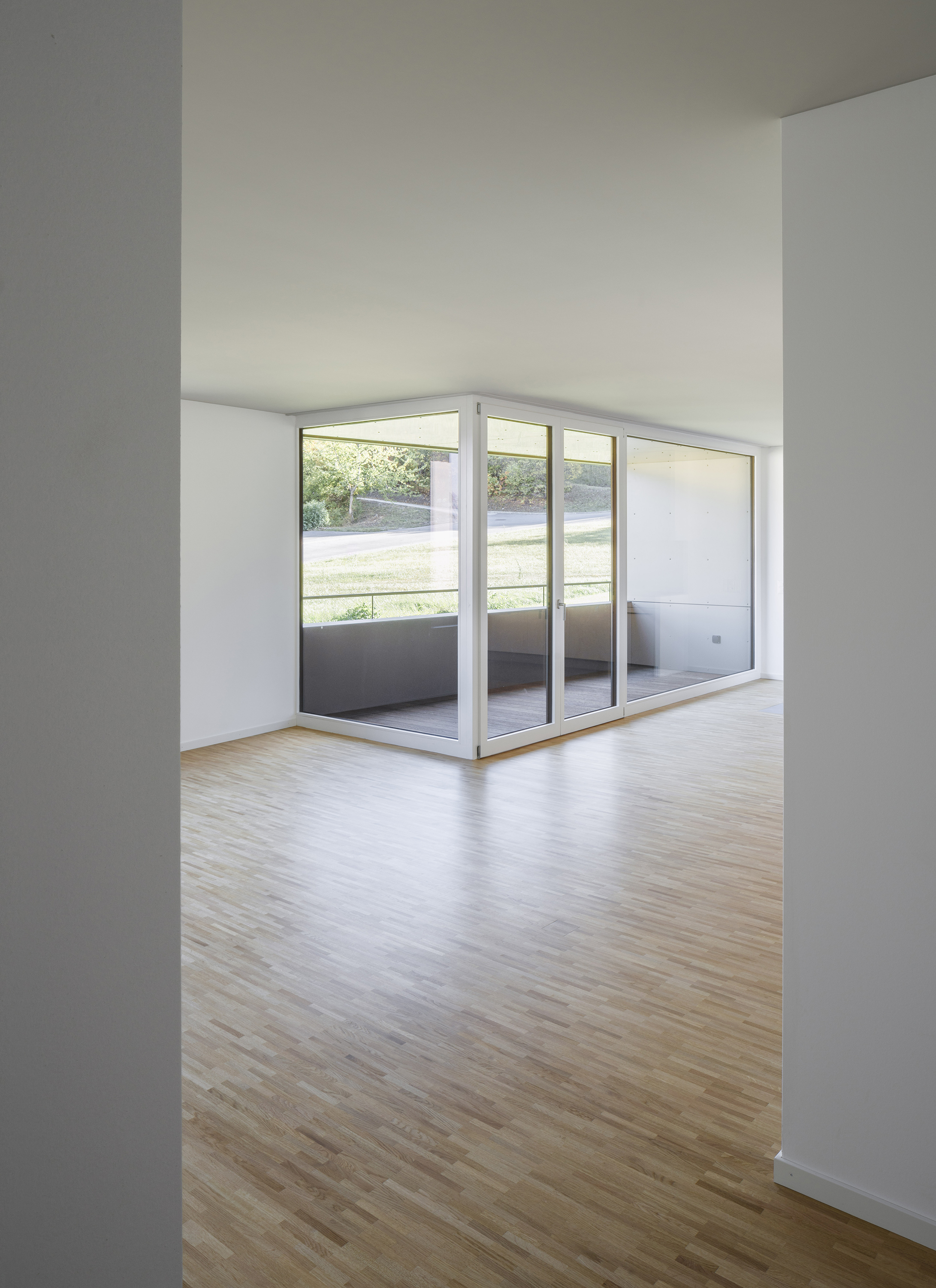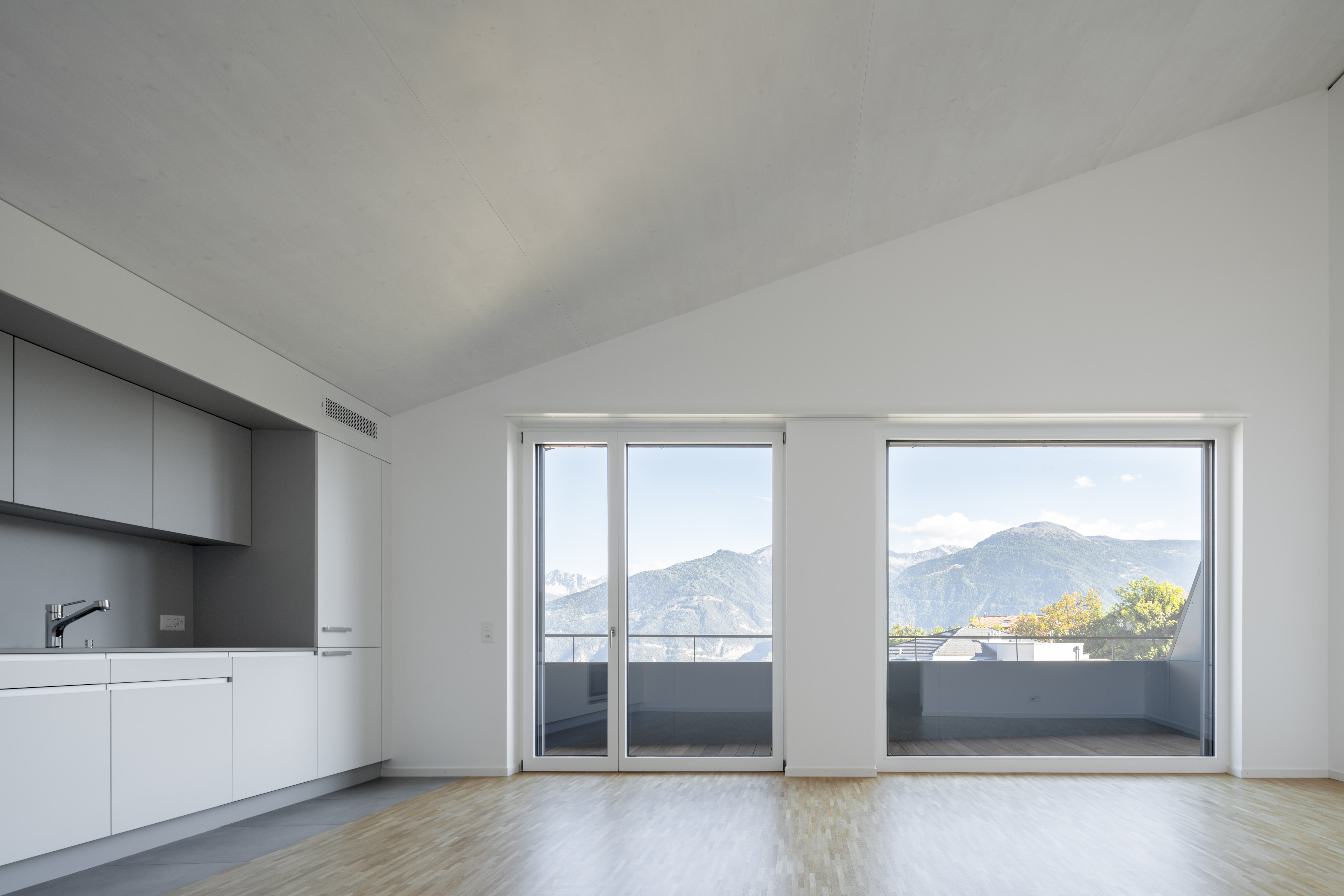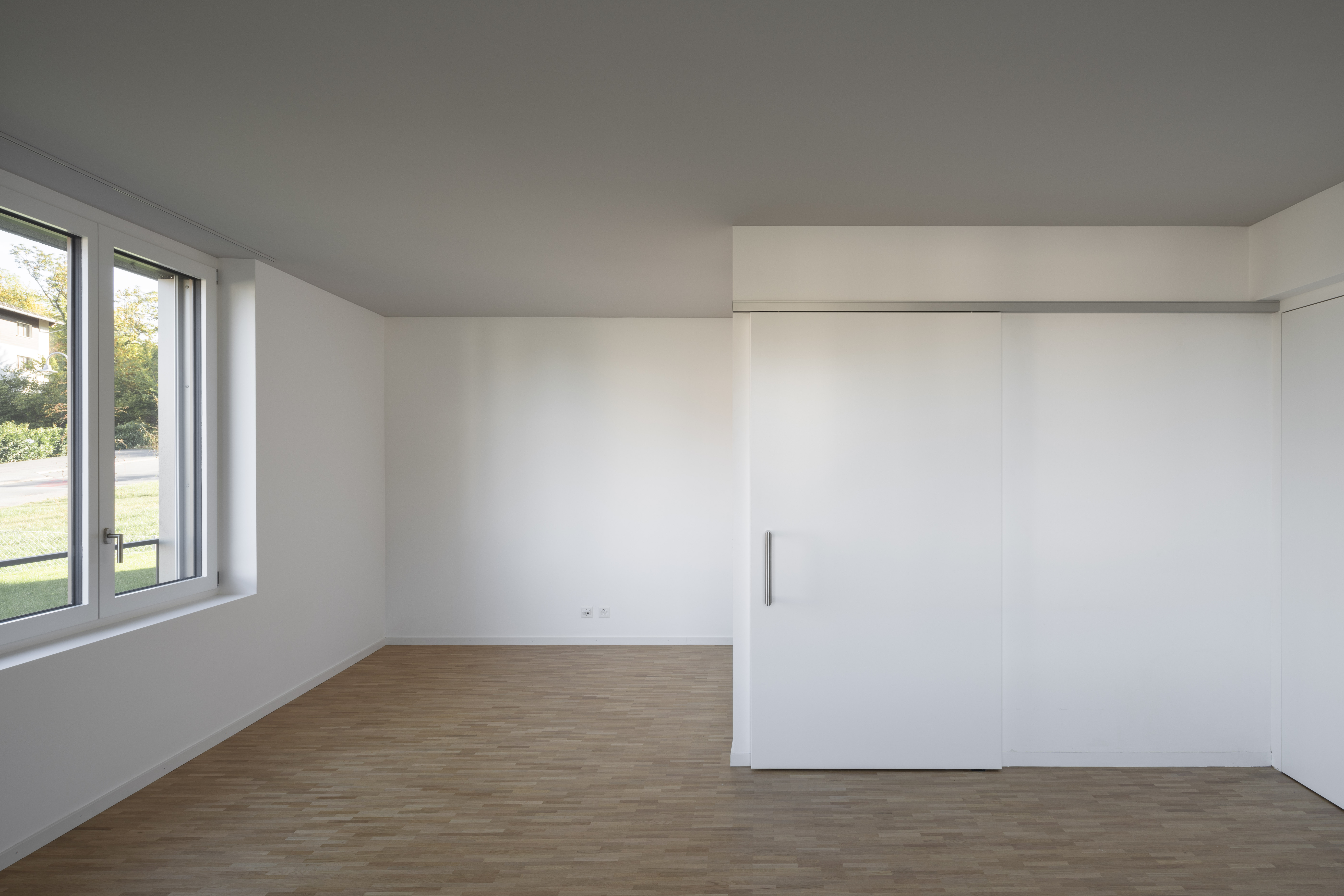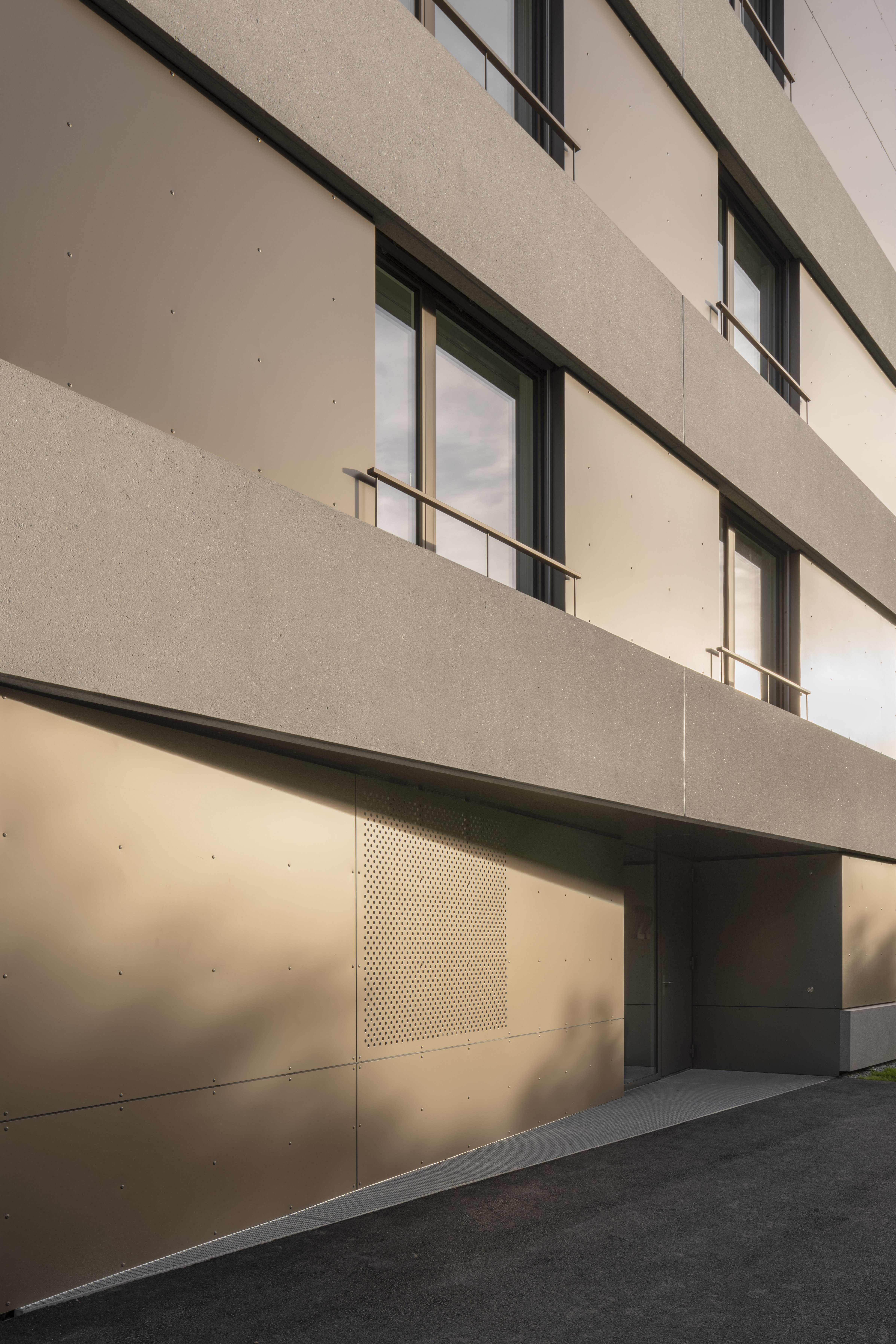 L’étage type offre trois appartements, alors que le comble reçoit deux appartements profitant de la spatialité de la toiture en pente. Les appartements 3 pièces profitent des trois orientations. Ils jouissent de prolongements extérieurs sous forme de loggia d’angle, qui articule l’espace jour de l’appartement. Le béton apparent qualifie les espaces communs, parking et cage d’escalier. La matière brute, sol, mur et plafond, contraste avec les menuiseries peintes des portes palières et du garde-corps de l’escalier, dont la face intérieure est teintée d’un rouge corail. Une palette de teintes chaudes est déclinée dans les salles de bain, alors que les appartements ont des finitions sobres, en tons de blanc et gris sur parquet chêne.