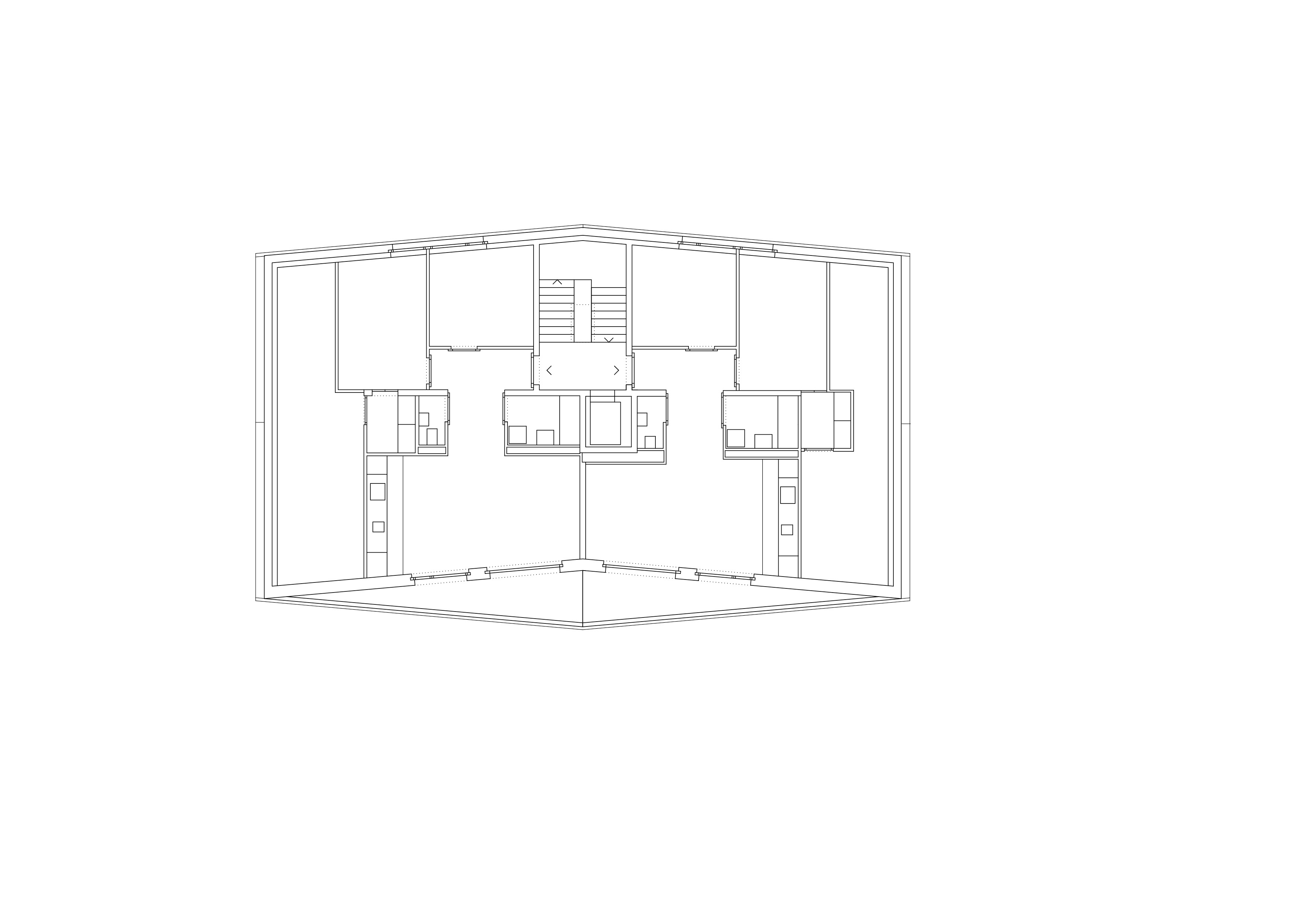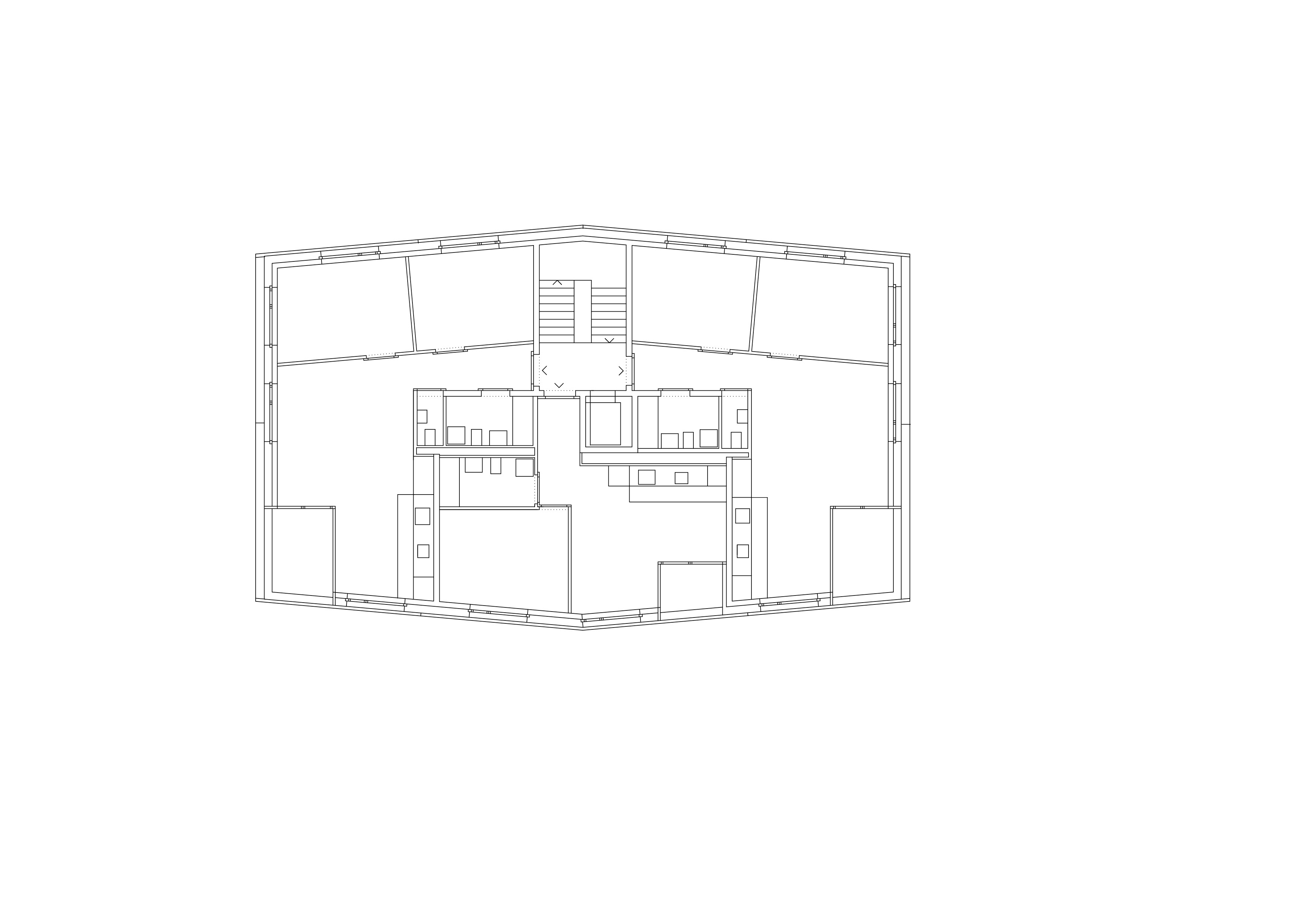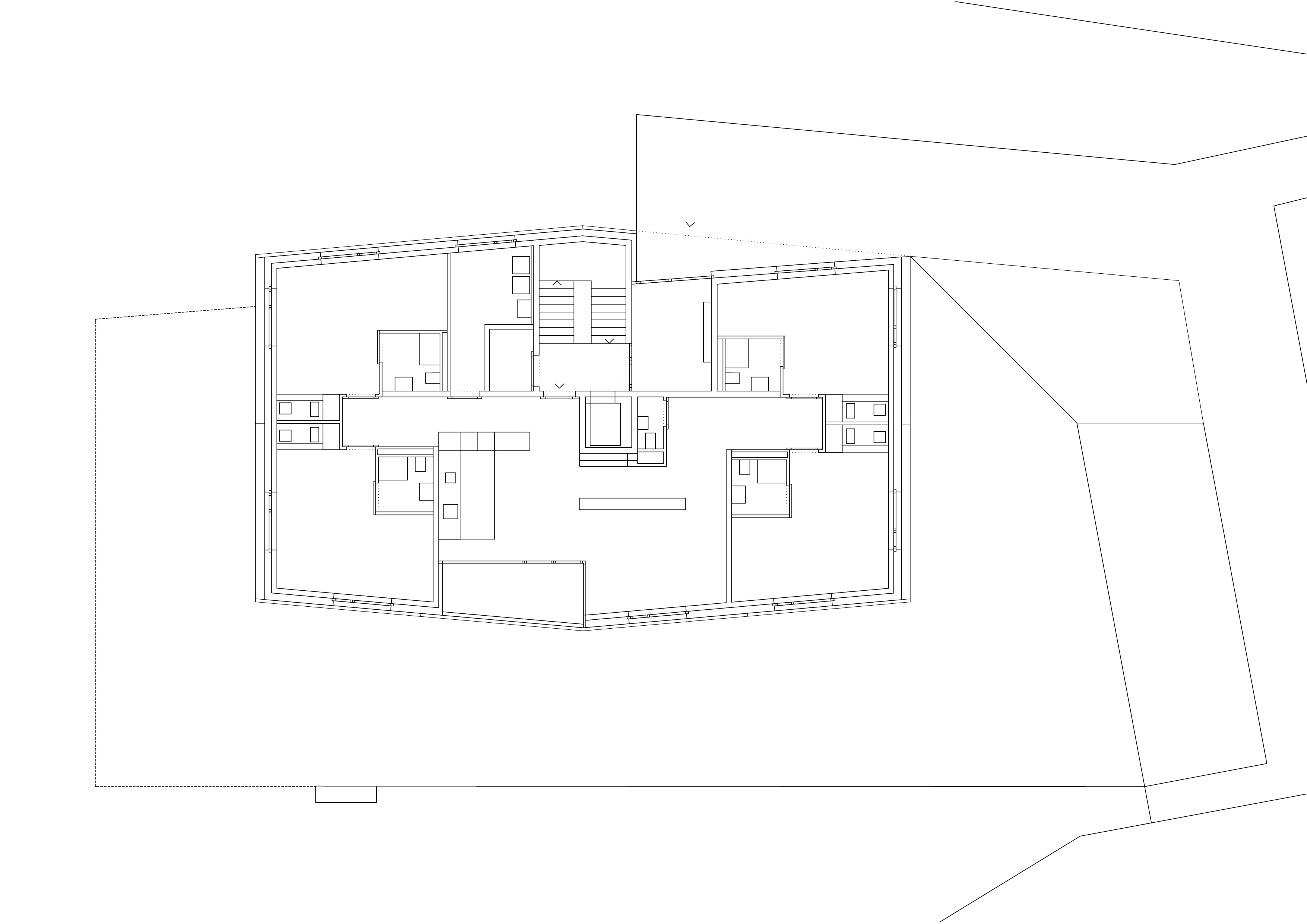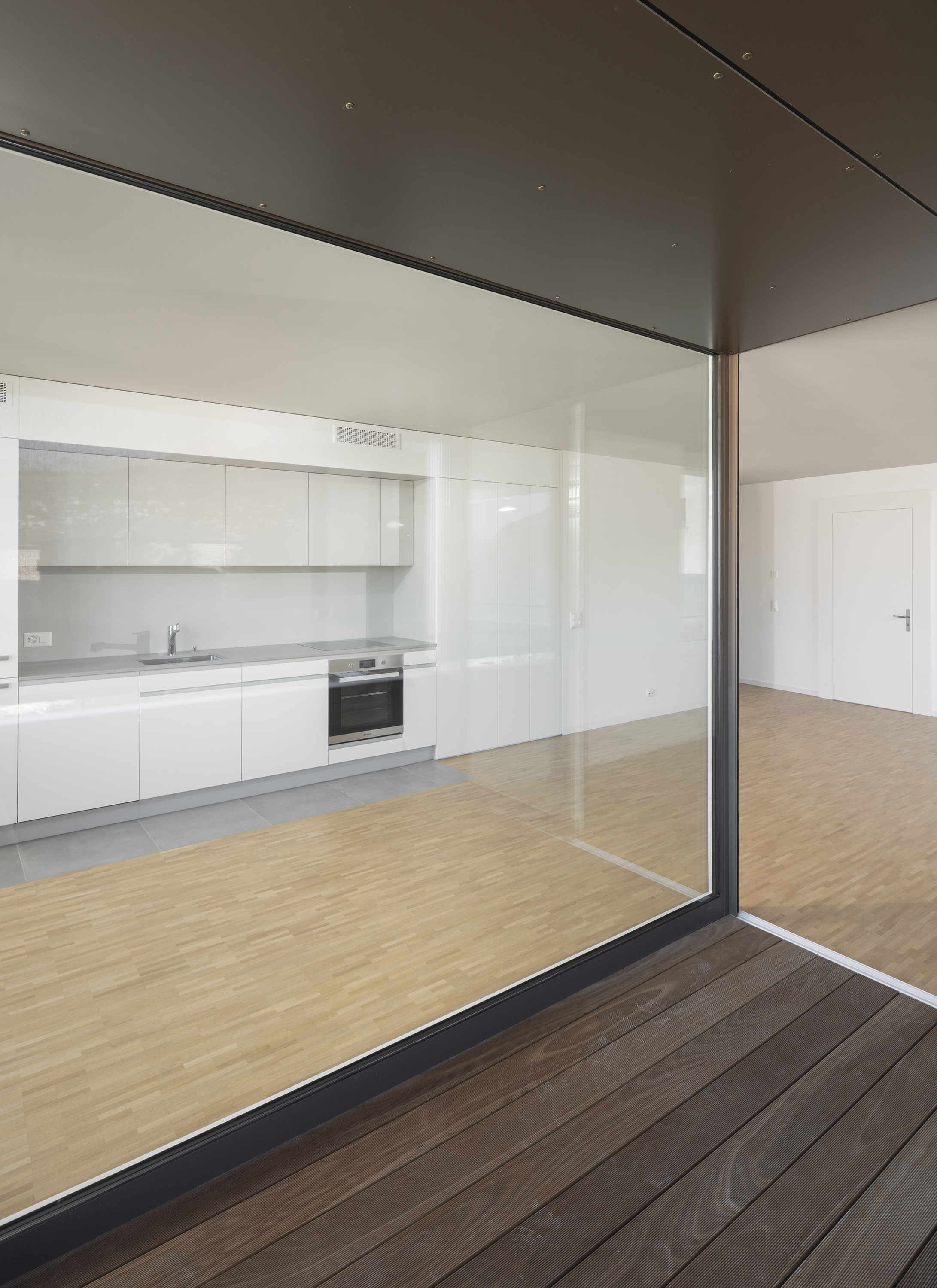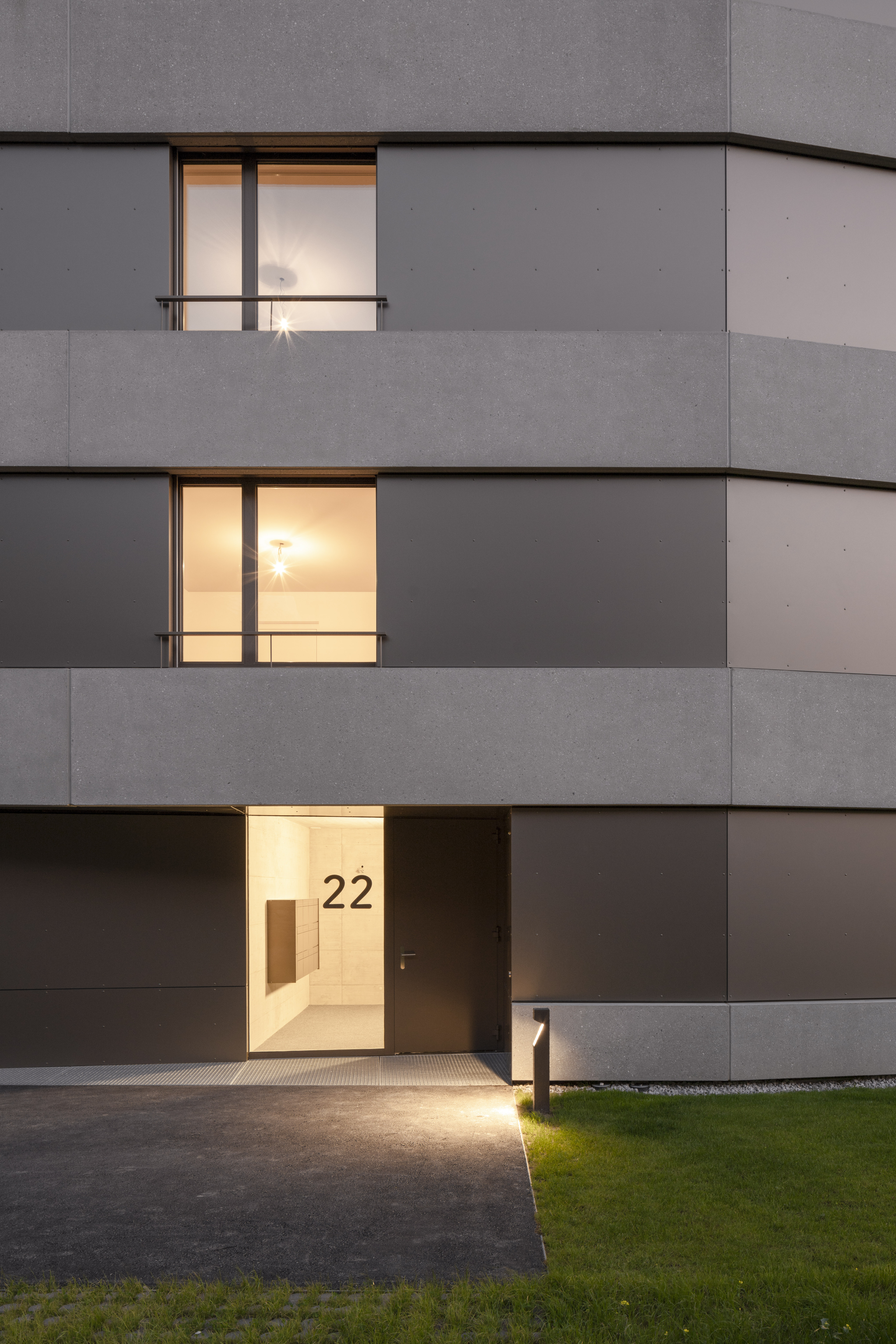 L’étage type offre trois appartements, alors que le comble reçoit deux appartements profitant de la spatialité de la toiture en pente. Les appartements 3 pièces profitent des trois orientations. Ils jouissent de prolongements extérieurs sous forme de loggia d’angle, qui articule l’espace jour de l’appartement. Le béton apparent qualifie les espaces communs, parking et cage d’escalier. La matière brute, sol, mur et plafond, contraste avec les menuiseries peintes des portes palières et du garde-corps de l’escalier, dont la face intérieure est teintée d’un rouge corail. Une palette de teintes chaudes est déclinée dans les salles de bain, alors que les appartements ont des finitions sobres, en tons de blanc et gris sur parquet chêne.