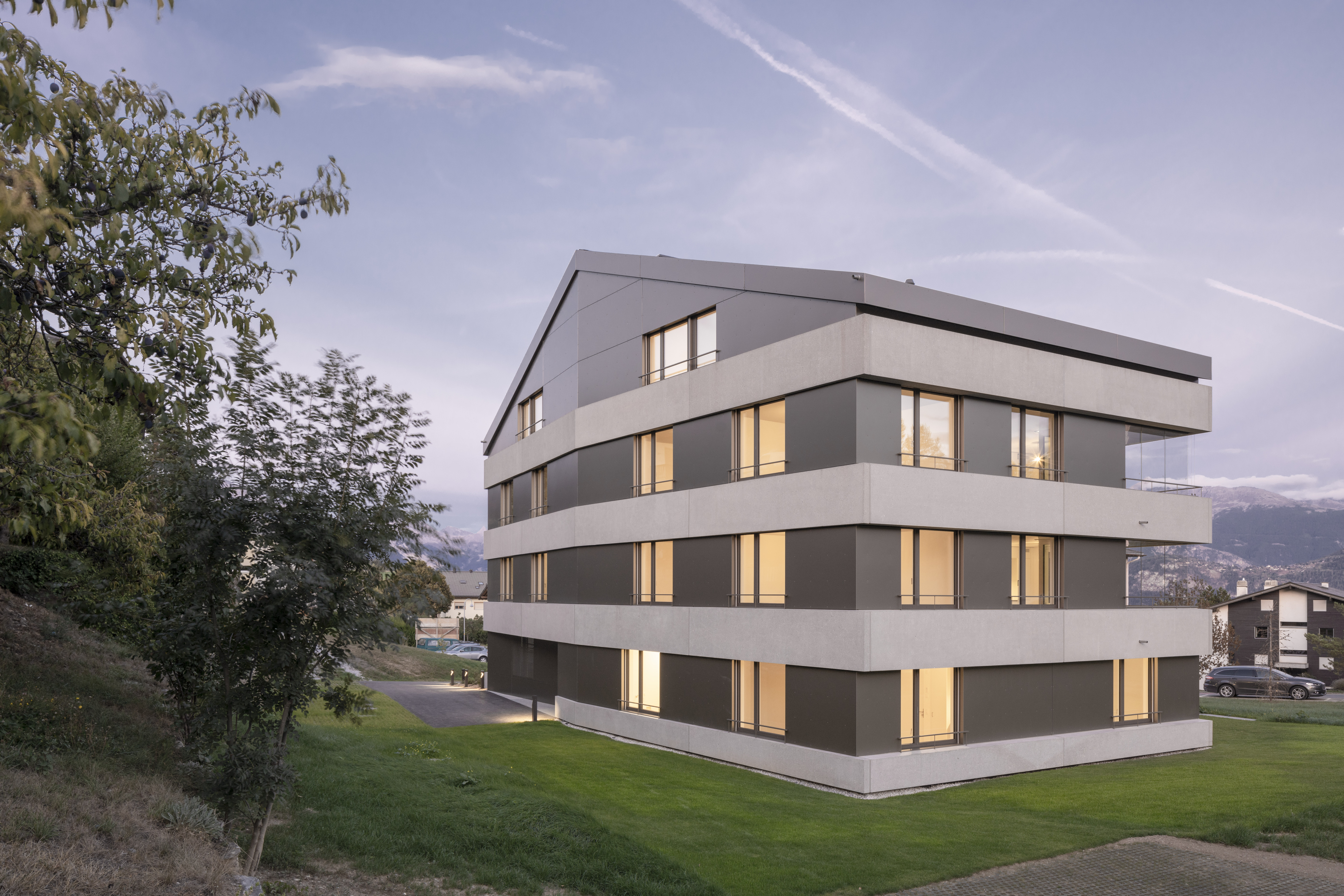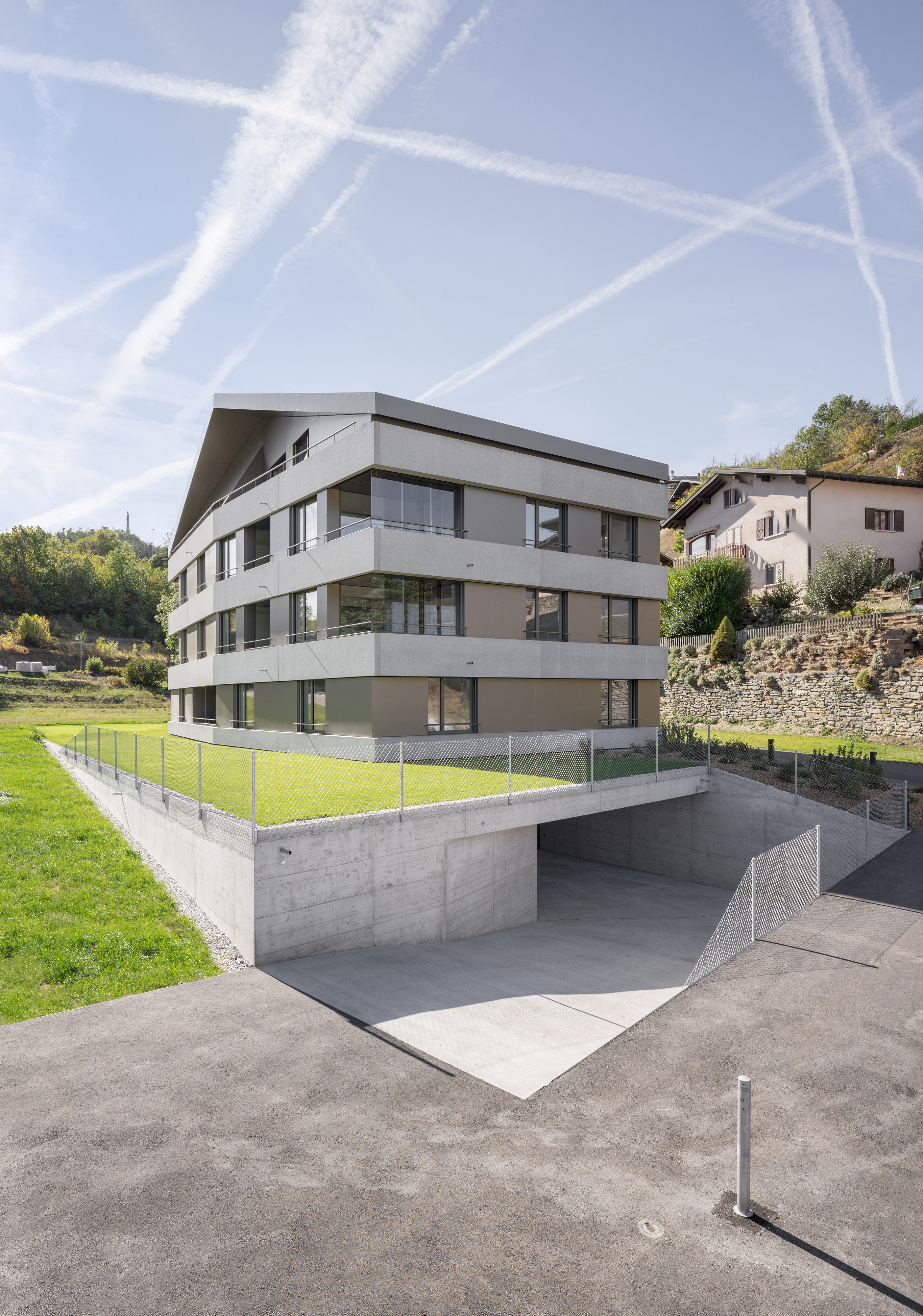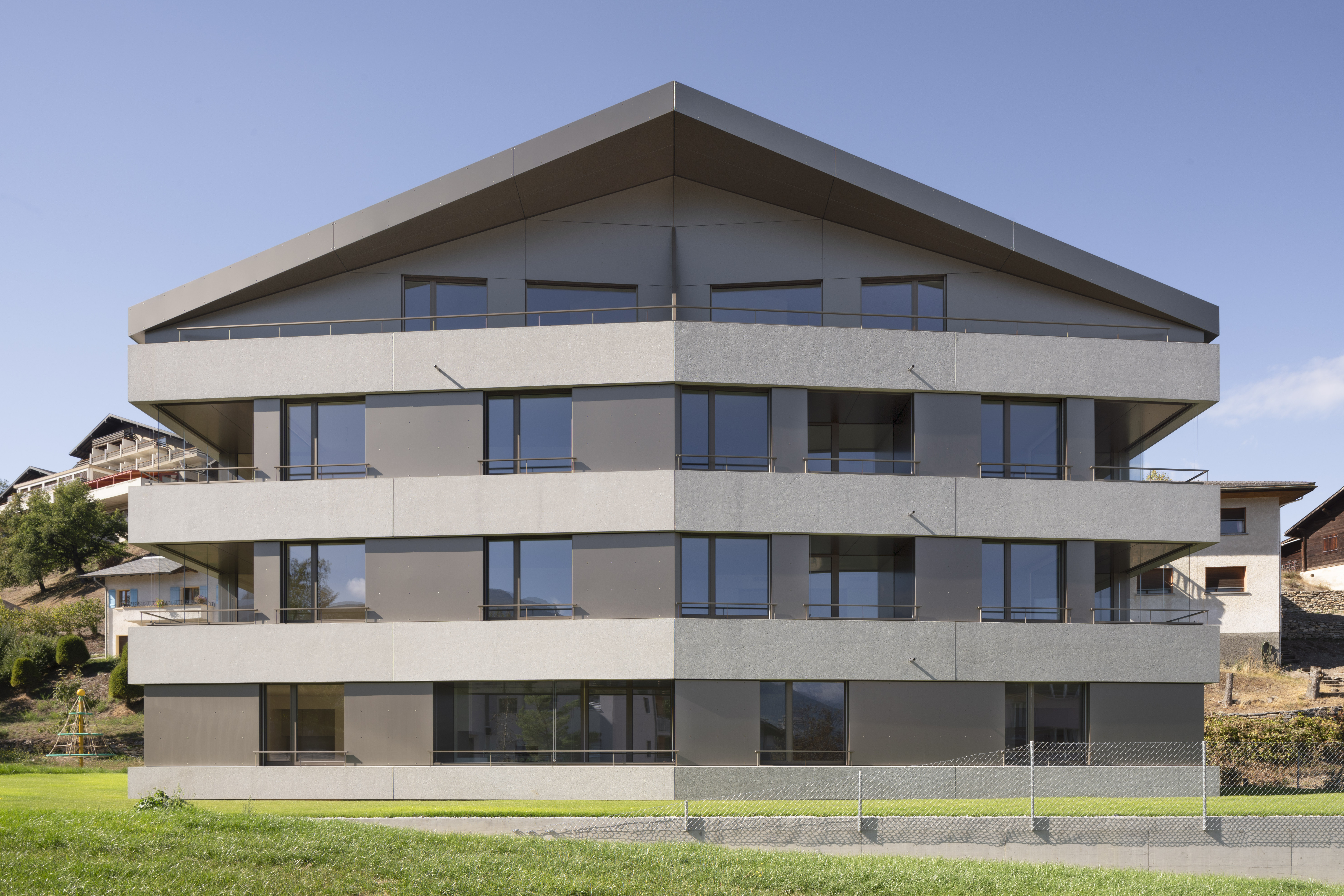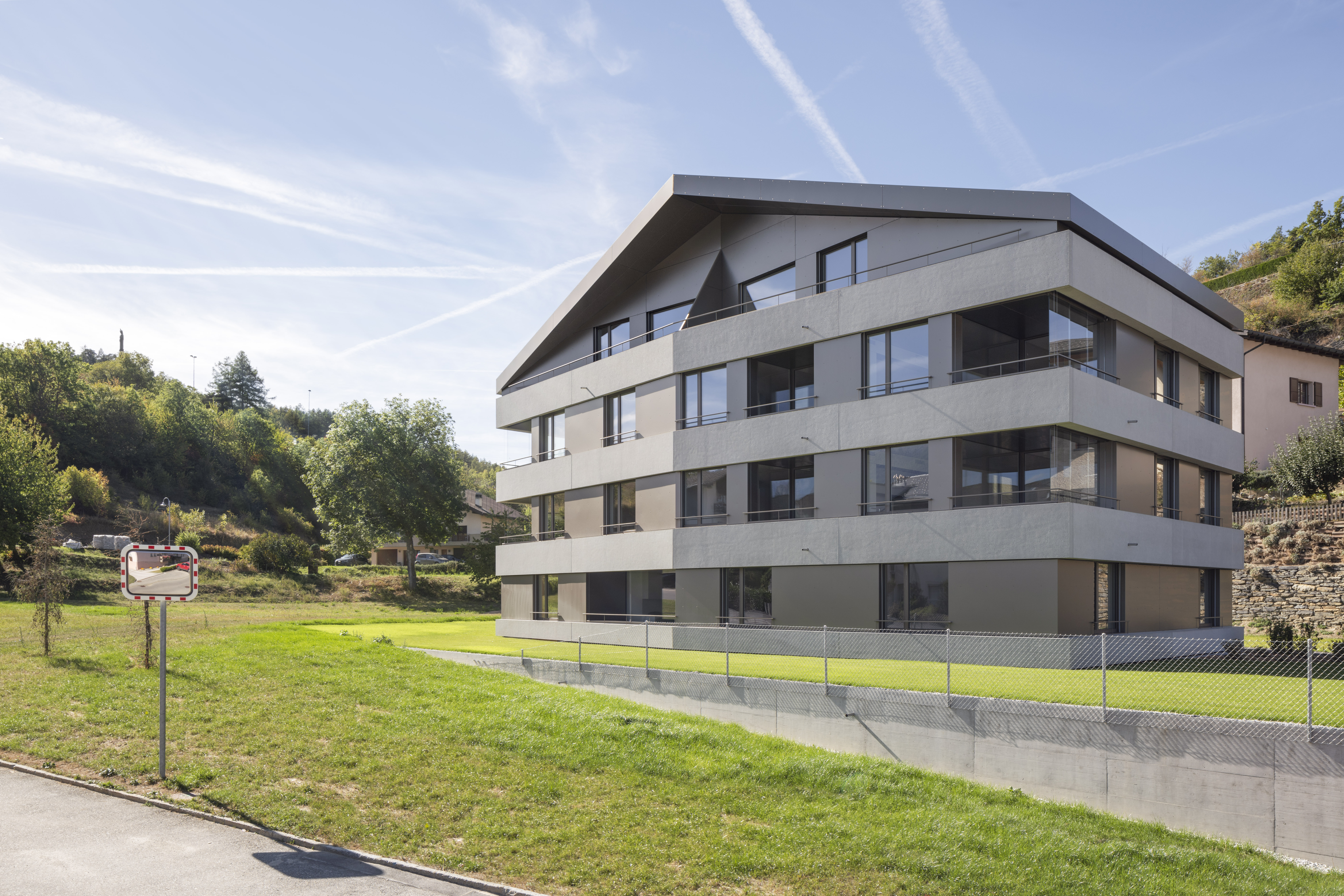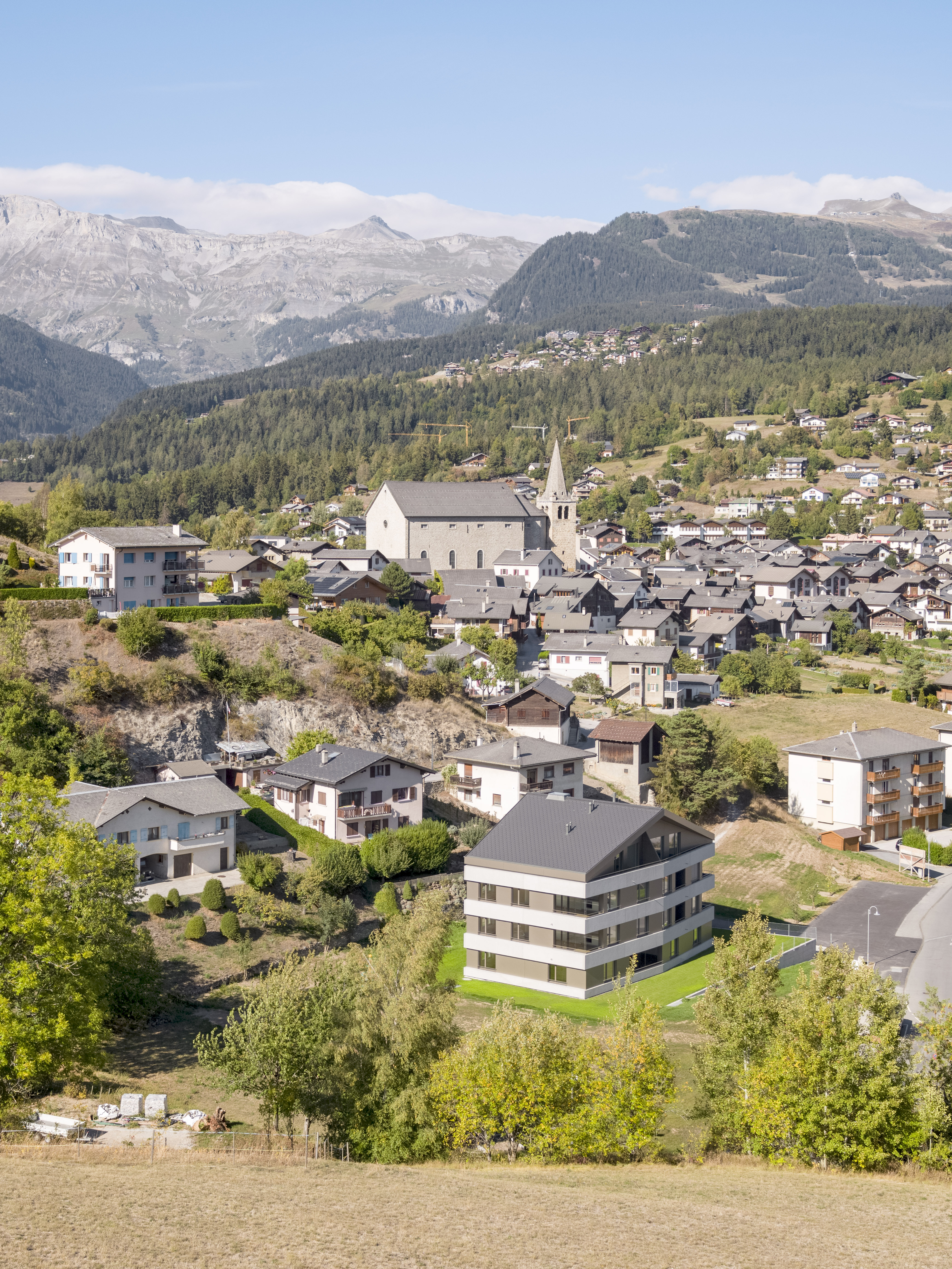 Au pied du beau village de Lens, la paroisse possède un terrain en zone d’habitat collectif, permettant l’implantation de deux immeubles de logements. Le premier immeuble est réalisé pour mettre sur le marché des appartements intergénérationnels pour les habitants de la région. L’immeuble présente une morphologie classique, composée de trois niveaux et un comble coiffé d’une toiture à deux pans, avec son faîte perpendiculaire à la pente. La silhouette du bâtiment se marie au bâti ancien, tout en présentant une expression contemporaine.