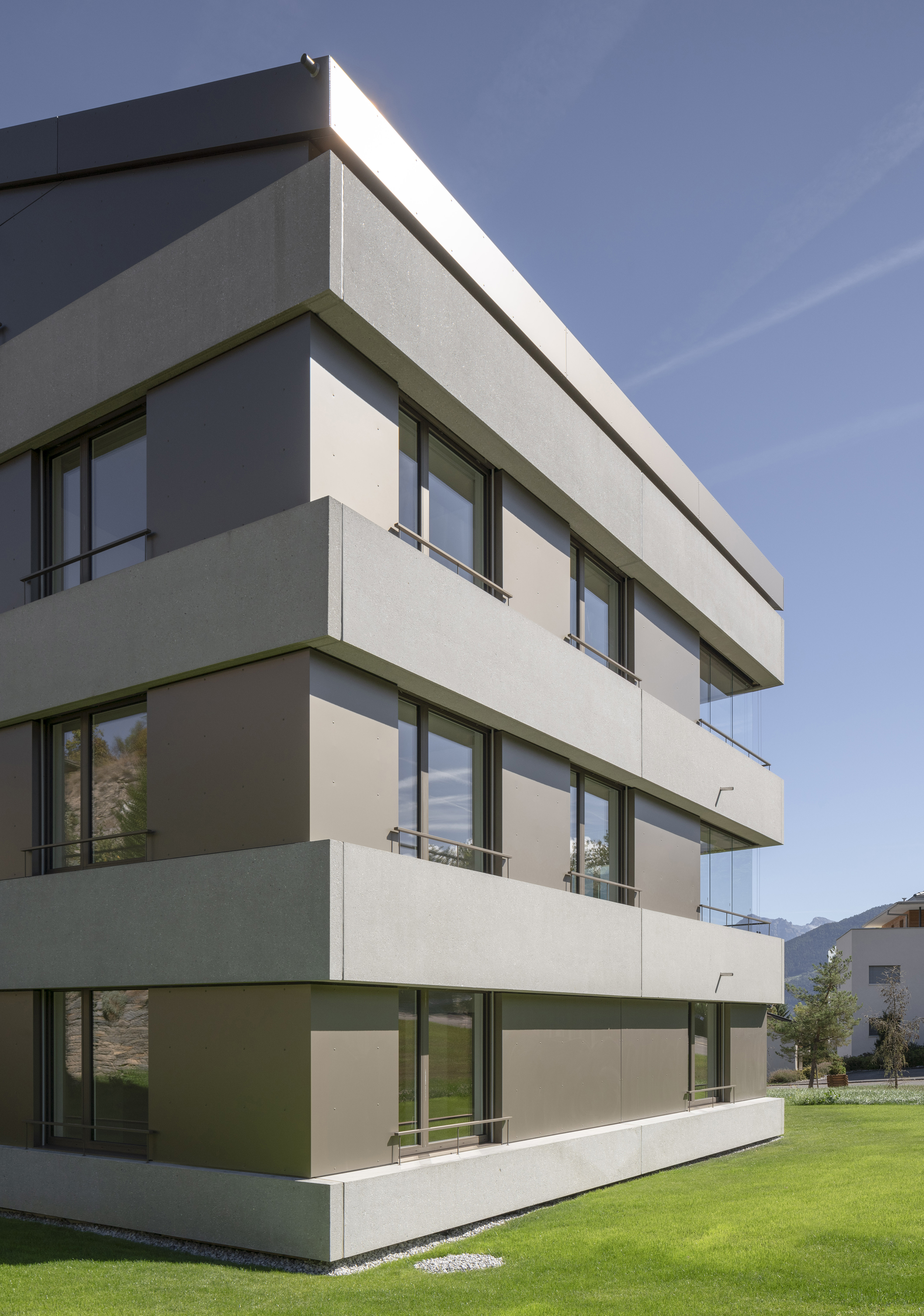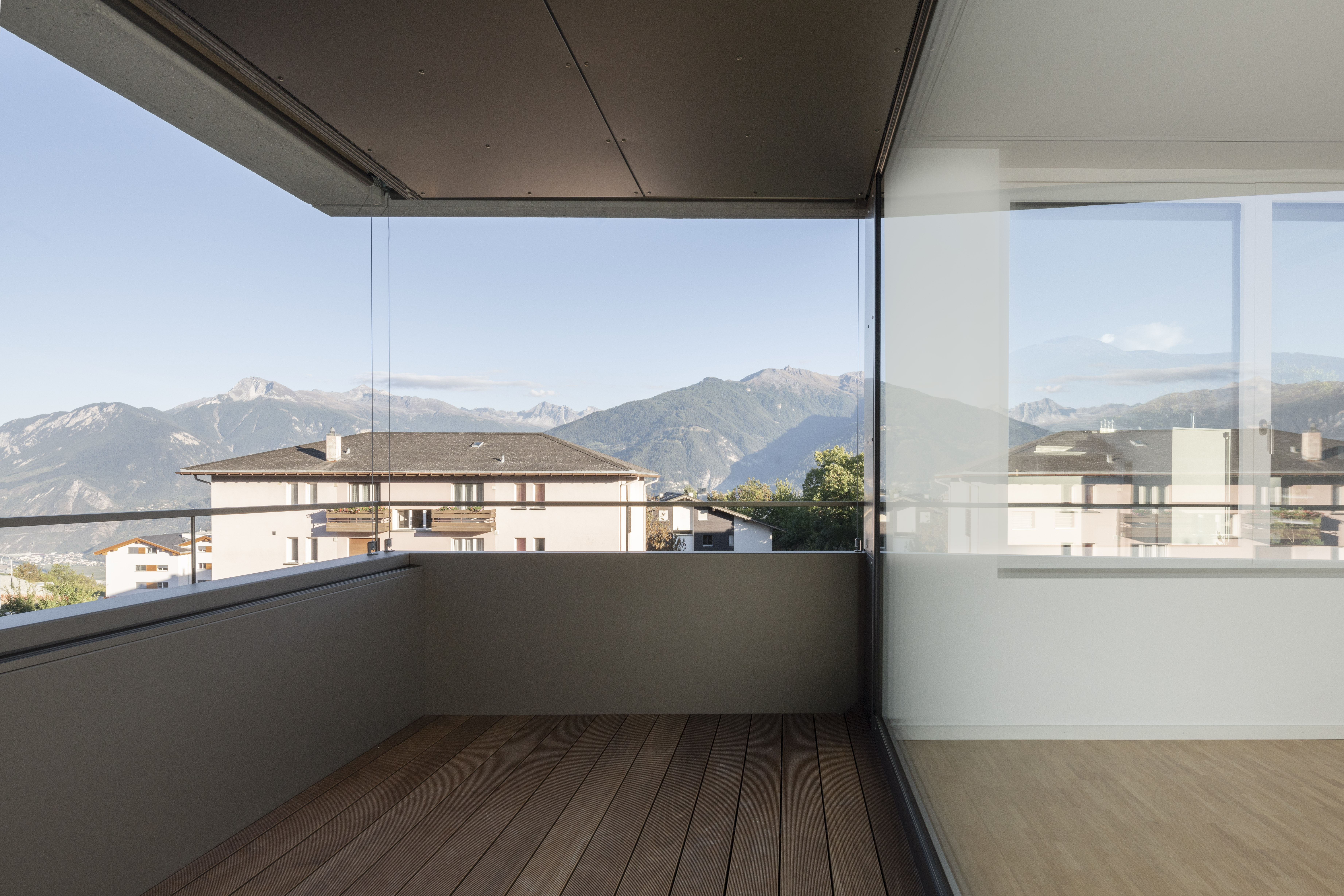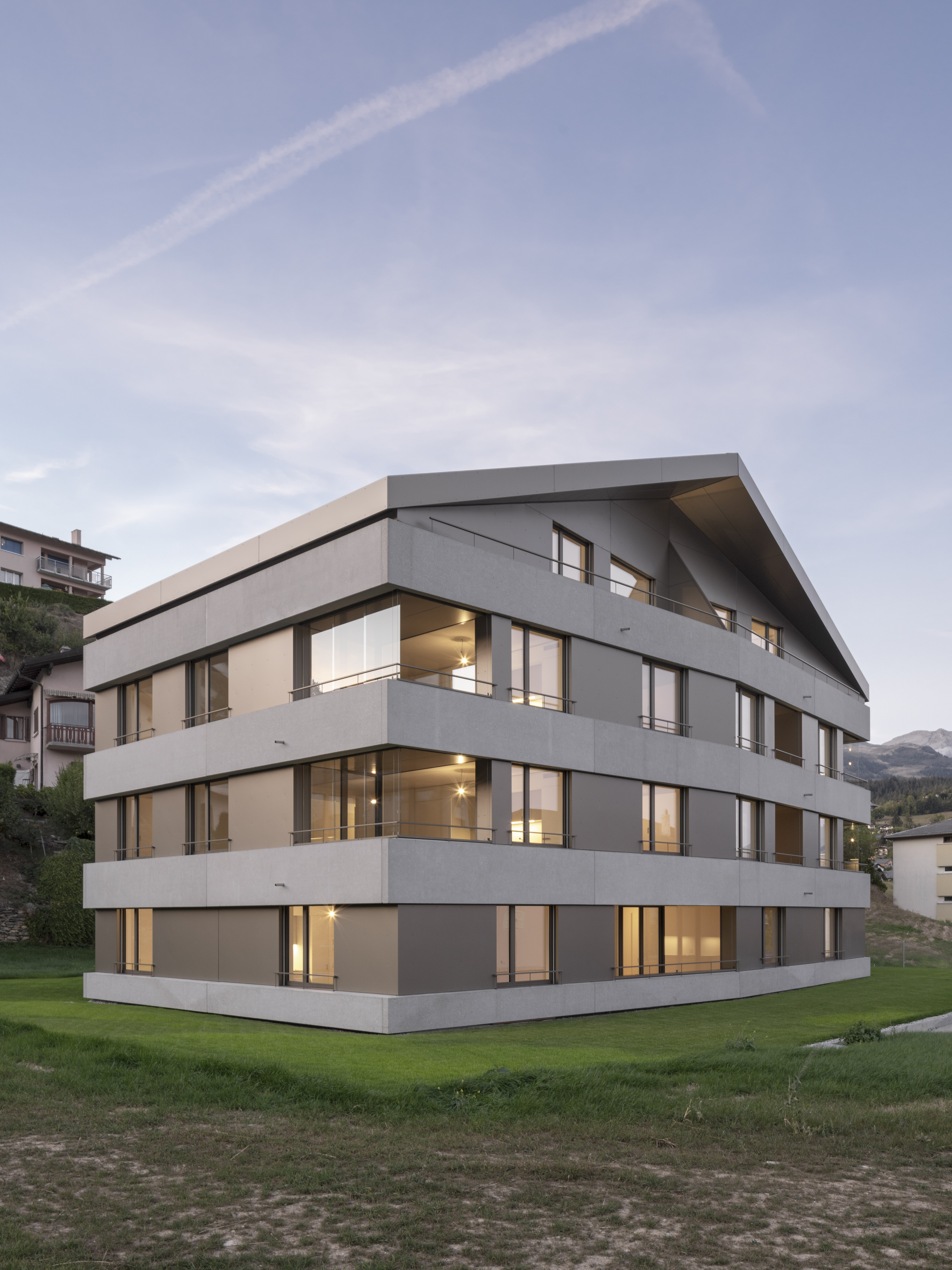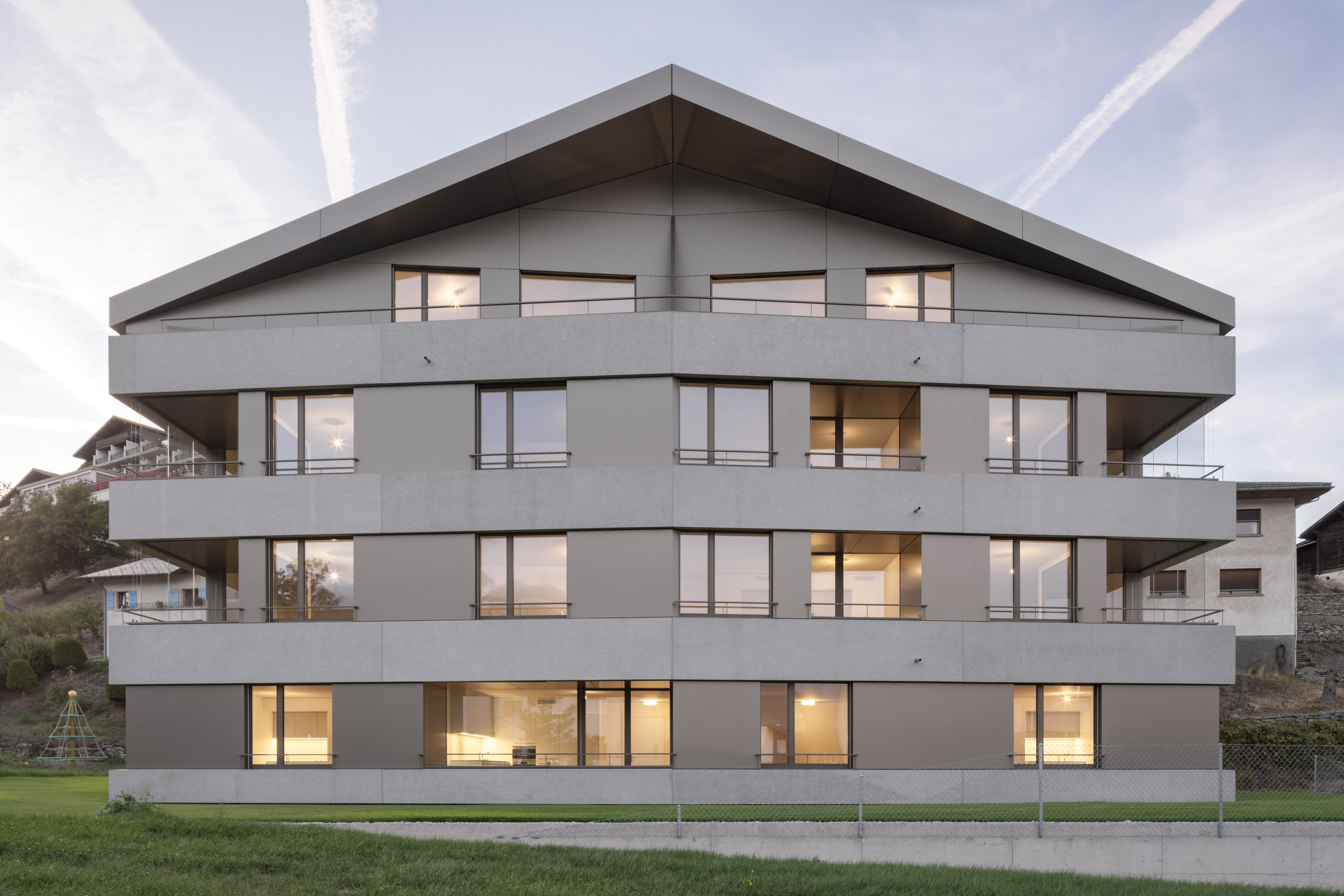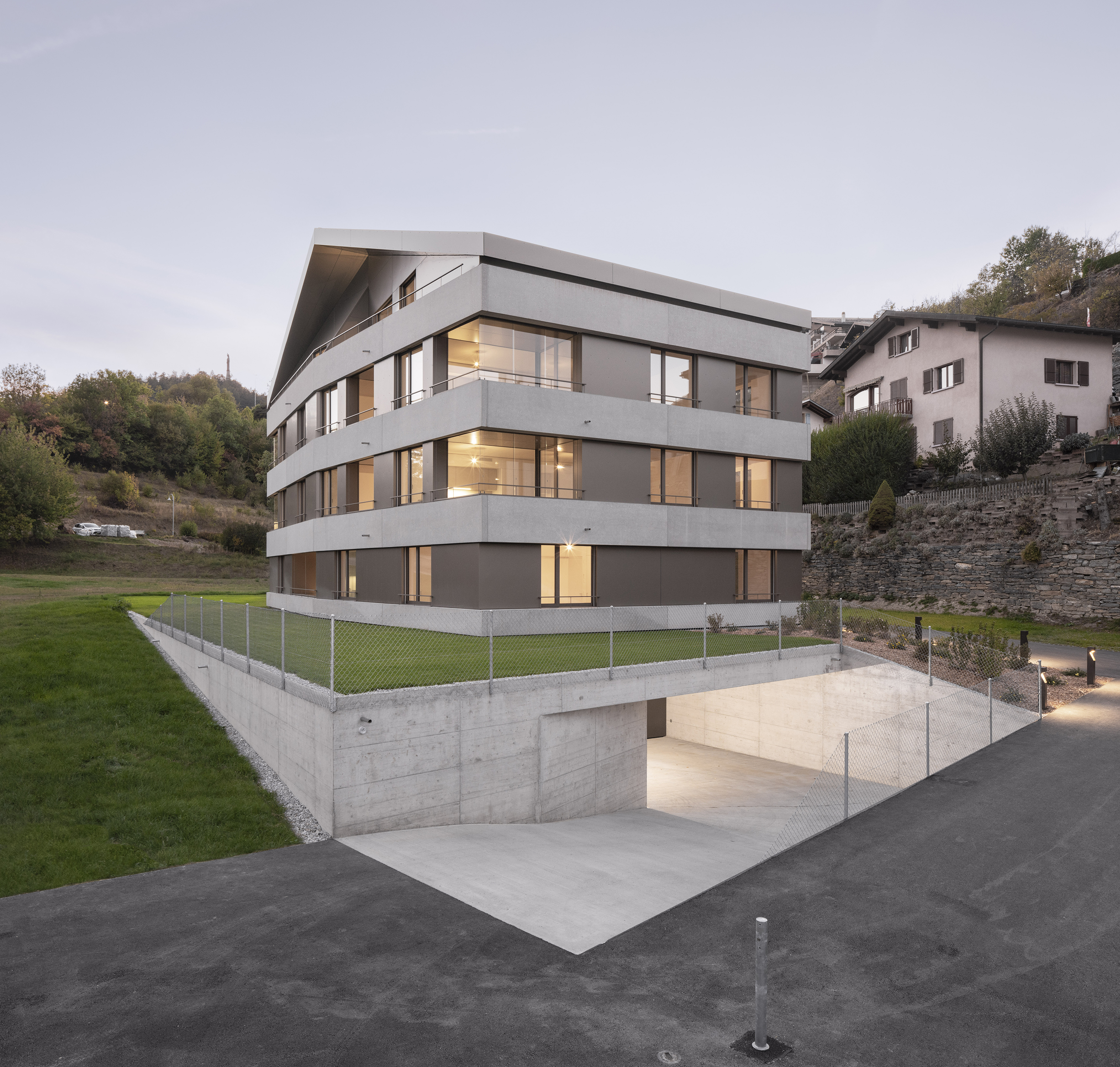 Au pied du beau village de Lens, la paroisse possède un terrain en zone d’habitat collectif, permettant l’implantation de deux immeubles de logements. Le premier immeuble est réalisé pour mettre sur le marché des appartements intergénérationnels pour les habitants de la région. L’immeuble présente une morphologie classique, composée de trois niveaux et un comble coiffé d’une toiture à deux pans, avec son faîte perpendiculaire à la pente. La silhouette du bâtiment se marie au bâti ancien, tout en présentant une expression contemporaine.