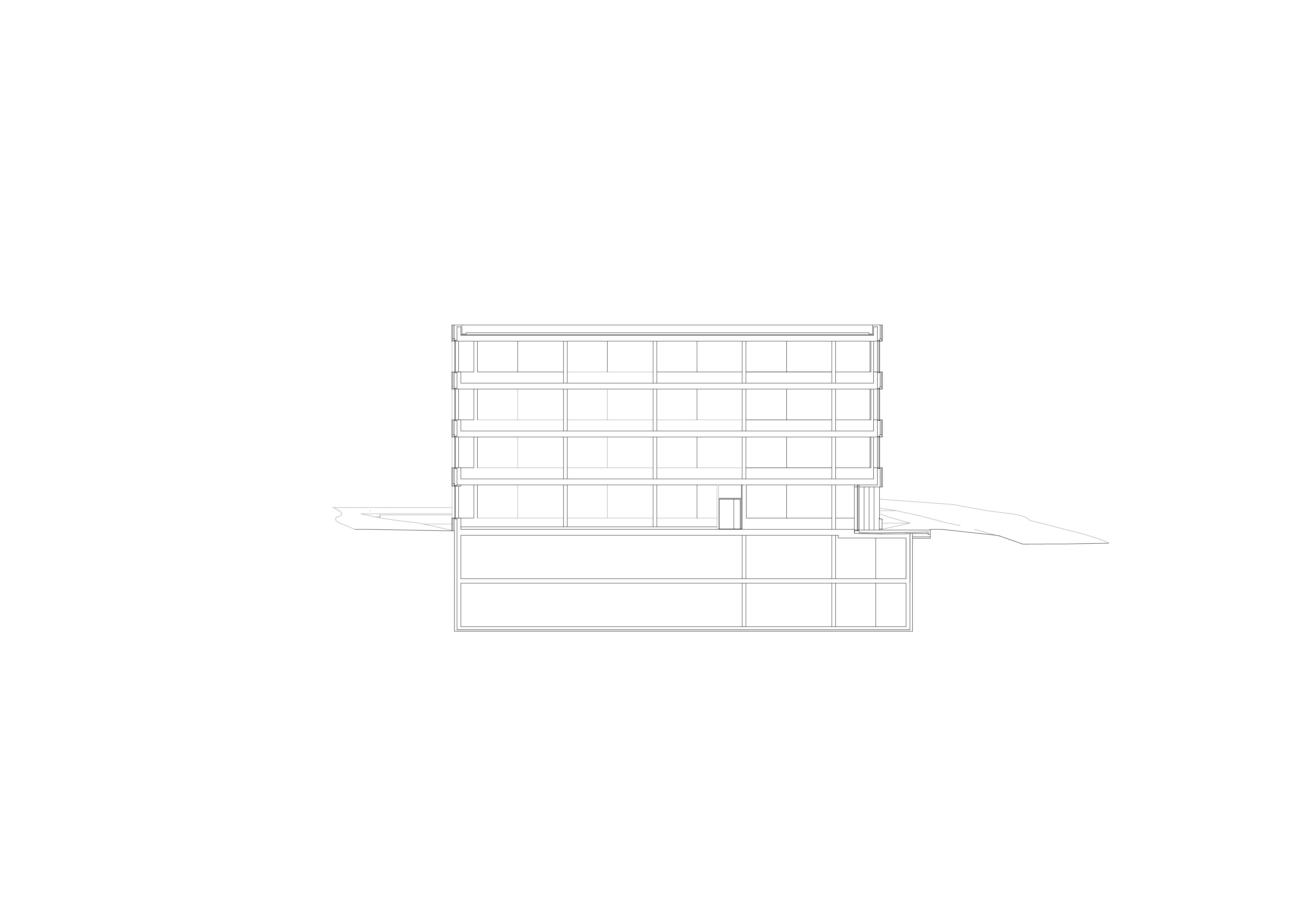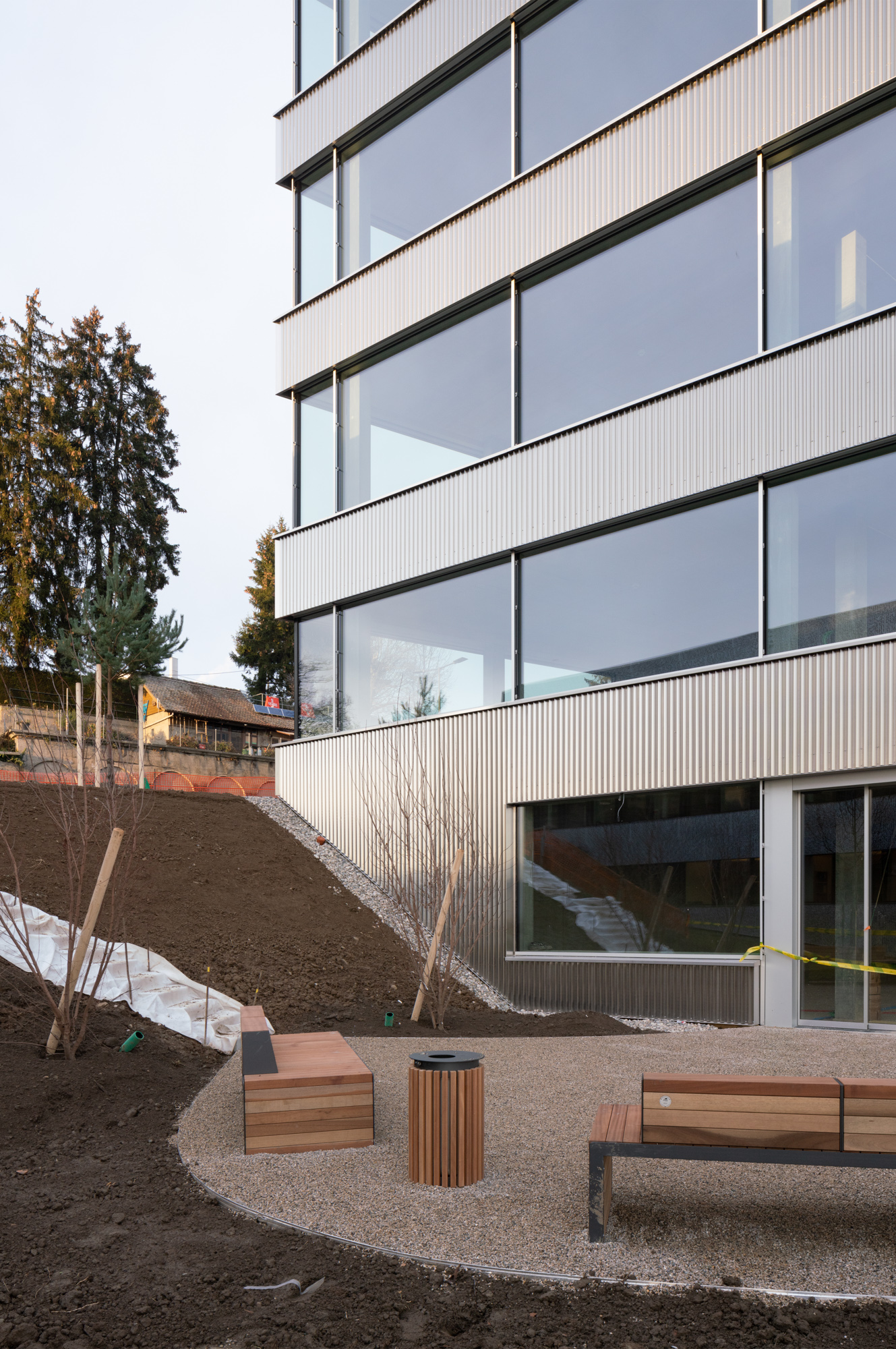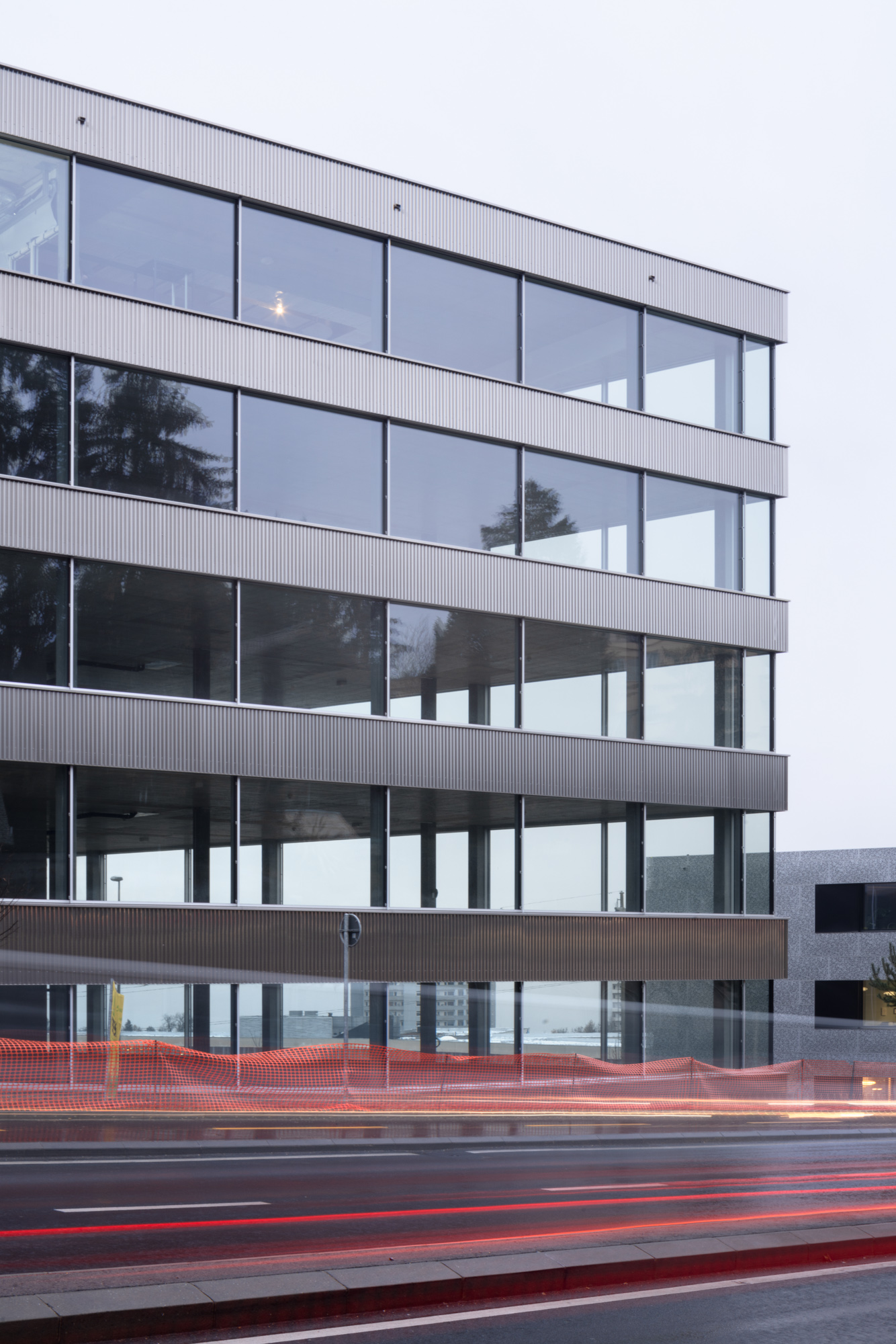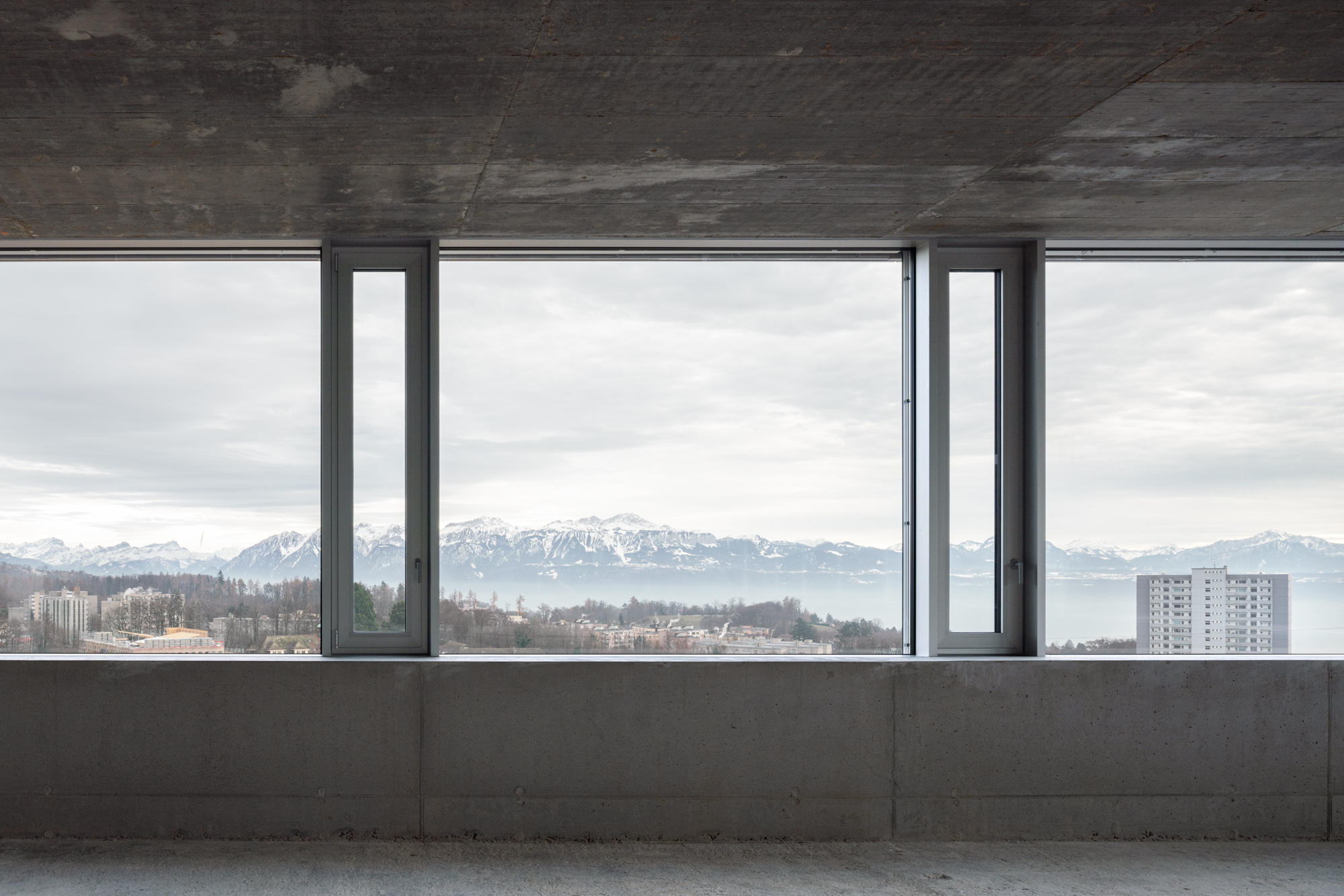 Les allèges rythment horizontalement la façade. Un plissé d’inox brossé joue poétiquement avec les reflets du contexte et les variations de lumière au fil des saisons. Les fenêtres en bandeaux, réalisées en menuiserie aluminium, cadrent le paysage du lac et des montagnes. L’immeuble est doté de deux voies de circulation verticale, qui regroupent en leur sein des toilettes et divers locaux répondant aux besoins programmatiques des étages. Ce plan libre poteaux-dalles est laissé brut, sans chape ni revêtement intérieur, permettant une flexibilité totale aux futurs usagers.
