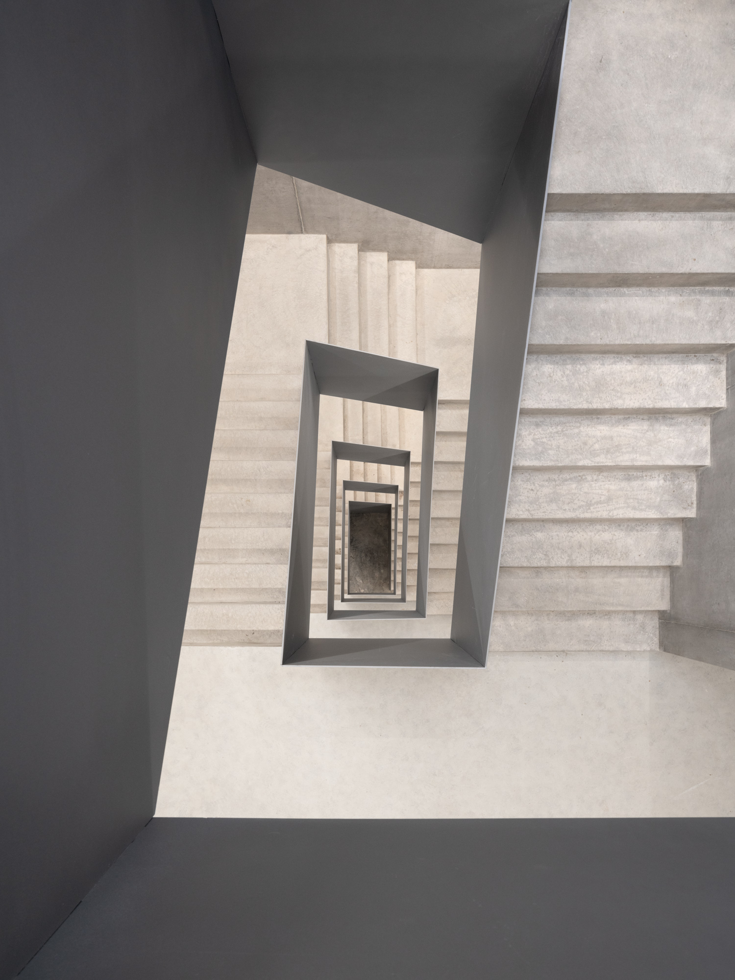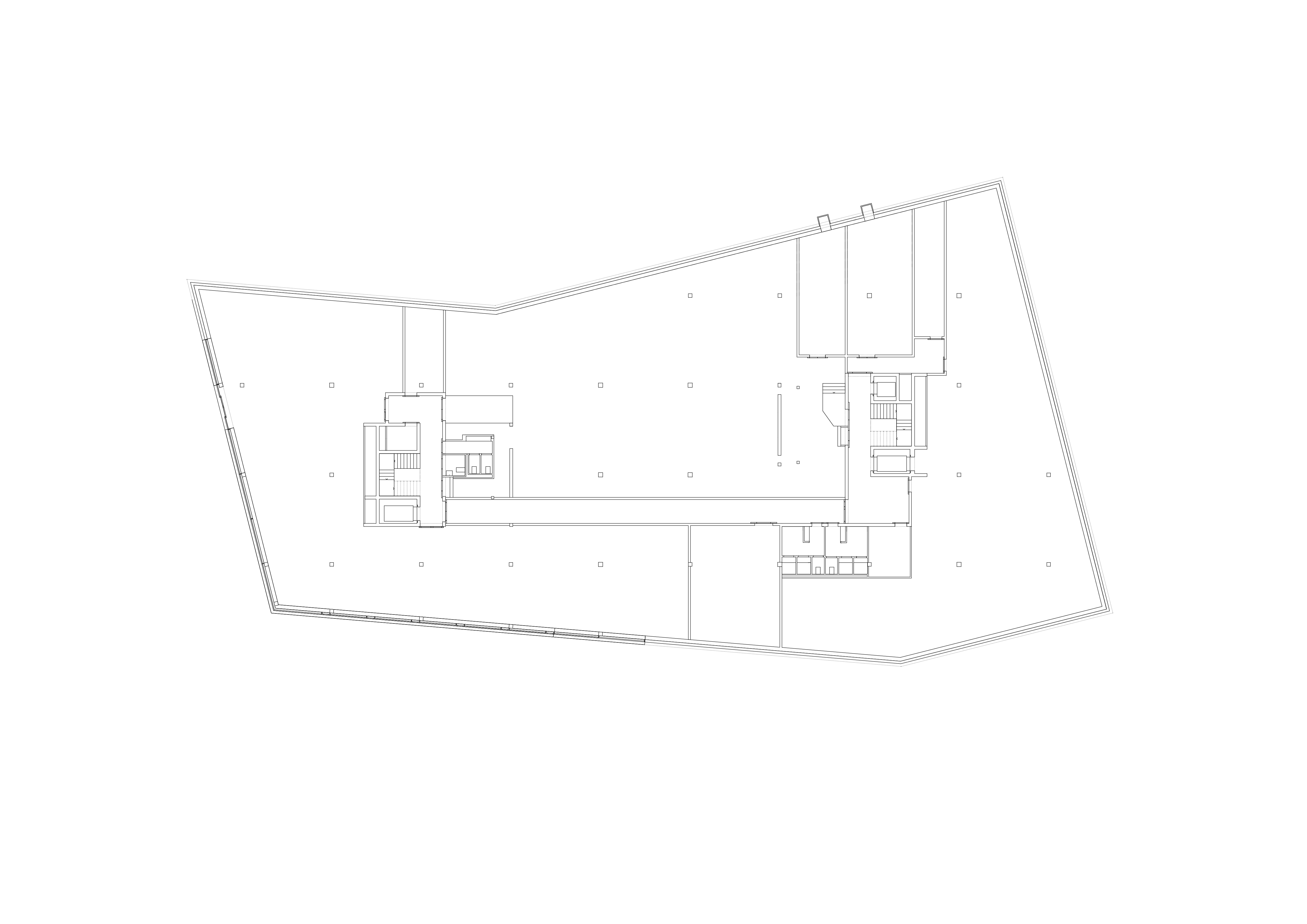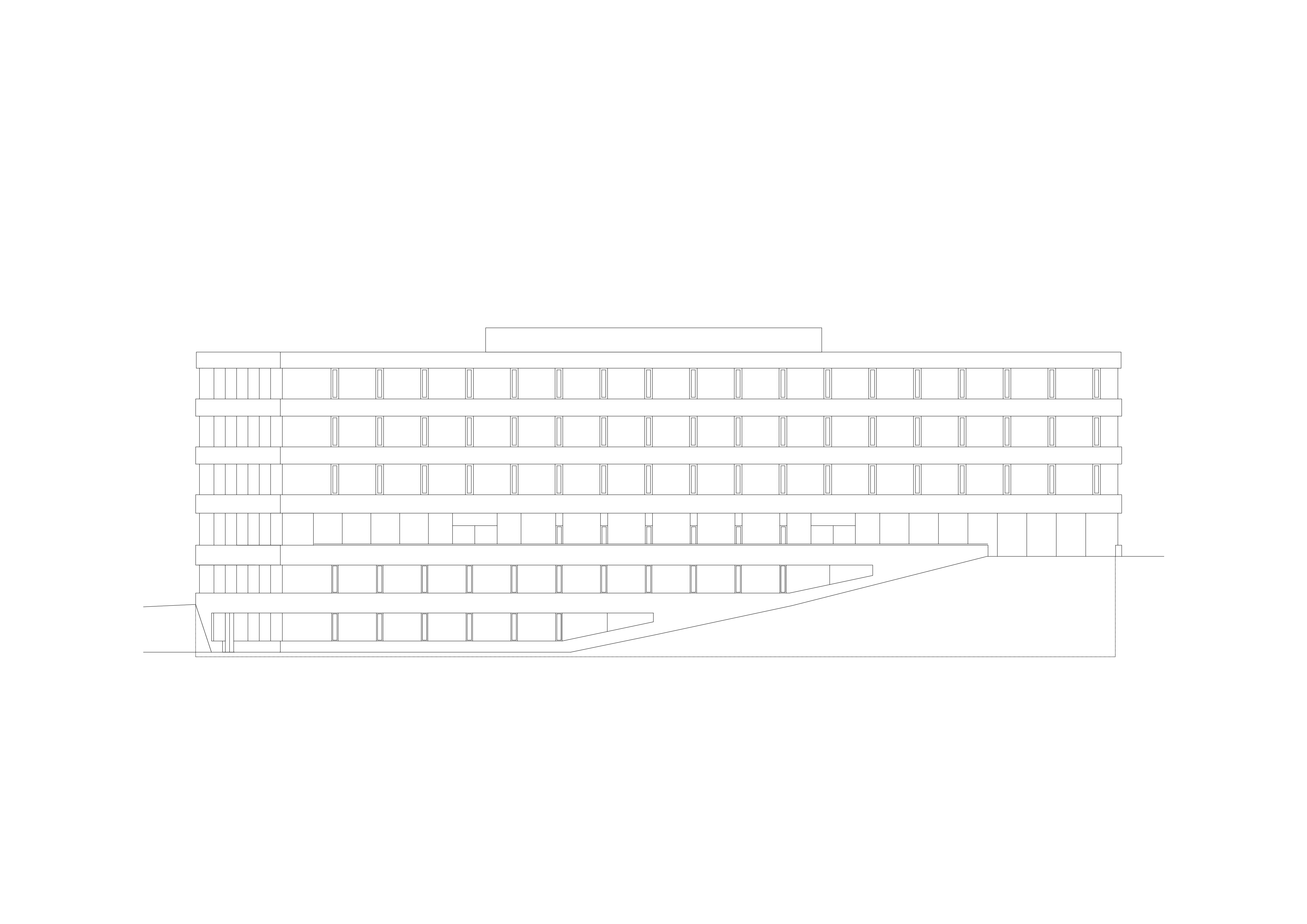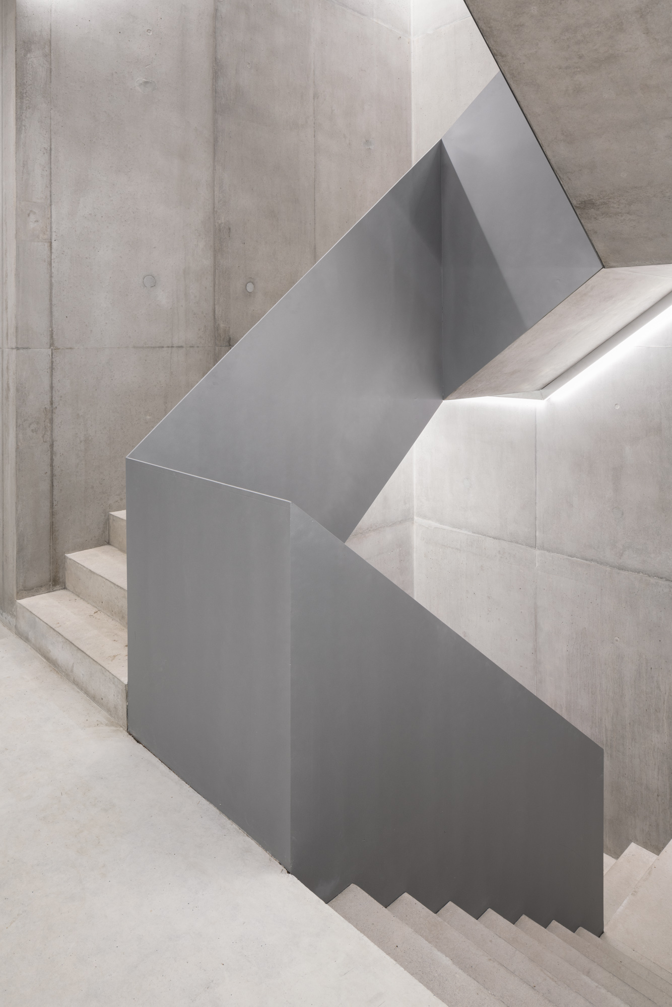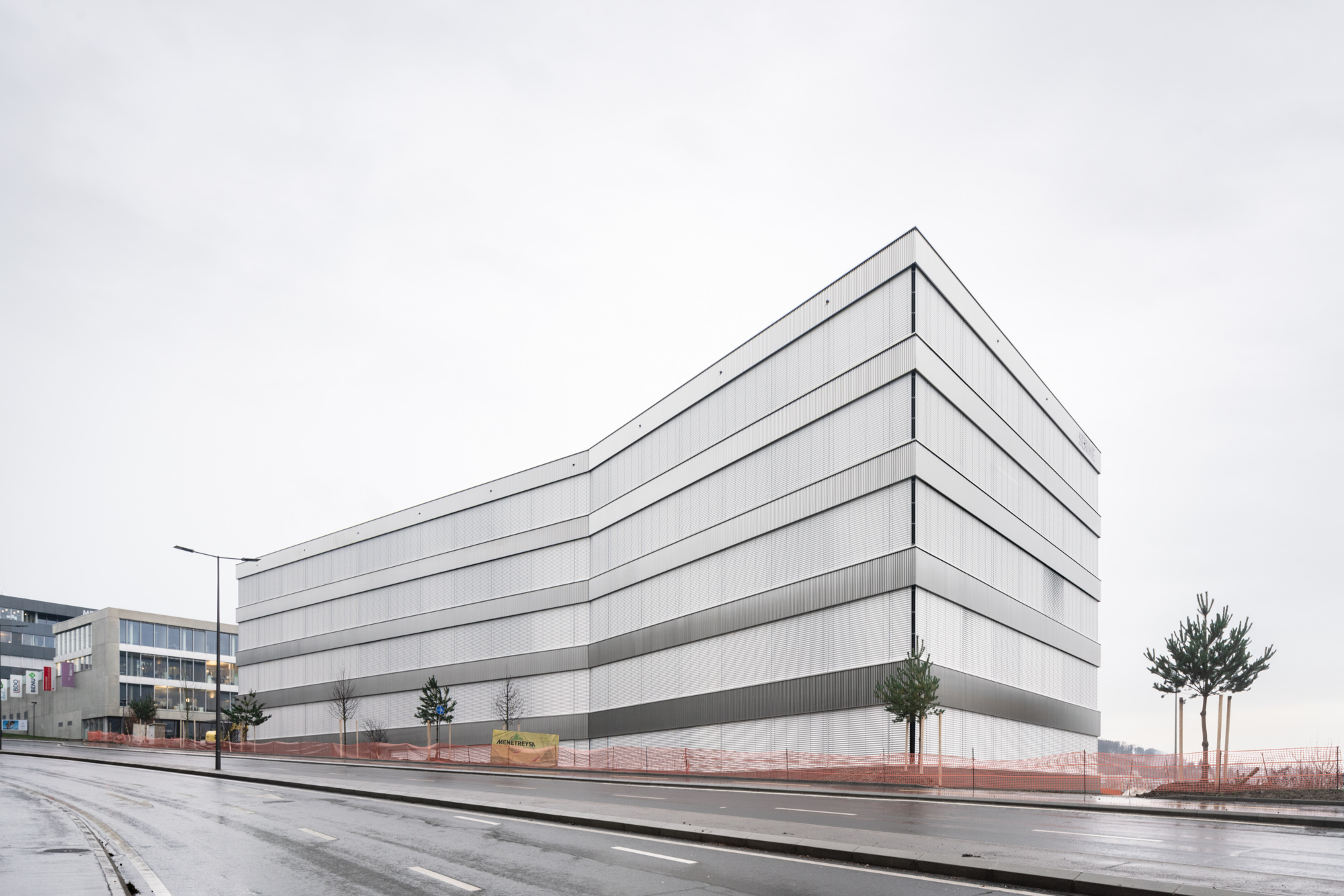 Les allèges rythment horizontalement la façade. Un plissé d’inox brossé joue poétiquement avec les reflets du contexte et les variations de lumière au fil des saisons. Les fenêtres en bandeaux, réalisées en menuiserie aluminium, cadrent le paysage du lac et des montagnes. L’immeuble est doté de deux voies de circulation verticale, qui regroupent en leur sein des toilettes et divers locaux répondant aux besoins programmatiques des étages. Ce plan libre poteaux-dalles est laissé brut, sans chape ni revêtement intérieur, permettant une flexibilité totale aux futurs usagers.